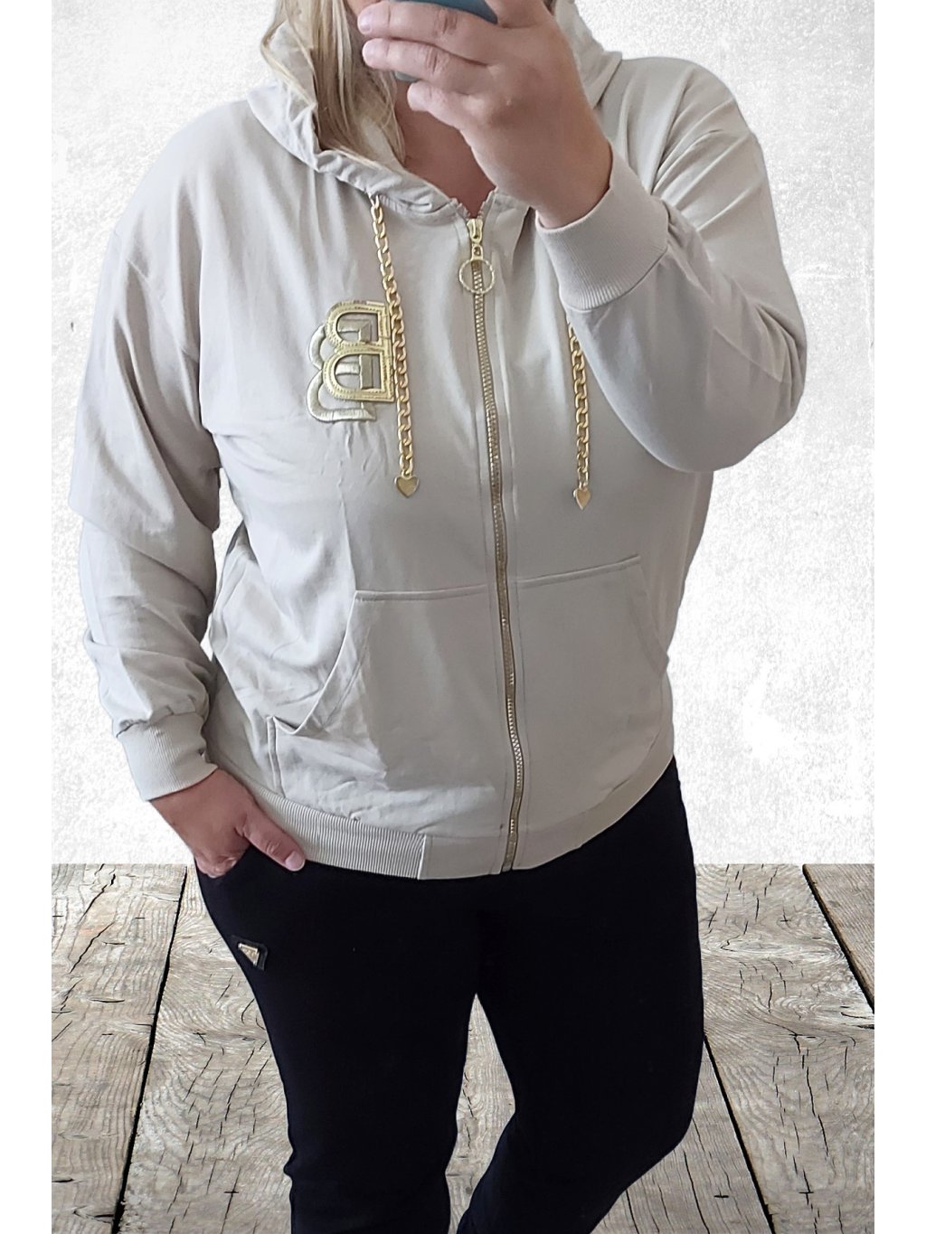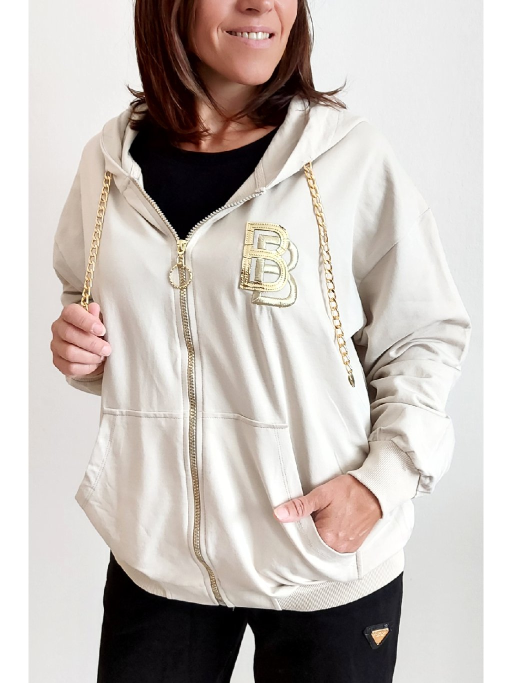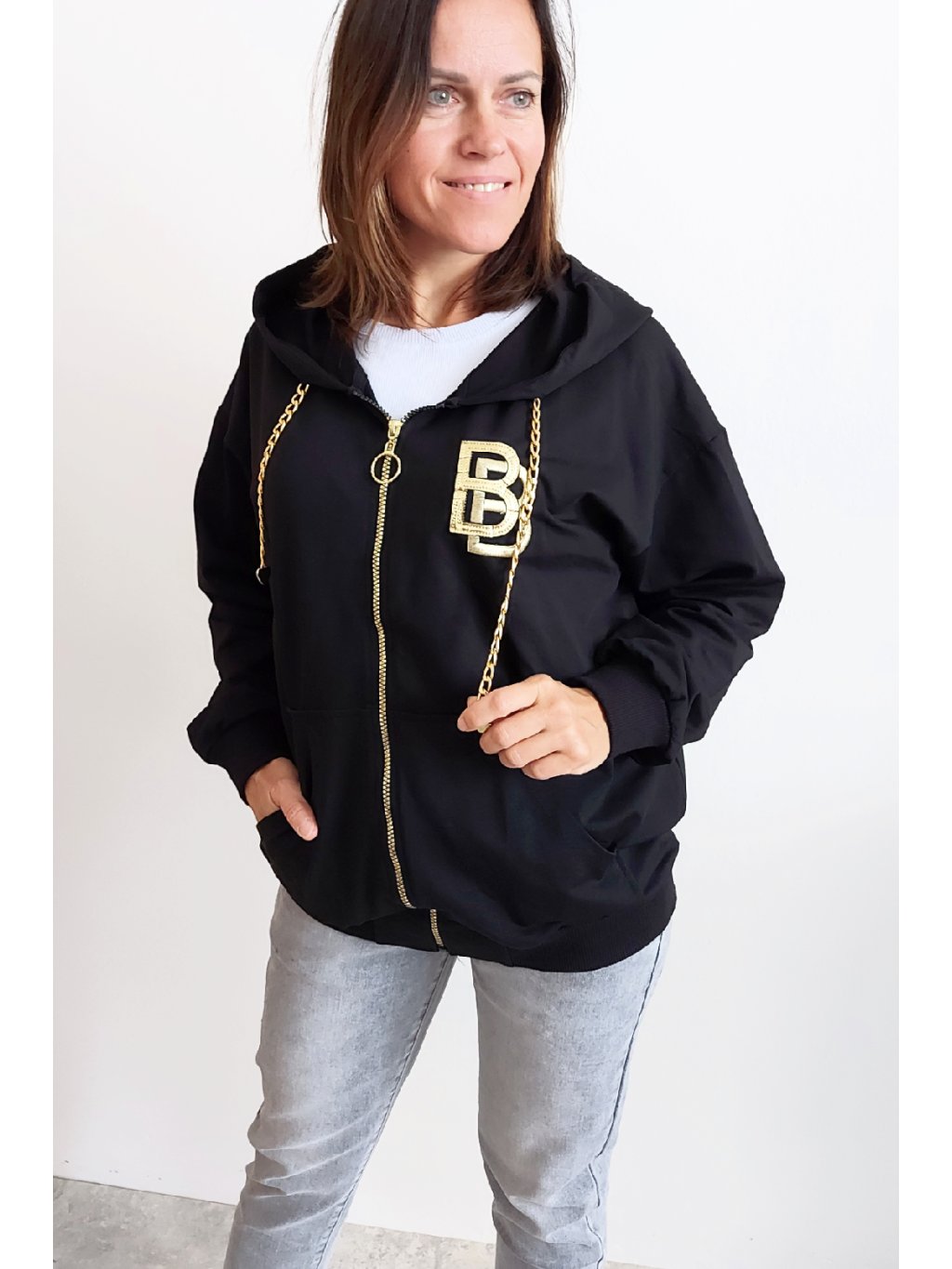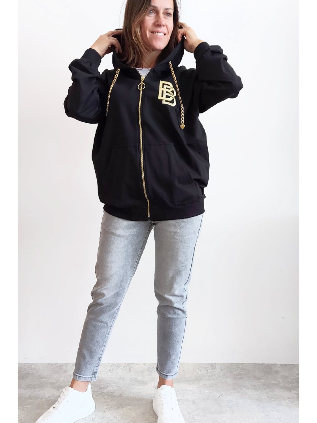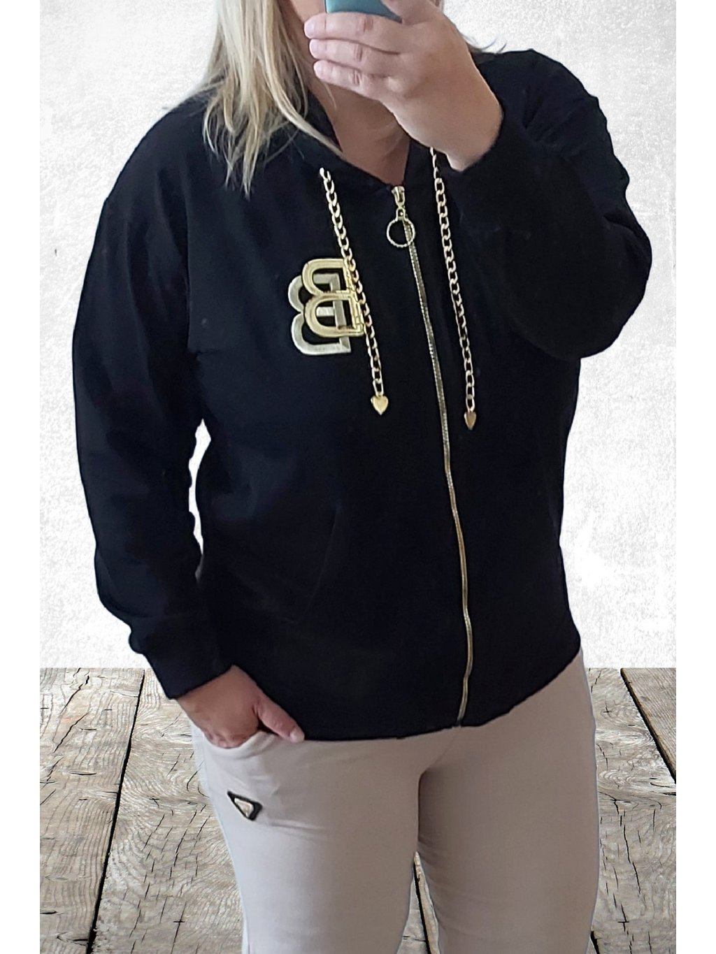 Mikina na zip s kapucí, v ní je ozdobný řetízek ve zlaté barvě. Ten lze sundat. Vpředu našitá ozdobná písmena ve zlatém provedení. Rukávy dlouhé. Rukávy i spodní lem ukončeny úpletem. Přední kapsy. Materiál prémiové kvality (vysoká gramáž bavlny). Luxusní kousek. Při praní doporučujeme řetízek vyvléct. Foceno na vel. XS, výška 156cm i na vel. 2XL (prsa 116cm, boky 120cm), výška 165cm.
