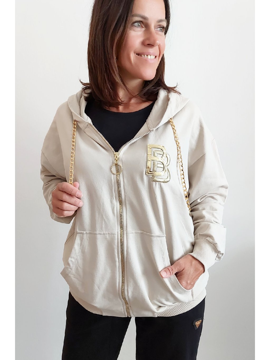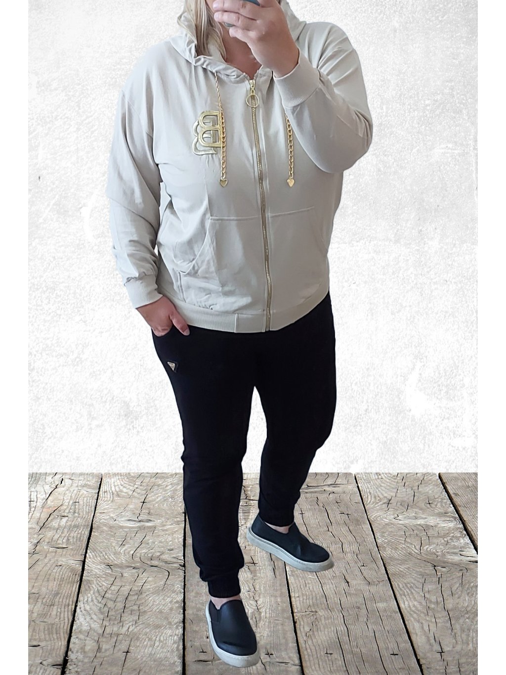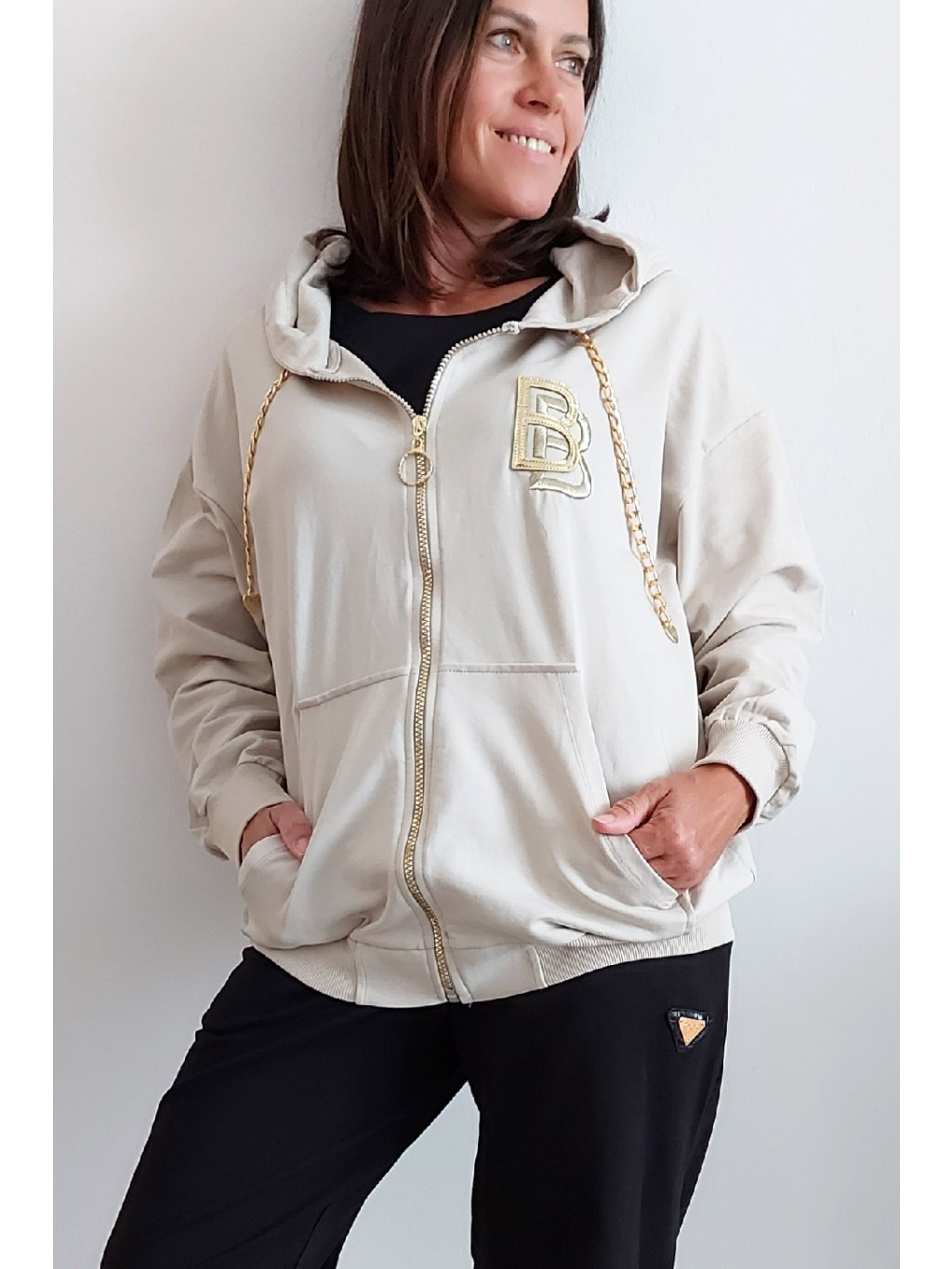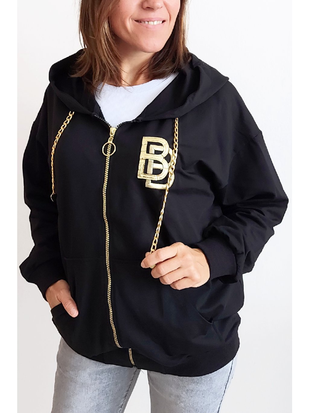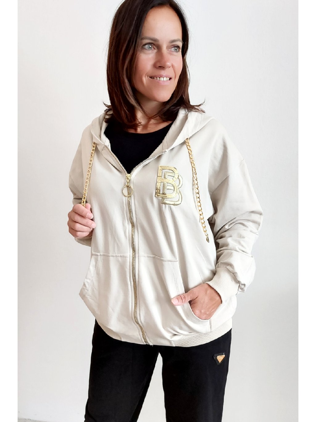 Mikina na zip s kapucí, v ní je ozdobný řetízek ve zlaté barvě. Ten lze sundat. Vpředu našitá ozdobná písmena ve zlatém provedení. Rukávy dlouhé. Rukávy i spodní lem ukončeny úpletem. Přední kapsy. Materiál prémiové kvality (vysoká gramáž bavlny). Luxusní kousek. Při praní doporučujeme řetízek vyvléct. Foceno na vel. XS, výška 156cm i na vel. 2XL (prsa 116cm, boky 120cm), výška 165cm.