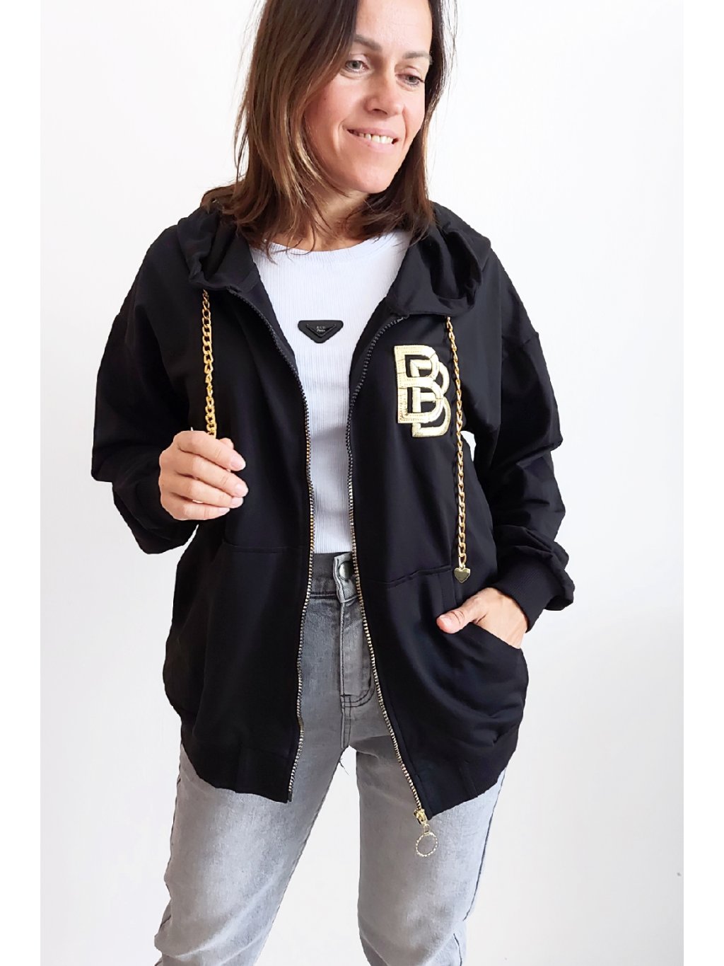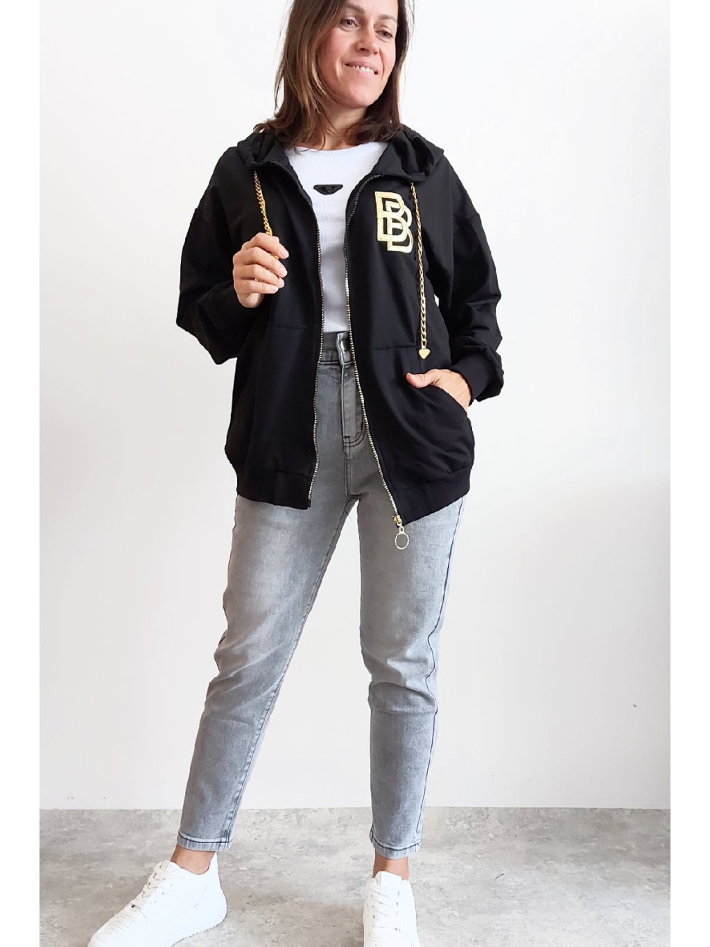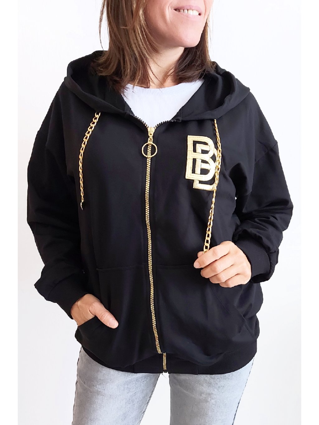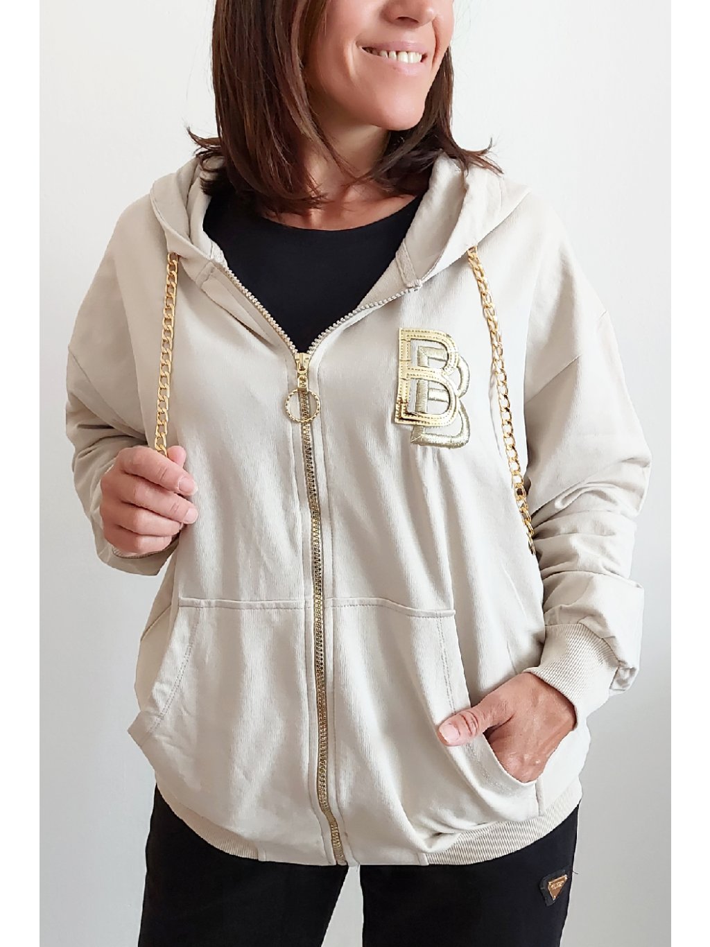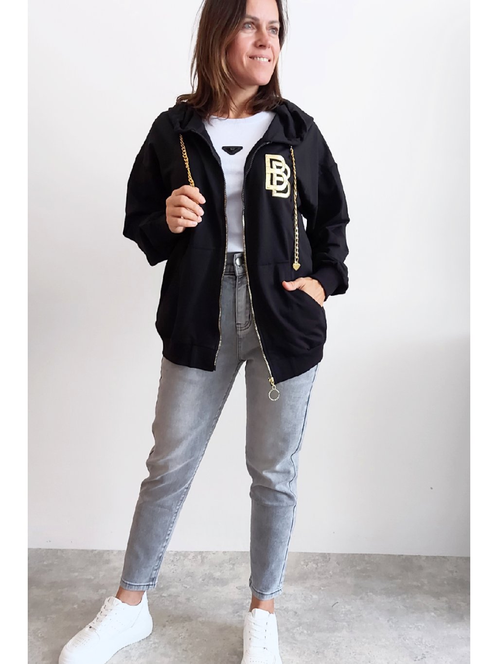 Mikina na zip s kapucí, v ní je ozdobný řetízek ve zlaté barvě. Ten lze sundat. Vpředu našitá ozdobná písmena ve zlatém provedení. Rukávy dlouhé. Rukávy i spodní lem ukončeny úpletem. Přední kapsy. Materiál prémiové kvality (vysoká gramáž bavlny). Luxusní kousek. Při praní doporučujeme řetízek vyvléct. Foceno na vel. XS, výška 156cm i na vel. 2XL (prsa 116cm, boky 120cm), výška 165cm.