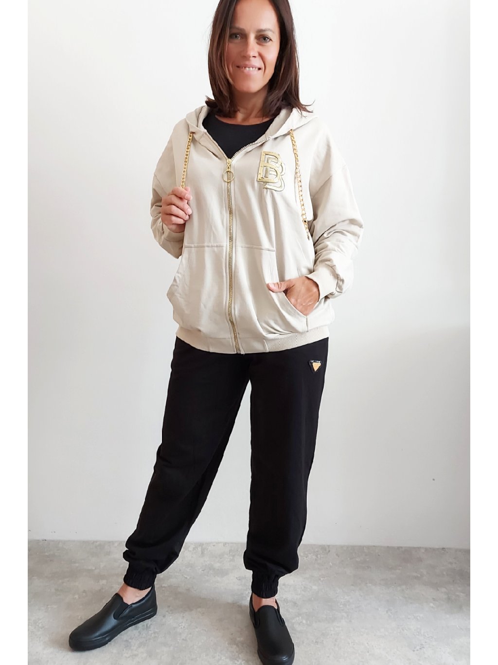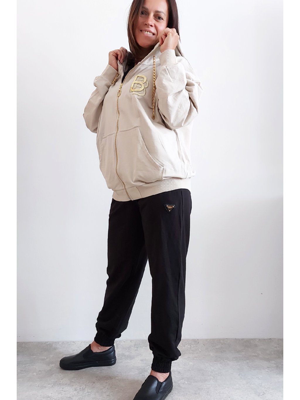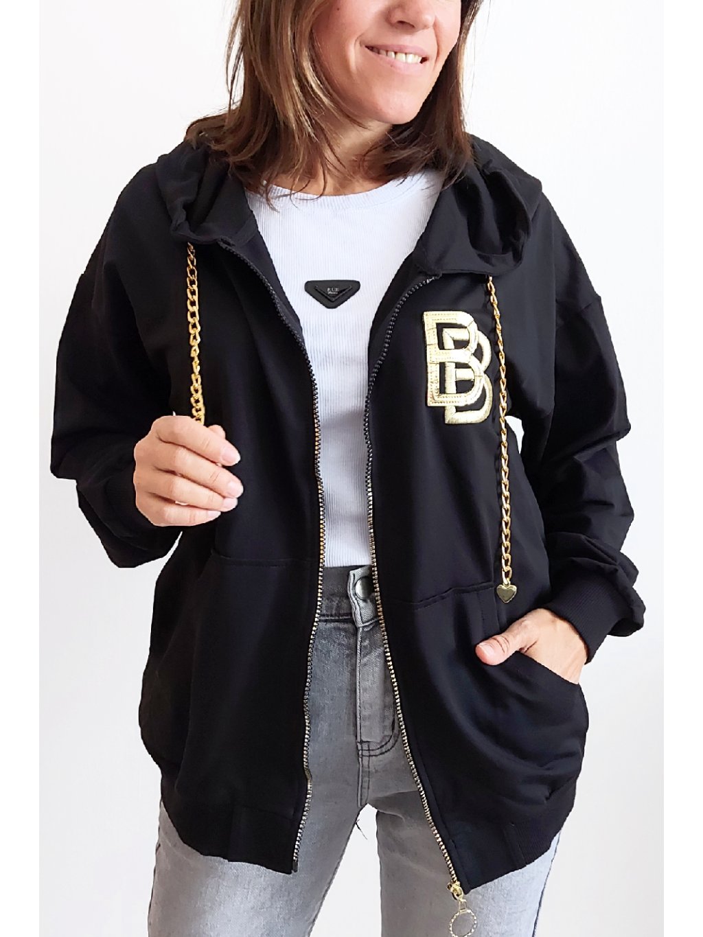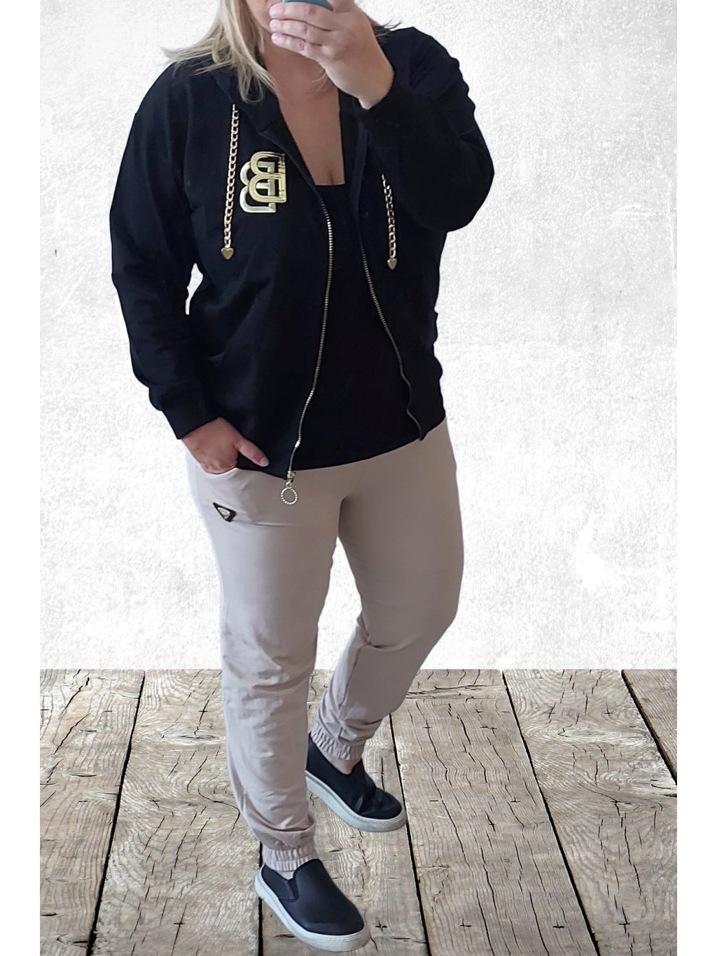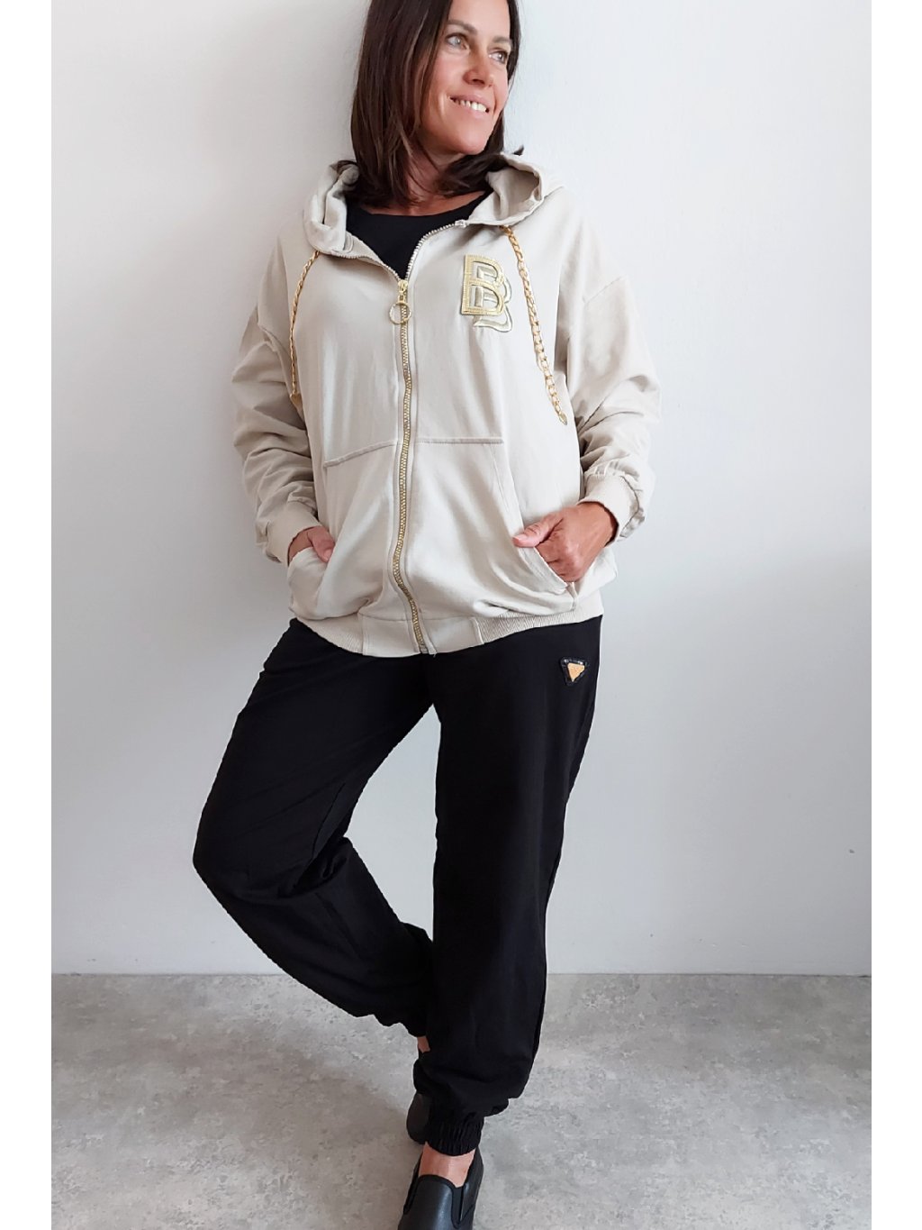 Mikina na zip s kapucí, v ní je ozdobný řetízek ve zlaté barvě. Ten lze sundat. Vpředu našitá ozdobná písmena ve zlatém provedení. Rukávy dlouhé. Rukávy i spodní lem ukončeny úpletem. Přední kapsy. Materiál prémiové kvality (vysoká gramáž bavlny). Luxusní kousek. Při praní doporučujeme řetízek vyvléct. Foceno na vel. XS, výška 156cm i na vel. 2XL (prsa 116cm, boky 120cm), výška 165cm.