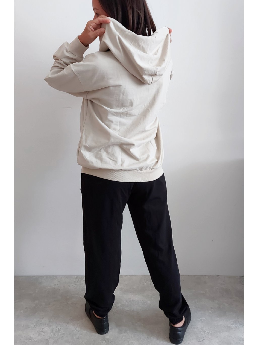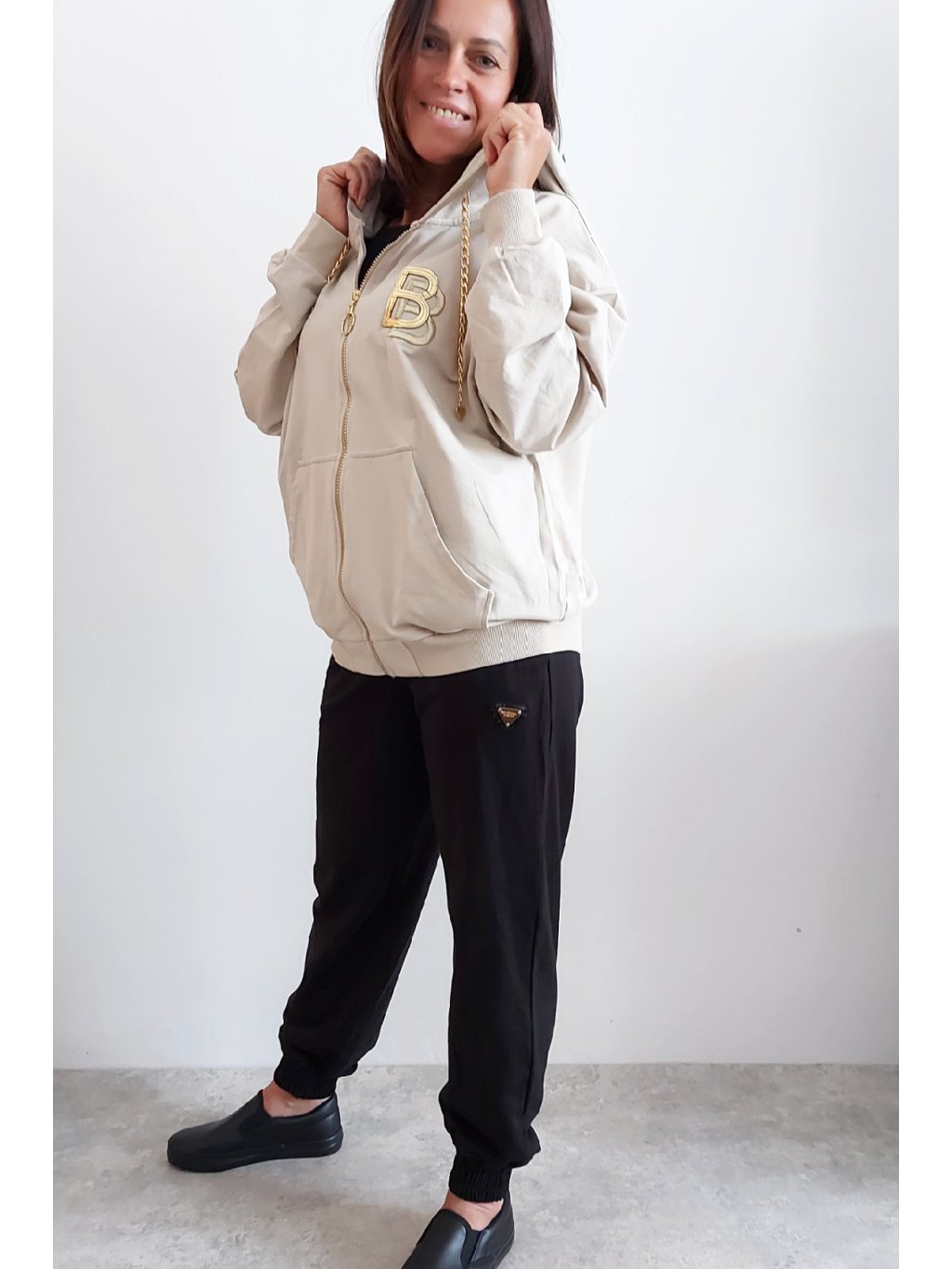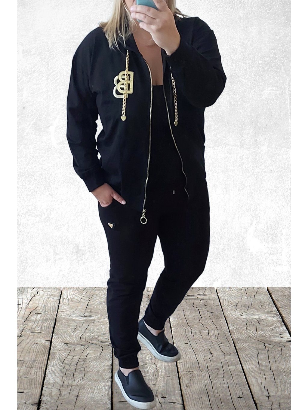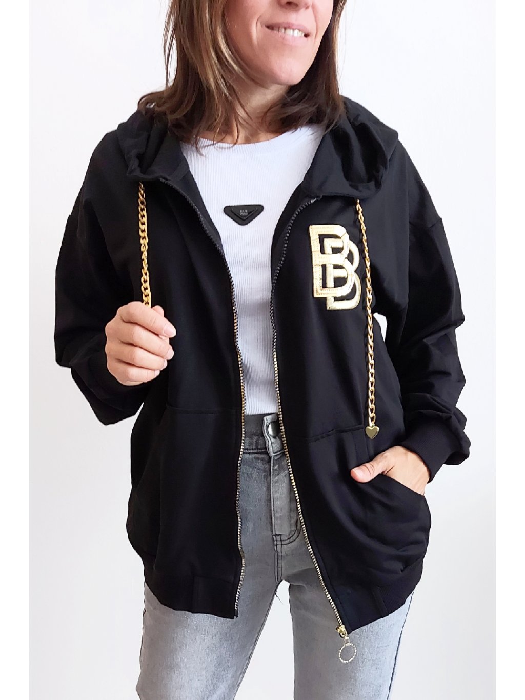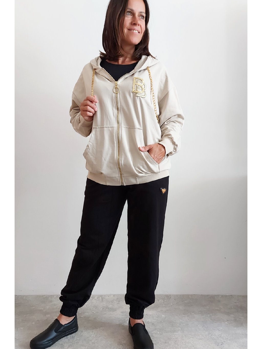 Mikina na zip s kapucí, v ní je ozdobný řetízek ve zlaté barvě. Ten lze sundat. Vpředu našitá ozdobná písmena ve zlatém provedení. Rukávy dlouhé. Rukávy i spodní lem ukončeny úpletem. Přední kapsy. Materiál prémiové kvality (vysoká gramáž bavlny). Luxusní kousek. Při praní doporučujeme řetízek vyvléct. Foceno na vel. XS, výška 156cm i na vel. 2XL (prsa 116cm, boky 120cm), výška 165cm.