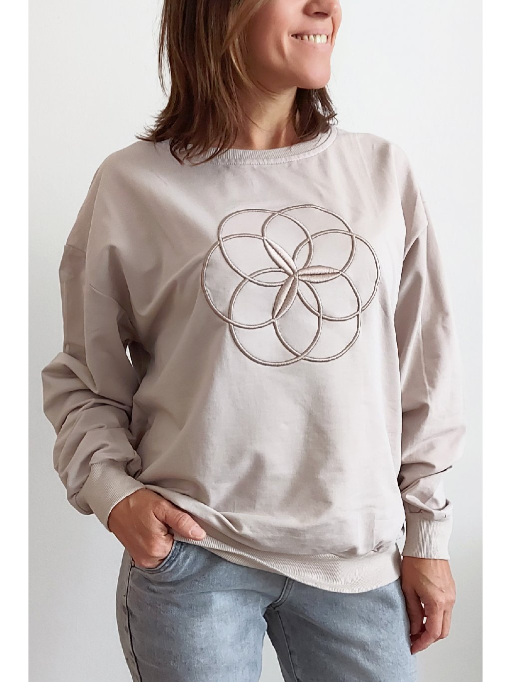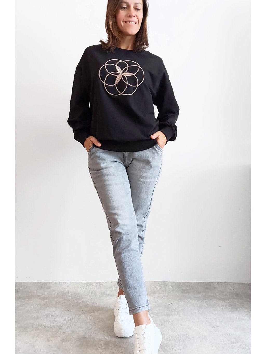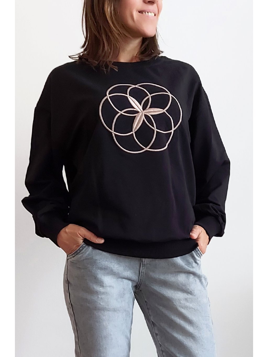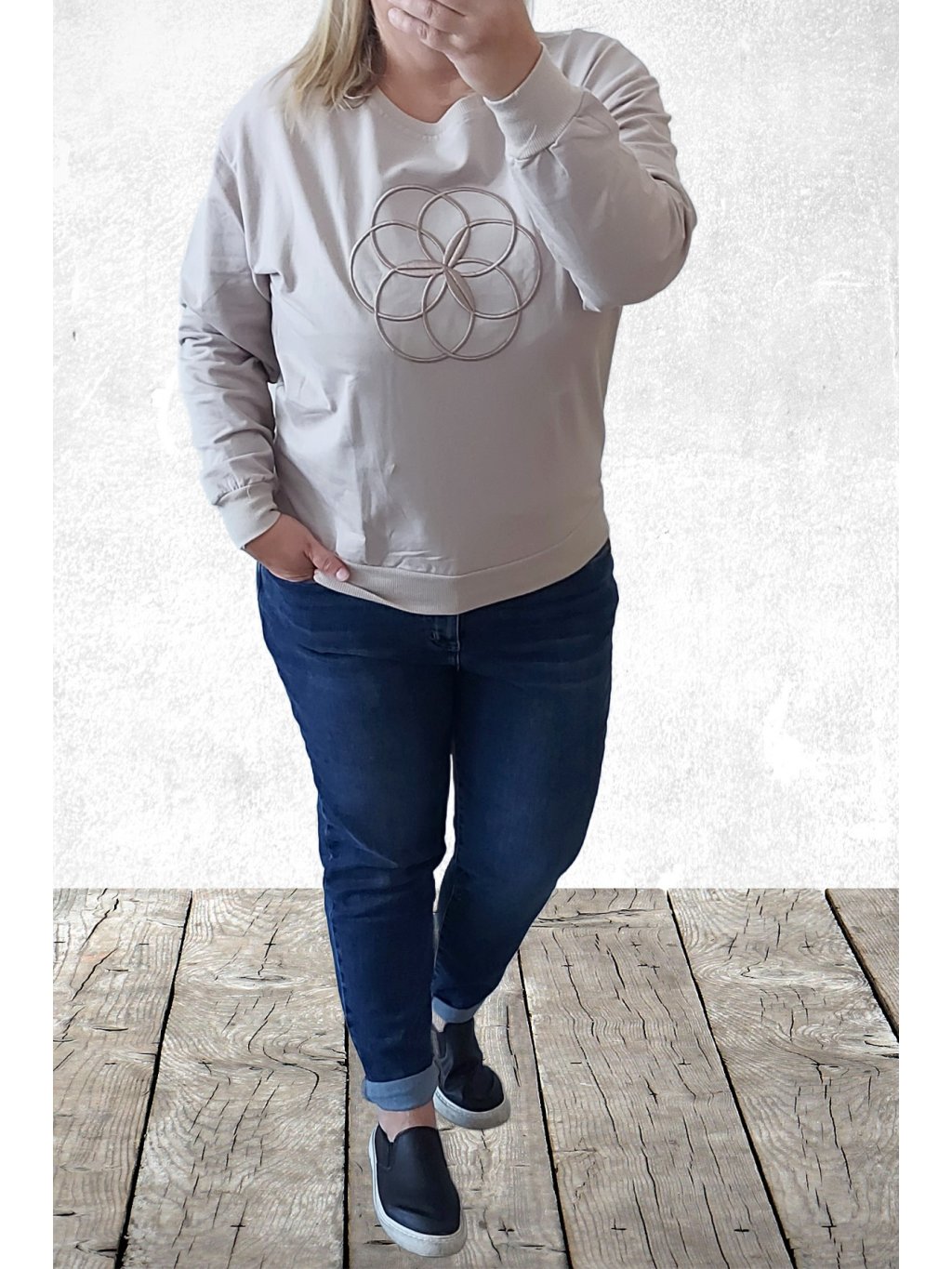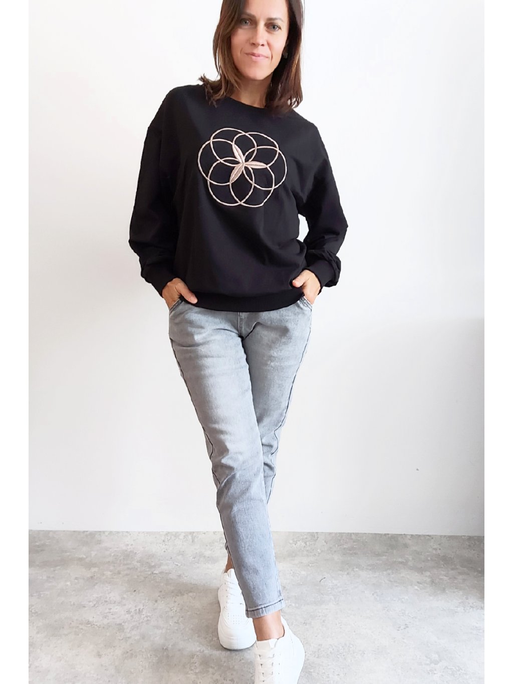 Mikina přes hlavu s výšivkou v přední části. Rukávy dlouhé ukončené úpletem. Spodní lem také zakončen úpletem. Materiál prémiový, kvalitní - bavlna vyšší gramáže. Foceno na vel. XS, výška 156cm i na vel. 2XL (prsa 116cm, boky 120cm), výška 165cm.