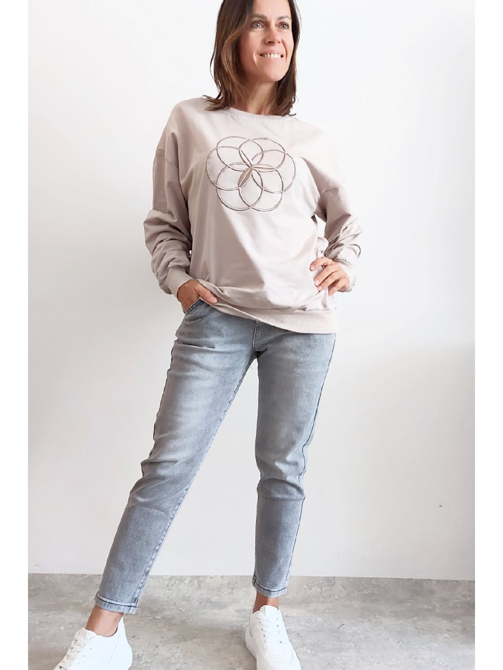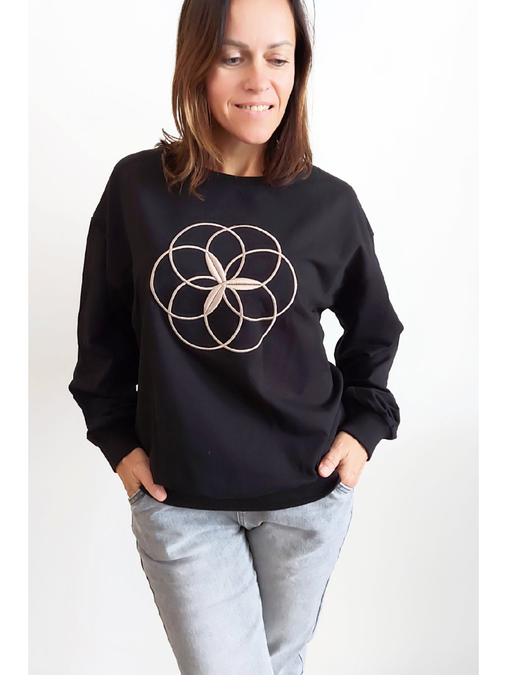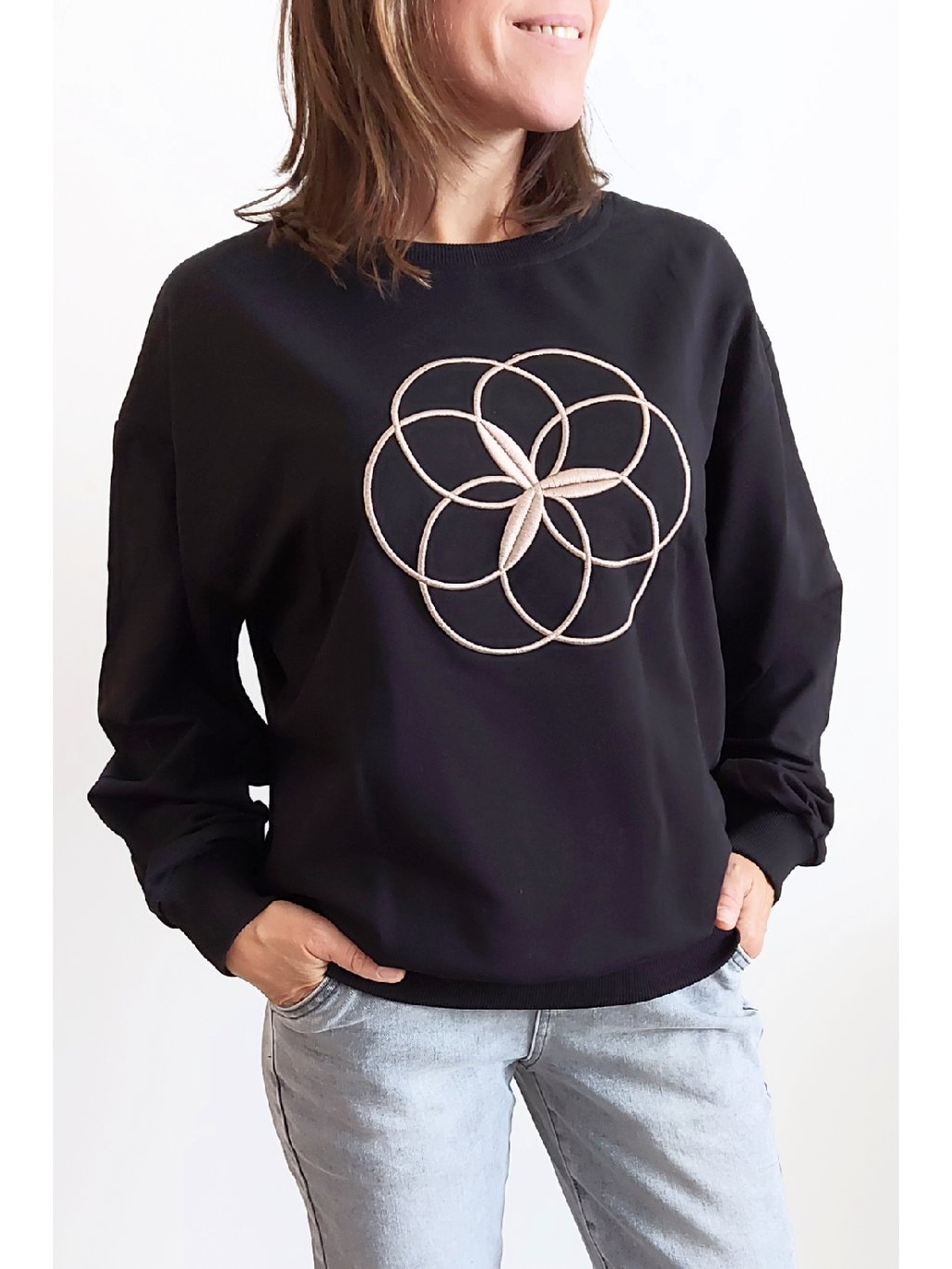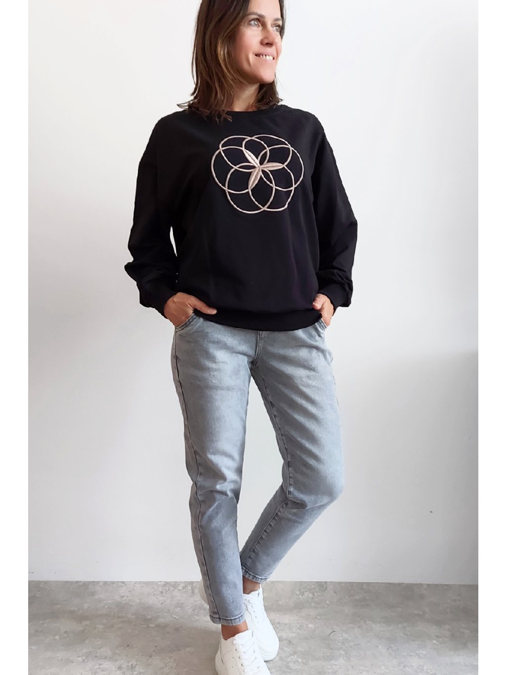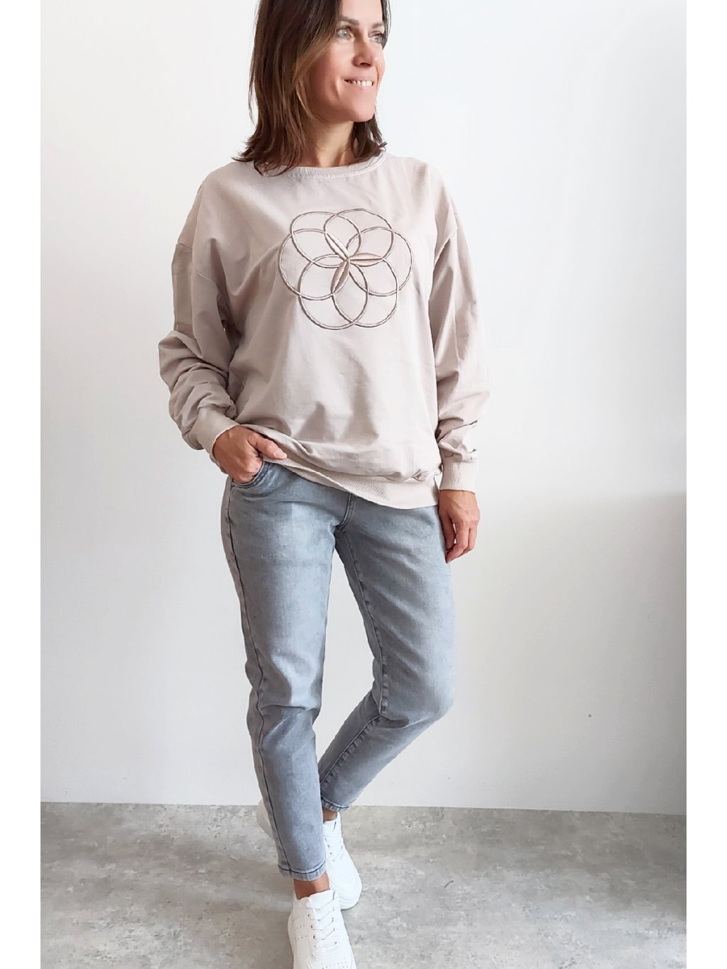 Mikina přes hlavu s výšivkou v přední části. Rukávy dlouhé ukončené úpletem. Spodní lem také zakončen úpletem. Materiál prémiový, kvalitní - bavlna vyšší gramáže. Foceno na vel. XS, výška 156cm i na vel. 2XL (prsa 116cm, boky 120cm), výška 165cm.