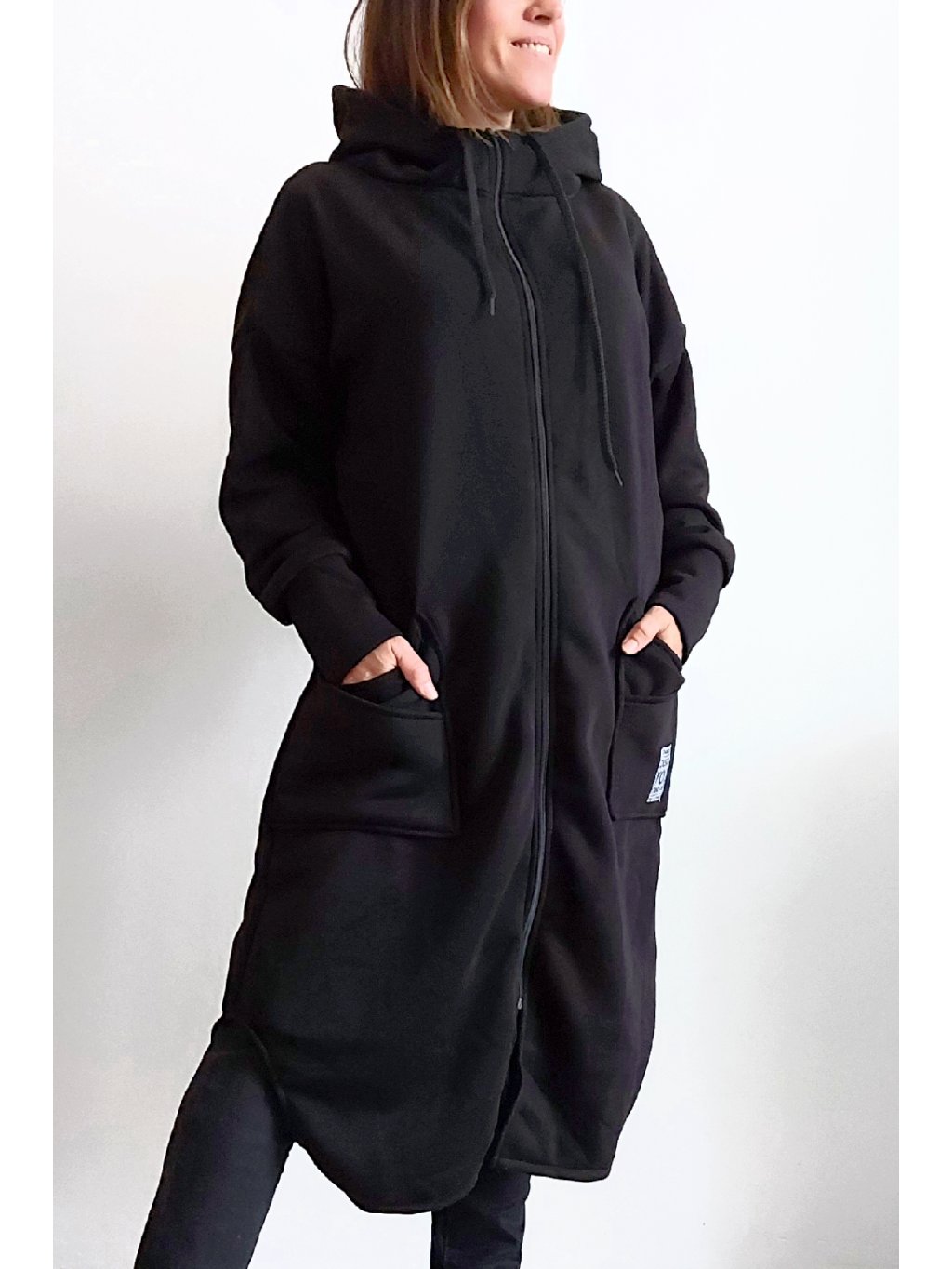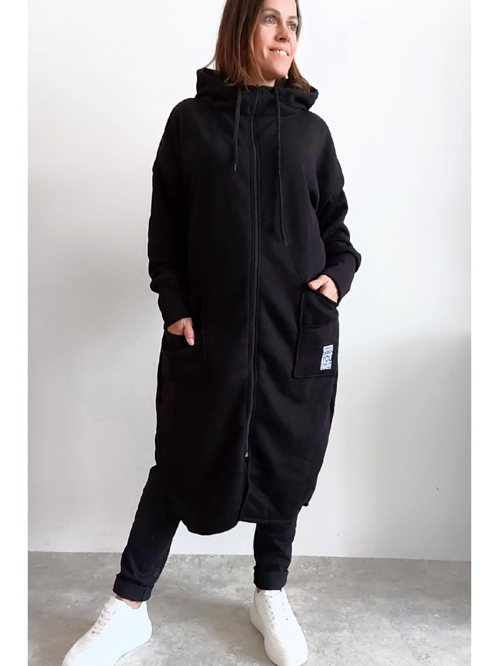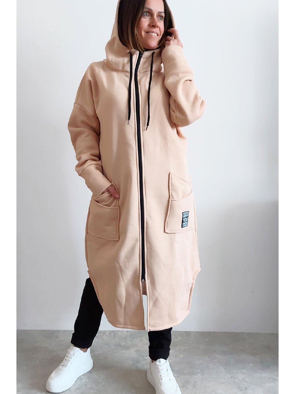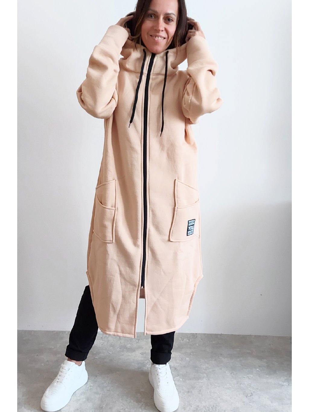 Mikinový kabát z úžasného, velmi kvalitního materiálu. Má kapuci, zapínání je na zip. Uvnitř zateplený kratším chloupkem - hřejivý. Rukávy dlouhé. Přední kapsy, na jedné z nich je ozdobná nášivka. Po bocích vykrojené. Vhodné i pro větší velikosti. Foceno na vel. XS, výška 156cm i na vel. 2XL (prsa 116cm, pas 110cm, boky 119cm), výška 165cm.