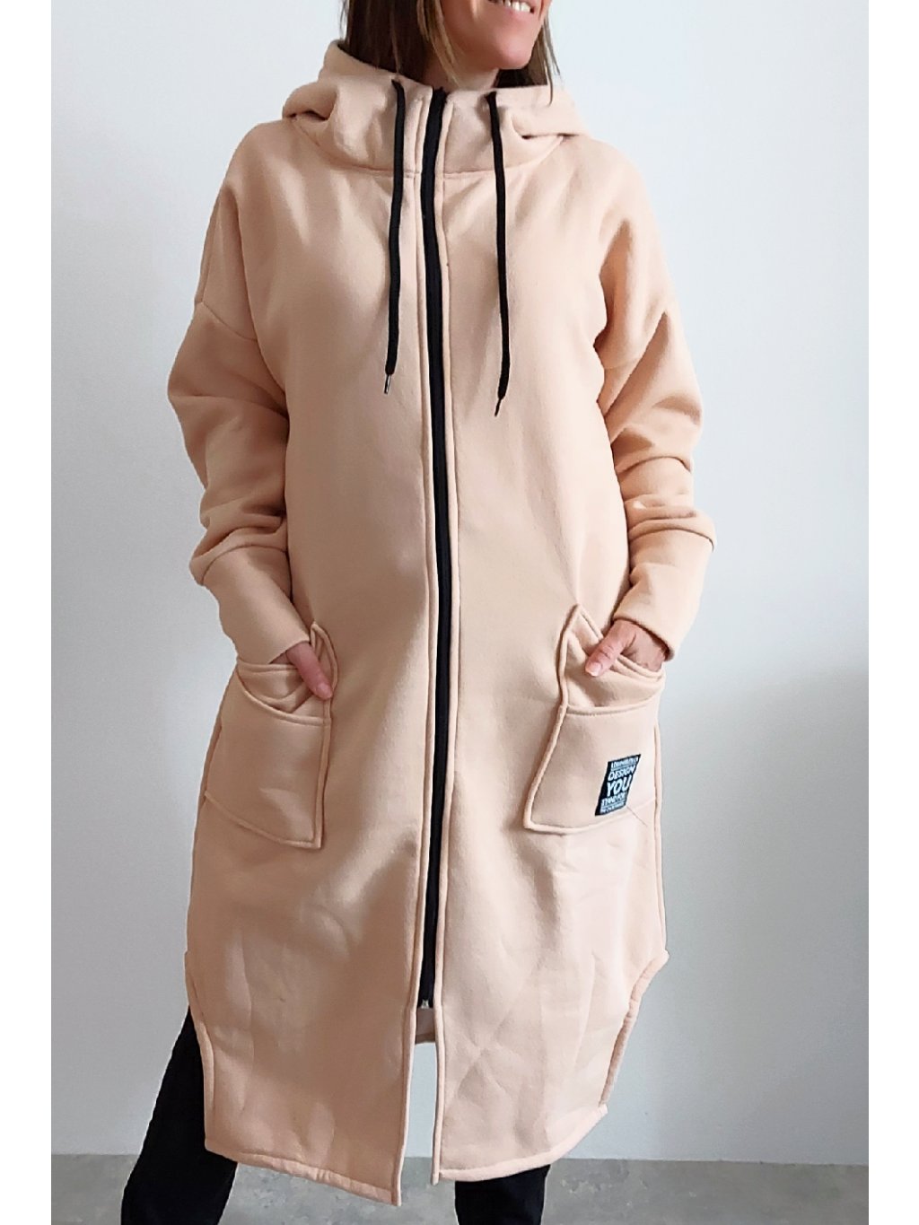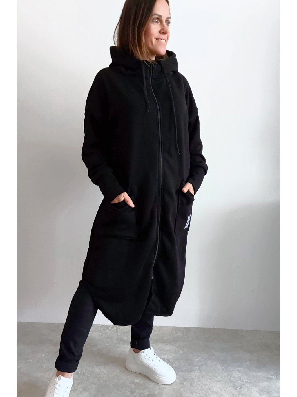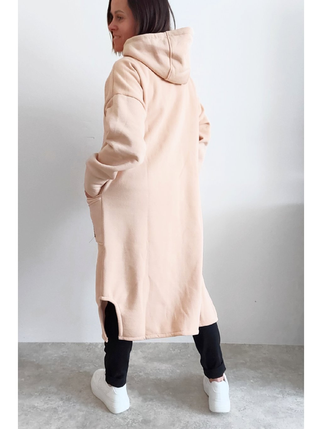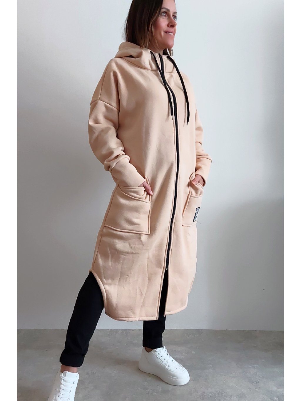 Mikinový kabát z úžasného, velmi kvalitního materiálu. Má kapuci, zapínání je na zip. Uvnitř zateplený kratším chloupkem - hřejivý. Rukávy dlouhé. Přední kapsy, na jedné z nich je ozdobná nášivka. Po bocích vykrojené. Vhodné i pro větší velikosti. Foceno na vel. XS, výška 156cm i na vel. 2XL (prsa 116cm, pas 110cm, boky 119cm), výška 165cm.
