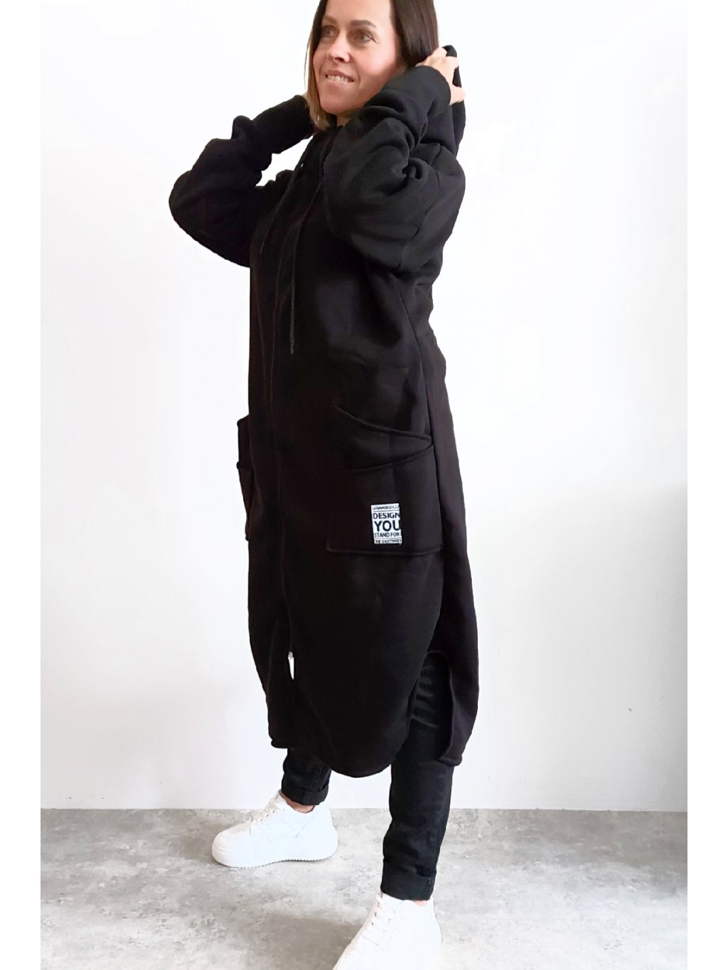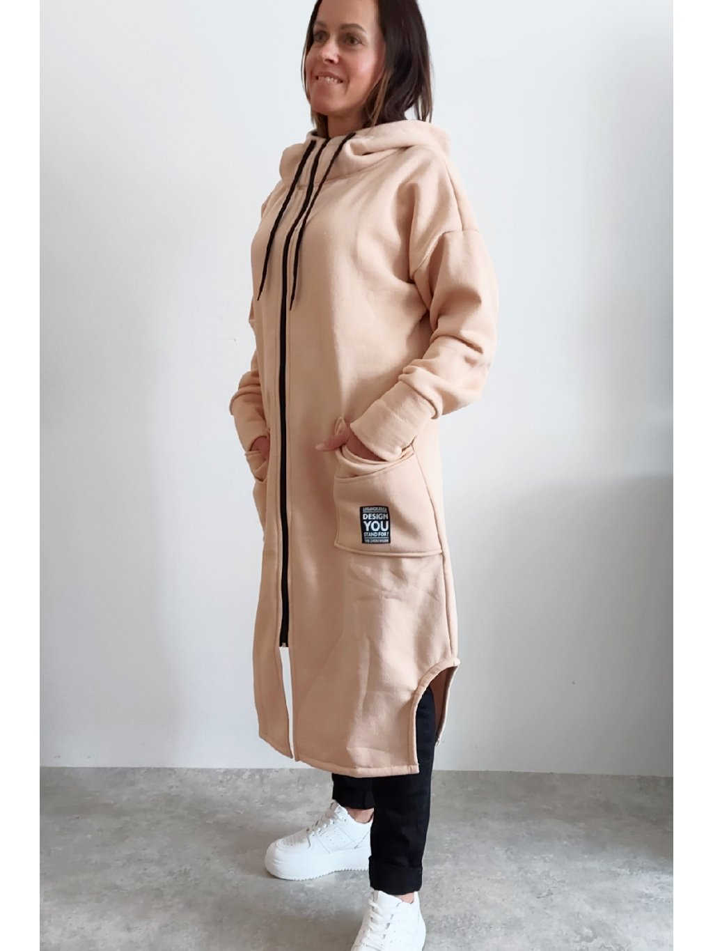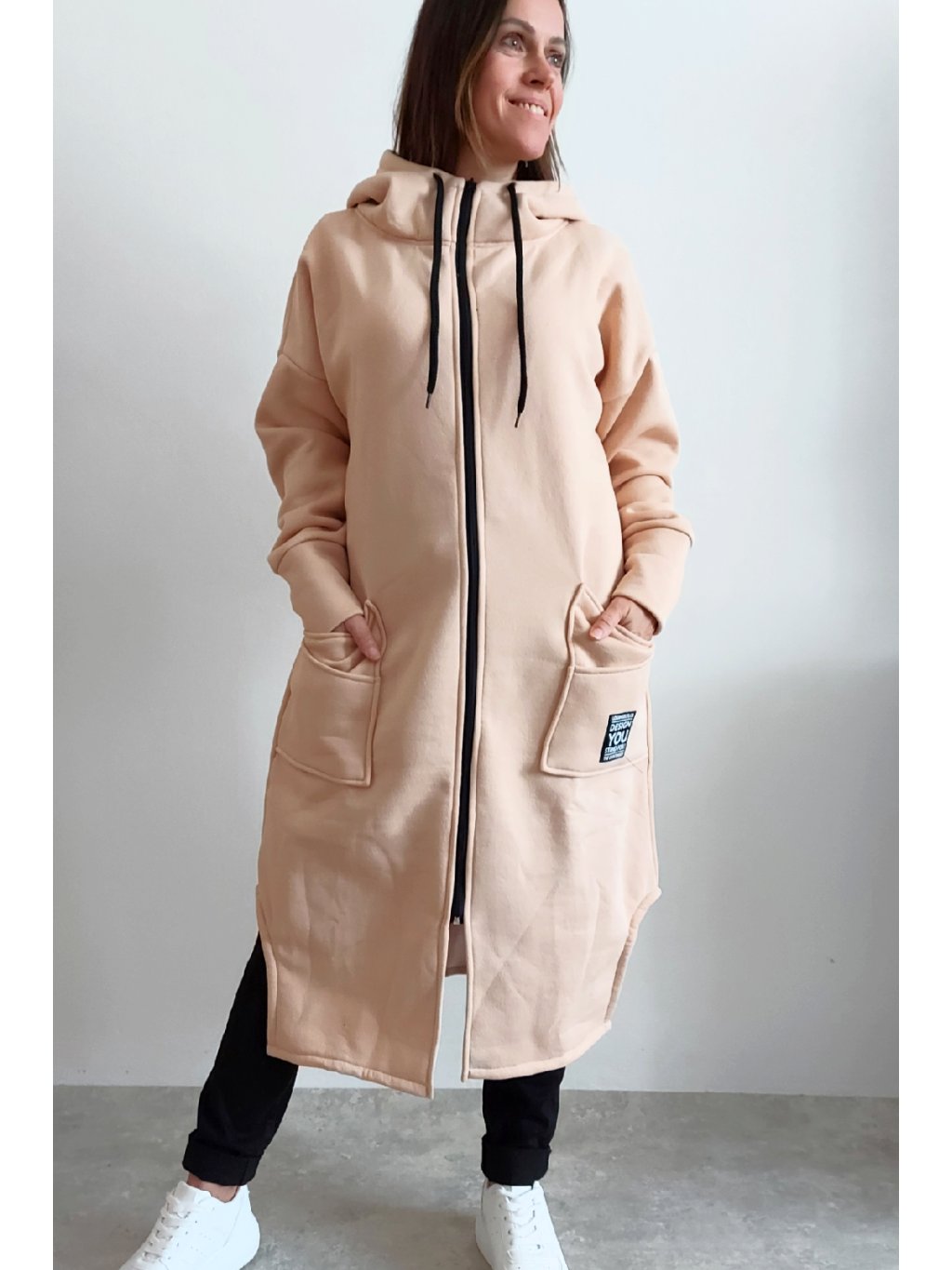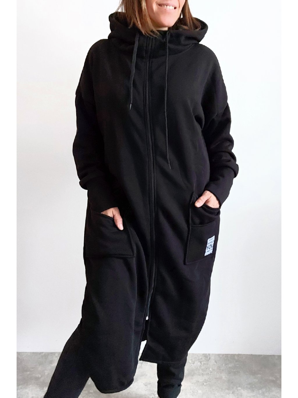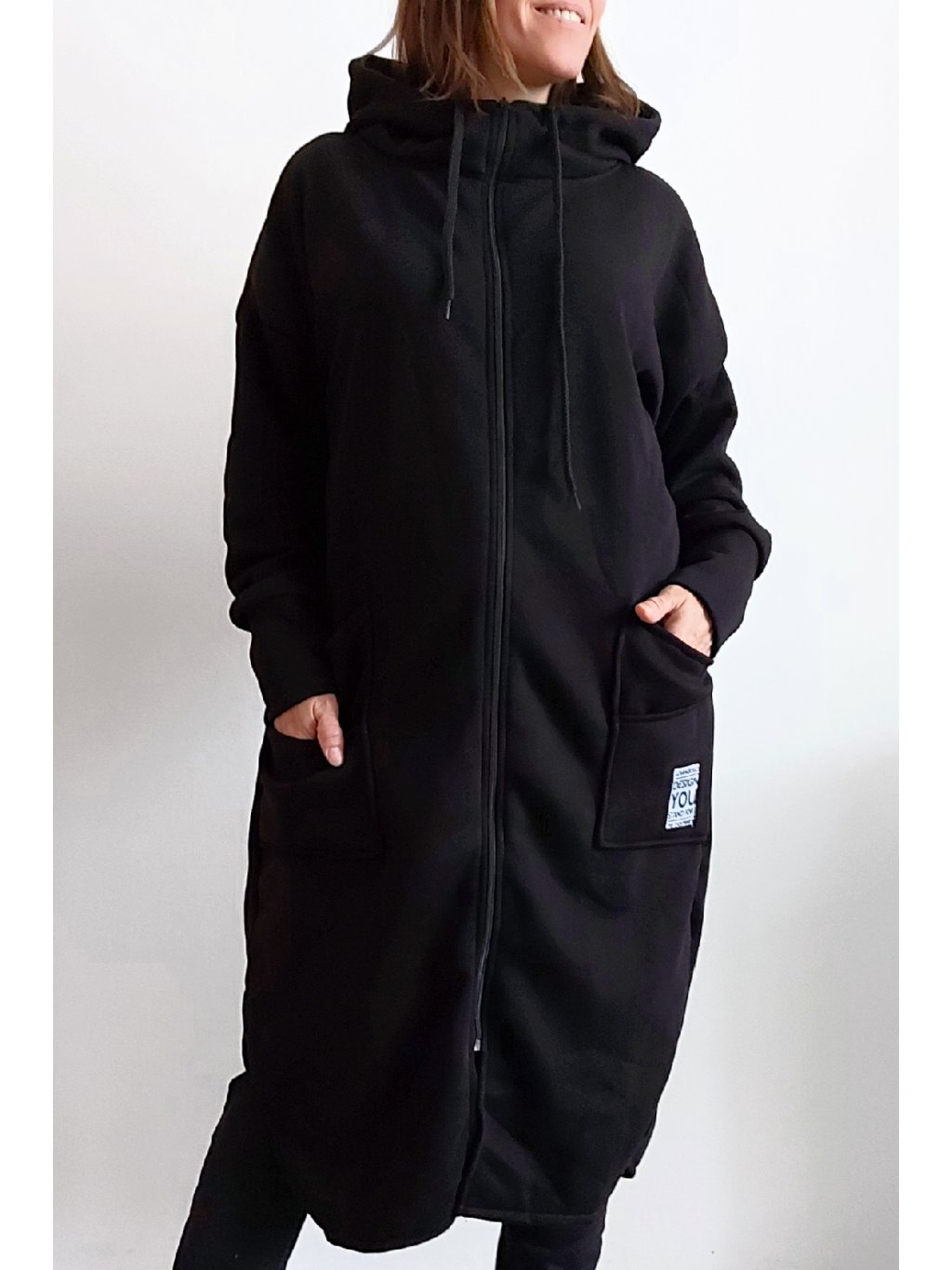 Mikinový kabát z úžasného, velmi kvalitního materiálu. Má kapuci, zapínání je na zip. Uvnitř zateplený kratším chloupkem - hřejivý. Rukávy dlouhé. Přední kapsy, na jedné z nich je ozdobná nášivka. Po bocích vykrojené. Vhodné i pro větší velikosti. Foceno na vel. XS, výška 156cm i na vel. 2XL (prsa 116cm, pas 110cm, boky 119cm), výška 165cm.