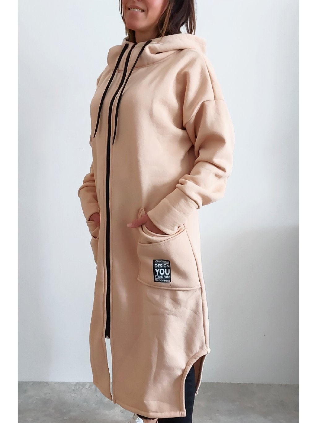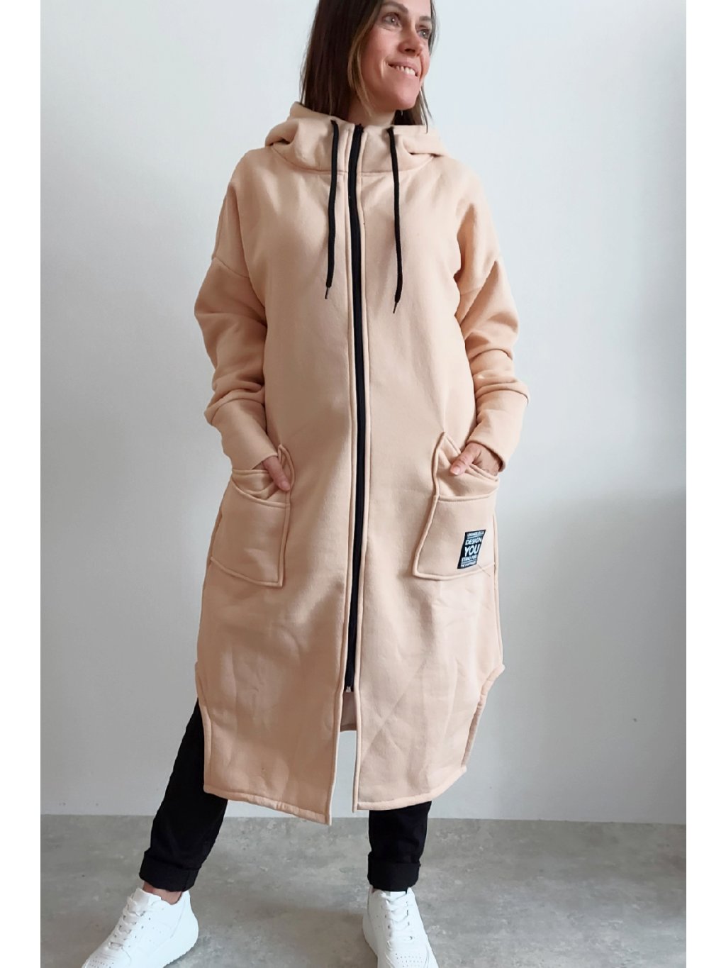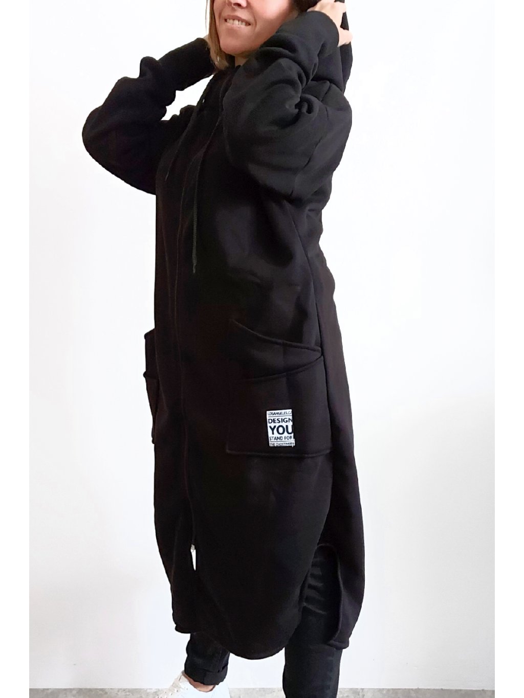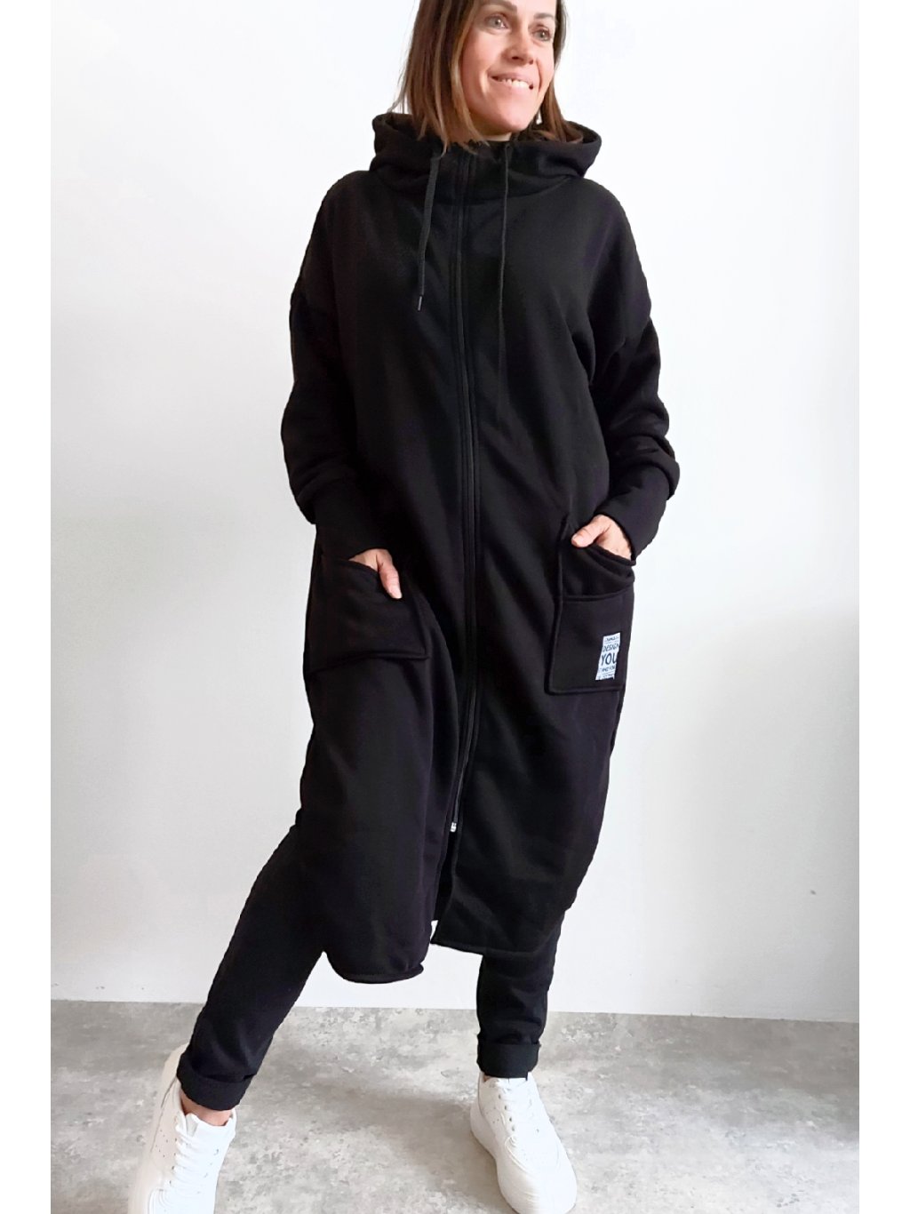 Mikinový kabát z úžasného, velmi kvalitního materiálu. Má kapuci, zapínání je na zip. Uvnitř zateplený kratším chloupkem - hřejivý. Rukávy dlouhé. Přední kapsy, na jedné z nich je ozdobná nášivka. Po bocích vykrojené. Vhodné i pro větší velikosti. Foceno na vel. XS, výška 156cm i na vel. 2XL (prsa 116cm, pas 110cm, boky 119cm), výška 165cm.
