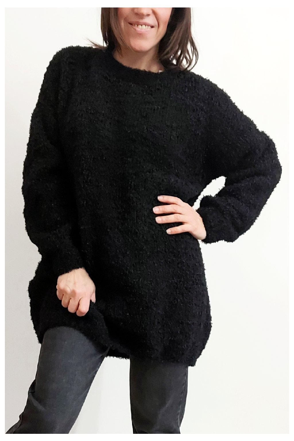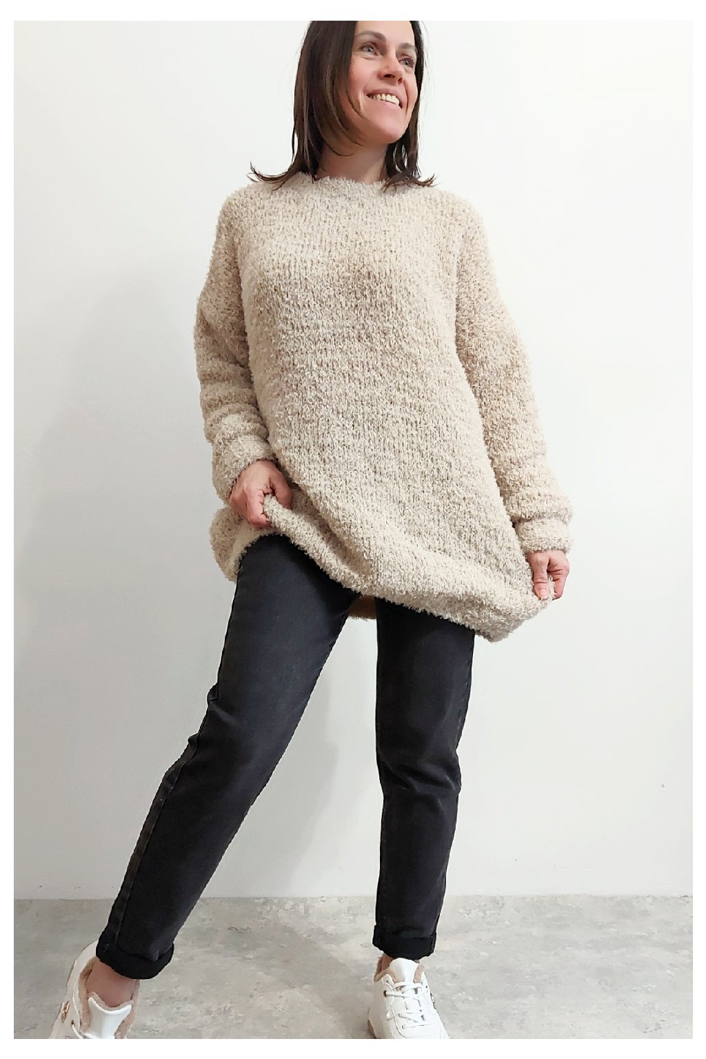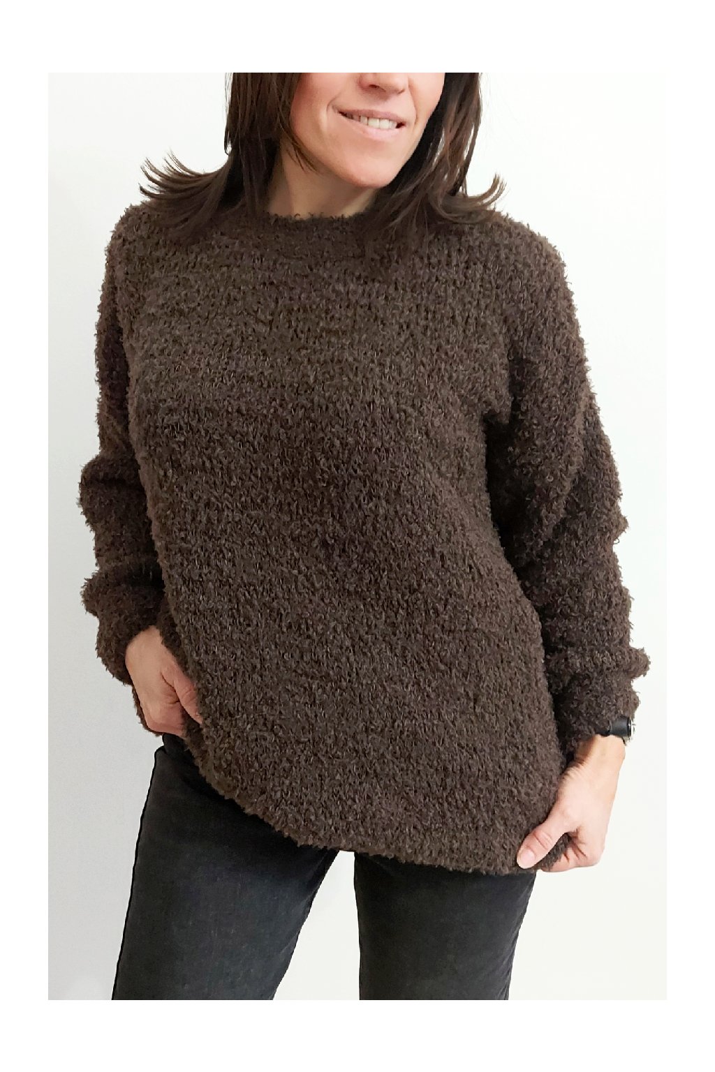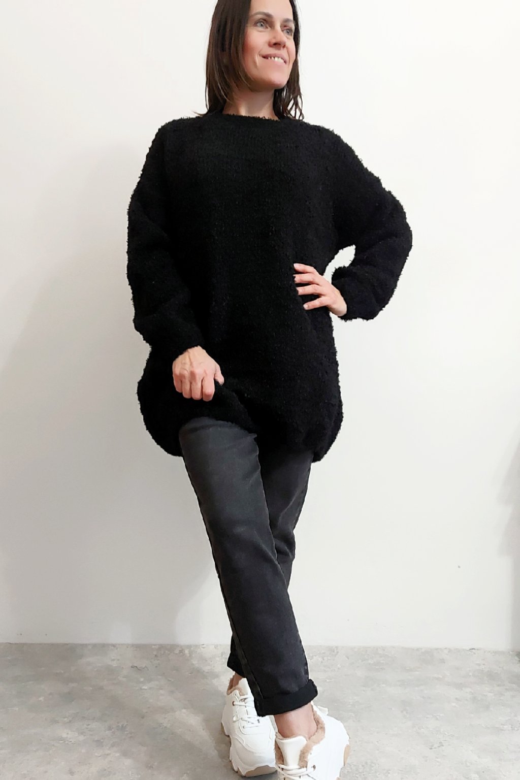 Hrubý, hřejivý svetr s obsahem moheru. Volný střih. Velmi teplý, nekousavý materiál. Vhodný i pro větší velikosti ( u menších velikostí je volnější). Foceno na vel. XS, výška 156cm i na vel. 2XL (prsa 116cm, boky 120cm), výška 165cm. U menších velikostí je svetr volný.