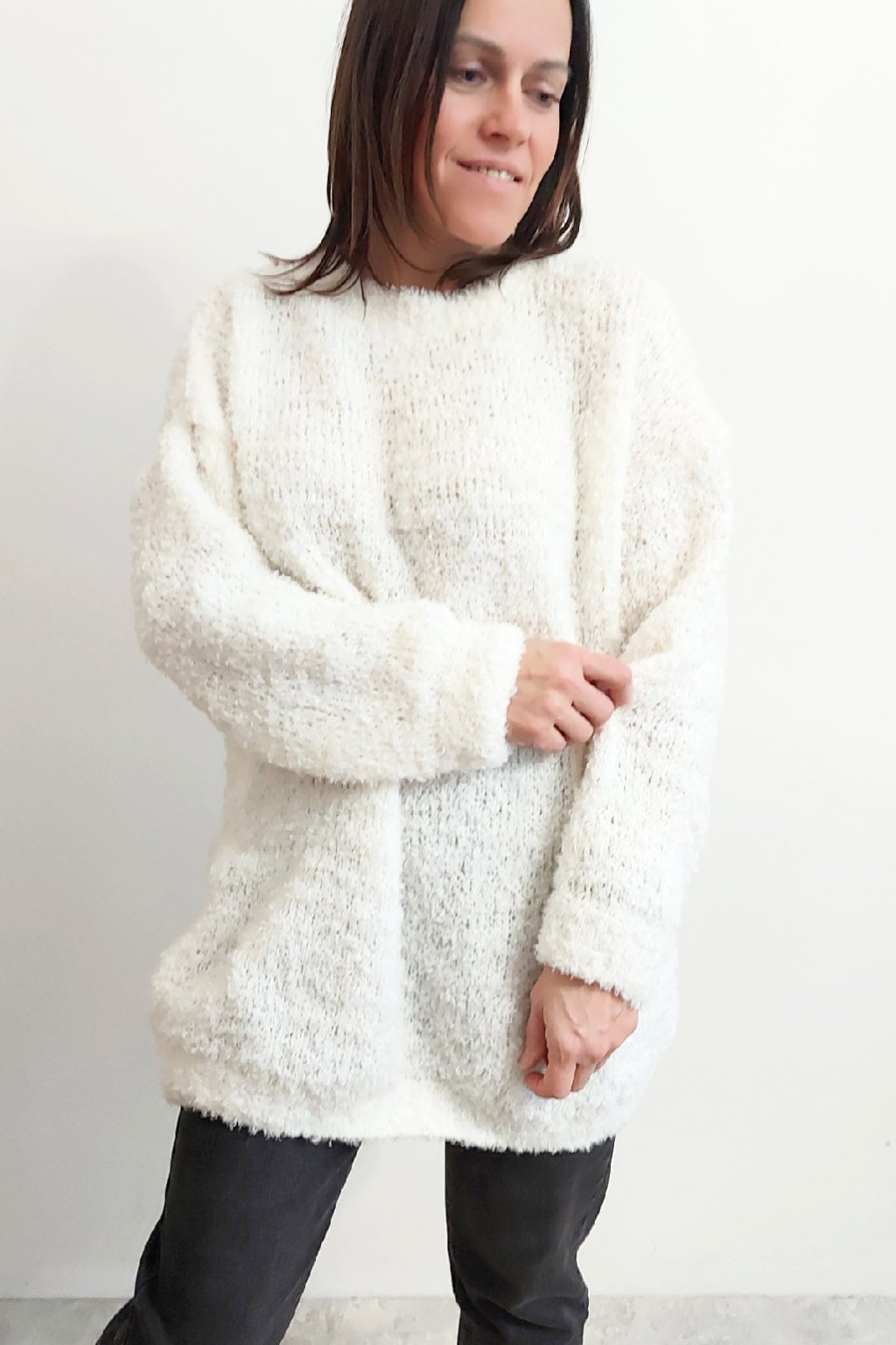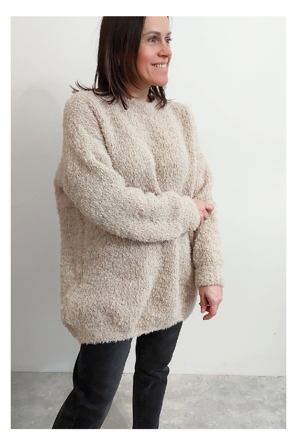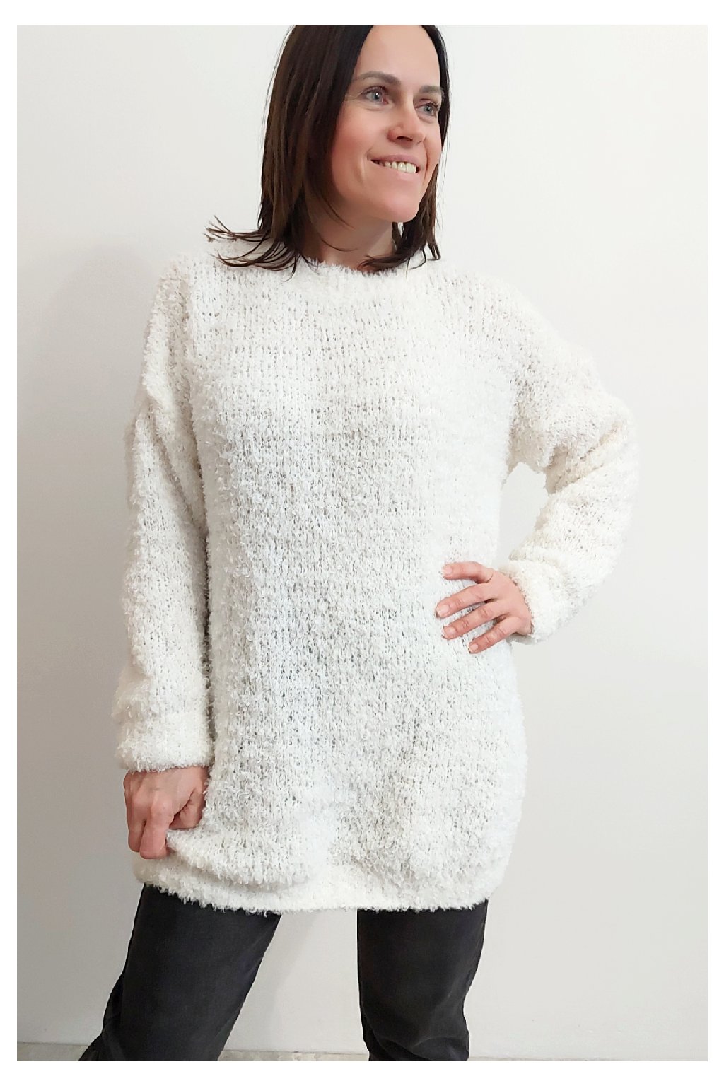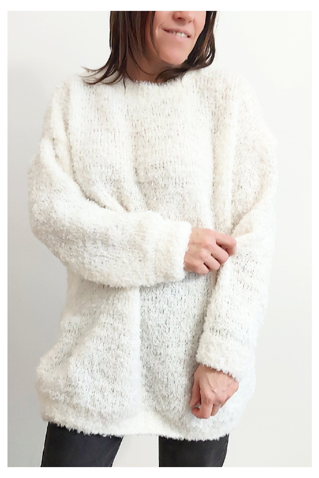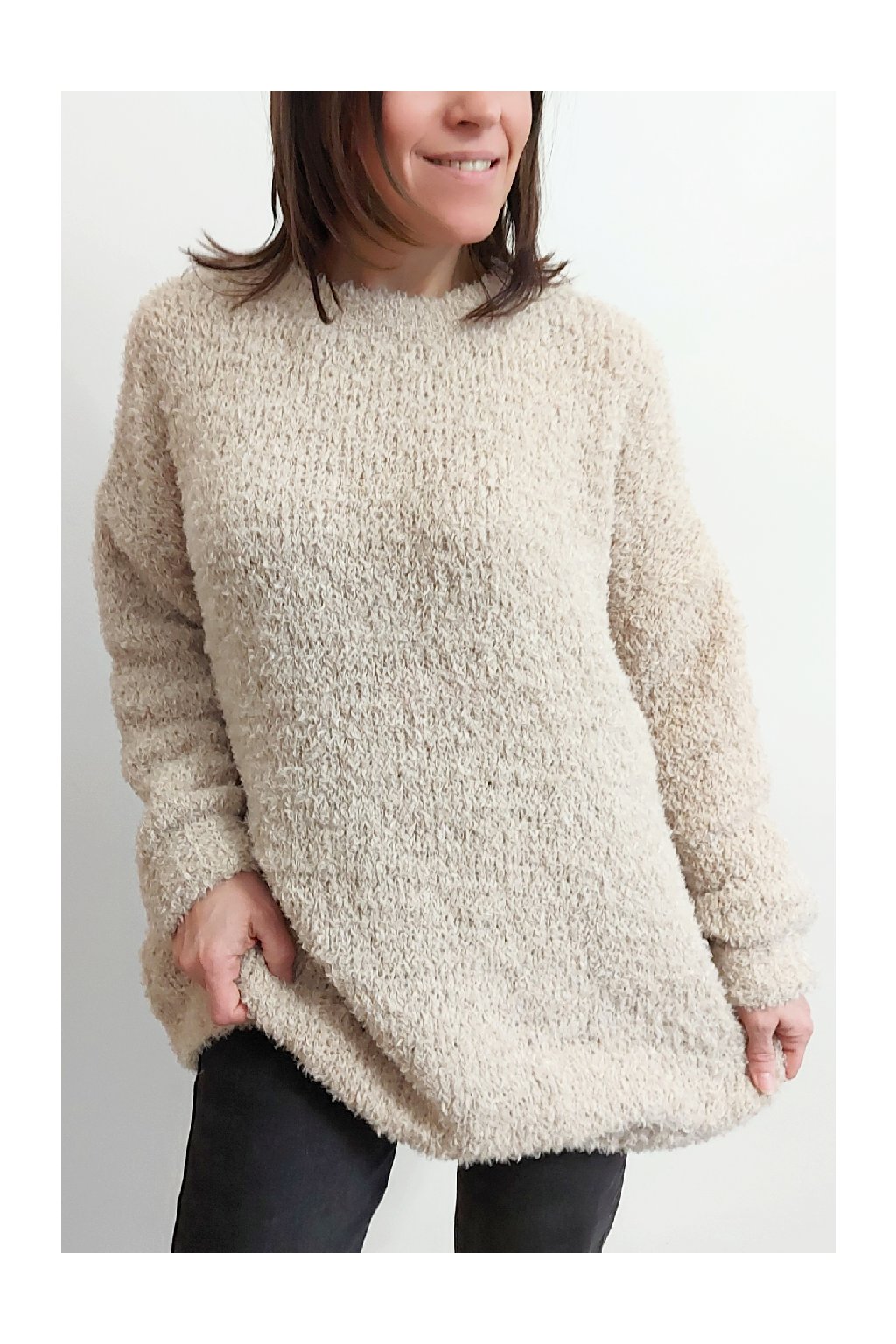 Hrubý, hřejivý svetr s obsahem moheru. Volný střih. Velmi teplý, nekousavý materiál. Vhodný i pro větší velikosti ( u menších velikostí je volnější). Foceno na vel. XS, výška 156cm i na vel. 2XL (prsa 116cm, boky 120cm), výška 165cm. U menších velikostí je svetr volný.
