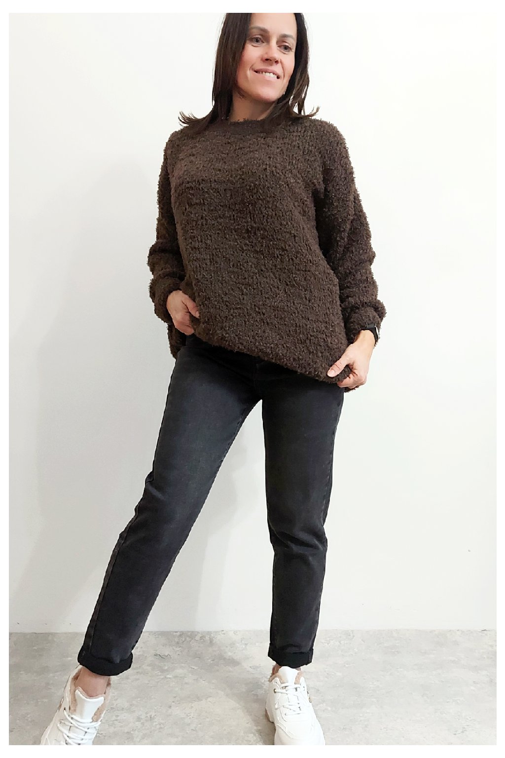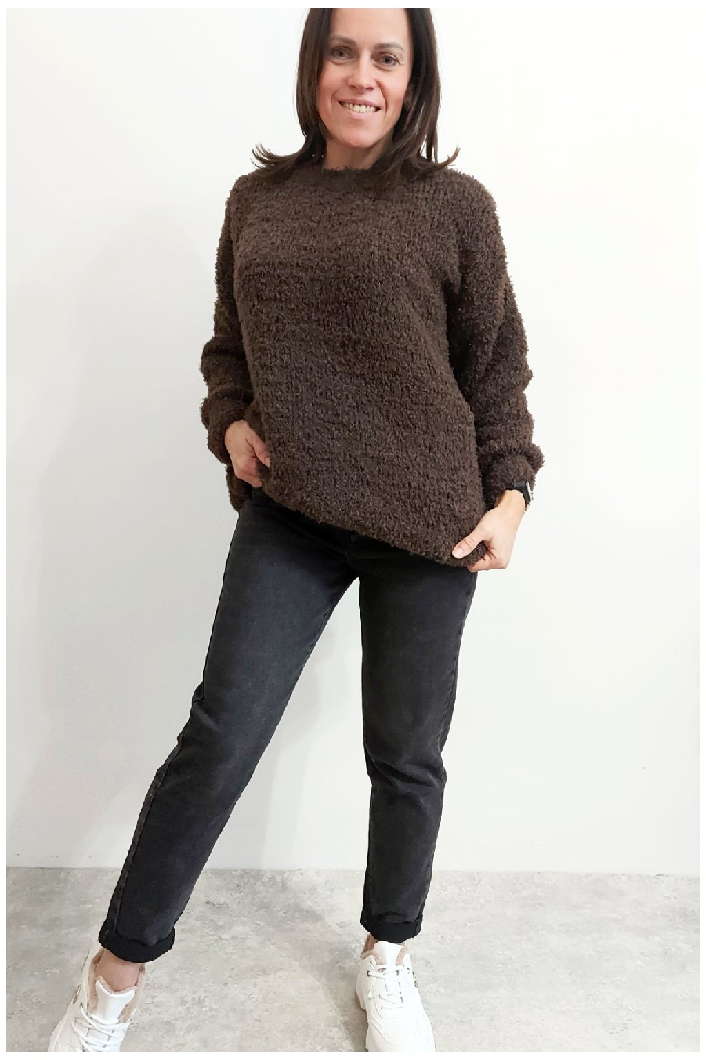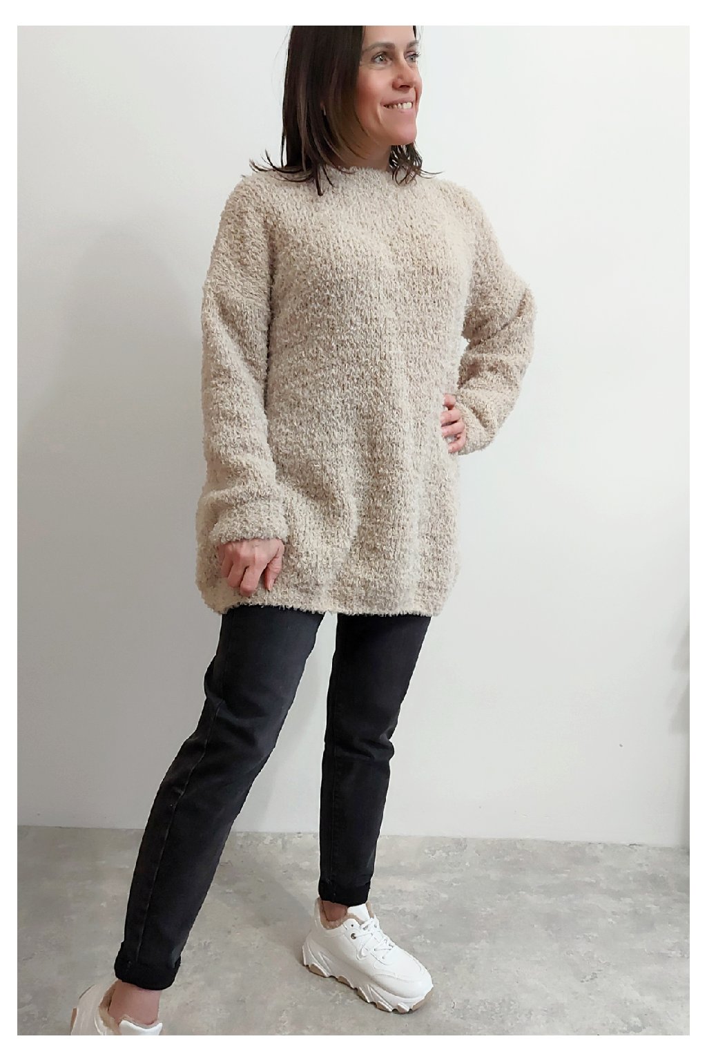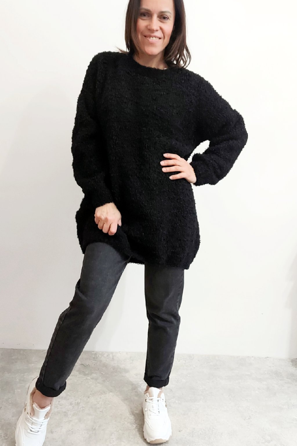 Hrubý, hřejivý svetr s obsahem moheru. Volný střih. Velmi teplý, nekousavý materiál. Vhodný i pro větší velikosti ( u menších velikostí je volnější). Foceno na vel. XS, výška 156cm i na vel. 2XL (prsa 116cm, boky 120cm), výška 165cm. U menších velikostí je svetr volný.