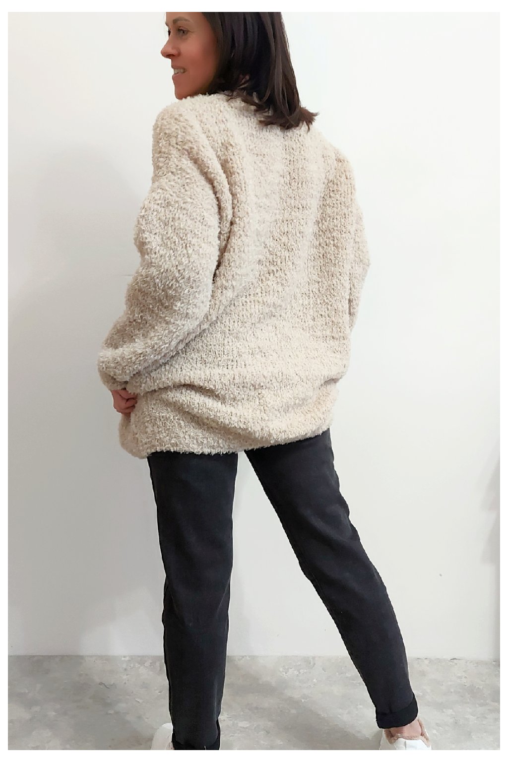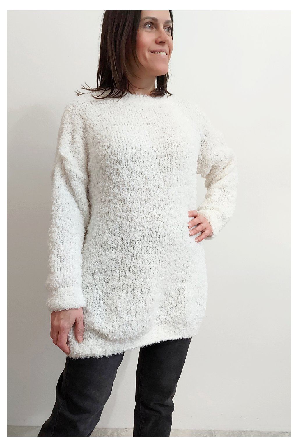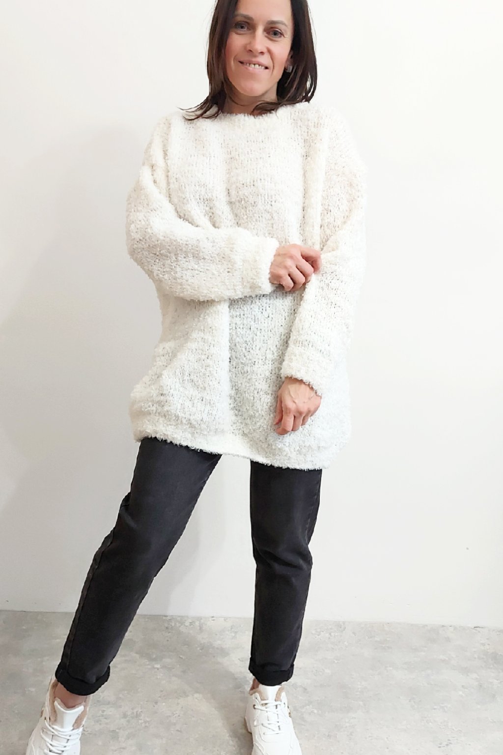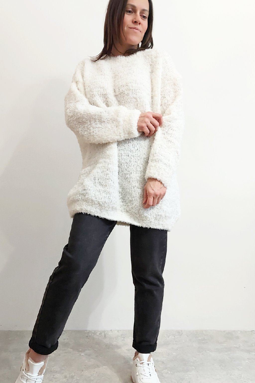 Hrubý, hřejivý svetr s obsahem moheru. Volný střih. Velmi teplý, nekousavý materiál. Vhodný i pro větší velikosti ( u menších velikostí je volnější). Foceno na vel. XS, výška 156cm i na vel. 2XL (prsa 116cm, boky 120cm), výška 165cm. U menších velikostí je svetr volný.