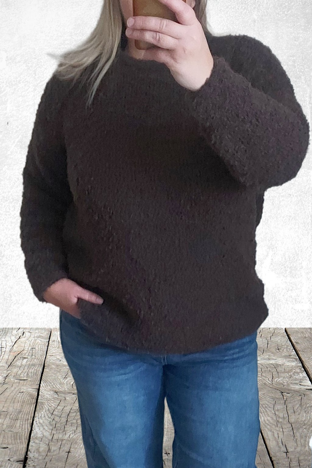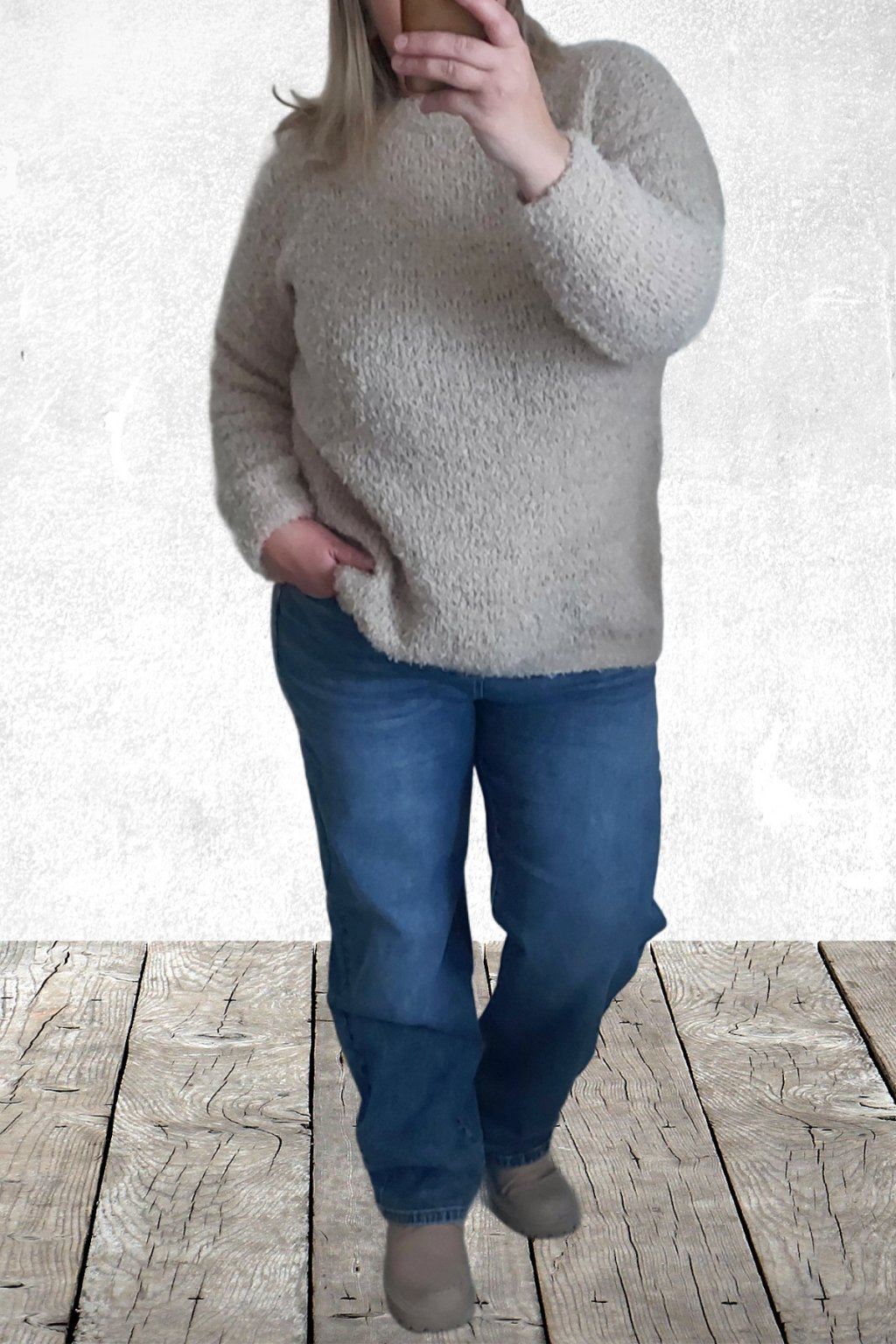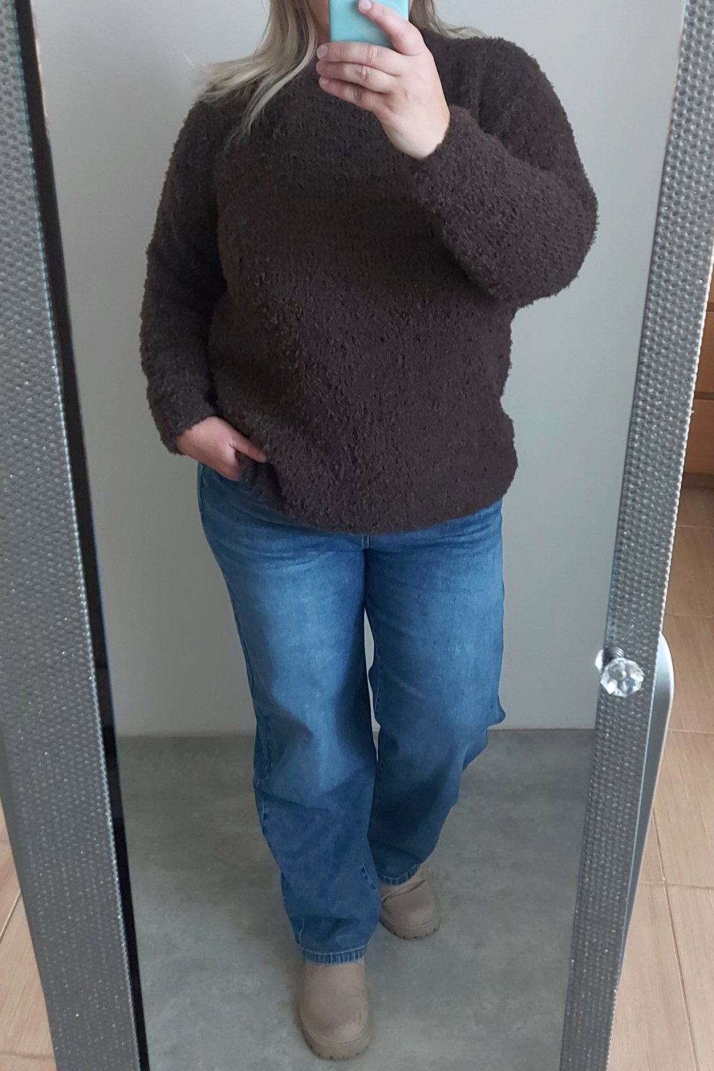 Hrubý, hřejivý svetr s obsahem moheru. Volný střih. Velmi teplý, nekousavý materiál. Vhodný i pro větší velikosti ( u menších velikostí je volnější). Foceno na vel. 2XL (prsa 116cm, boky 120cm), výška 165cm.