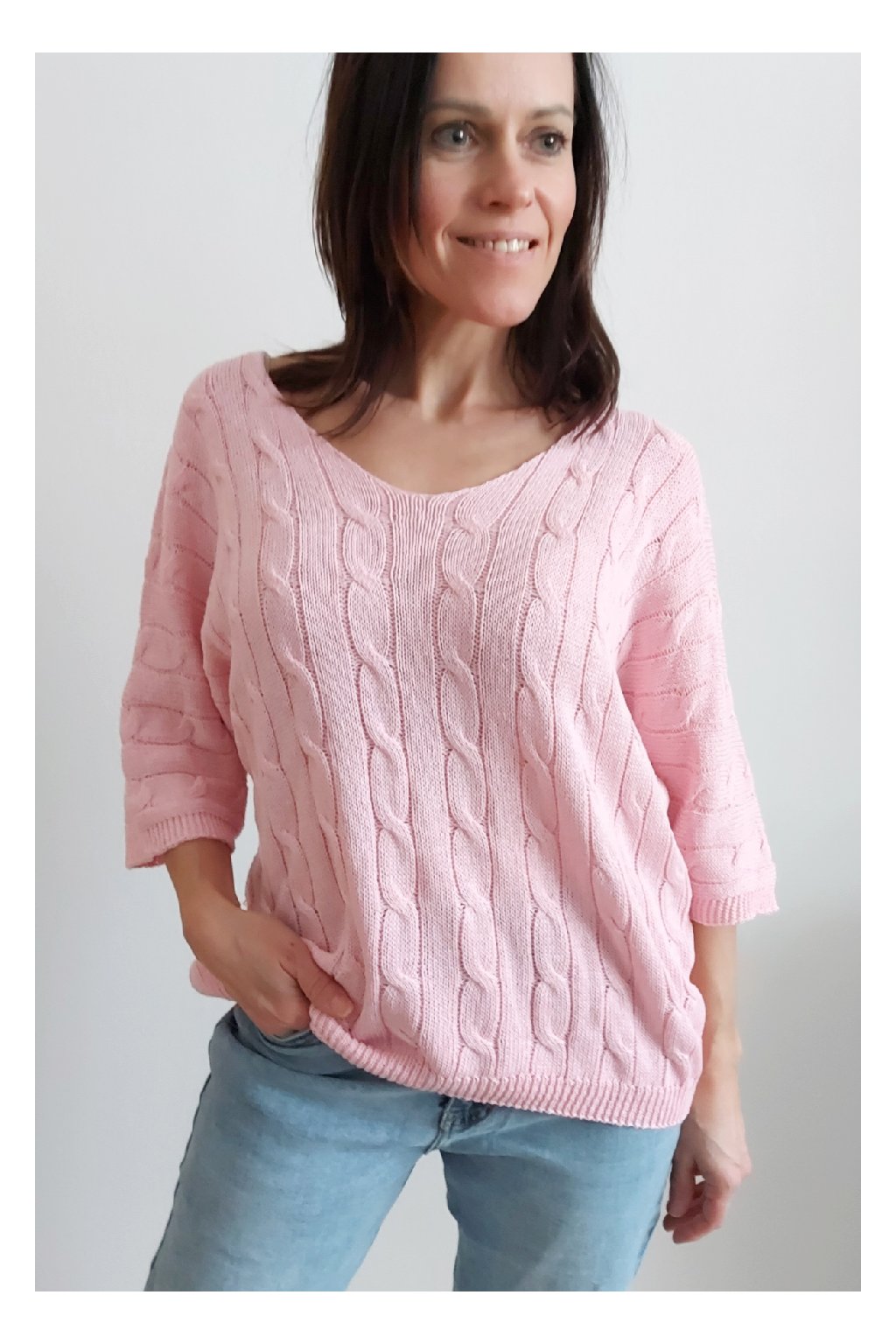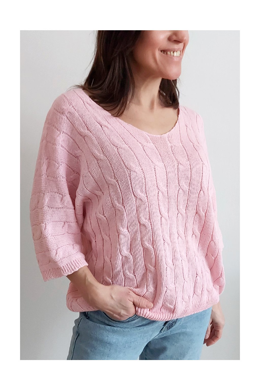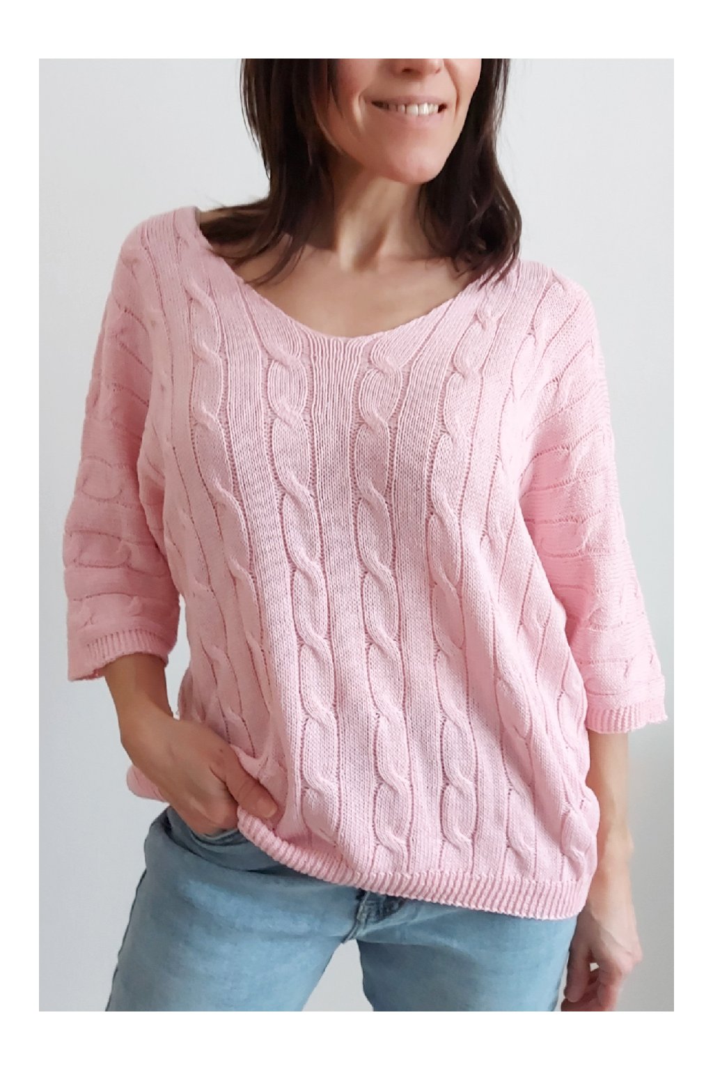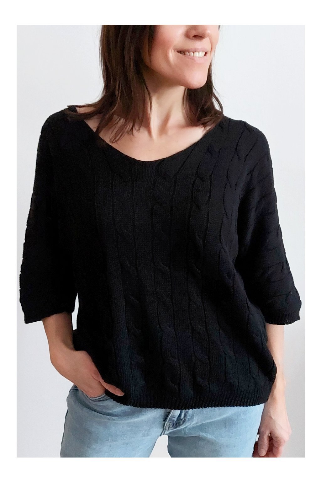 Nádherný pletený svetr s krátkým rukávem. Véčkový výstřih, oblékání přes hlavu. Oversize - u menších velikostí je svetřík na těle volnější. Parádní kousek z velmi příjemného, nekousavého a pružného materiálu. Foceno na vel. XS, výška 156cm i na vel. 2XL (prsa 116cm, boky 120cm), výška 165cm.