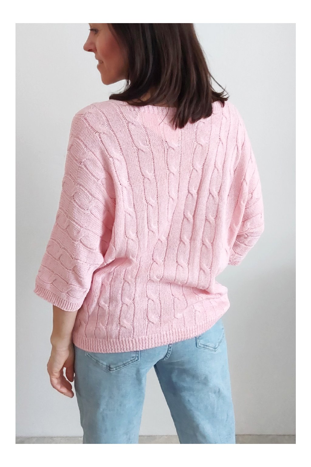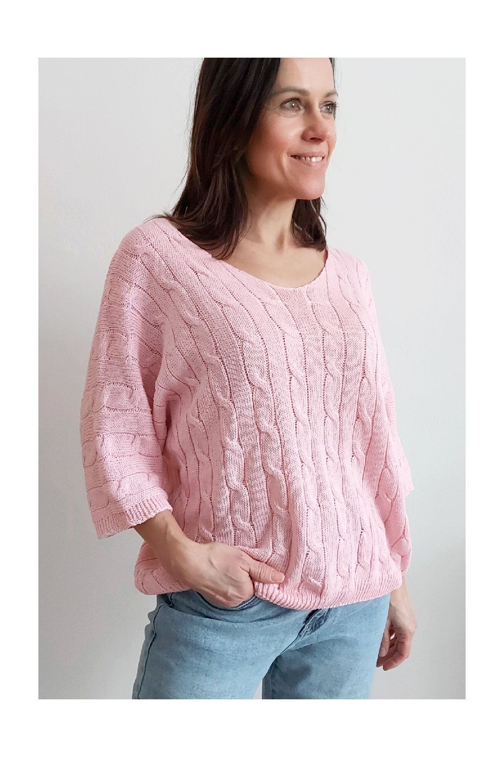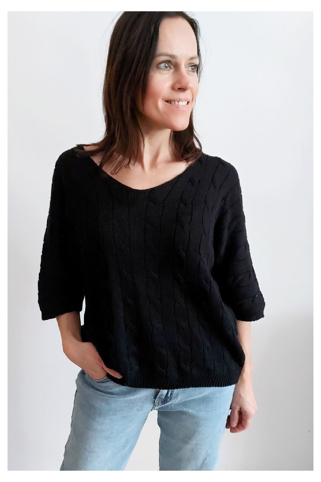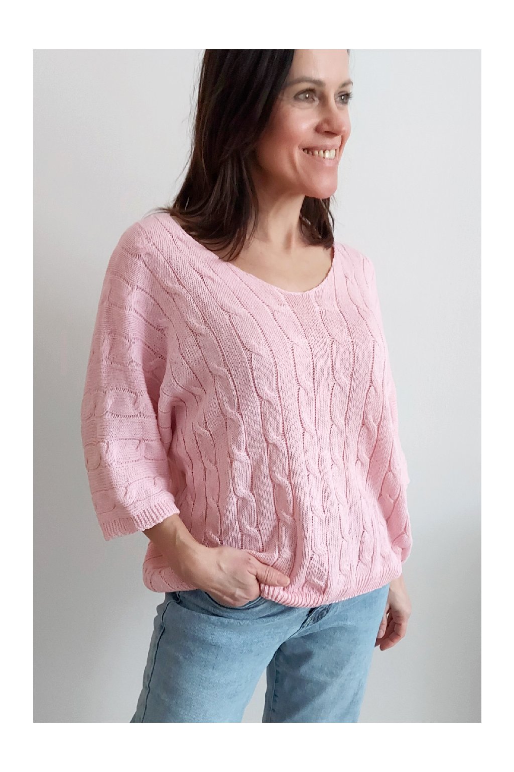 Nádherný pletený svetr s krátkým rukávem. Véčkový výstřih, oblékání přes hlavu. Oversize - u menších velikostí je svetřík na těle volnější. Parádní kousek z velmi příjemného, nekousavého a pružného materiálu. Foceno na vel. XS, výška 156cm i na vel. 2XL (prsa 116cm, boky 120cm), výška 165cm.
