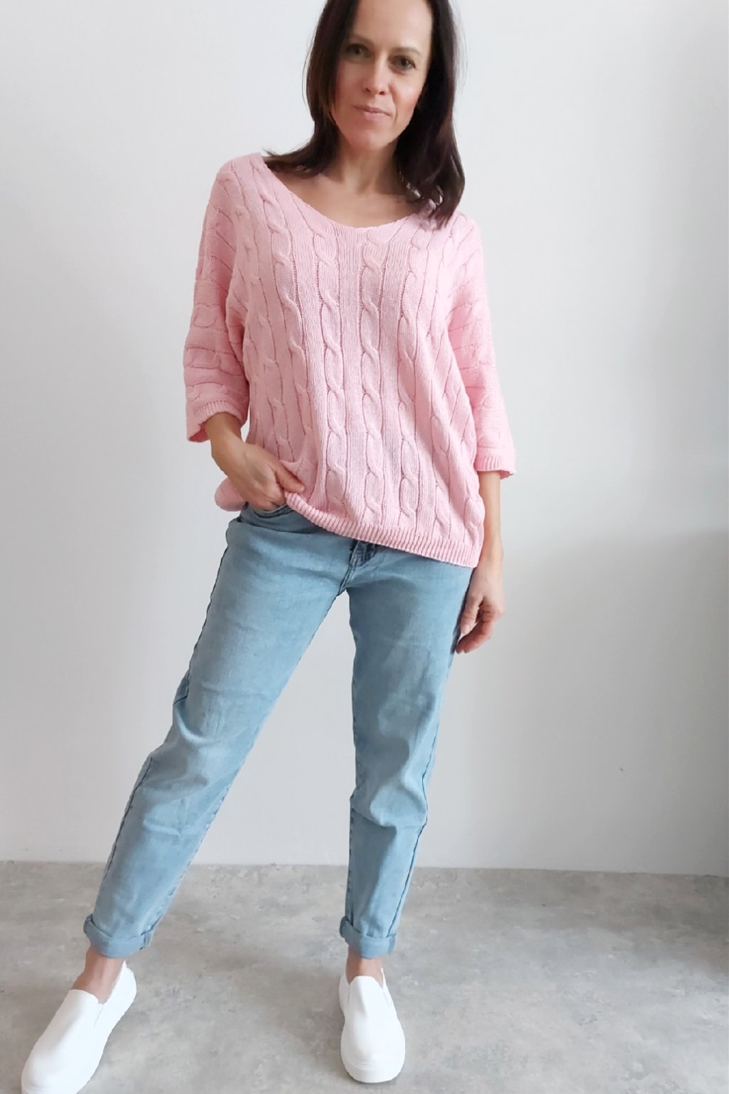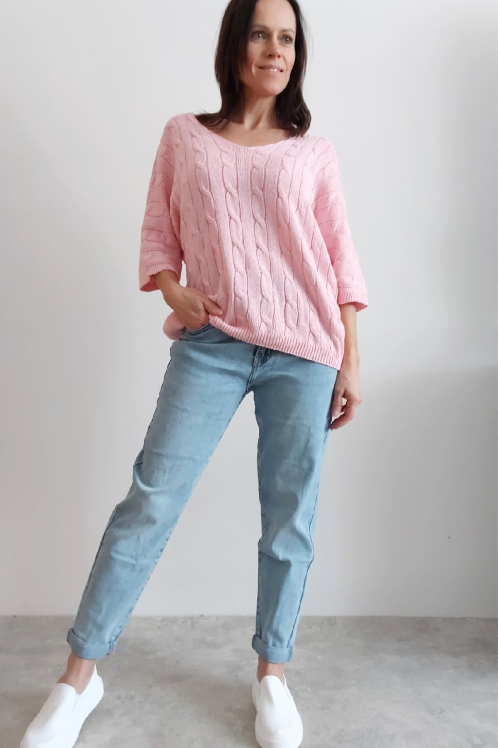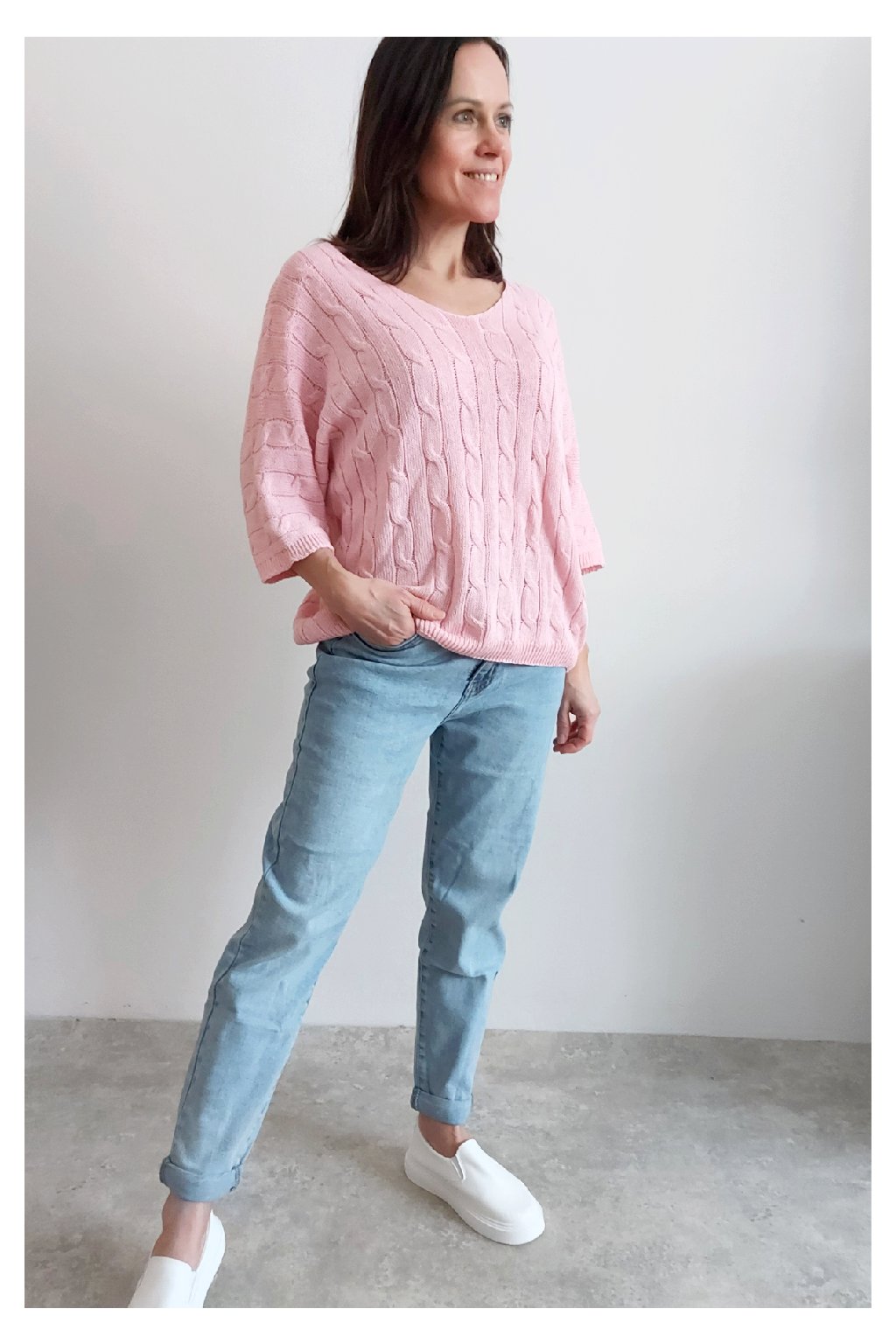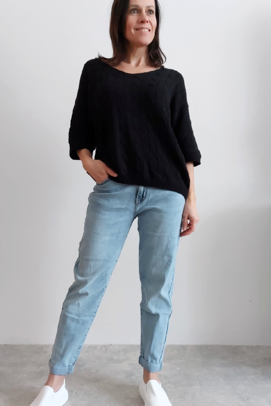 Nádherný pletený svetr s krátkým rukávem. Véčkový výstřih, oblékání přes hlavu. Oversize - u menších velikostí je svetřík na těle volnější. Parádní kousek z velmi příjemného, nekousavého a pružného materiálu. Foceno na vel. XS, výška 156cm i na vel. 2XL (prsa 116cm, boky 120cm), výška 165cm.