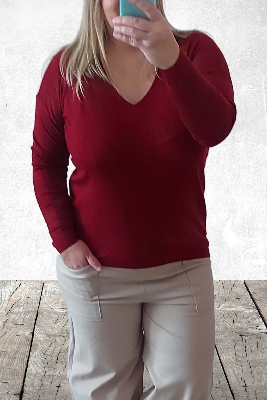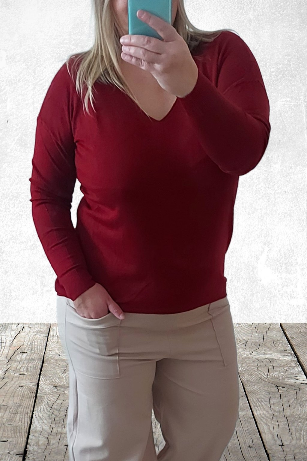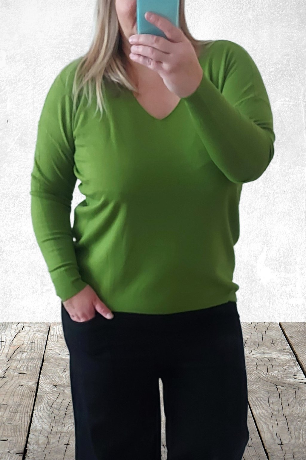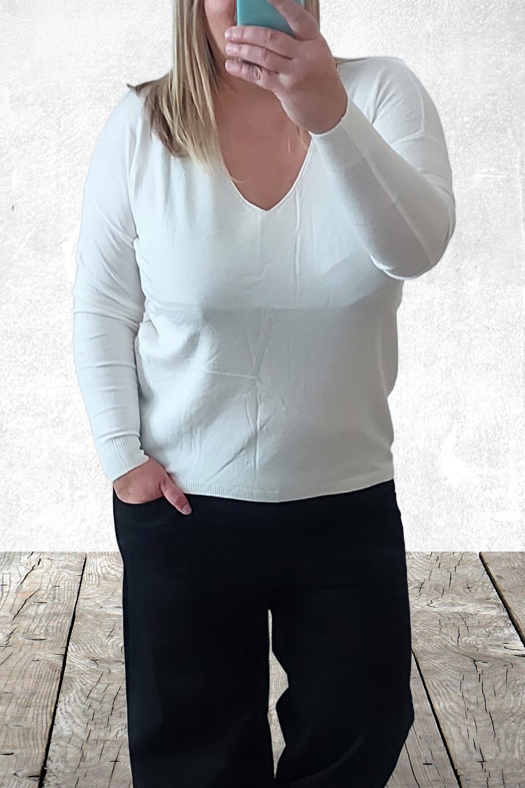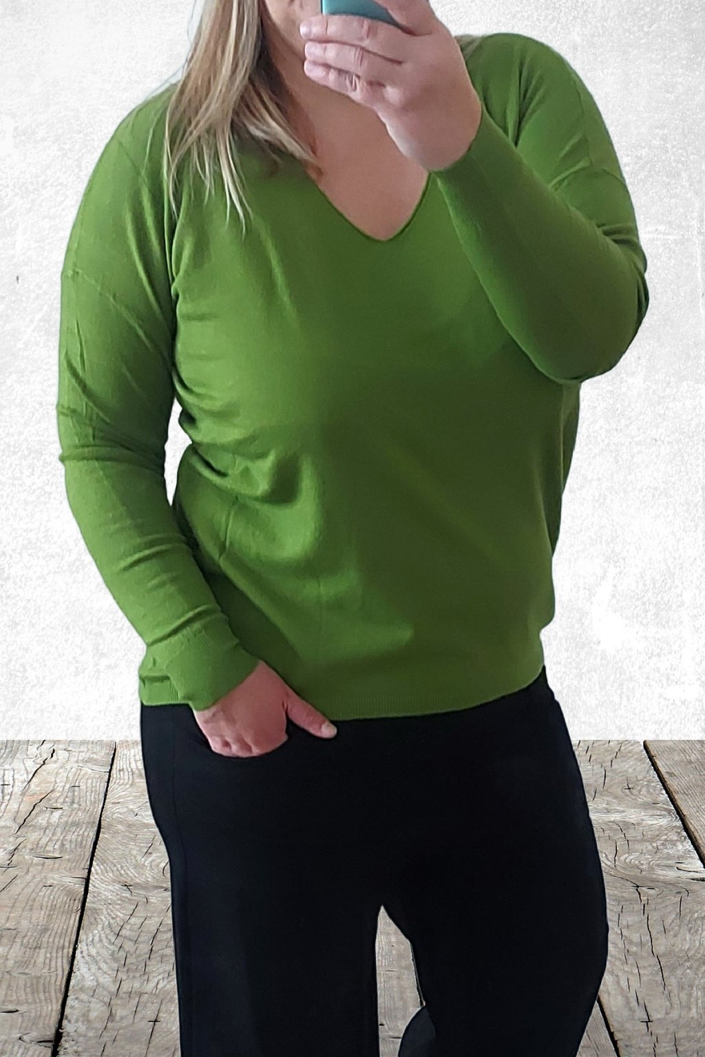 Svetr s véčkovým výstřihem vhodný i pro větší velikost. Rukávy dlouhé. Oblékání přes hlavu, bez kapes. Přední strana je maličko kratší, řešena dokulata. Materiál připomínající kašmír, hebký, nekousavý a hodně pružný. Ideální na jaro/podzim i chladné letní dny. Foceno na vel. 2XL (prsa 116cm, pas 110cm, boky 120cm), výška 165cm.