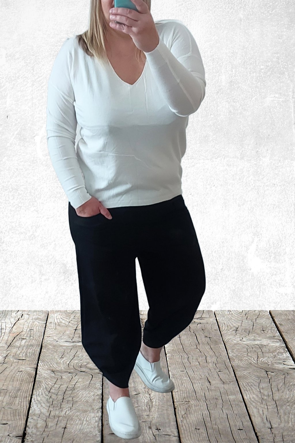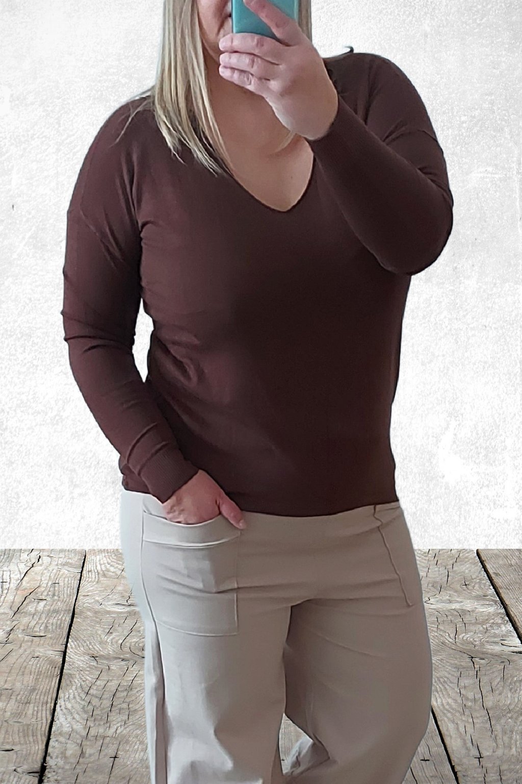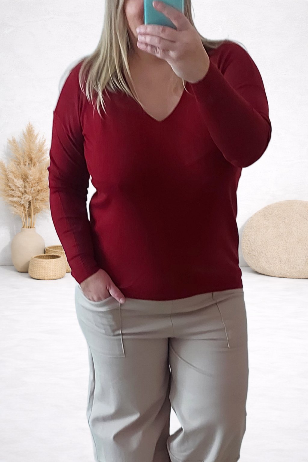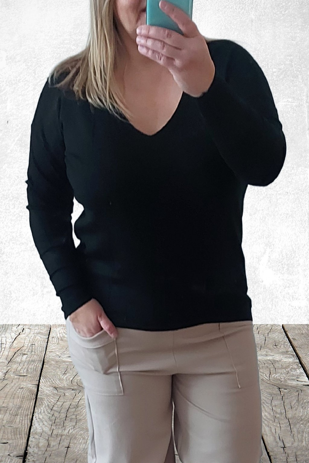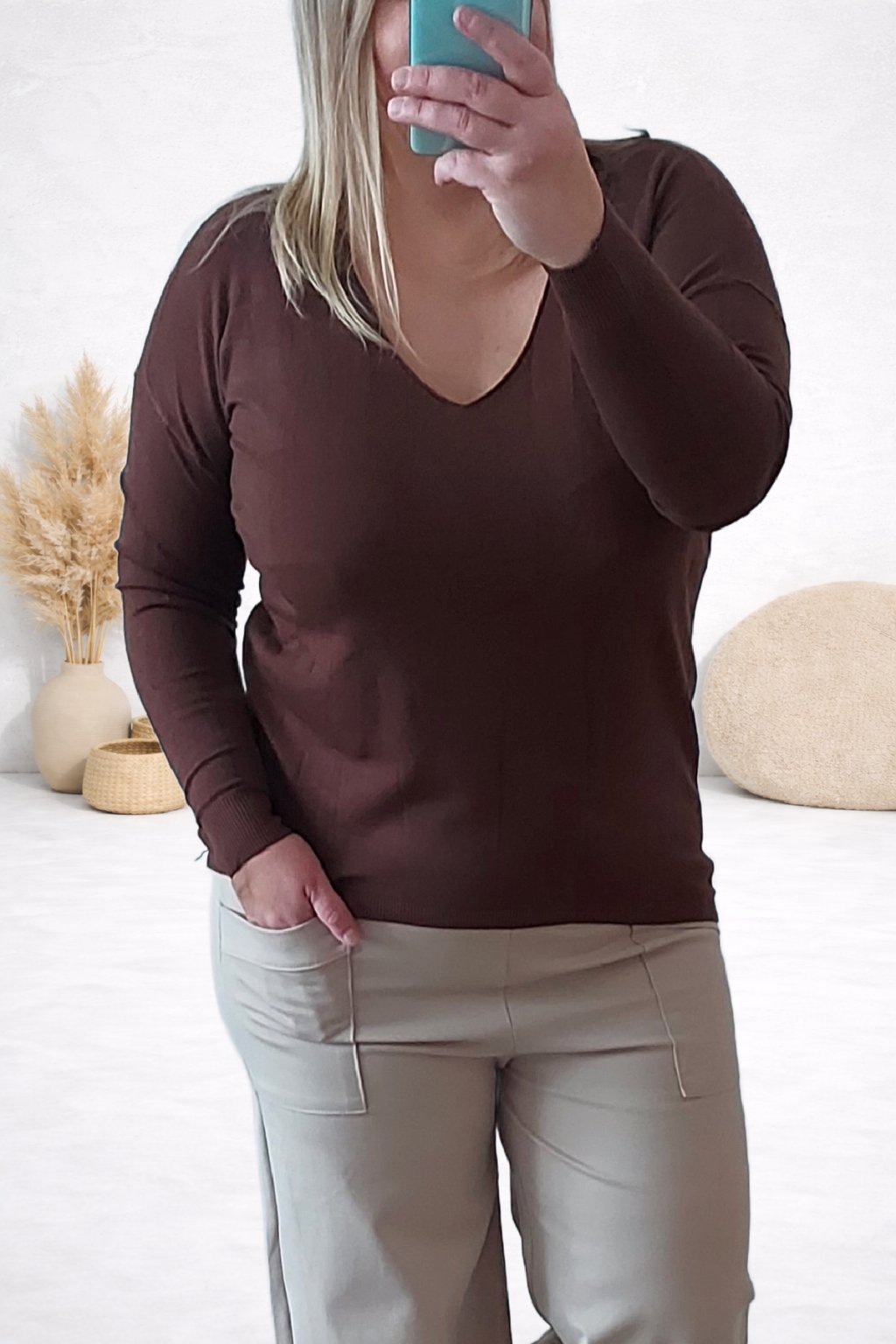 Svetr s véčkovým výstřihem vhodný i pro větší velikost. Rukávy dlouhé. Oblékání přes hlavu, bez kapes. Přední strana je maličko kratší, řešena dokulata. Materiál připomínající kašmír, hebký, nekousavý a hodně pružný. Ideální na jaro/podzim i chladné letní dny. Foceno na vel. 2XL (prsa 116cm, pas 110cm, boky 120cm), výška 165cm.