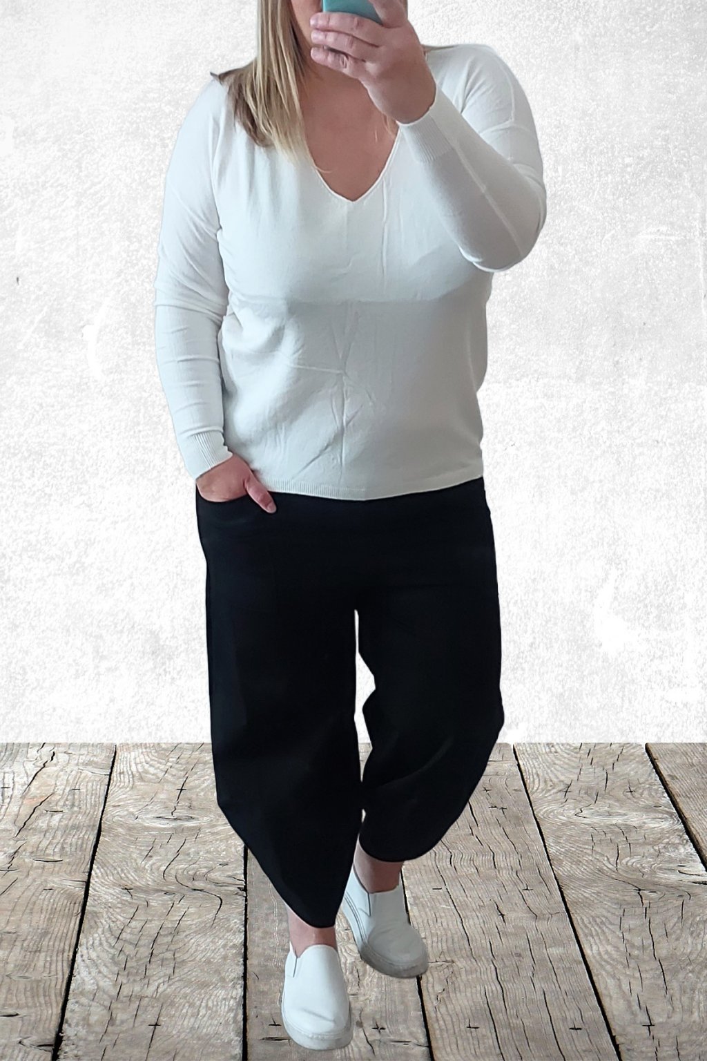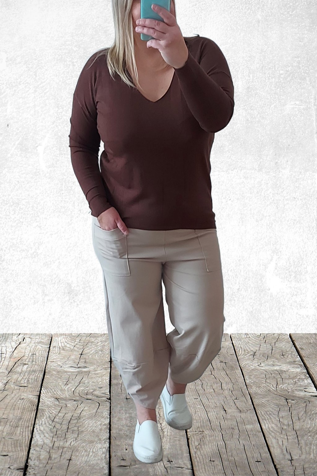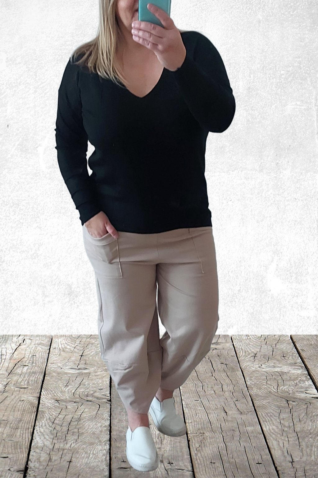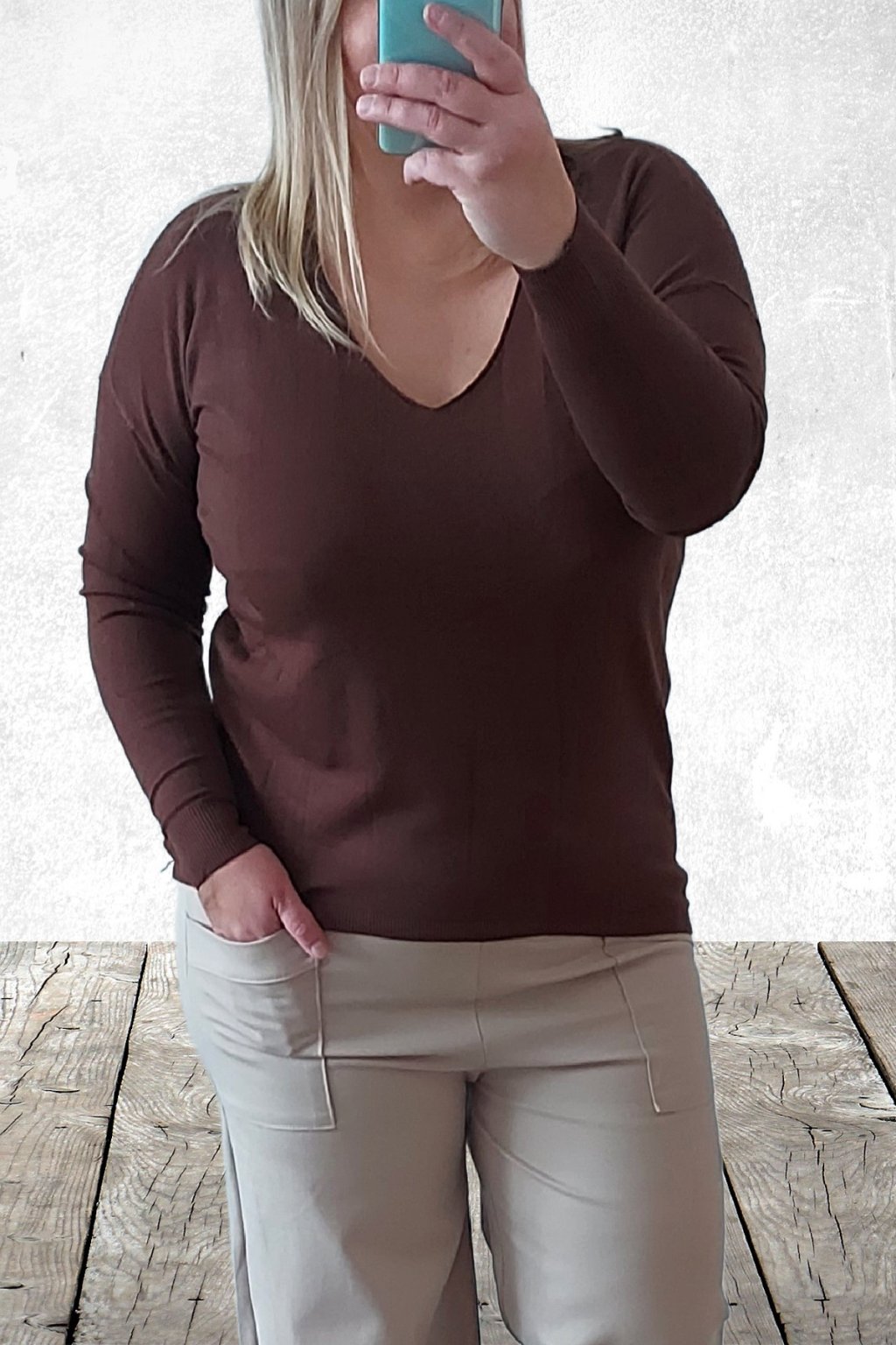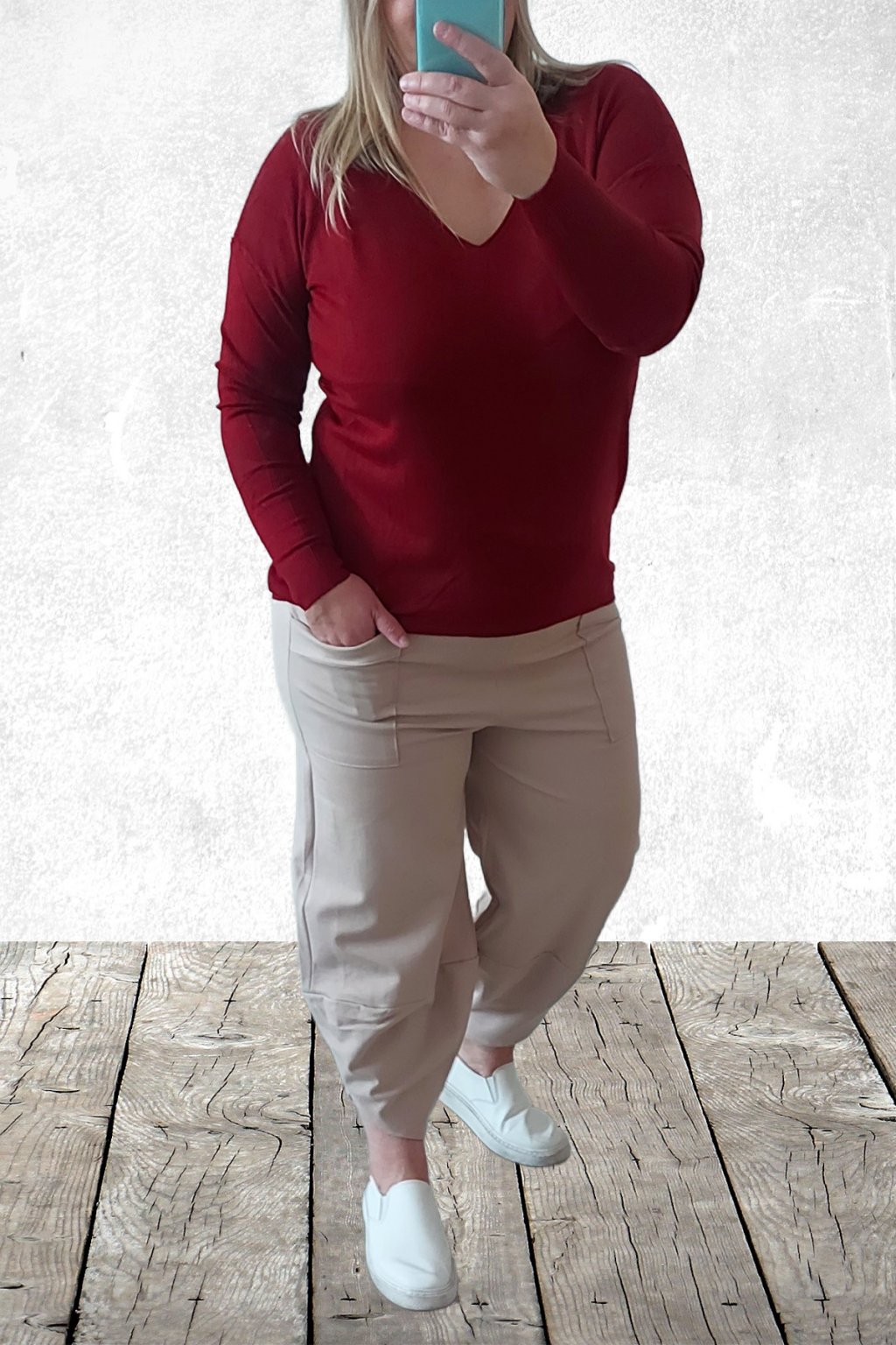 Svetr s véčkovým výstřihem vhodný i pro větší velikost. Rukávy dlouhé. Oblékání přes hlavu, bez kapes. Přední strana je maličko kratší, řešena dokulata. Materiál připomínající kašmír, hebký, nekousavý a hodně pružný. Ideální na jaro/podzim i chladné letní dny. Foceno na vel. 2XL (prsa 116cm, pas 110cm, boky 120cm), výška 165cm.