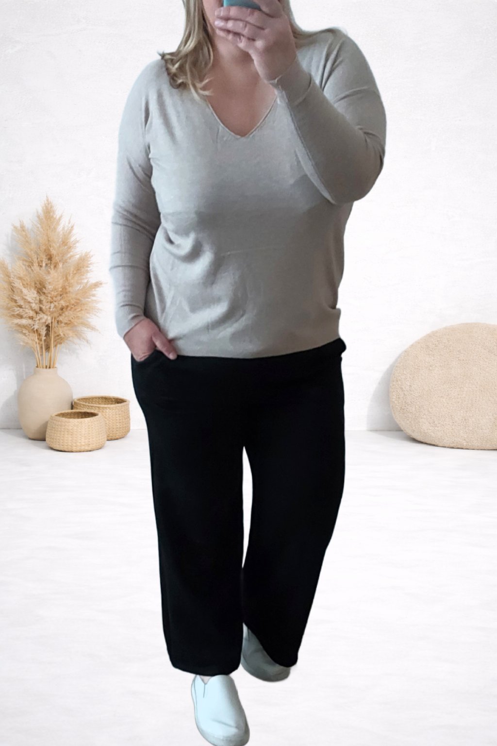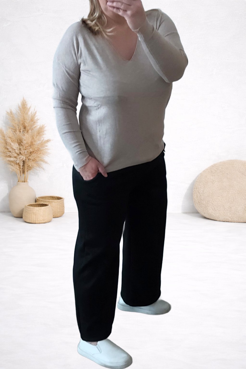 Svetr s véčkovým výstřihem vhodný i pro větší velikost. Rukávy dlouhé. Oblékání přes hlavu, bez kapes. Přední strana je maličko kratší, řešena dokulata. Materiál připomínající kašmír, hebký, nekousavý a hodně pružný. Ideální na jaro/podzim i chladné letní dny. Foceno na vel. 2XL (prsa 116cm, pas 110cm, boky 120cm), výška 165cm.