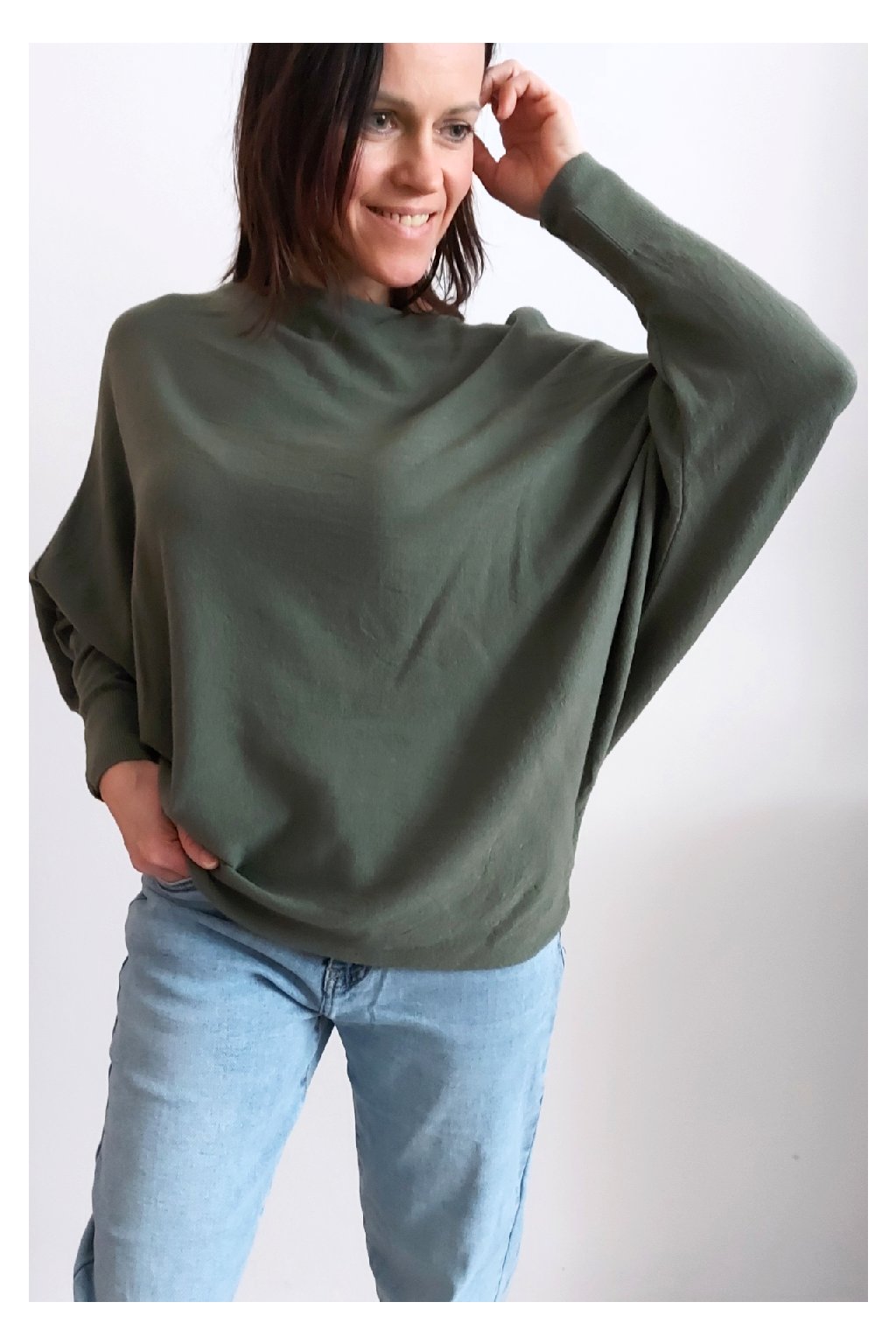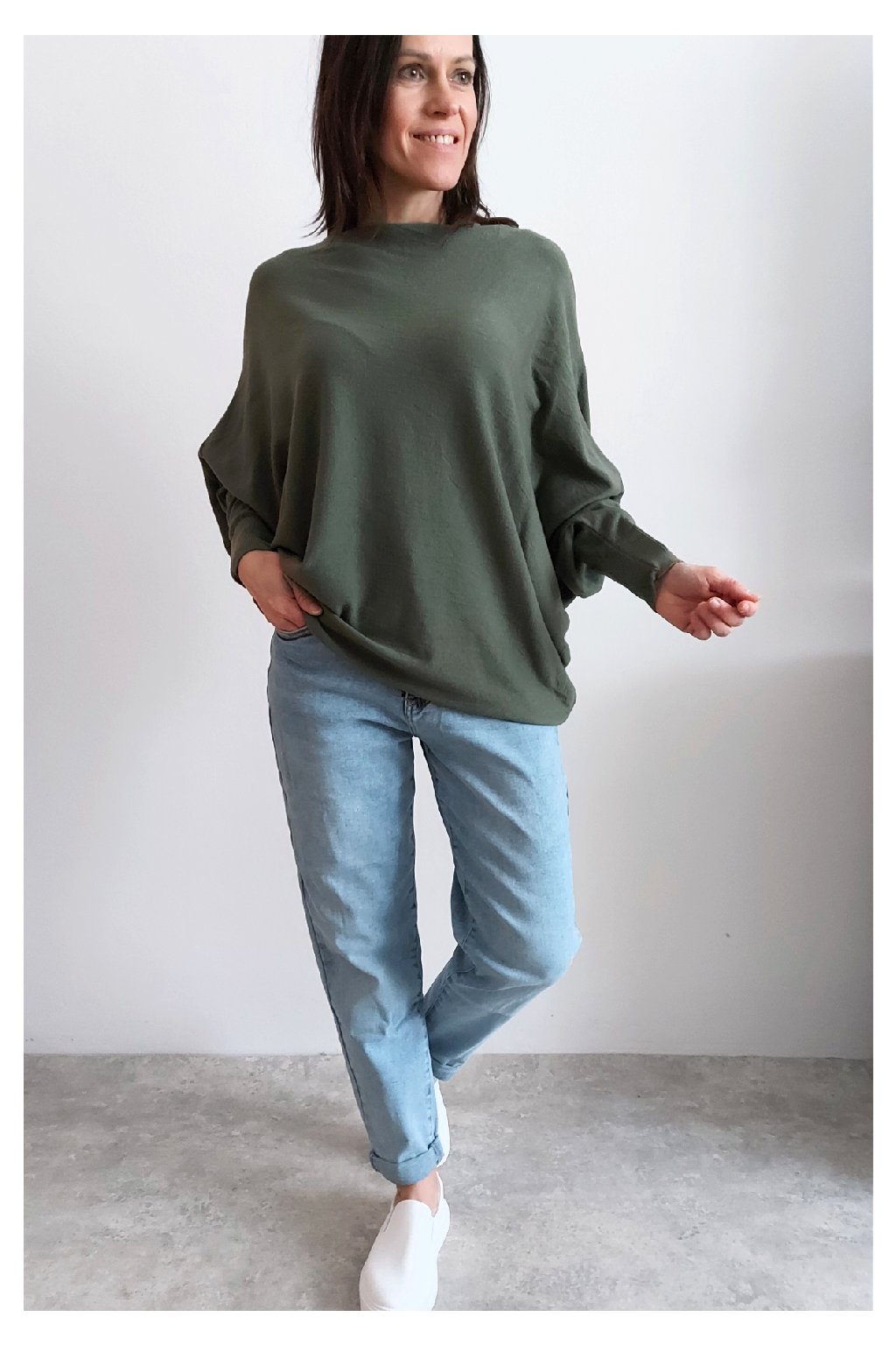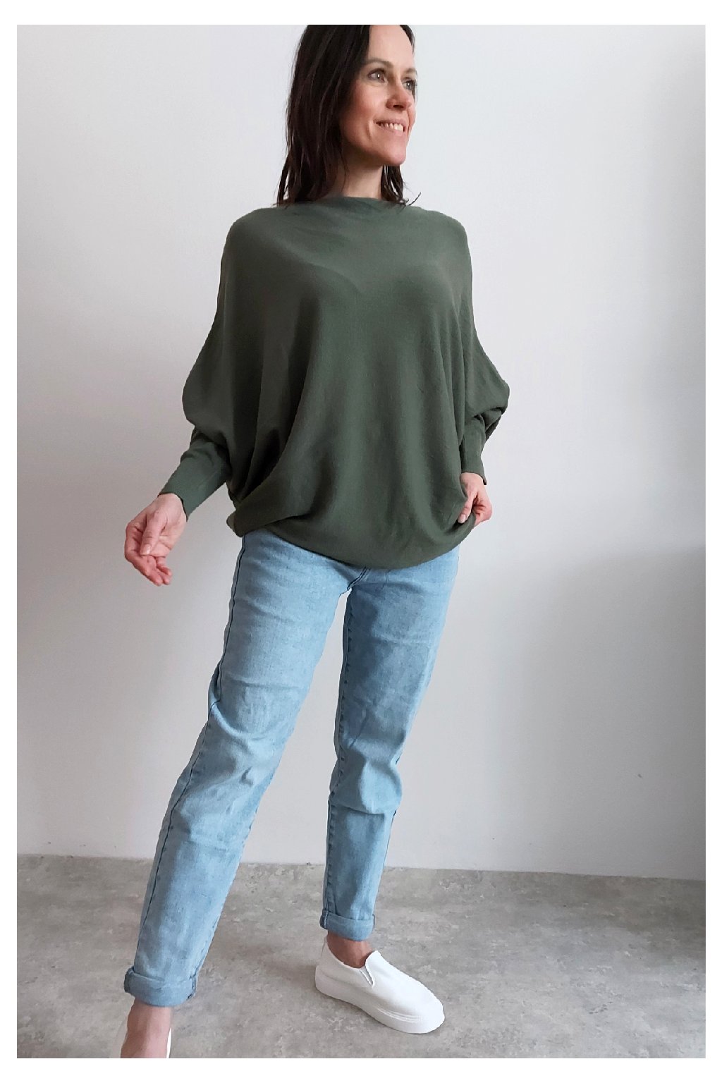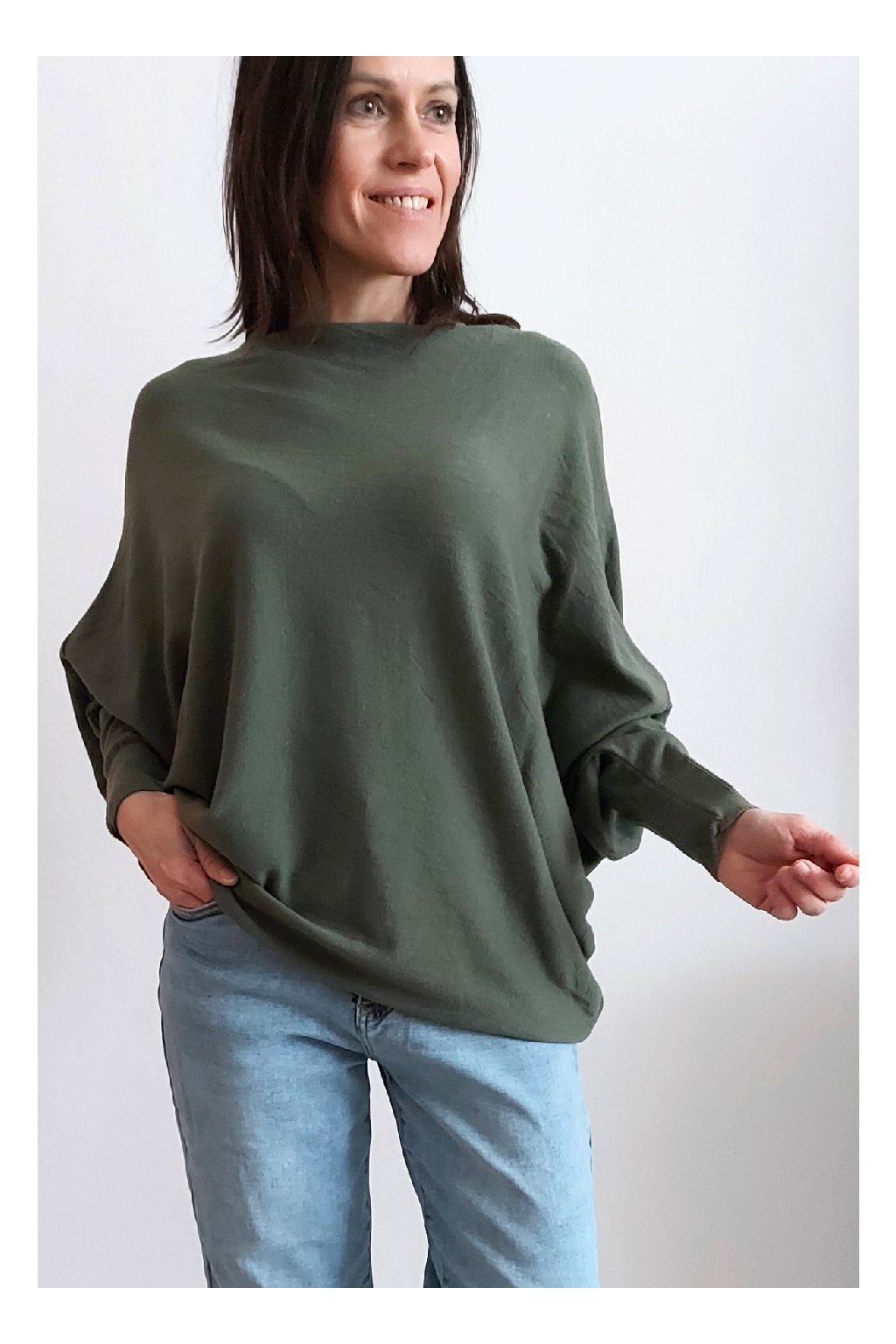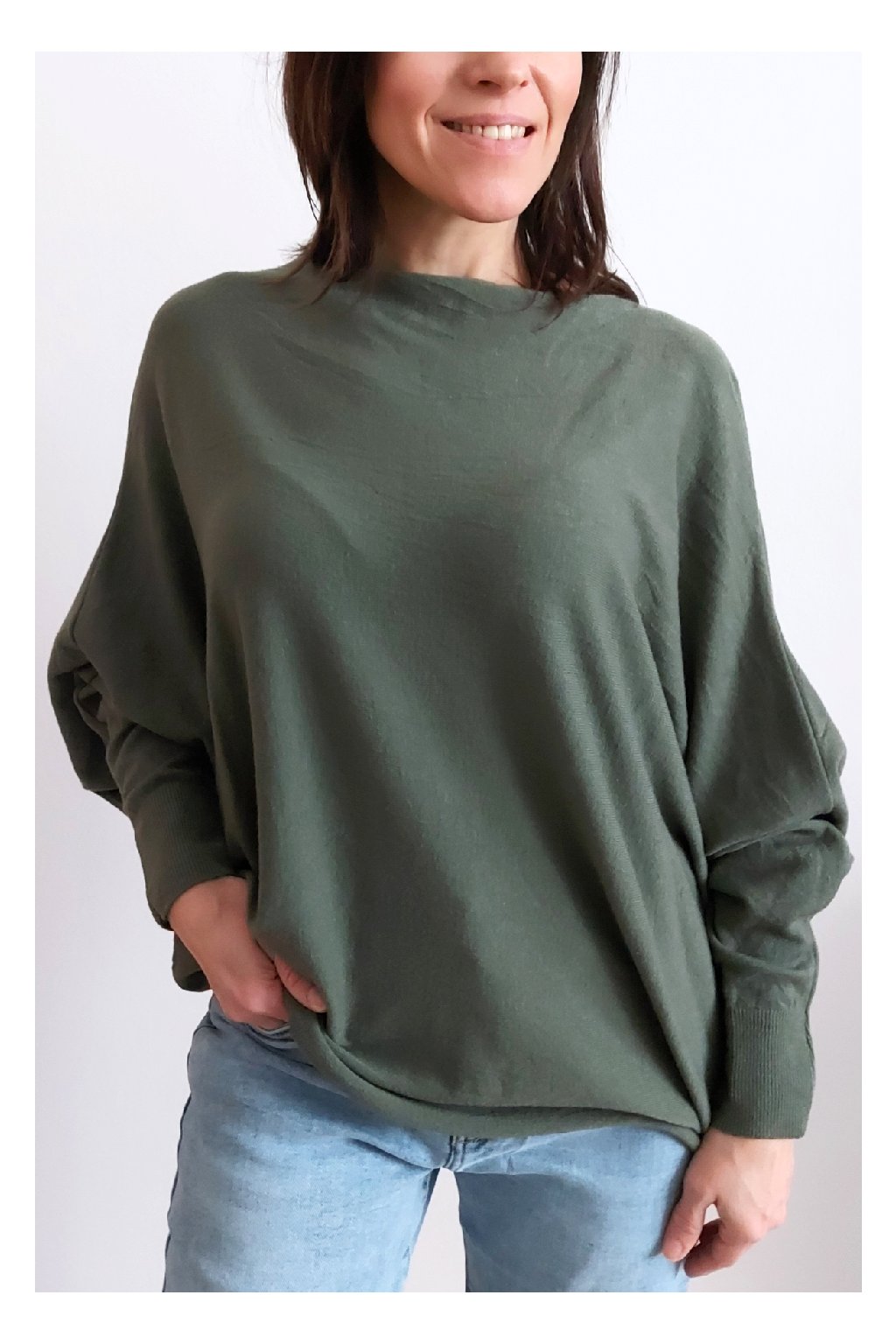 Svetr s netopýřími rukávy volnějšího střihu. Oblékání přes hlavu. Materiál hebký, nekousavý, na těle velmi příjemný a hodně pružný. Foceno na vel. XS, výška 156cm i na vel. 2XL (prsa 116cm, boky 120cm), výška 165cm.