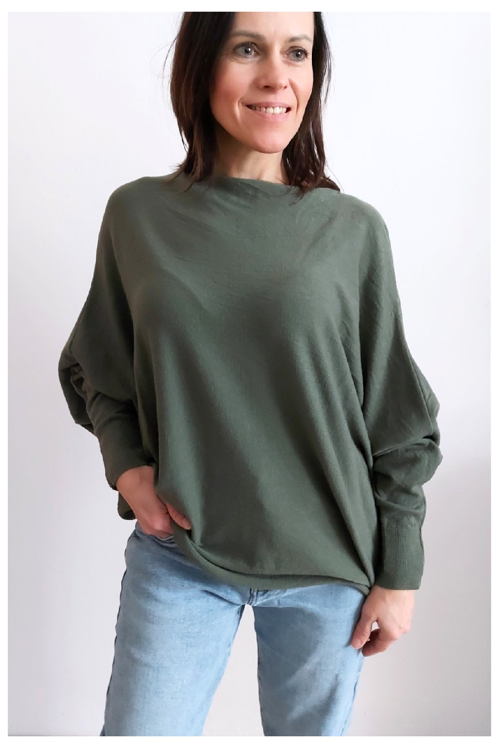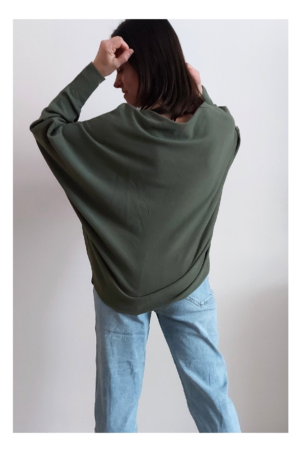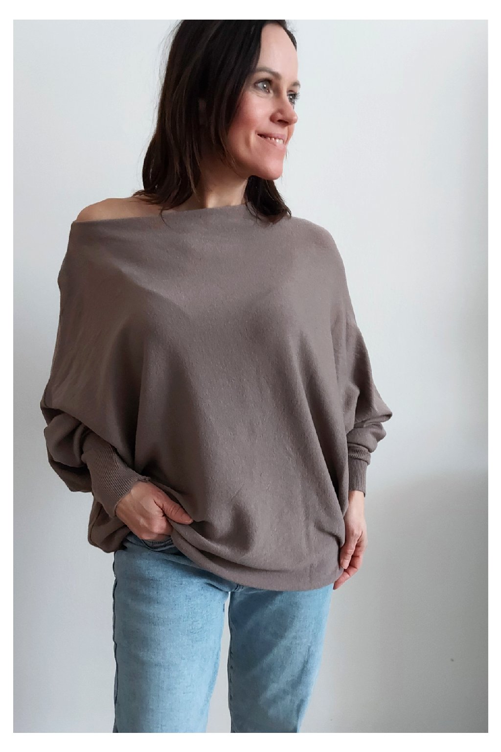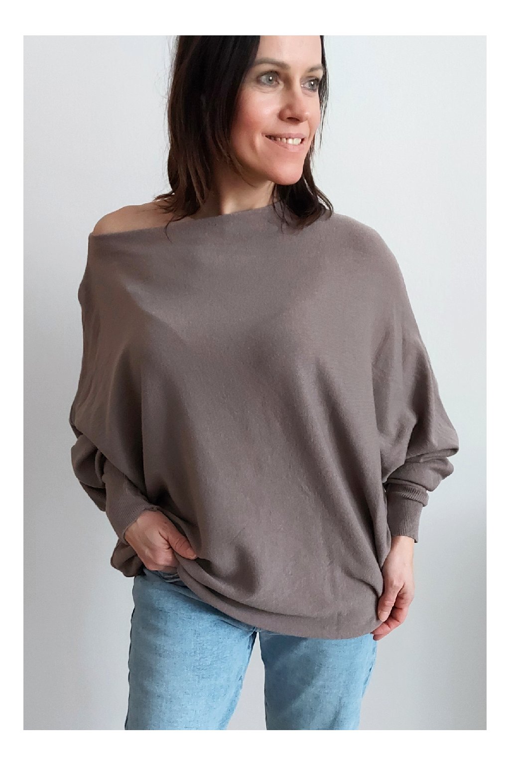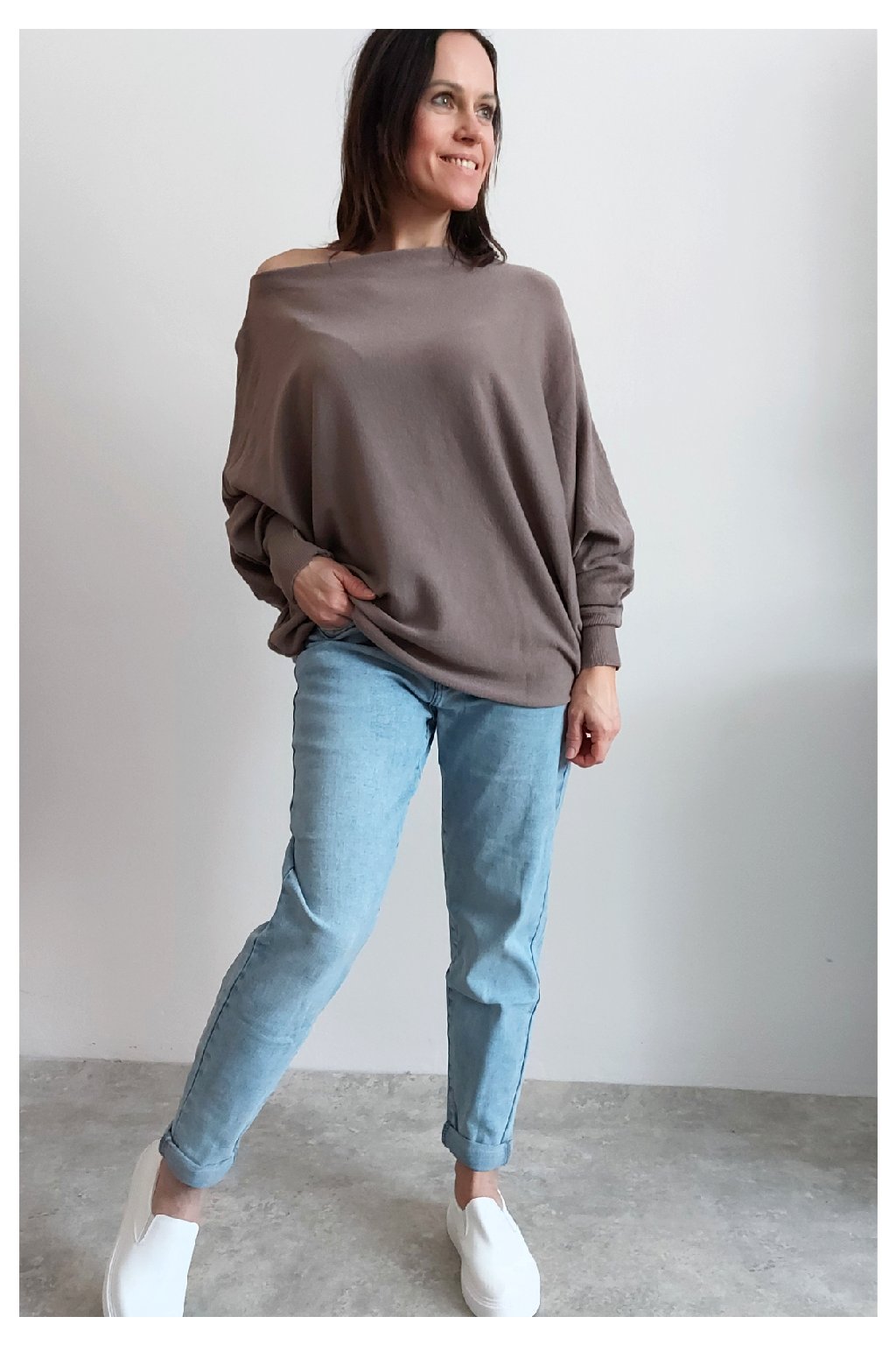 Svetr s netopýřími rukávy volnějšího střihu. Oblékání přes hlavu. Materiál hebký, nekousavý, na těle velmi příjemný a hodně pružný. Foceno na vel. XS, výška 156cm i na vel. 2XL (prsa 116cm, boky 120cm), výška 165cm.