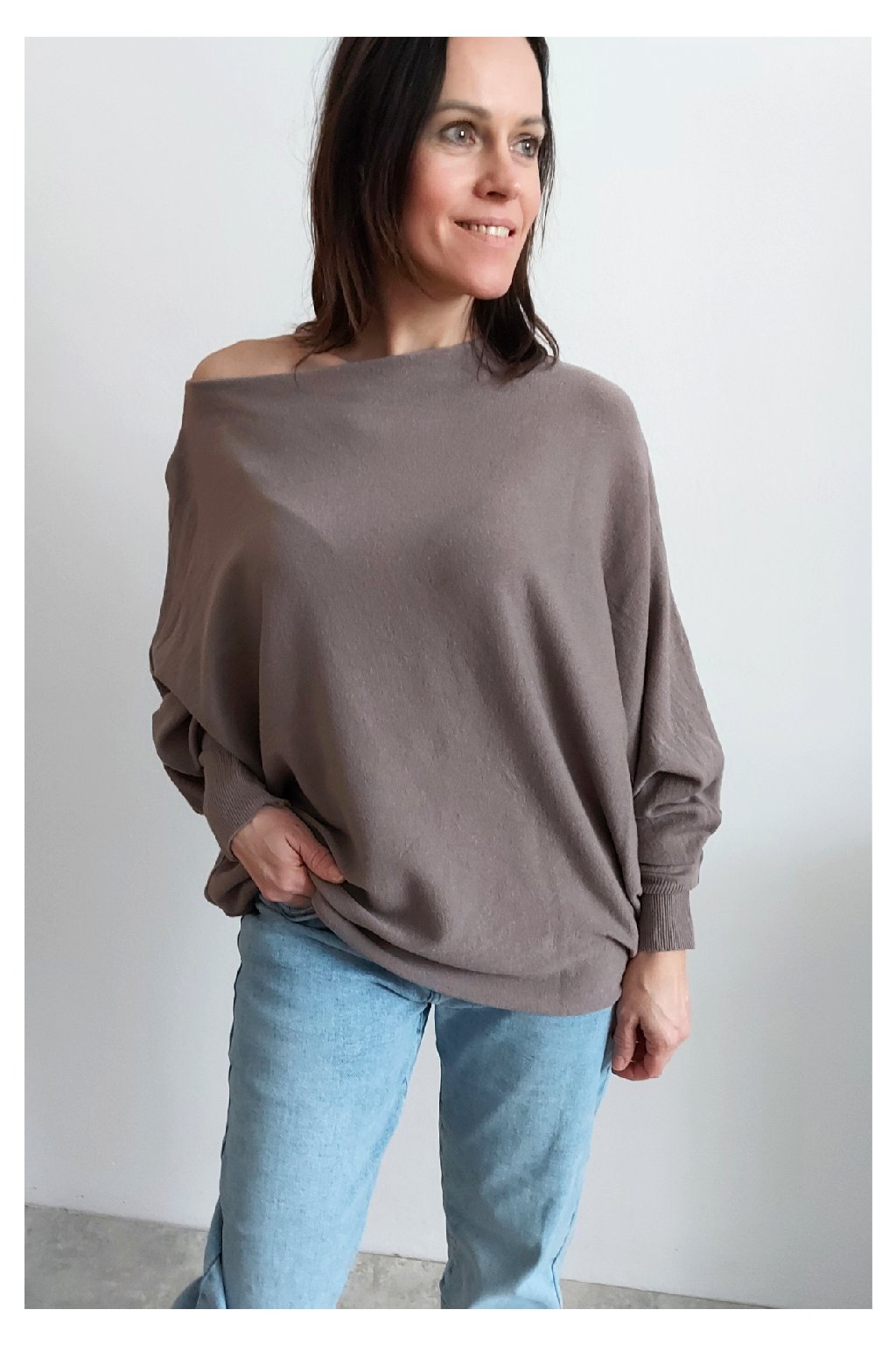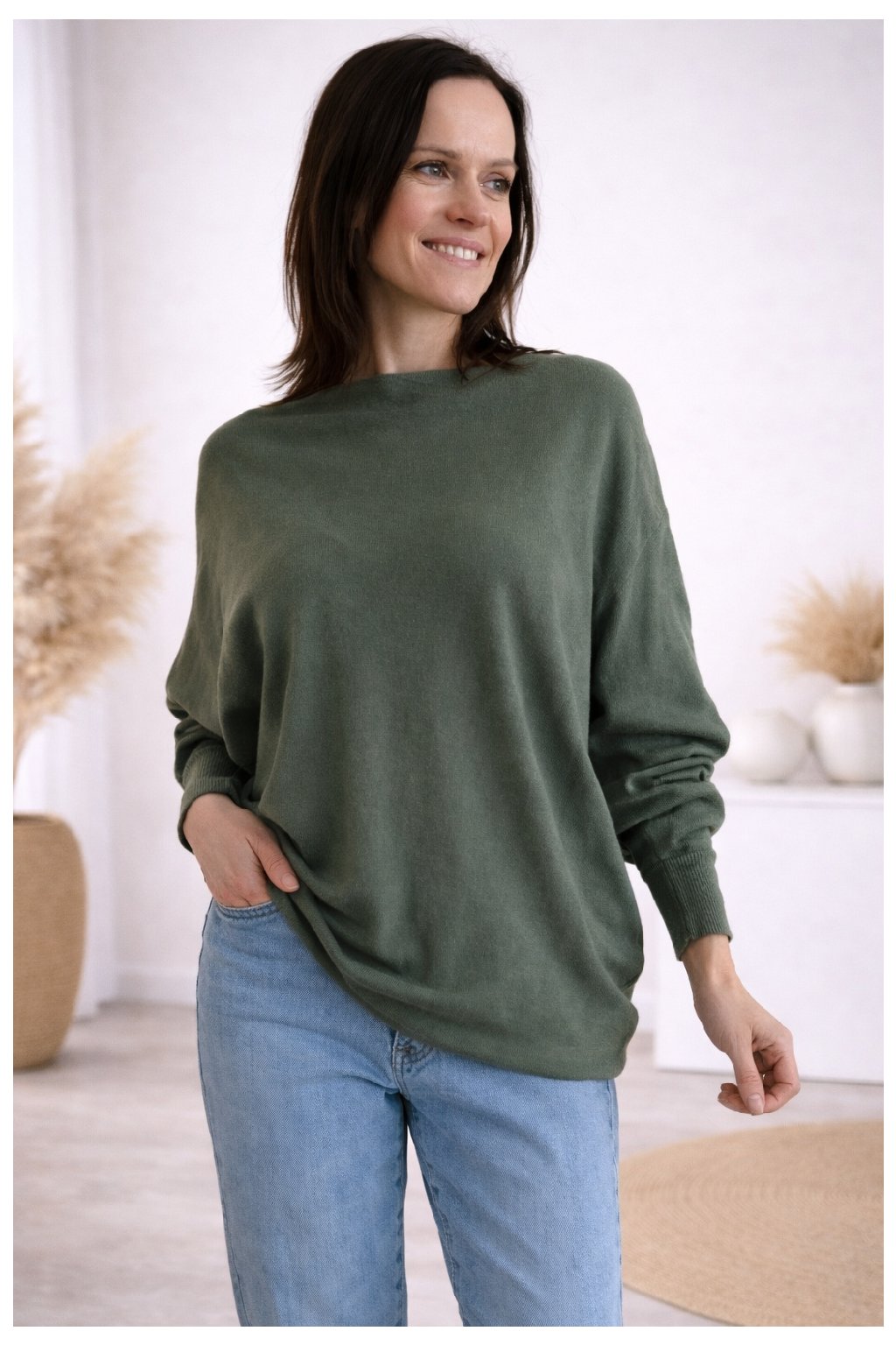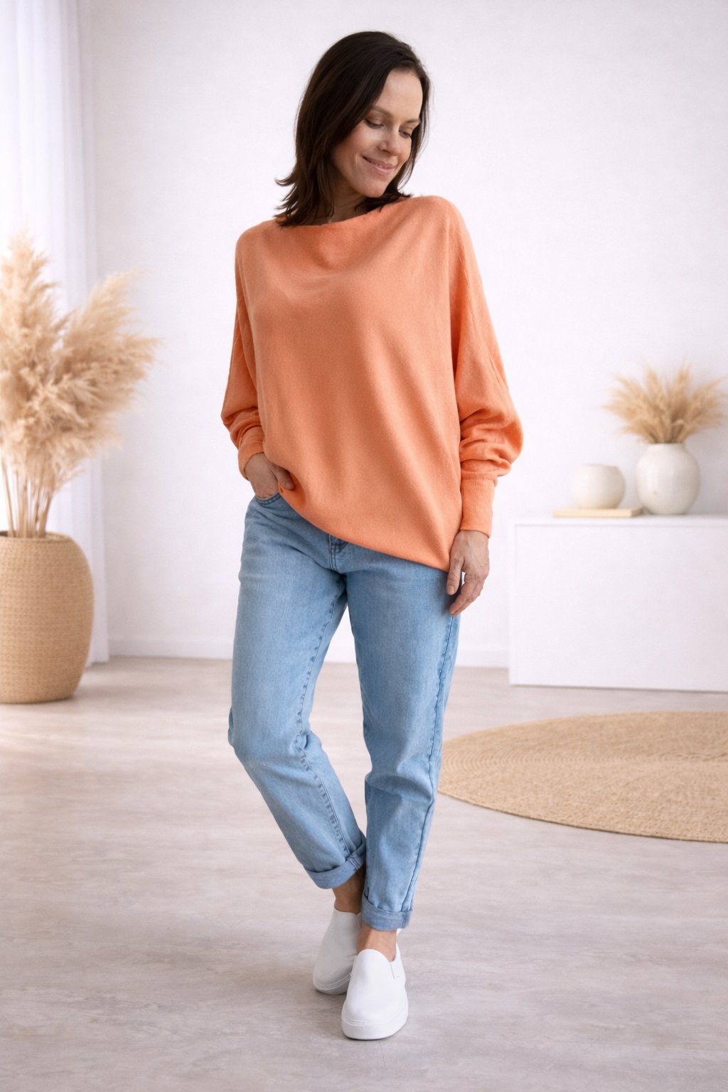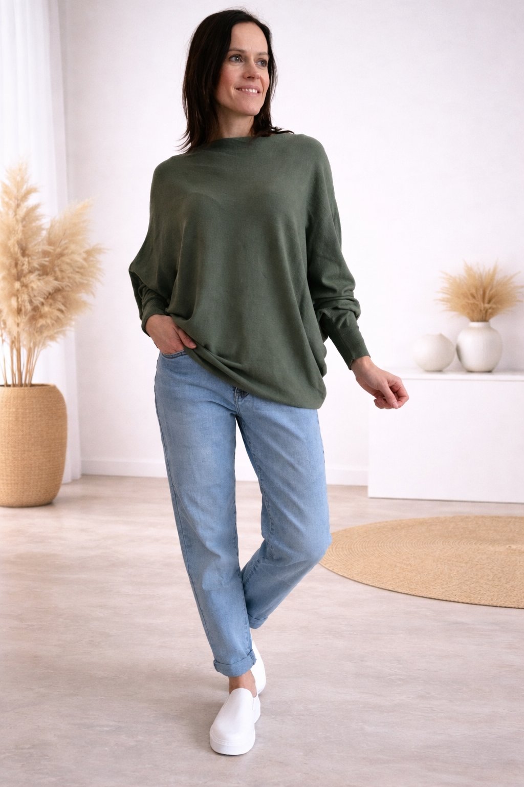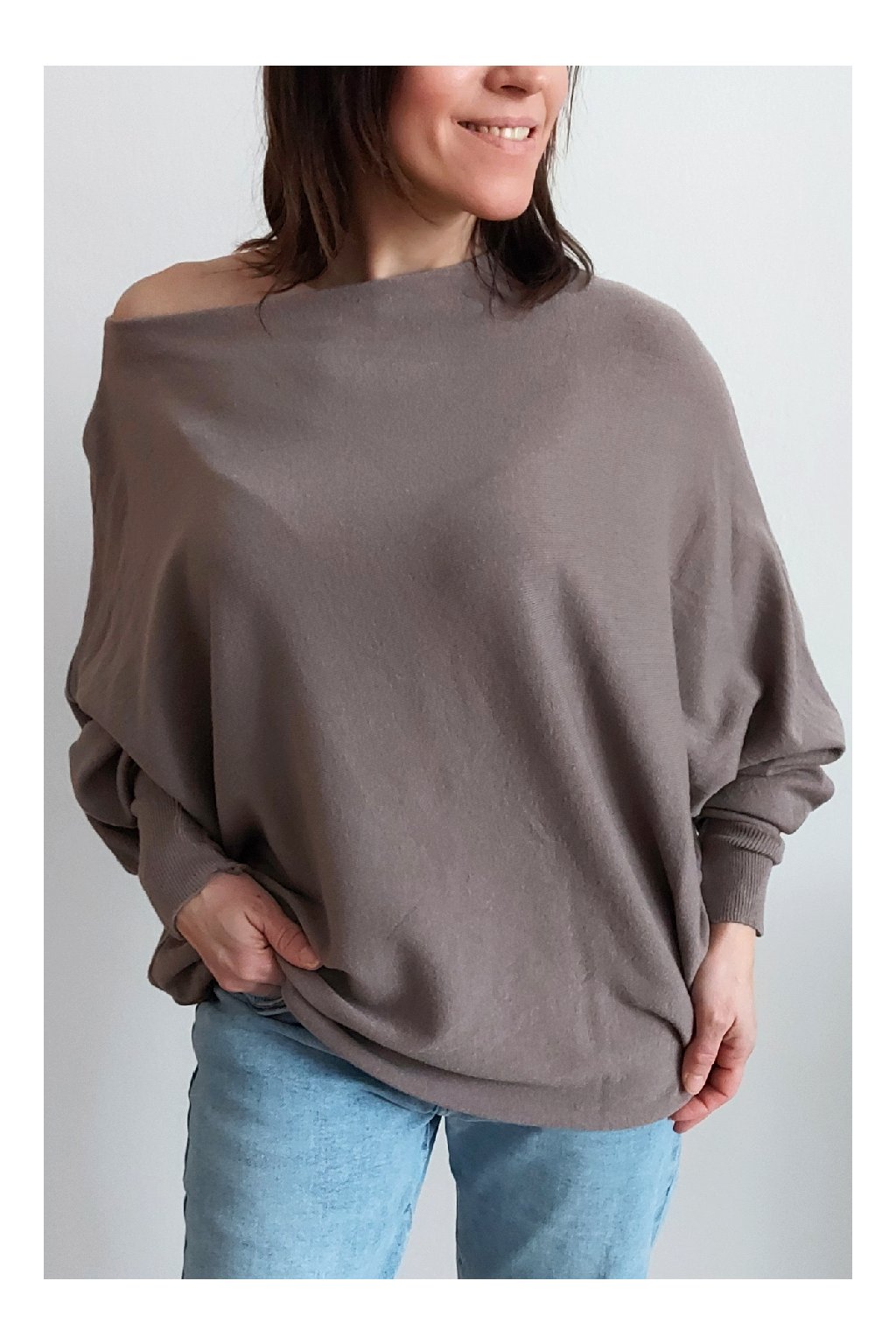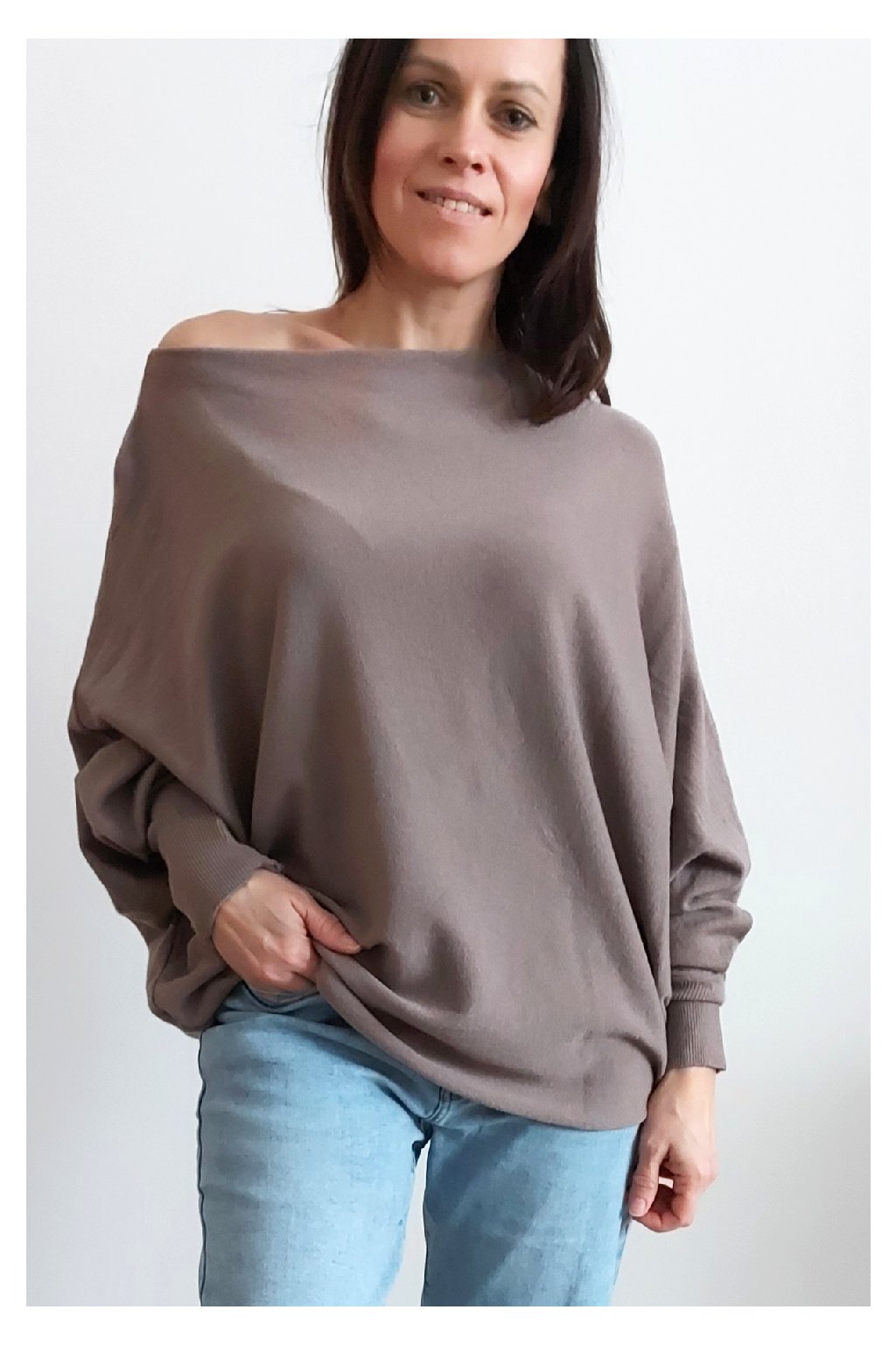 Svetr s netopýřími rukávy volnějšího střihu. Oblékání přes hlavu. Materiál hebký, nekousavý, na těle velmi příjemný a hodně pružný. Foceno na vel. XS, výška 156cm i na vel. 2XL (prsa 116cm, boky 120cm), výška 165cm.