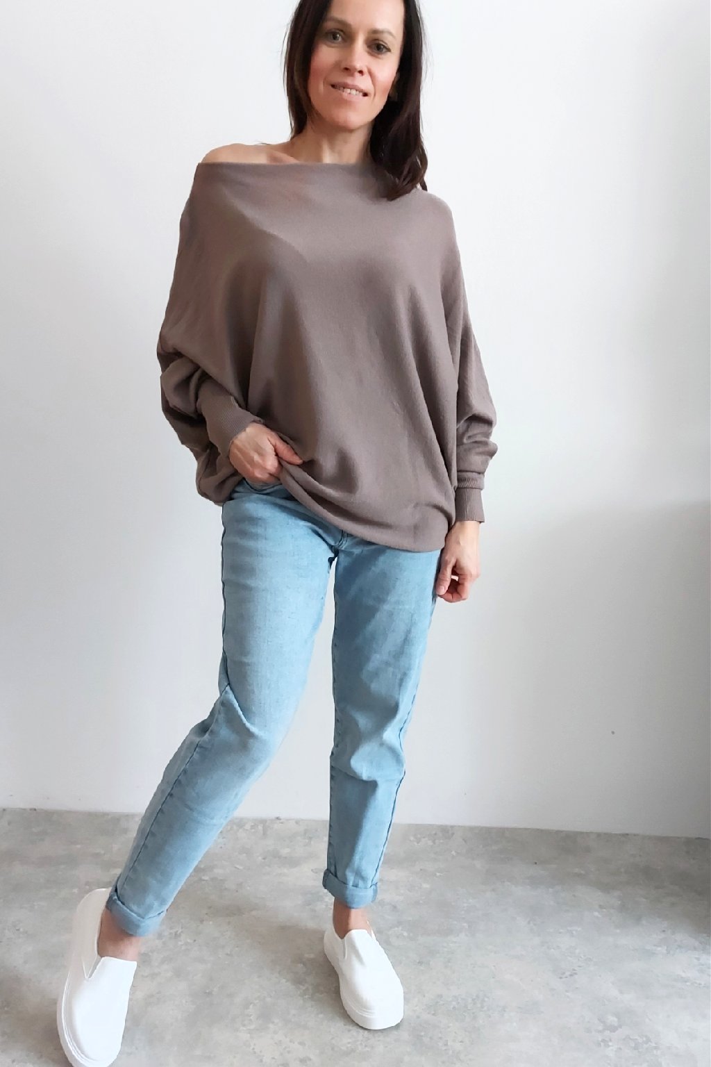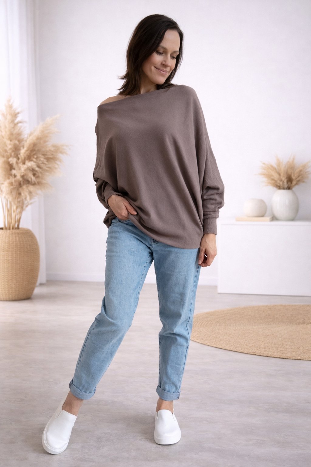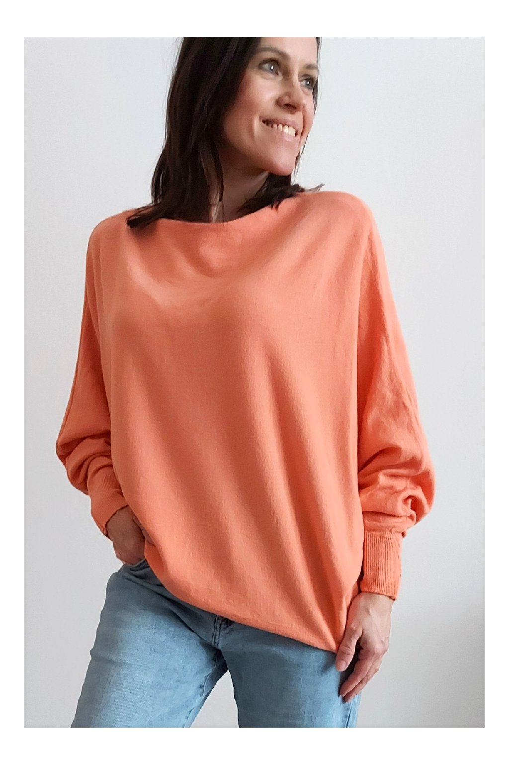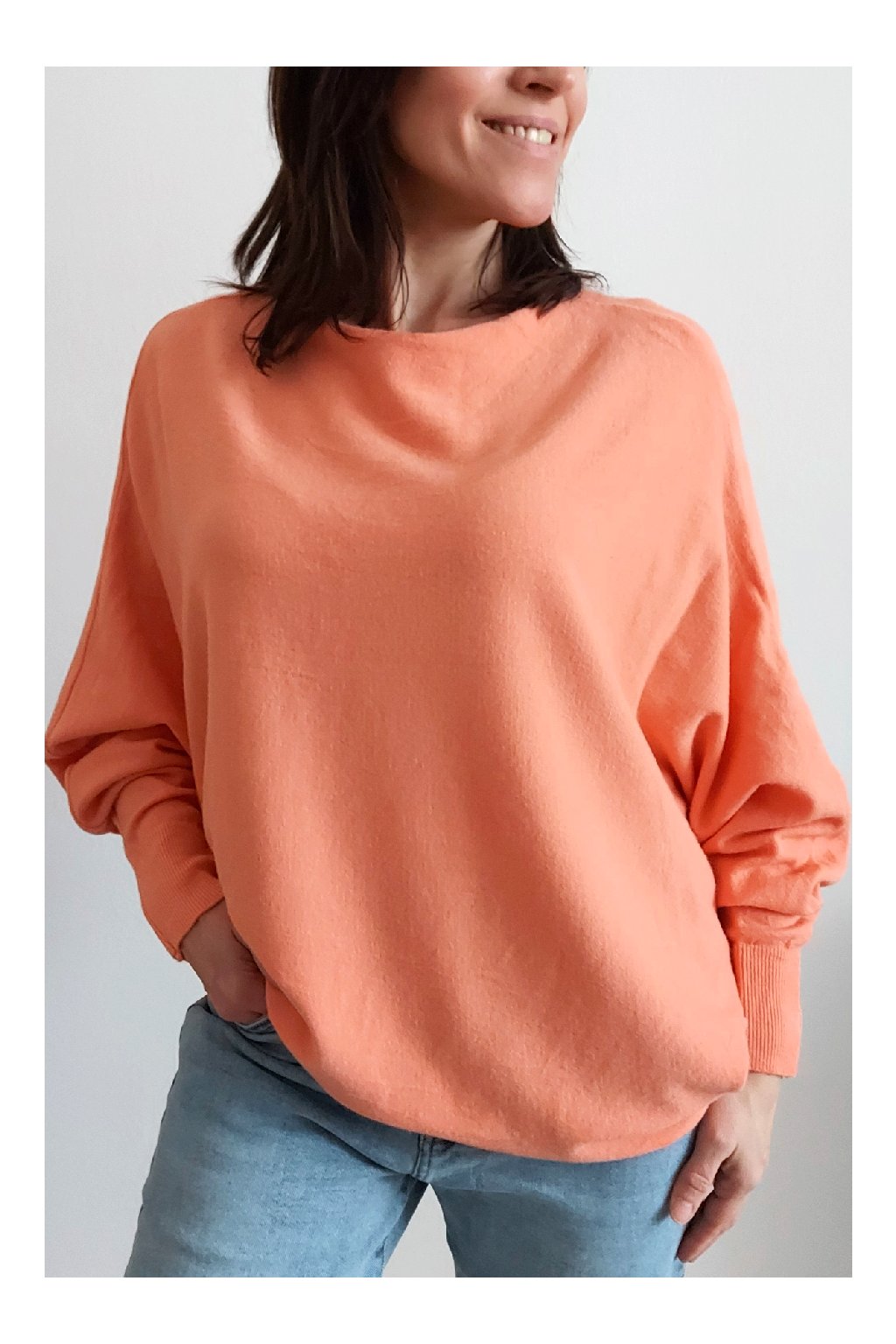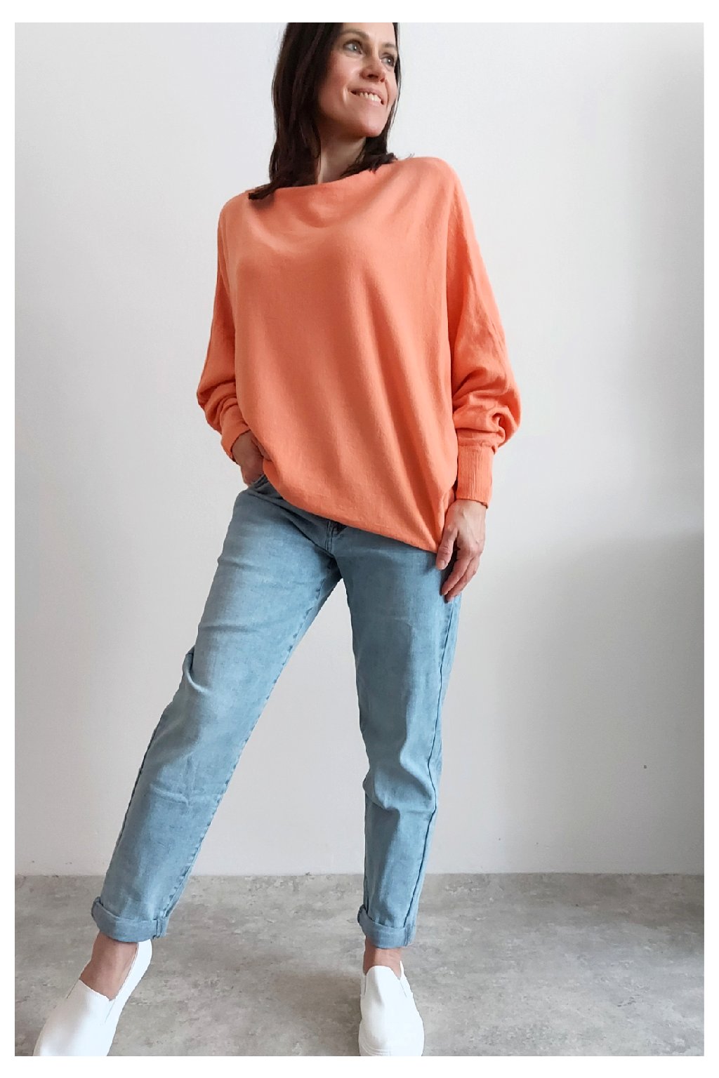 Svetr s netopýřími rukávy volnějšího střihu. Oblékání přes hlavu. Materiál hebký, nekousavý, na těle velmi příjemný a hodně pružný. Foceno na vel. XS, výška 156cm i na vel. 2XL (prsa 116cm, boky 120cm), výška 165cm.