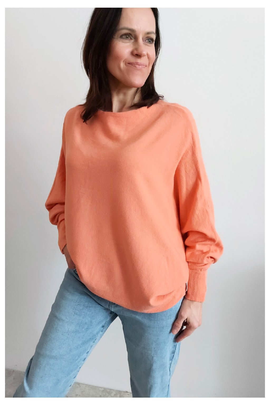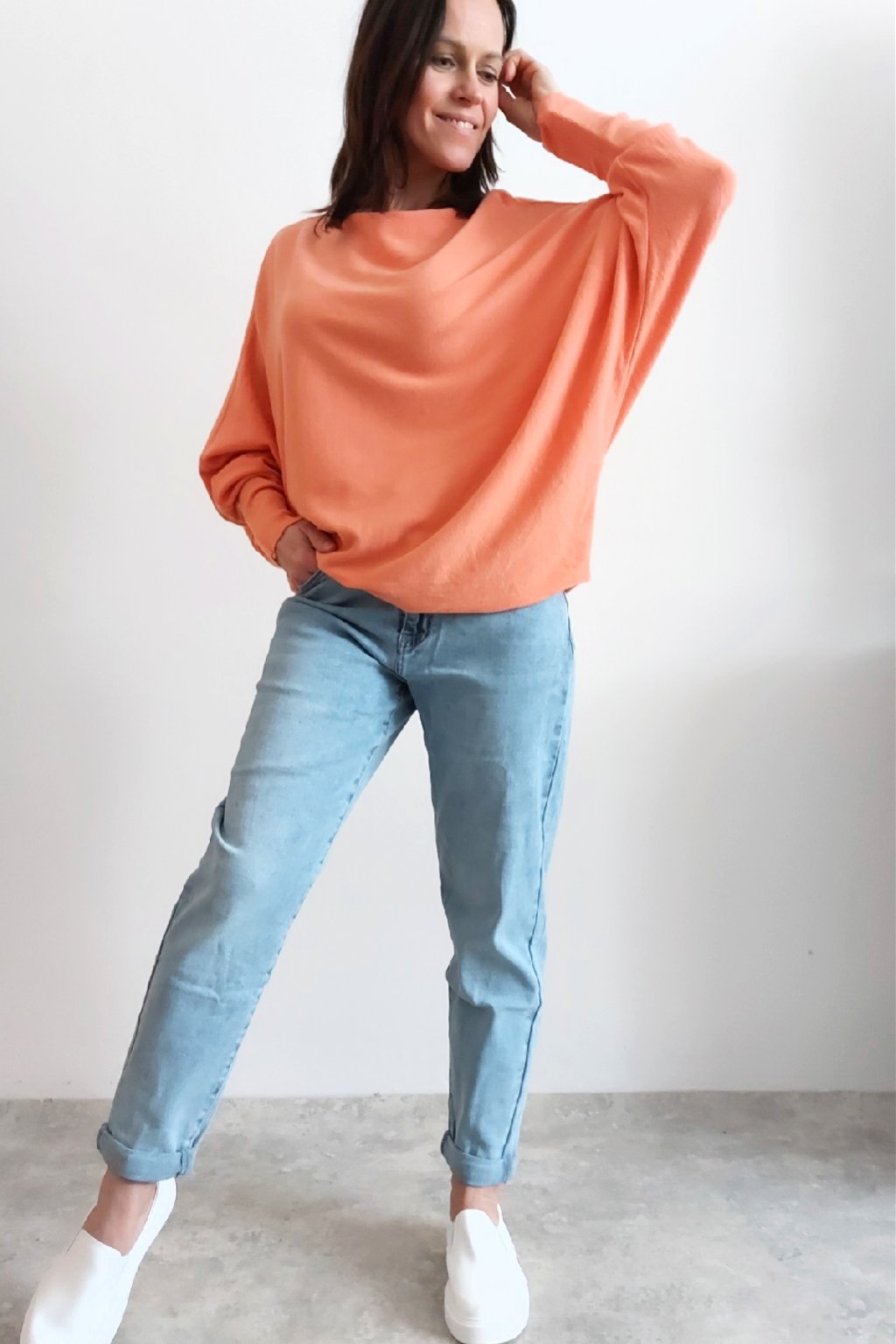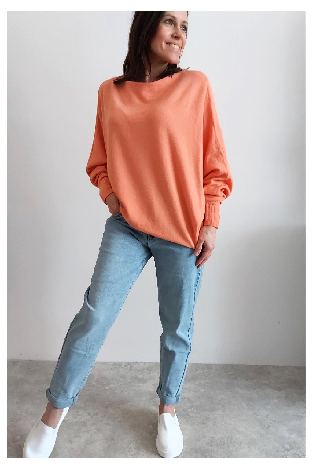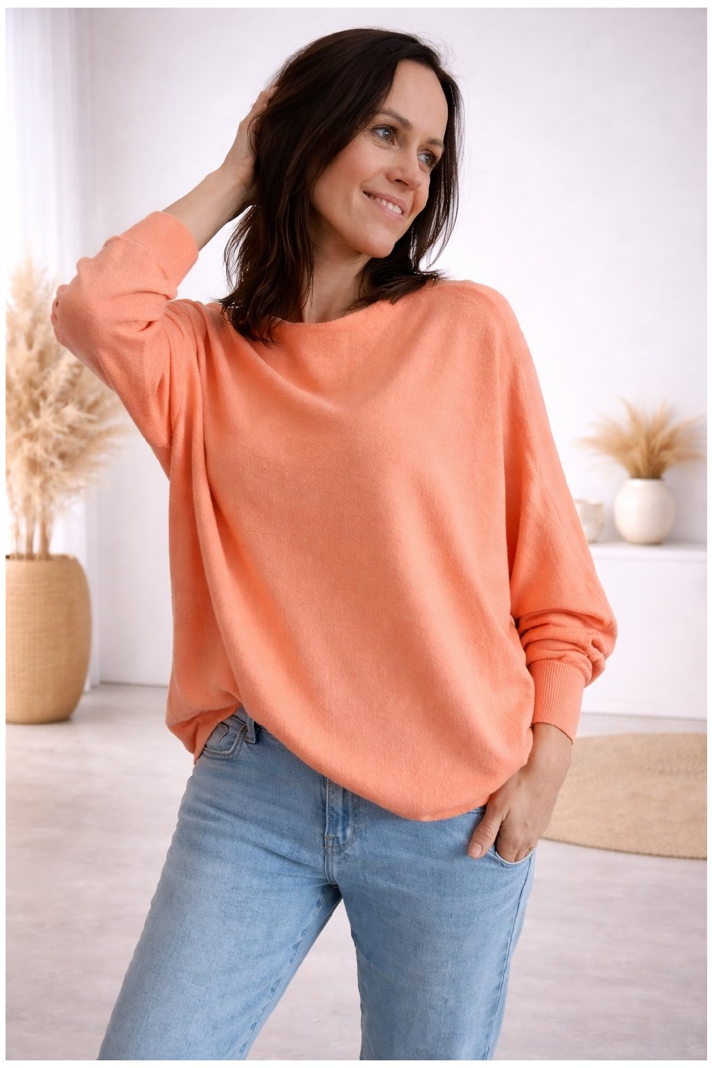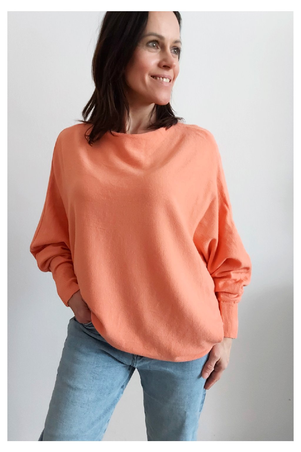 Svetr s netopýřími rukávy volnějšího střihu. Oblékání přes hlavu. Materiál hebký, nekousavý, na těle velmi příjemný a hodně pružný. Foceno na vel. XS, výška 156cm i na vel. 2XL (prsa 116cm, boky 120cm), výška 165cm.