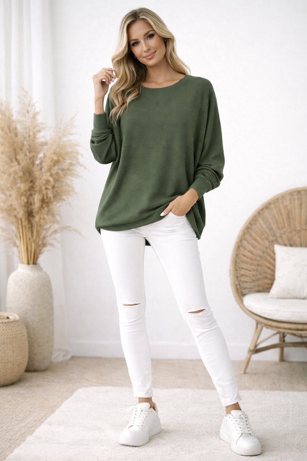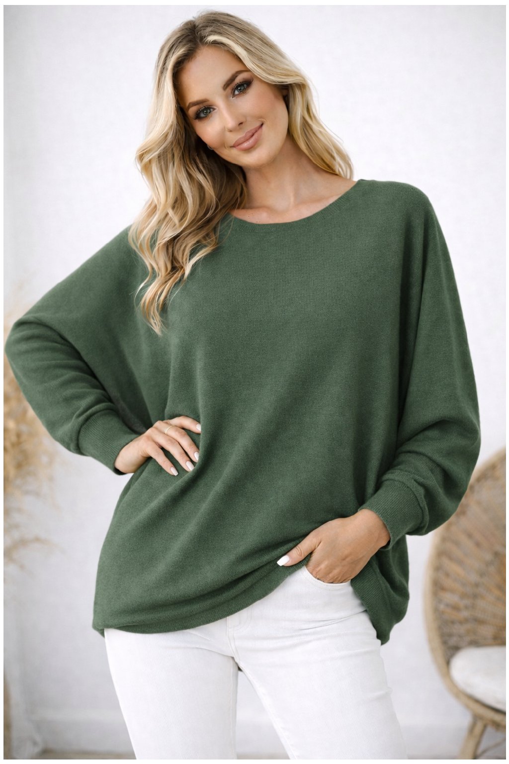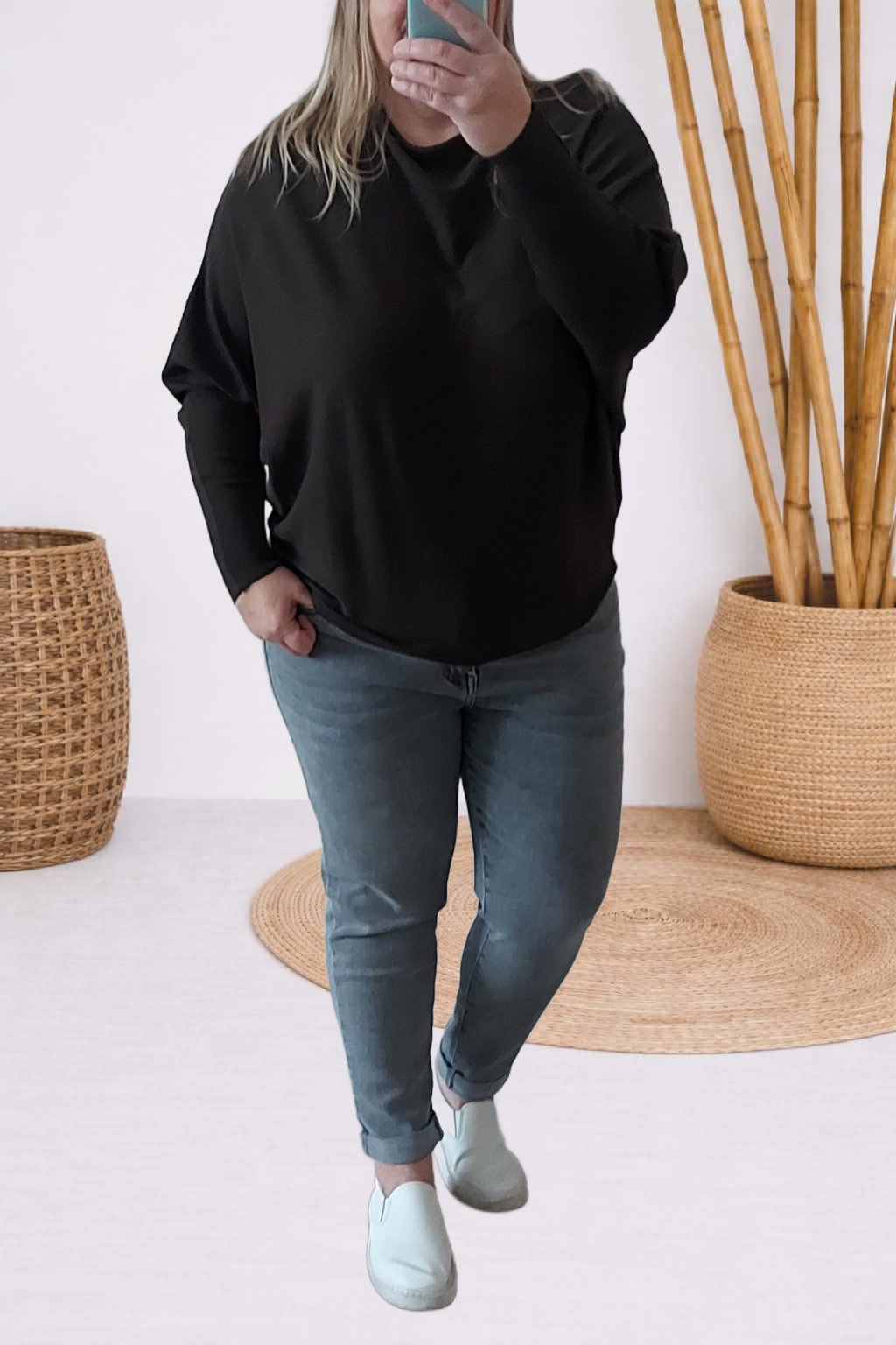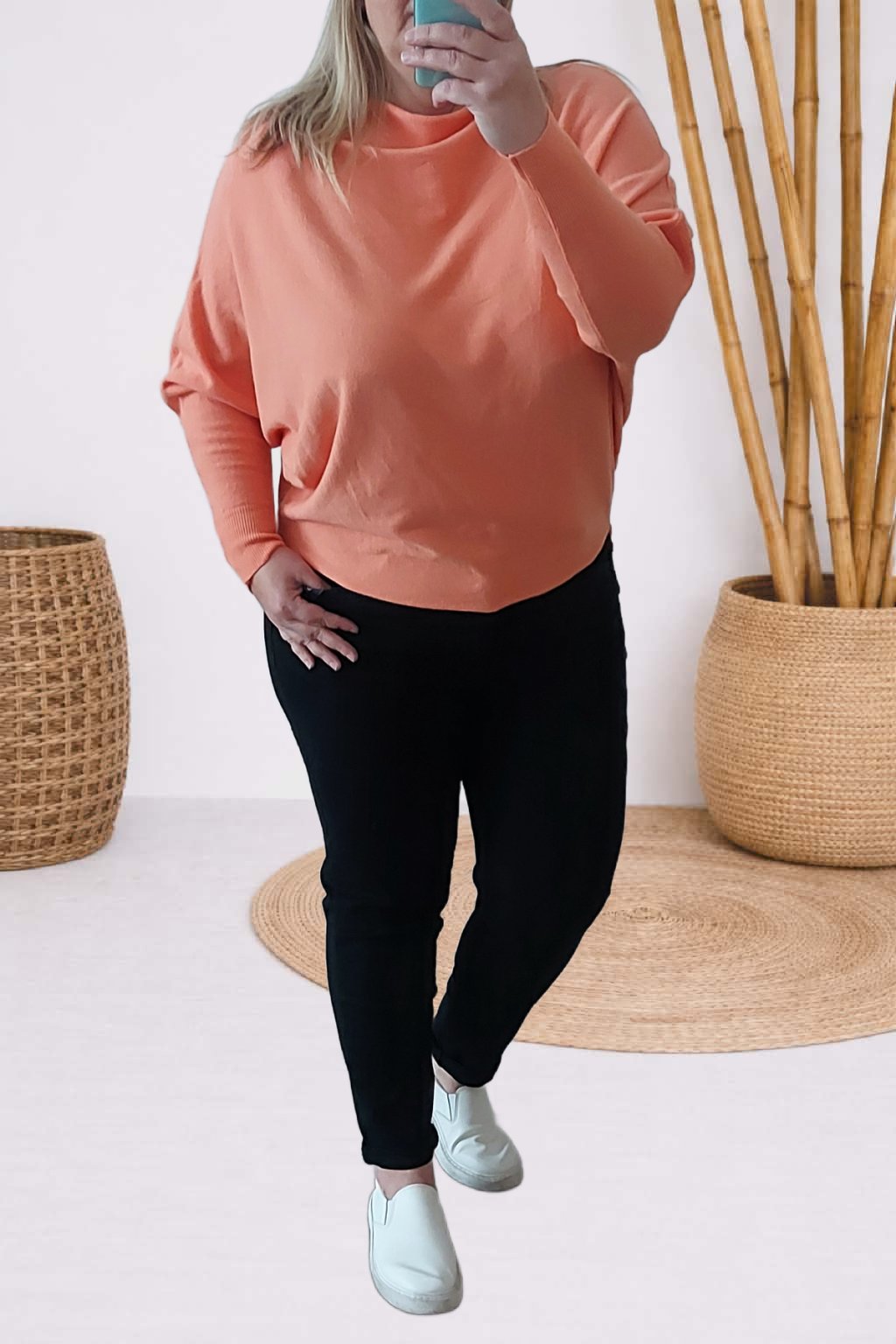 Svetr s netopýřími rukávy volnějšího střihu. Oblékání přes hlavu. Materiál hebký, nekousavý, na těle velmi příjemný a hodně pružný. Foceno i na vel. 2XL (prsa 116cm, boky 120cm), výška 165cm.