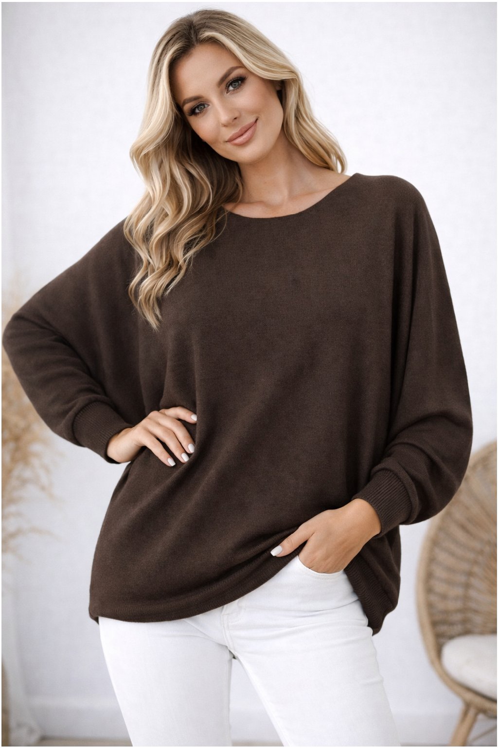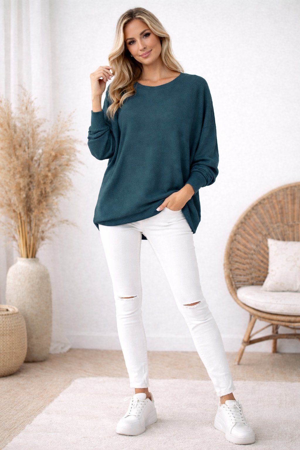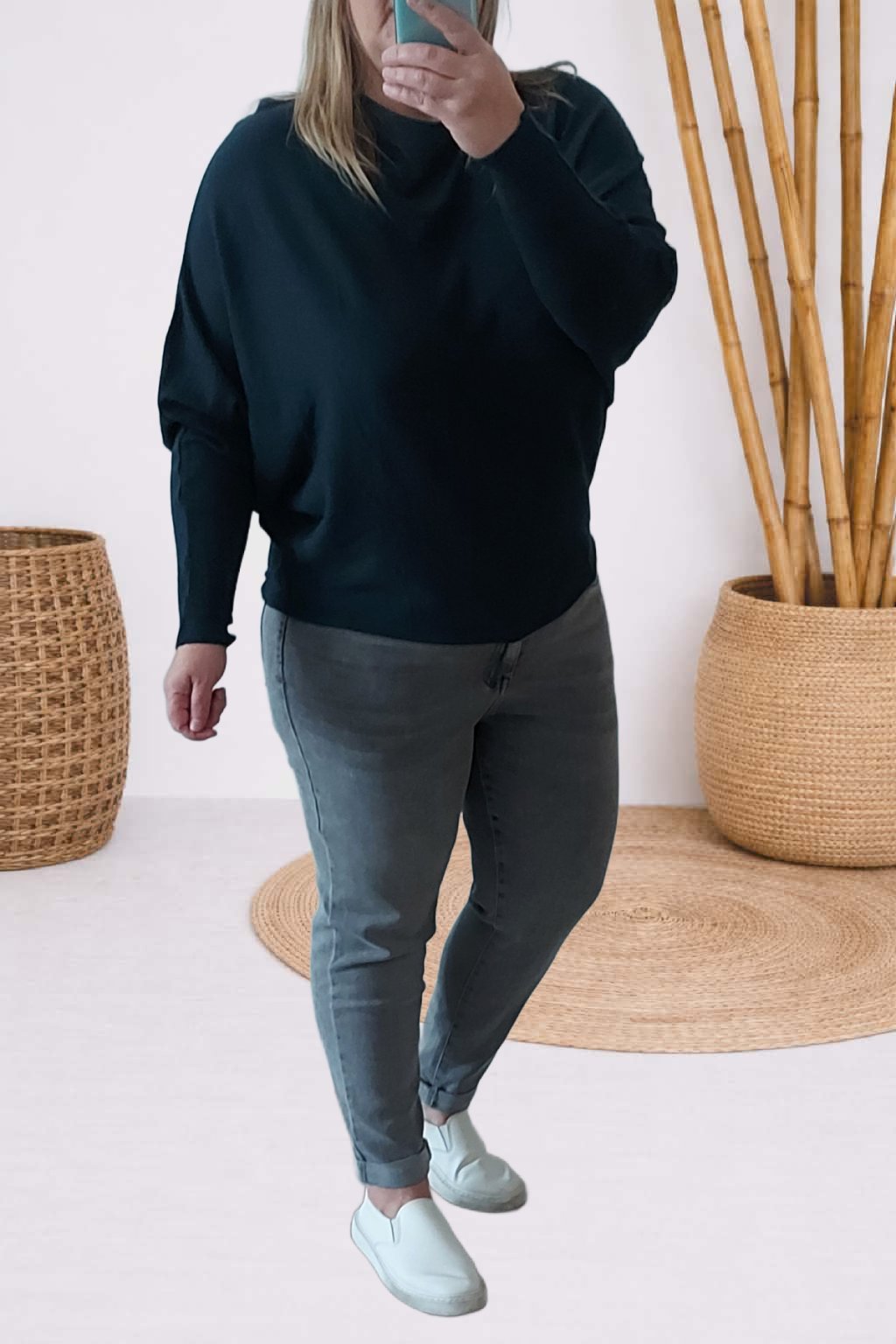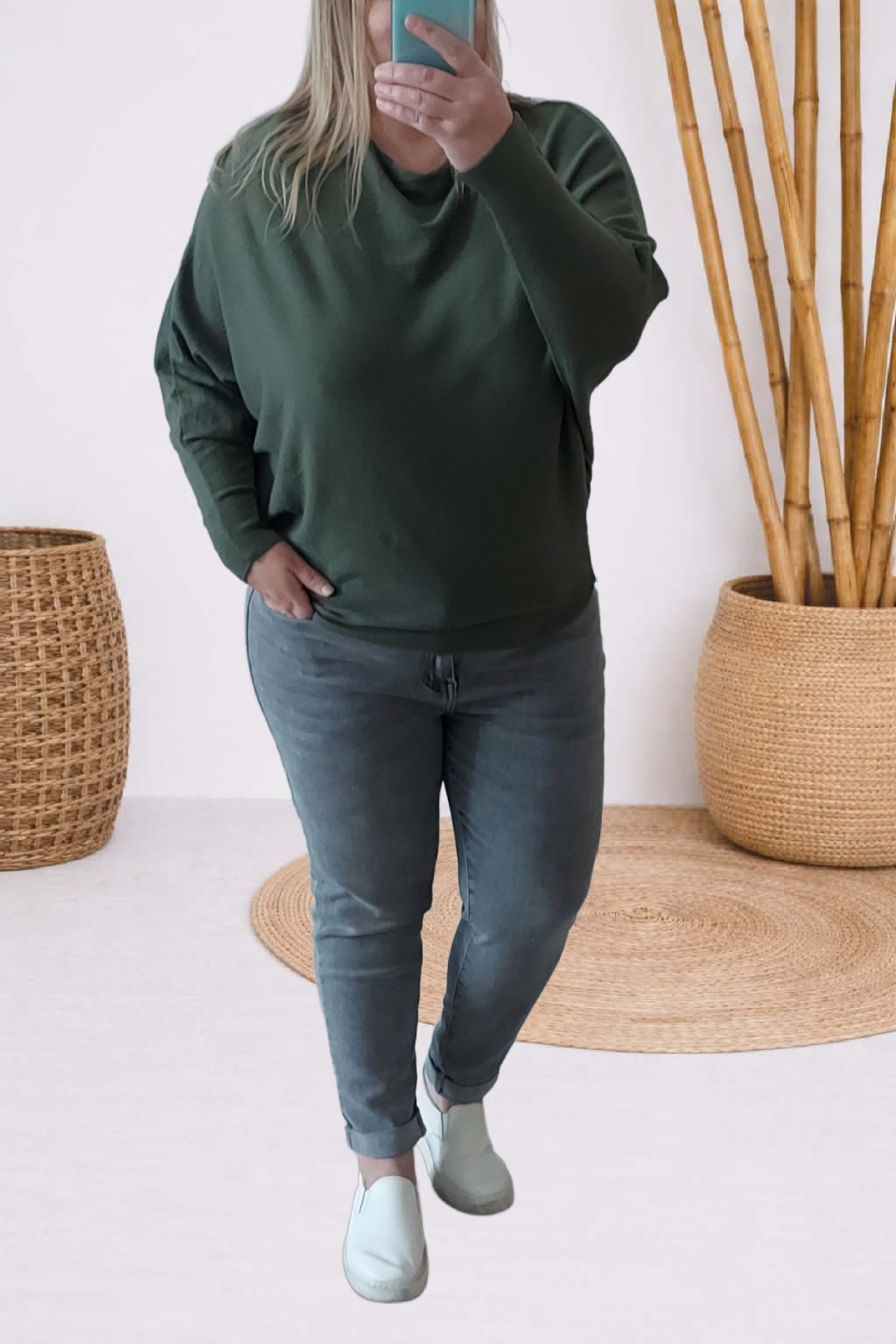 Svetr s netopýřími rukávy volnějšího střihu. Oblékání přes hlavu. Materiál hebký, nekousavý, na těle velmi příjemný a hodně pružný. Foceno i na vel. 2XL (prsa 116cm, boky 120cm), výška 165cm.