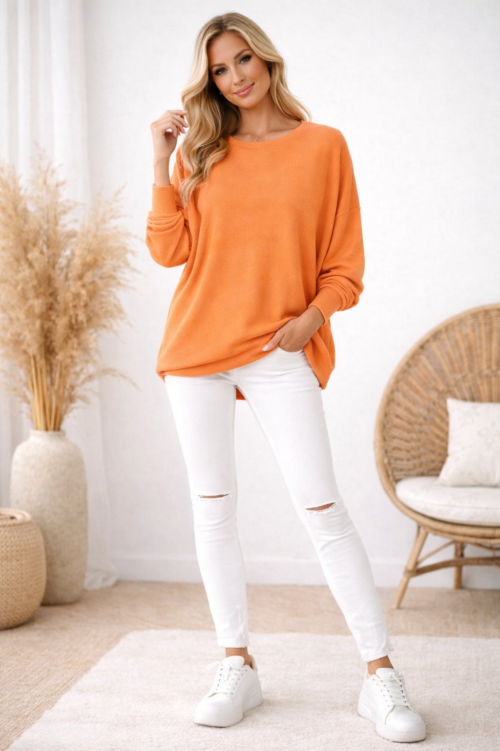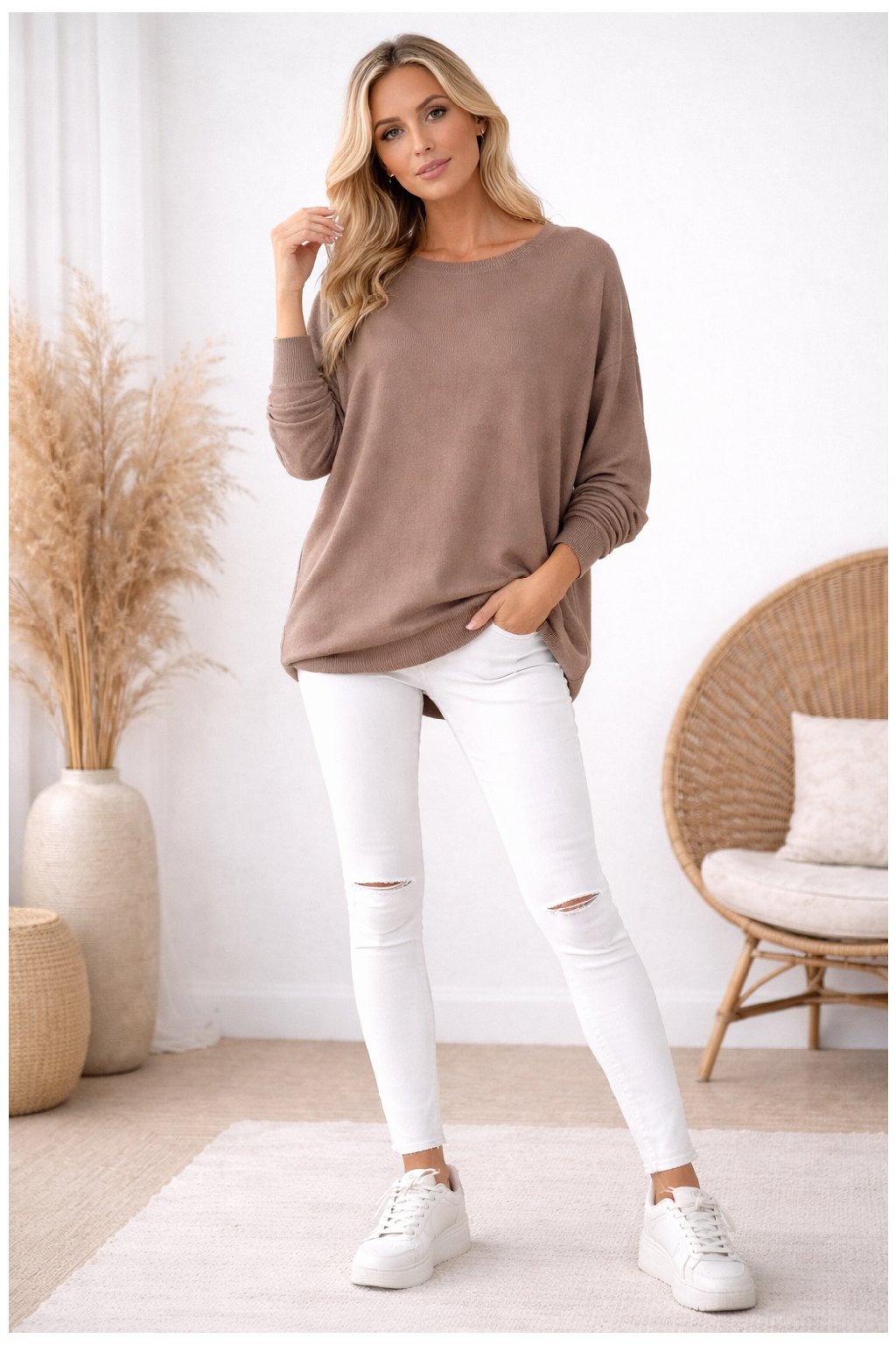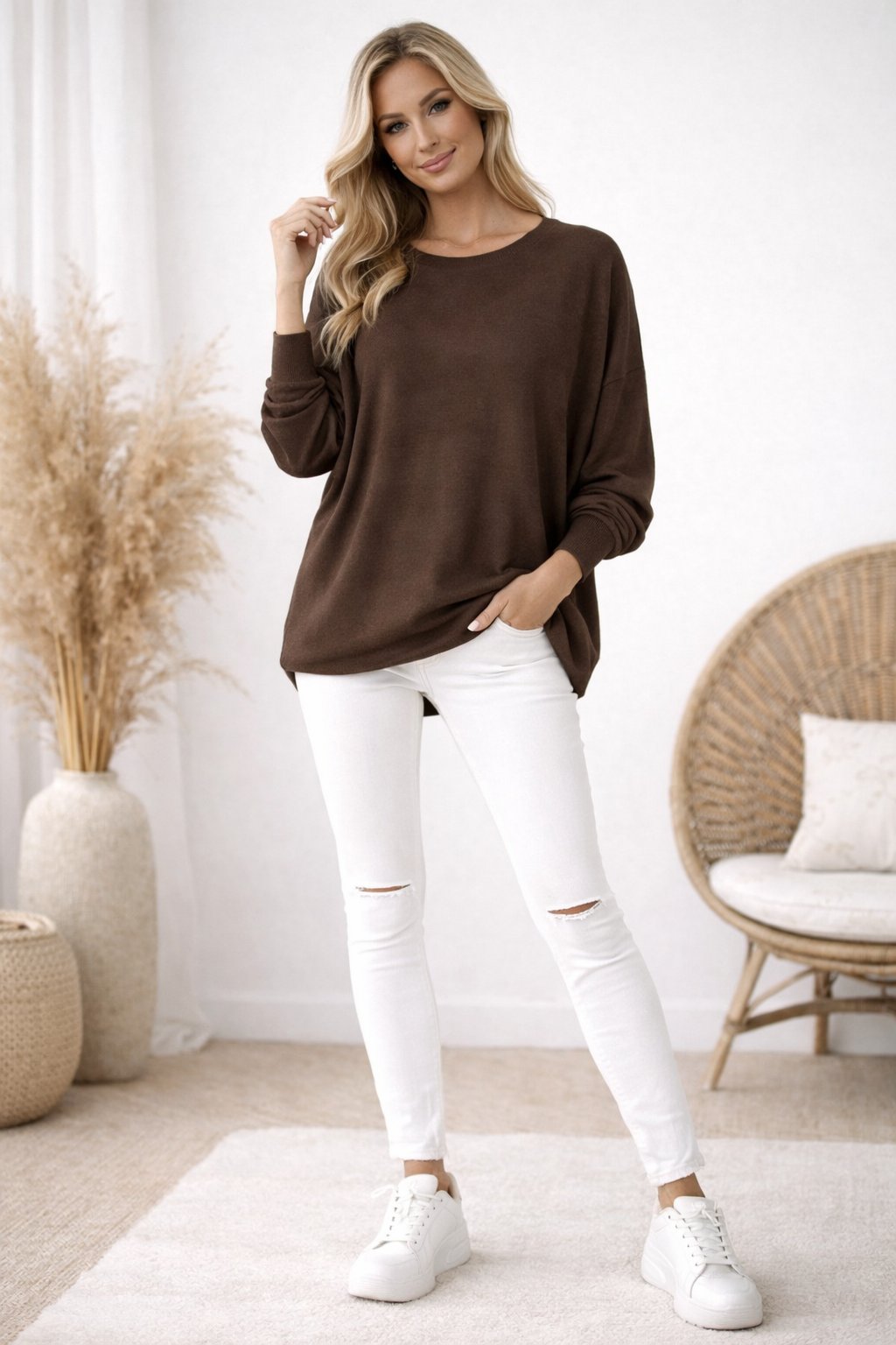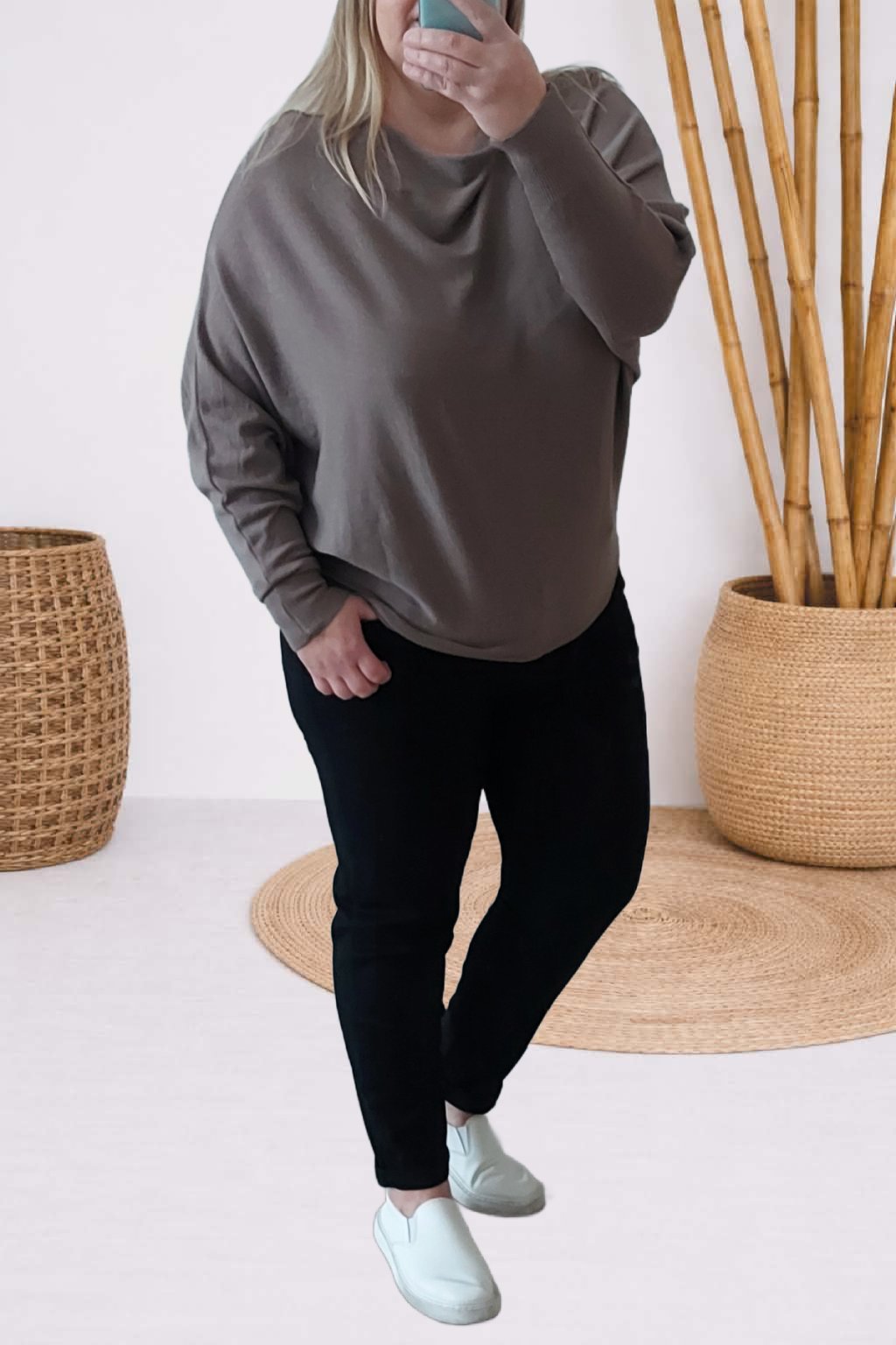 Svetr s netopýřími rukávy volnějšího střihu. Oblékání přes hlavu. Materiál hebký, nekousavý, na těle velmi příjemný a hodně pružný. Foceno i na vel. 2XL (prsa 116cm, boky 120cm), výška 165cm.
