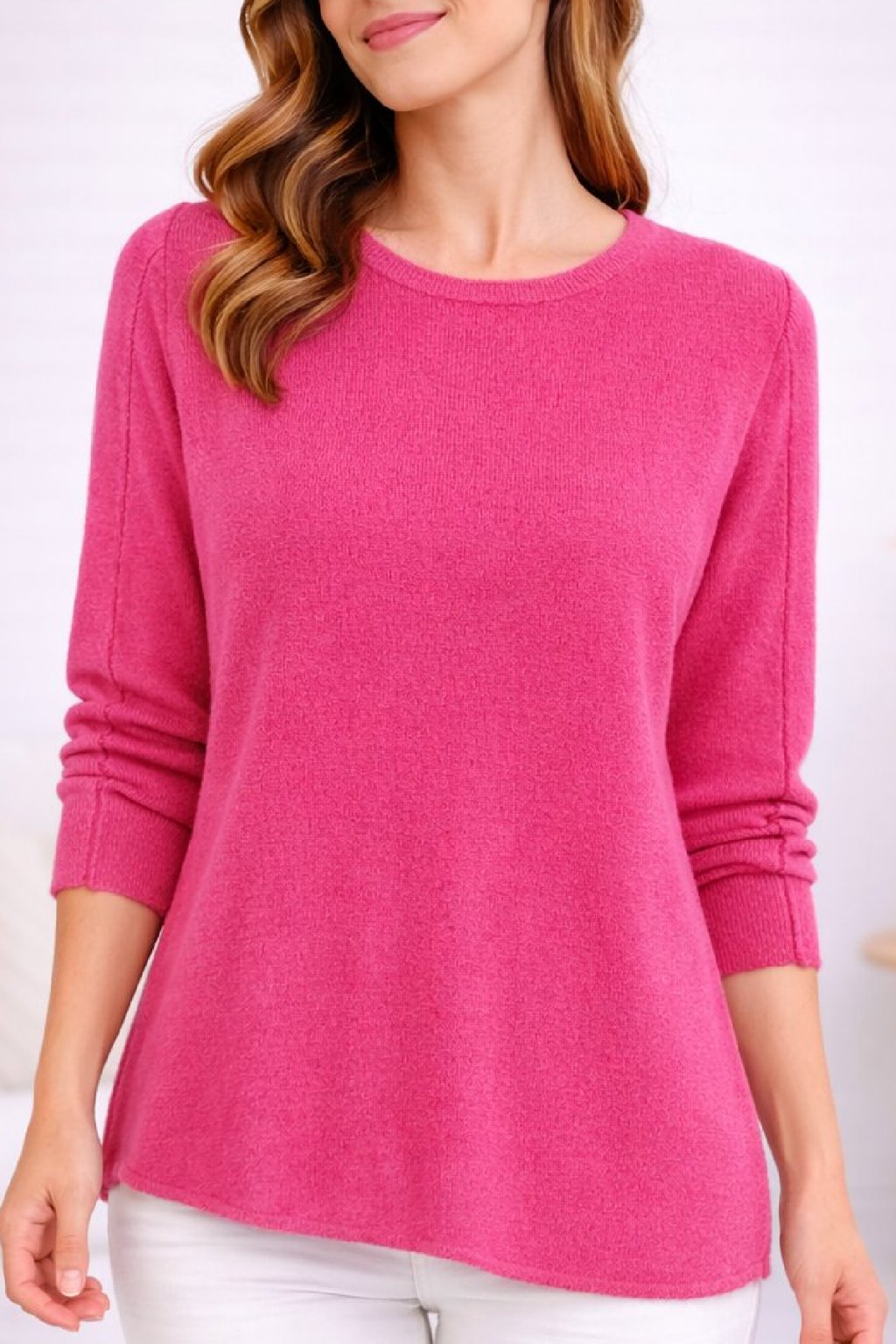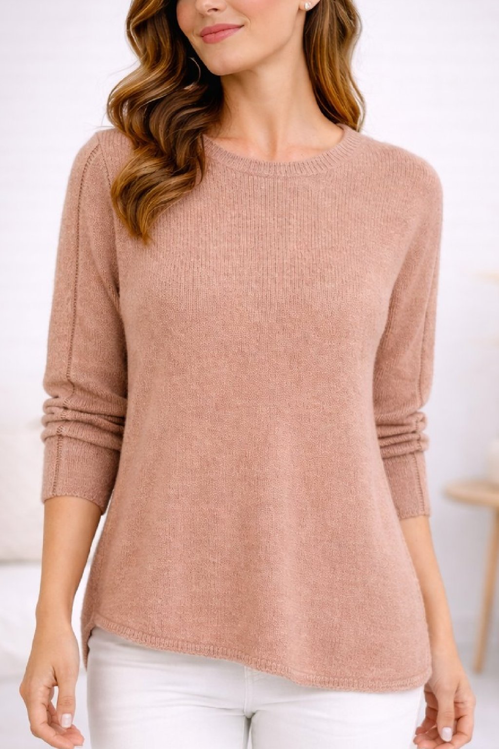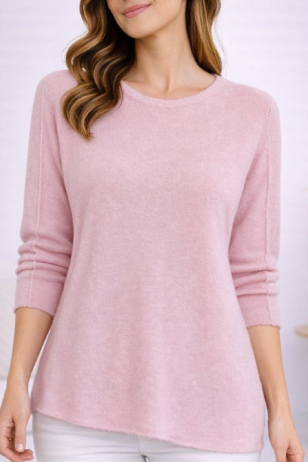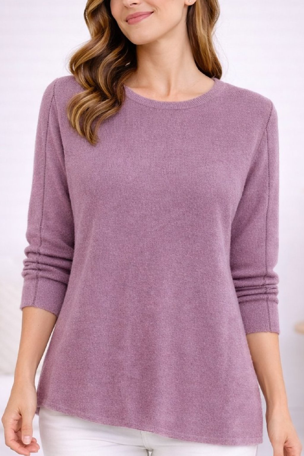 Svetr z hebkého - nekousavého materiálu. Rukávy dlouhé, zdobené po celé délce obráceným výrazným švem. Spodní lem je řešený dokulata - nezapošitý. Kulatý výstřih. Velmi pružný materiál. Rukávy, spodní lem i výstřih u krku je ukončený jen zastřižením - bez zapošití či švu.