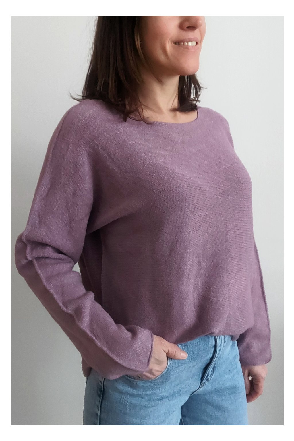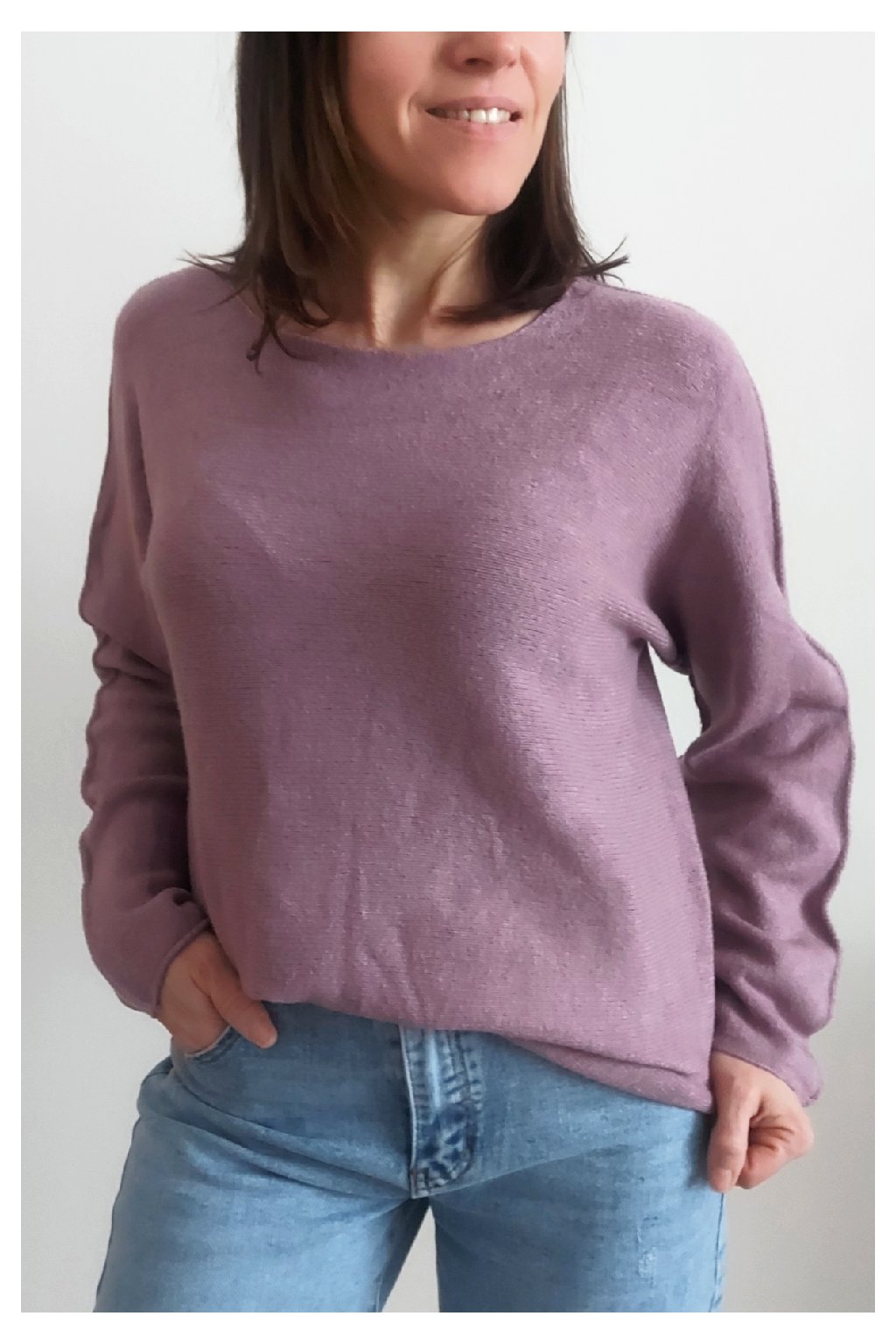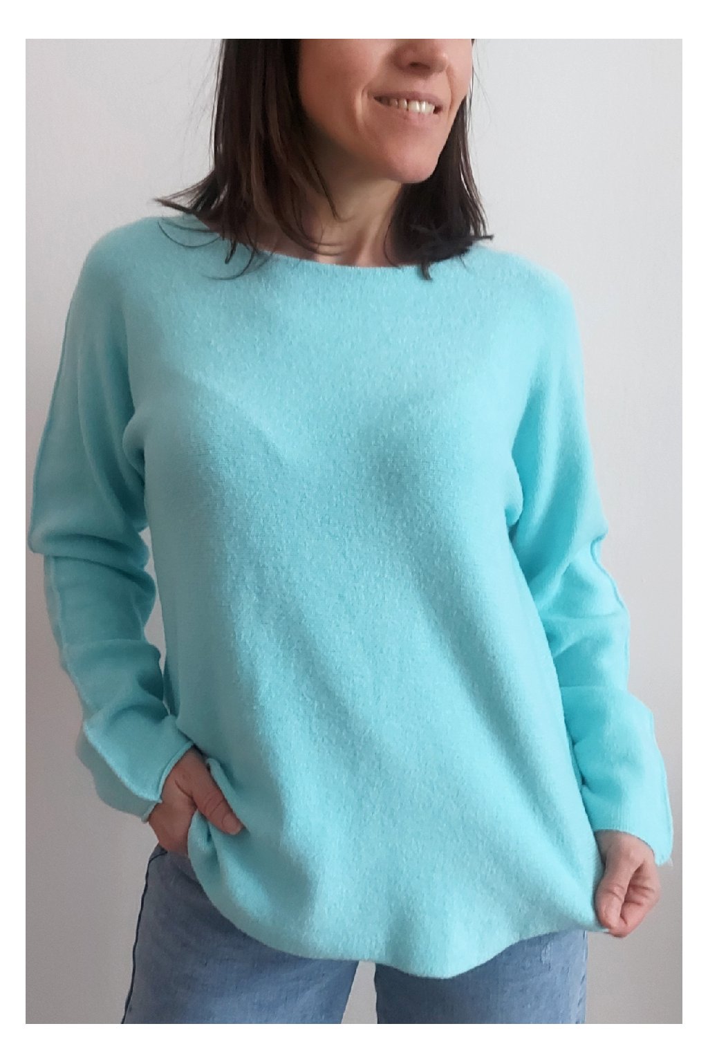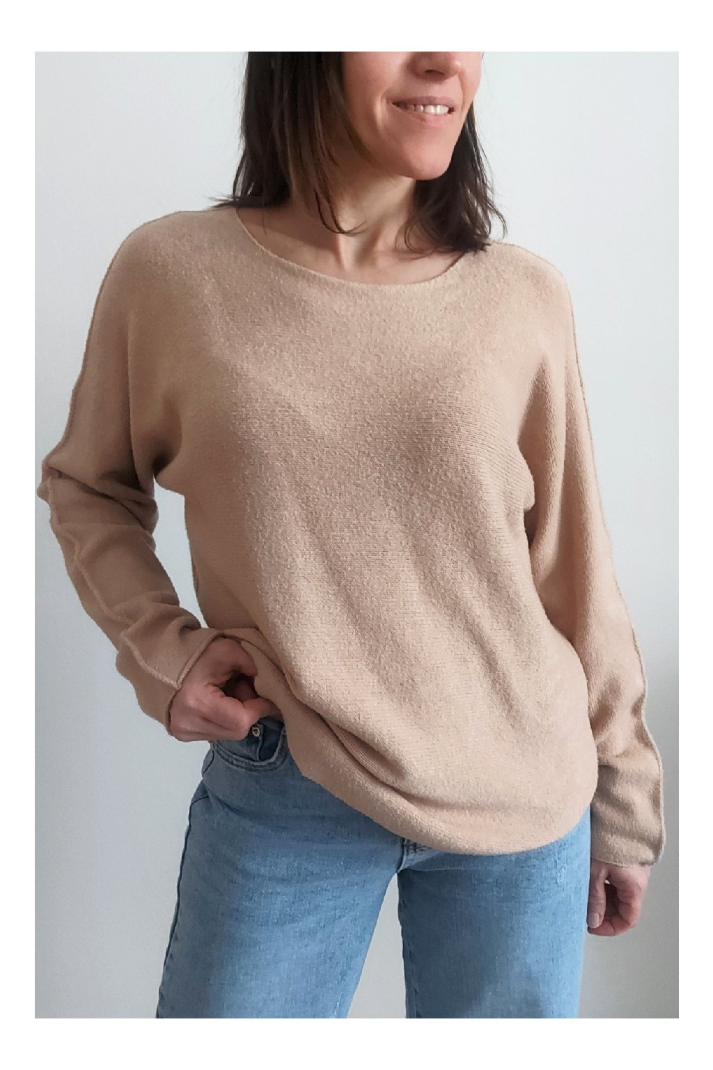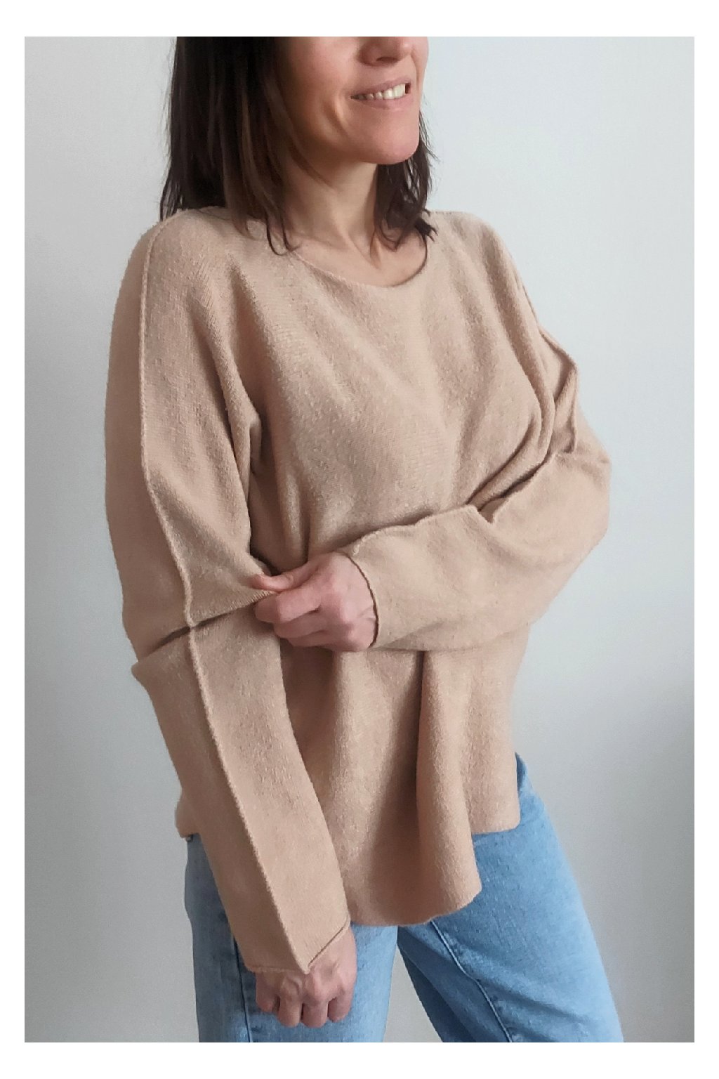 Svetr z hebkého - nekousavého materiálu. Rukávy dlouhé, zdobené po celé délce obráceným výrazným švem. Spodní lem je řešený dokulata - nezapošitý. Kulatý výstřih. Velmi pružný materiál. Rukávy, spodní lem i výstřih u krku je ukončený jen zastřižením - bez zapošití či švu. Foceno na vel. XS, výška 156cm.