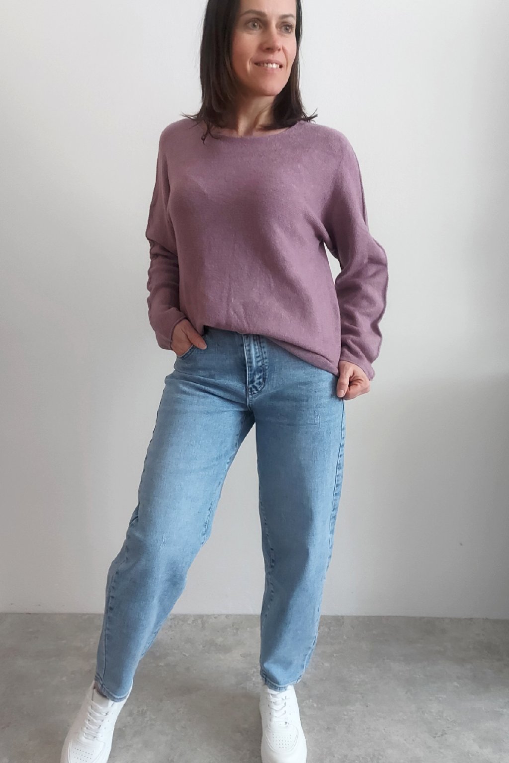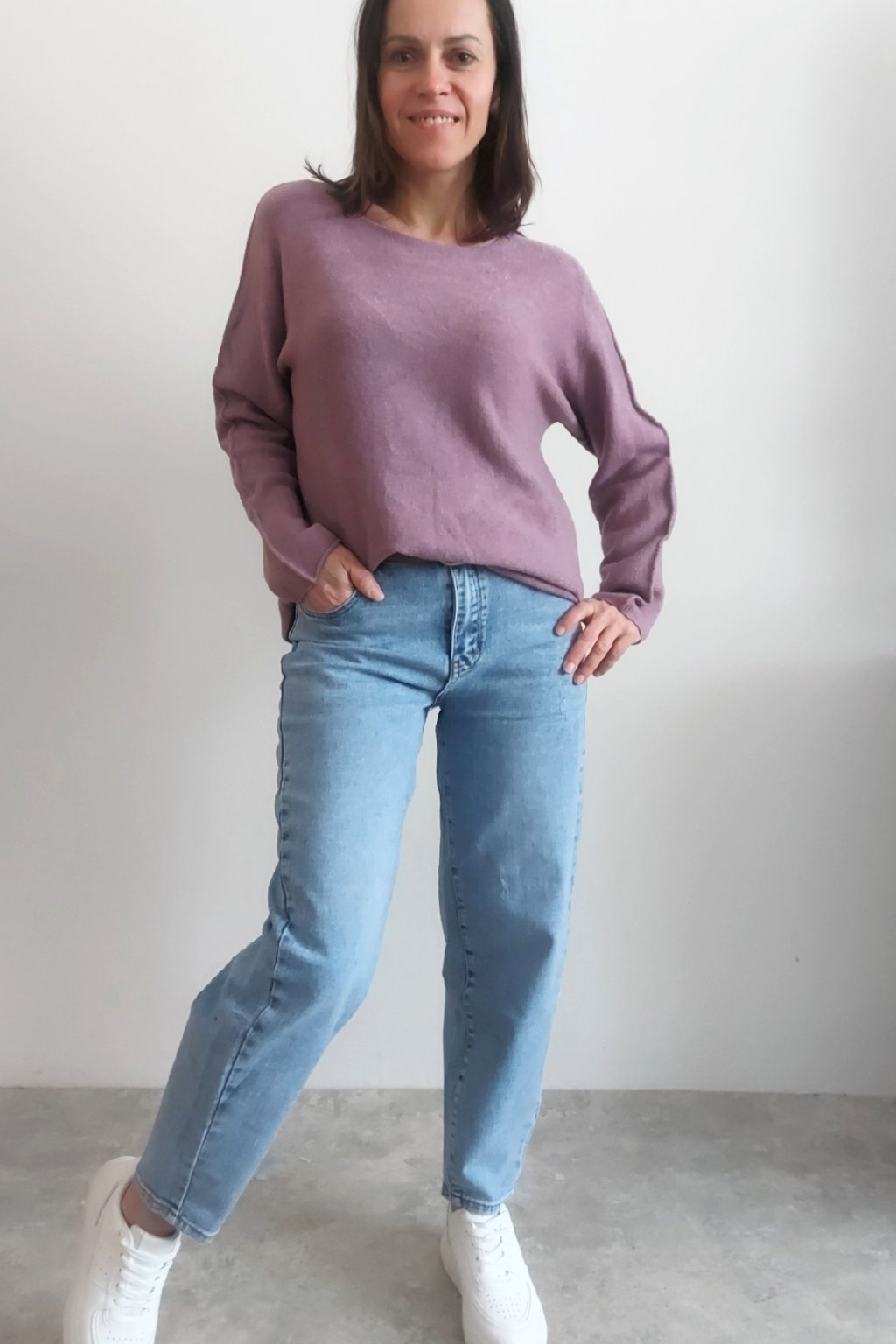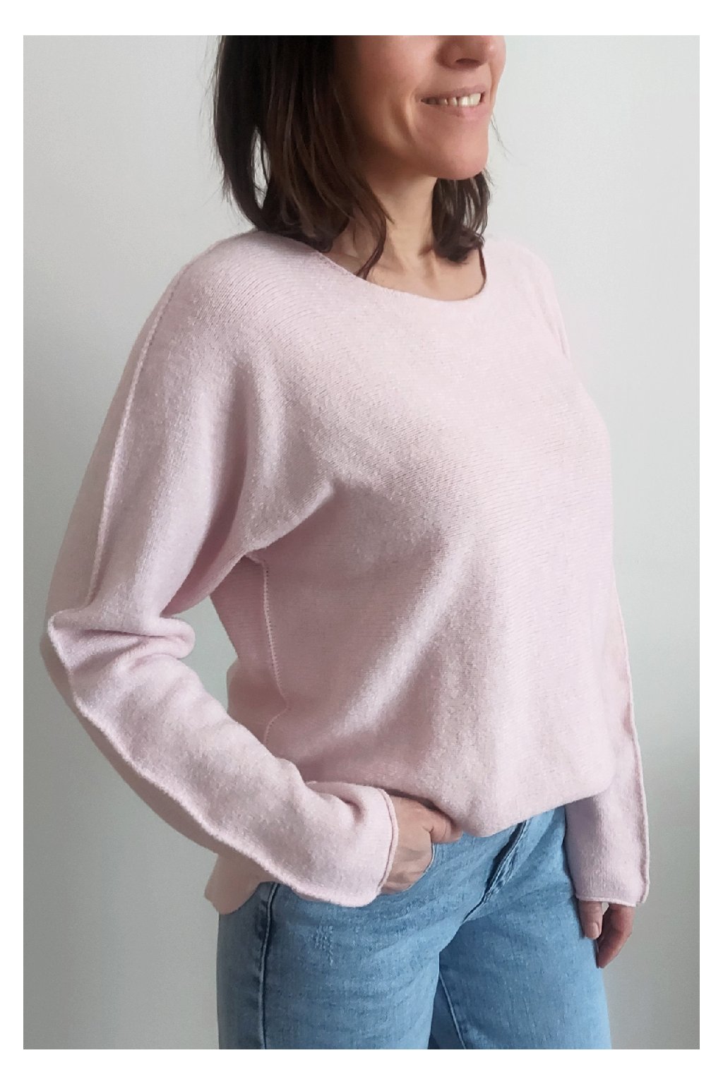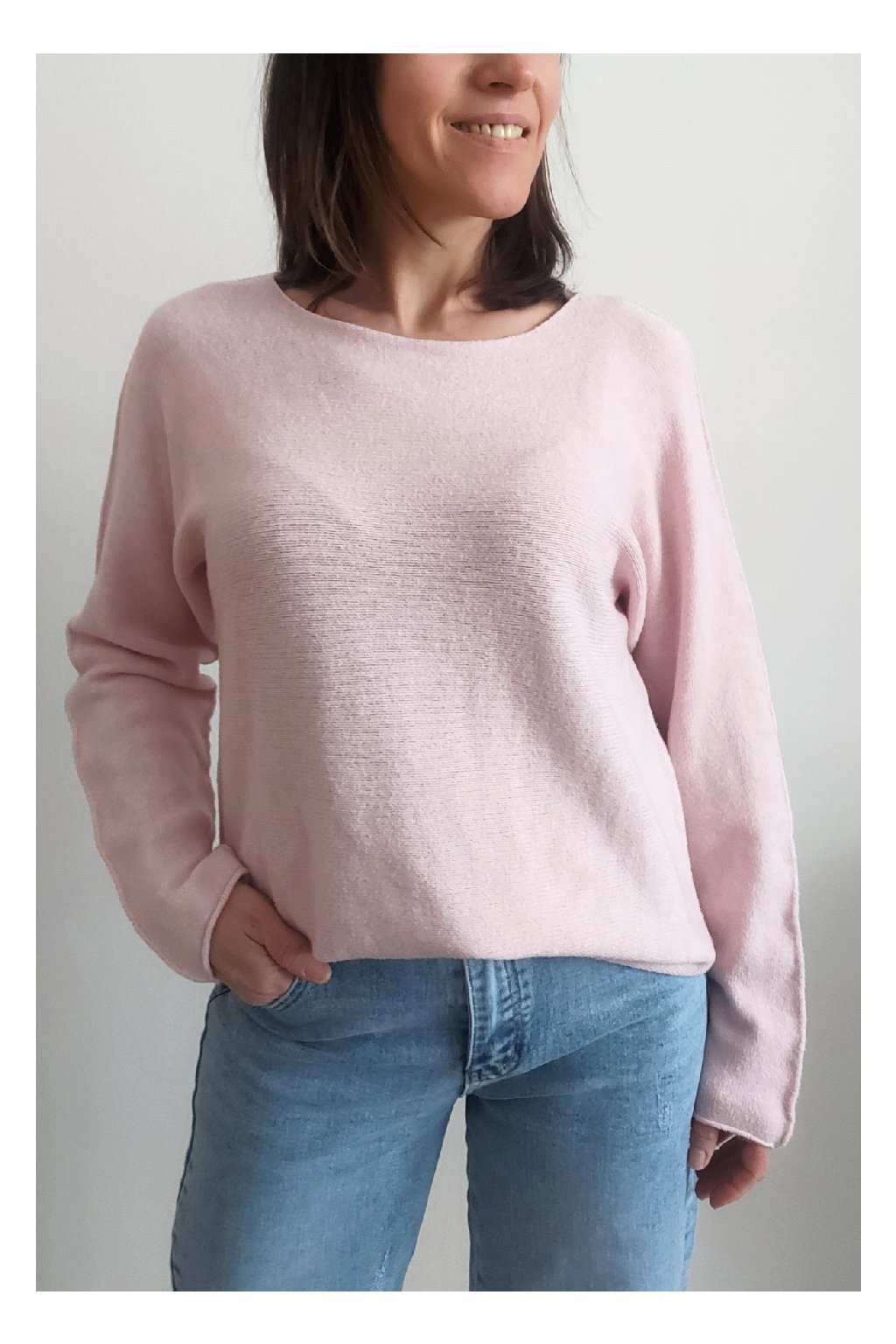 Svetr z hebkého - nekousavého materiálu. Rukávy dlouhé, zdobené po celé délce obráceným výrazným švem. Spodní lem je řešený dokulata - nezapošitý. Kulatý výstřih. Velmi pružný materiál. Rukávy, spodní lem i výstřih u krku je ukončený jen zastřižením - bez zapošití či švu. Foceno na vel. XS, výška 156cm.