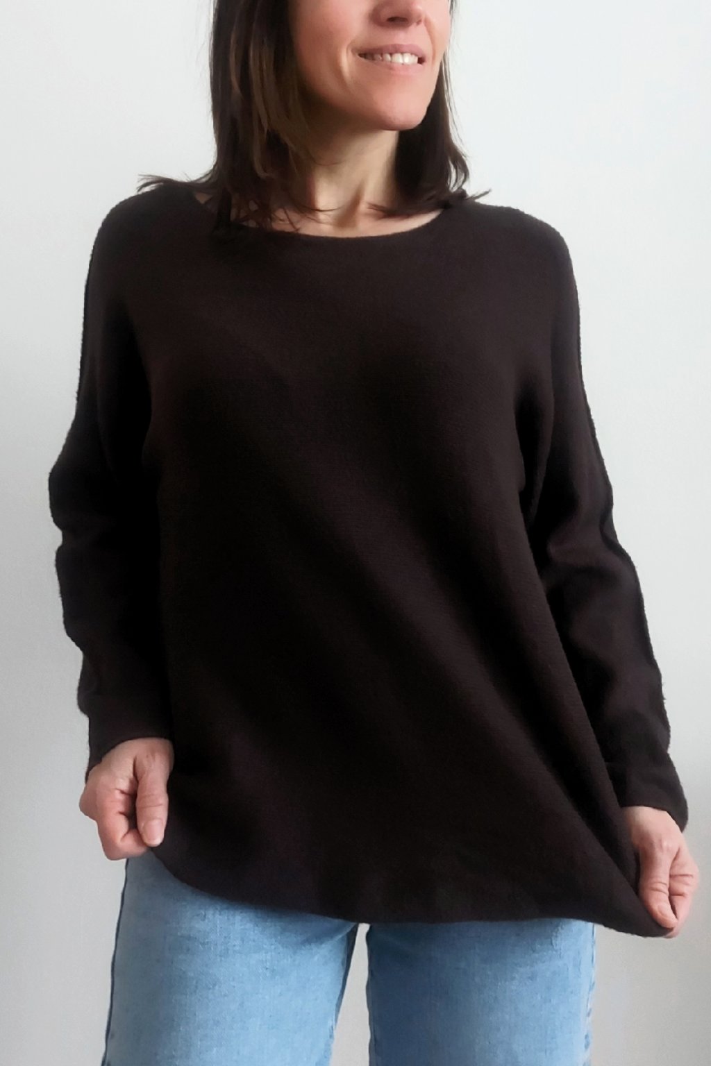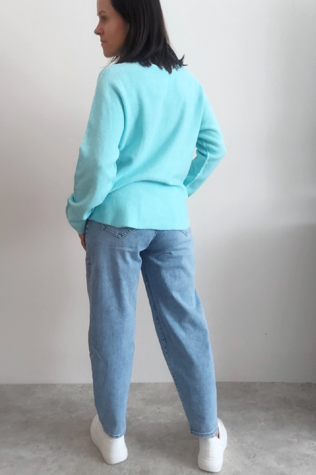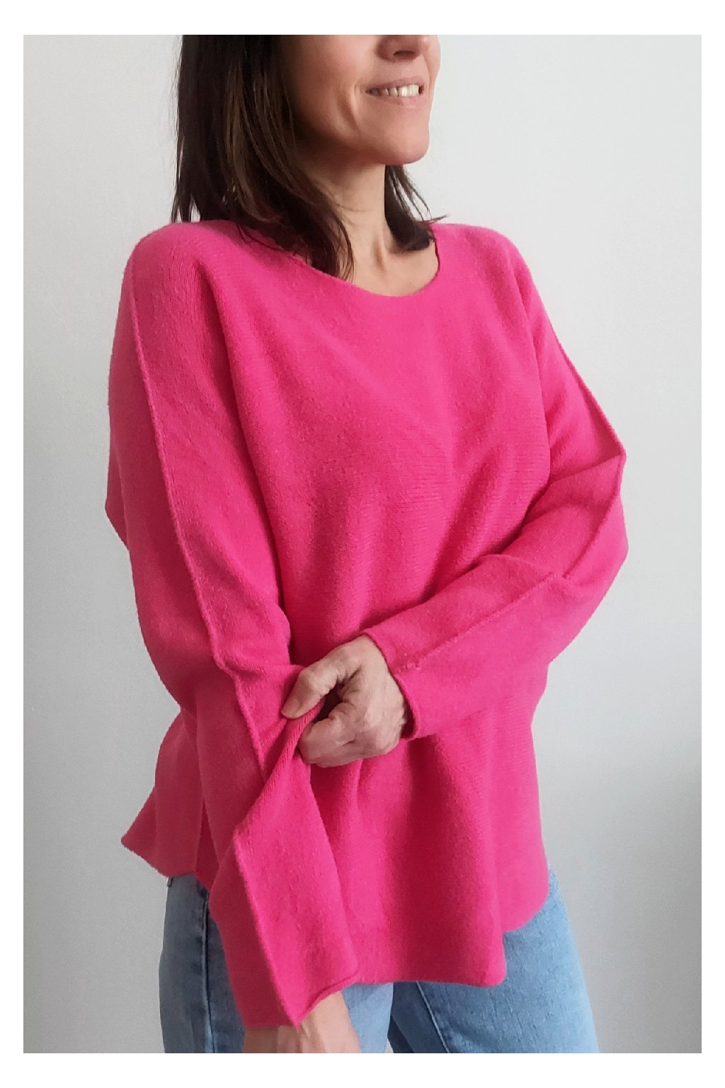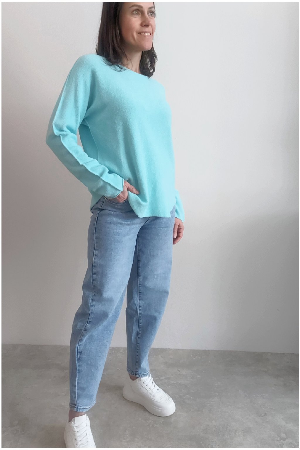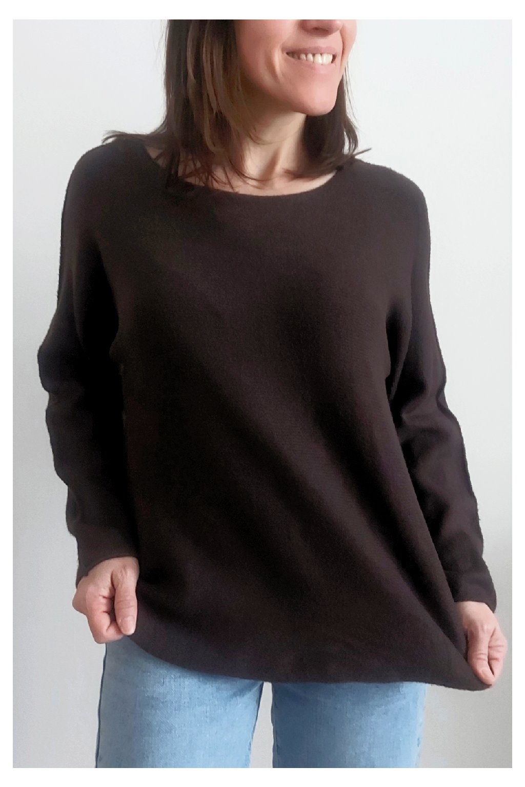 Svetr z hebkého - nekousavého materiálu. Rukávy dlouhé, zdobené po celé délce obráceným výrazným švem. Spodní lem je řešený dokulata - nezapošitý. Kulatý výstřih. Velmi pružný materiál. Rukávy, spodní lem i výstřih u krku je ukončený jen zastřižením - bez zapošití či švu. Foceno na vel. XS, výška 156cm.