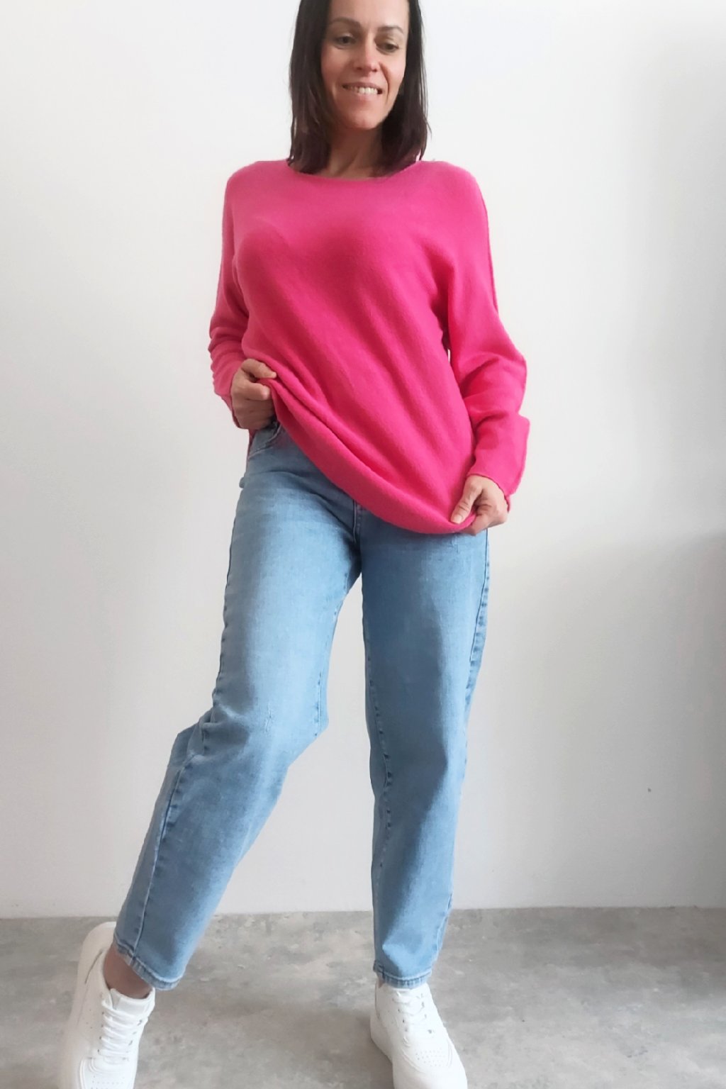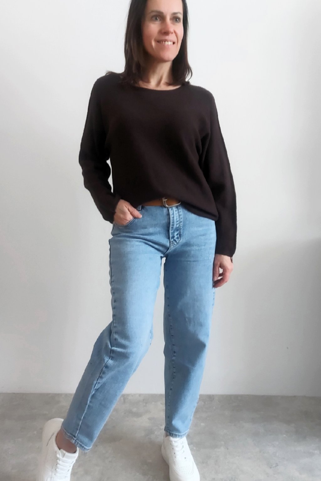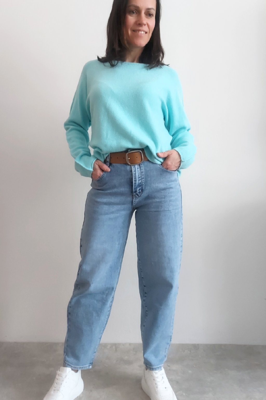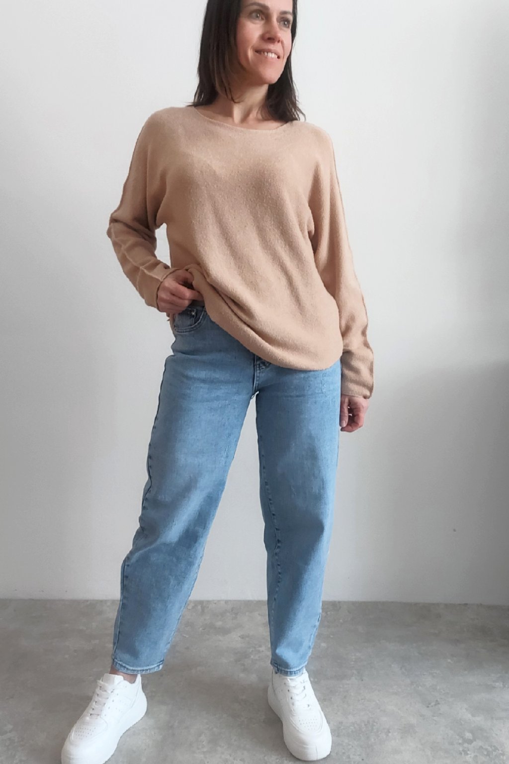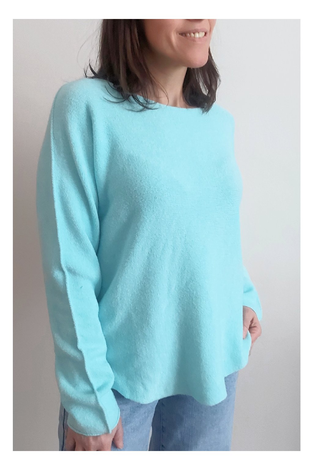 Svetr z hebkého - nekousavého materiálu. Rukávy dlouhé, zdobené po celé délce obráceným výrazným švem. Spodní lem je řešený dokulata - nezapošitý. Kulatý výstřih. Velmi pružný materiál. Rukávy, spodní lem i výstřih u krku je ukončený jen zastřižením - bez zapošití či švu. Foceno na vel. XS, výška 156cm.