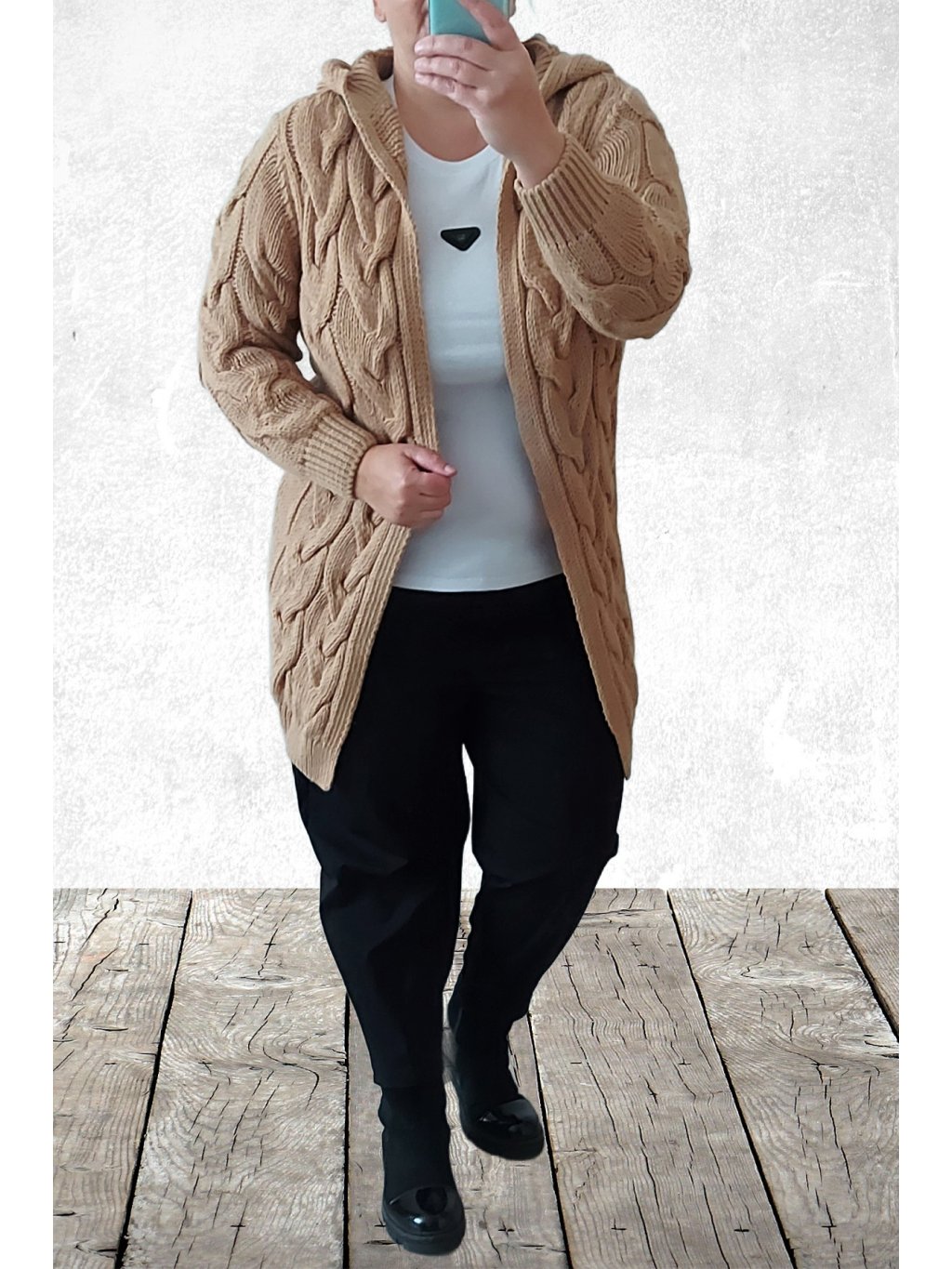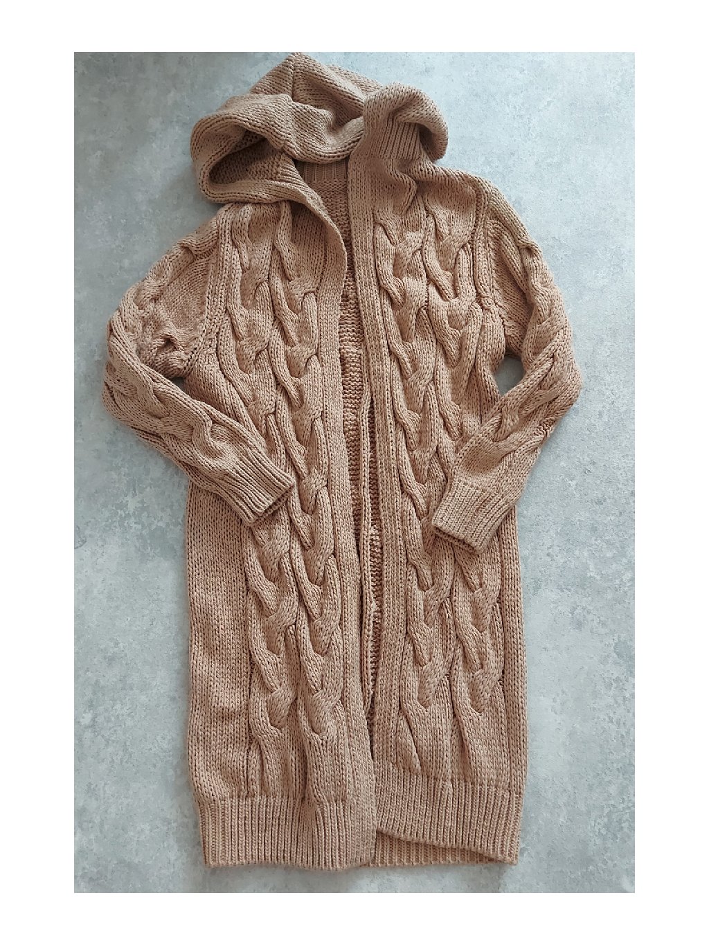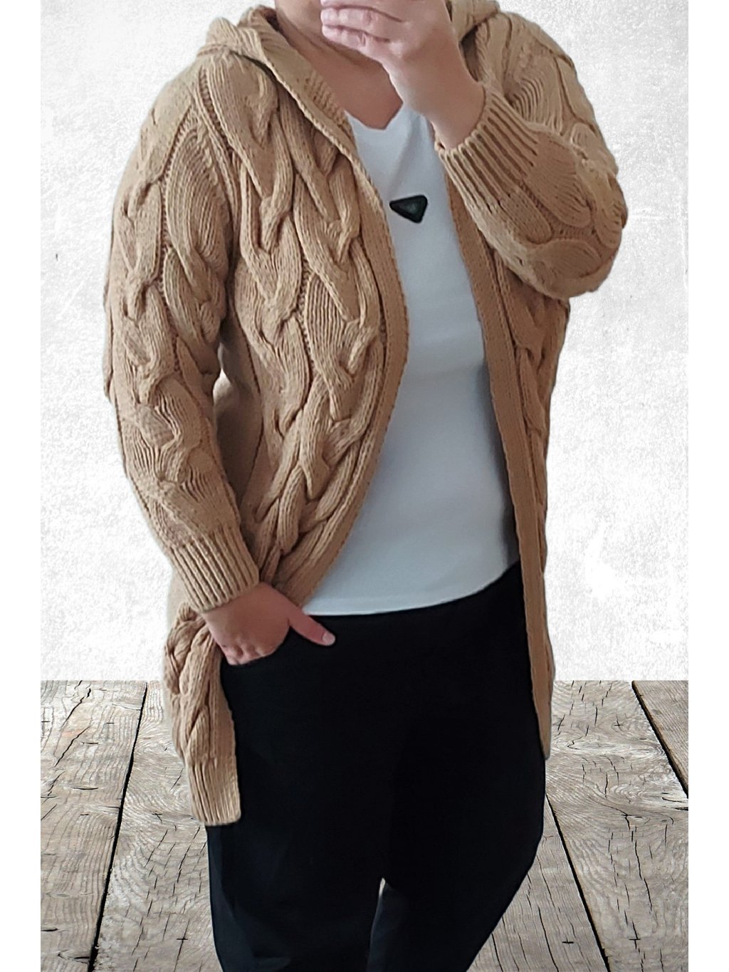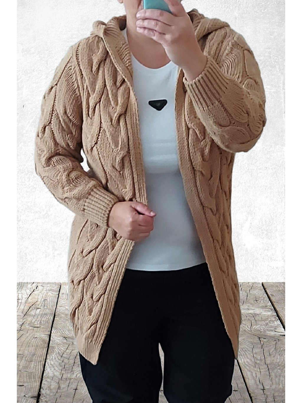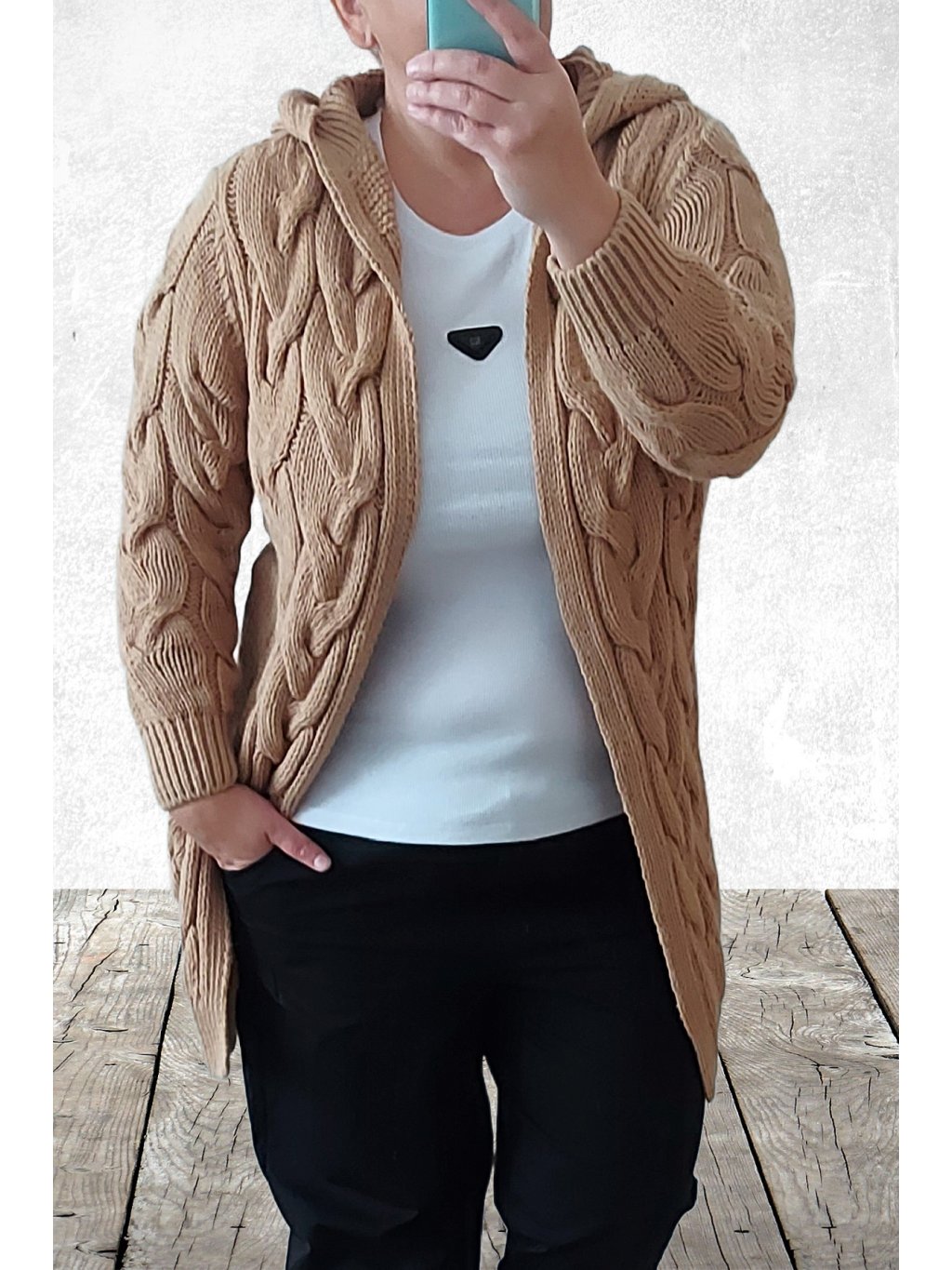 Svetrový kardigan s kapucí. Krásný copánkový pletený vzor. Bez kapes a zapínání. Velmi hřejivý, huňatý a pružný. Foceno na vel. XS, výška 156cm i na vel. 2XL (prsa 116cm, boky 120cm), výška 165cm.