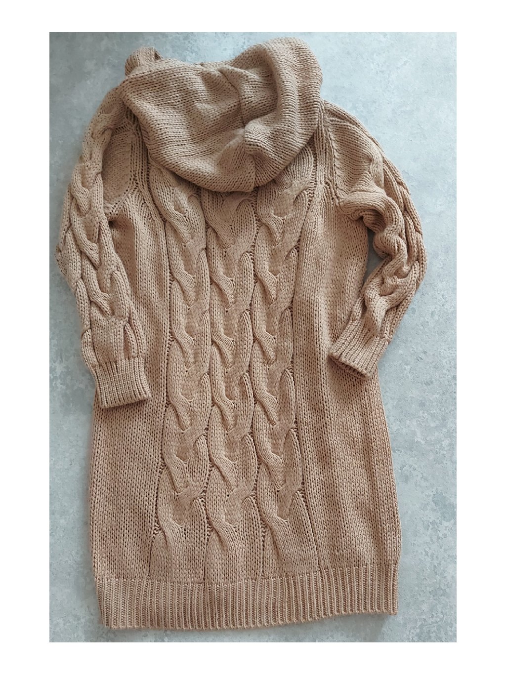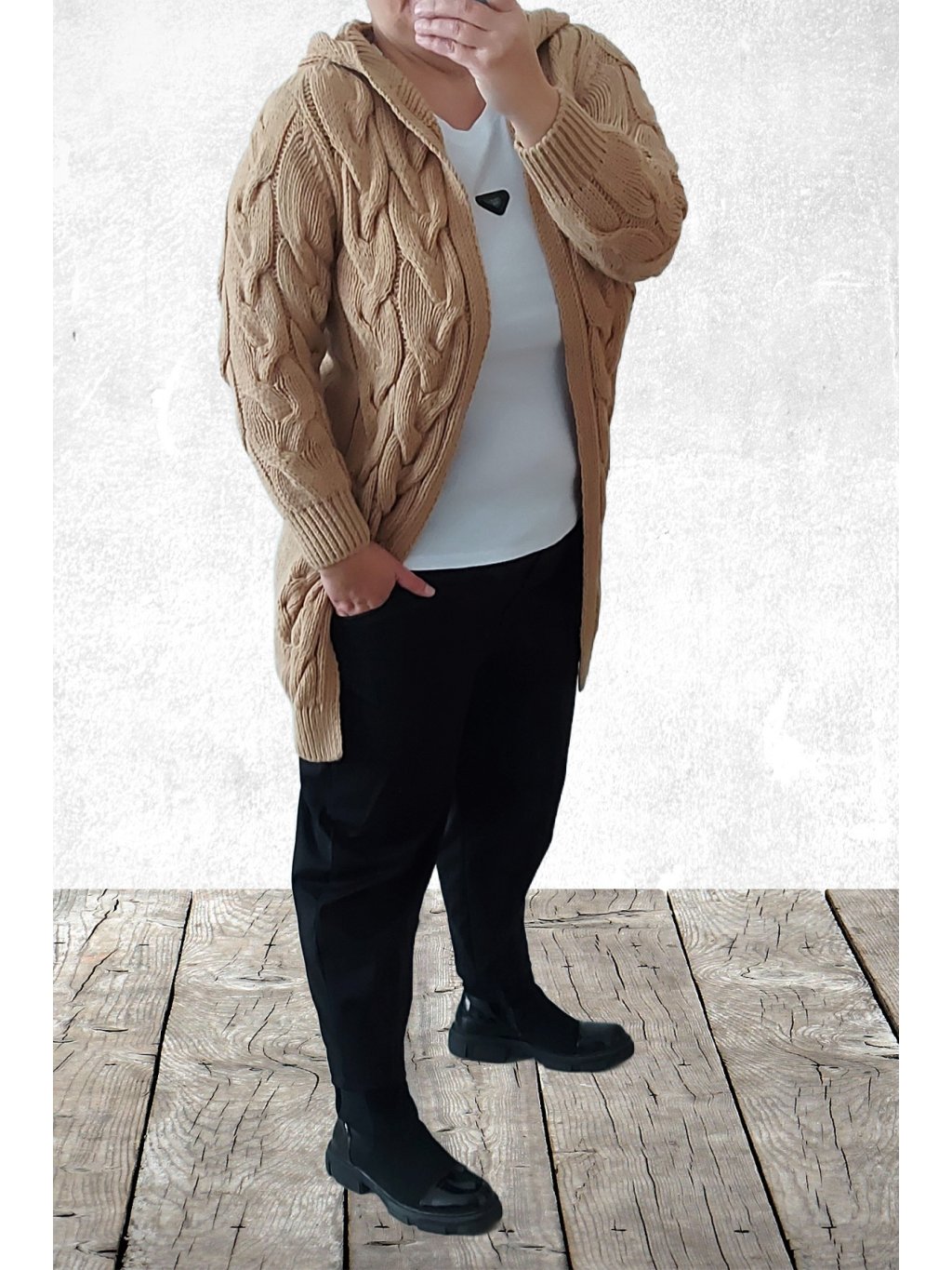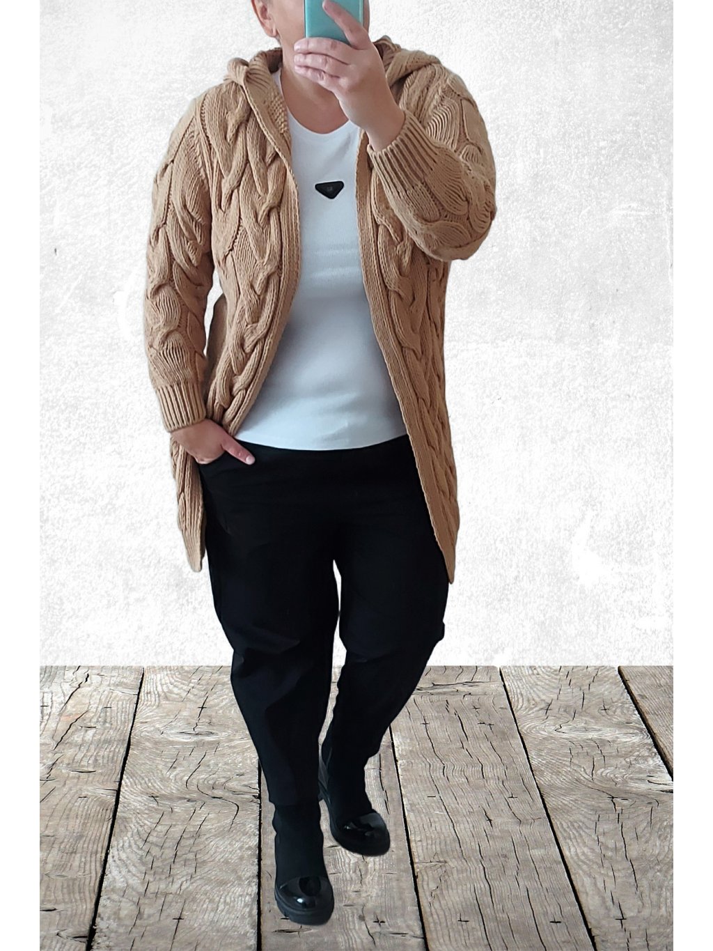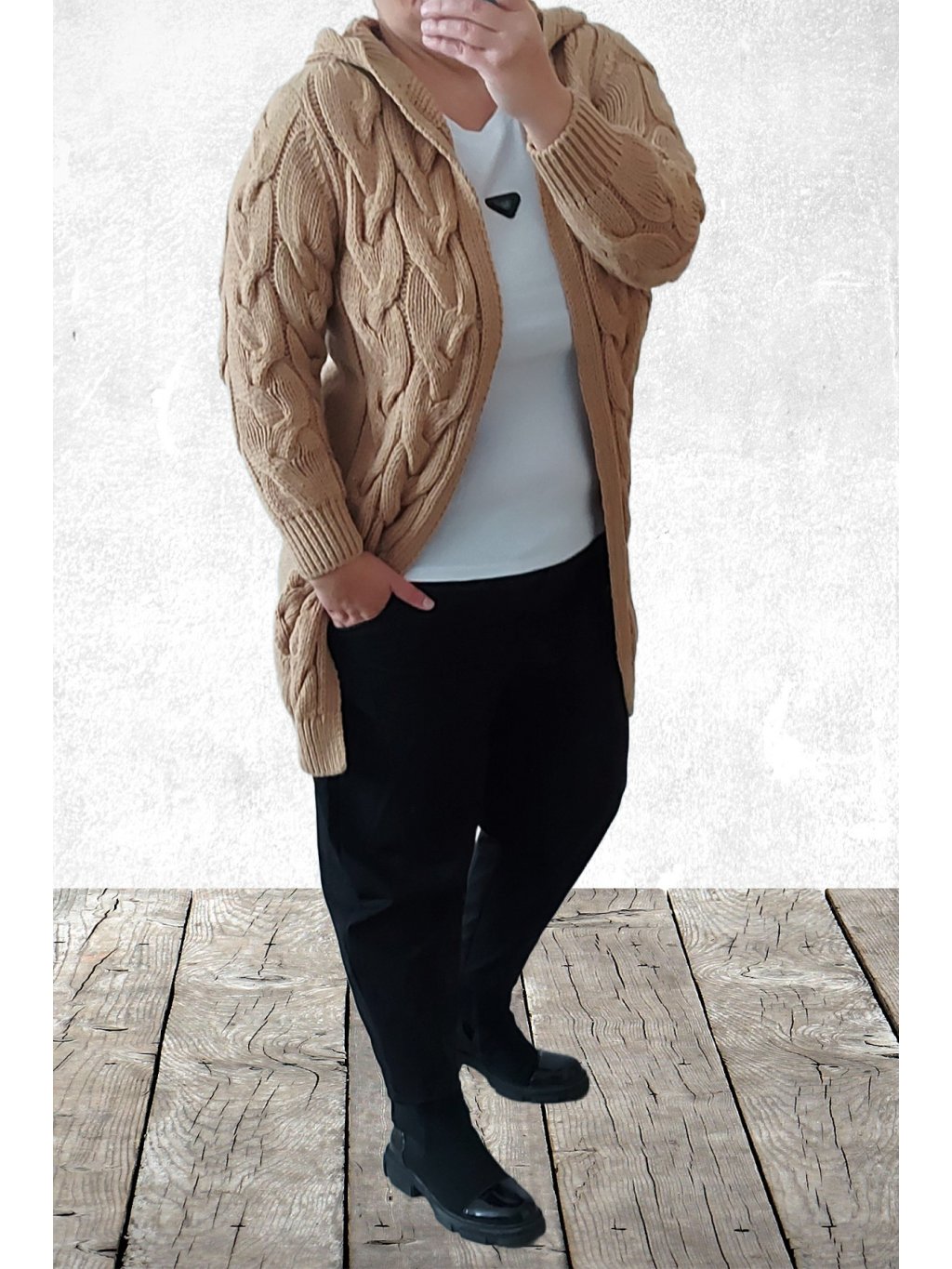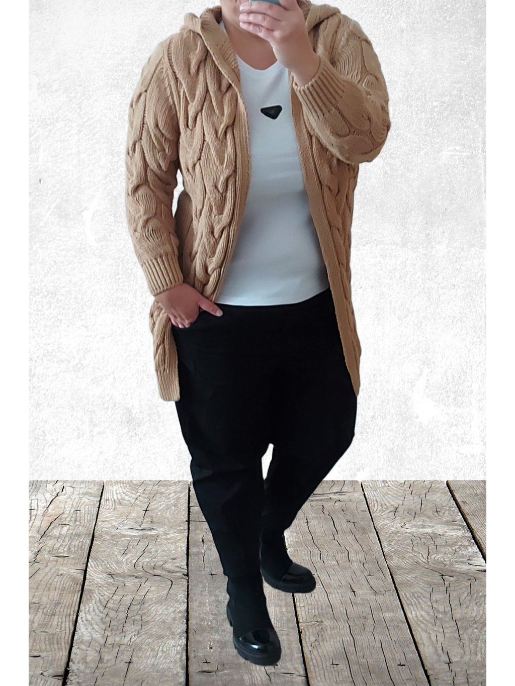 Svetrový kardigan s kapucí. Krásný copánkový pletený vzor. Bez kapes a zapínání. Velmi hřejivý, huňatý a pružný. Foceno na vel. XS, výška 156cm i na vel. 2XL (prsa 116cm, boky 120cm), výška 165cm.
