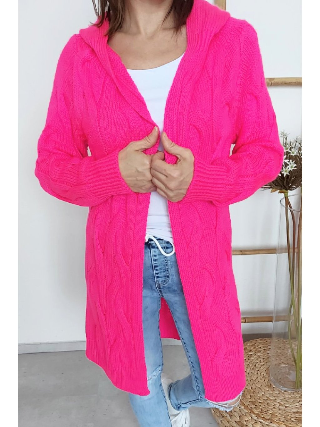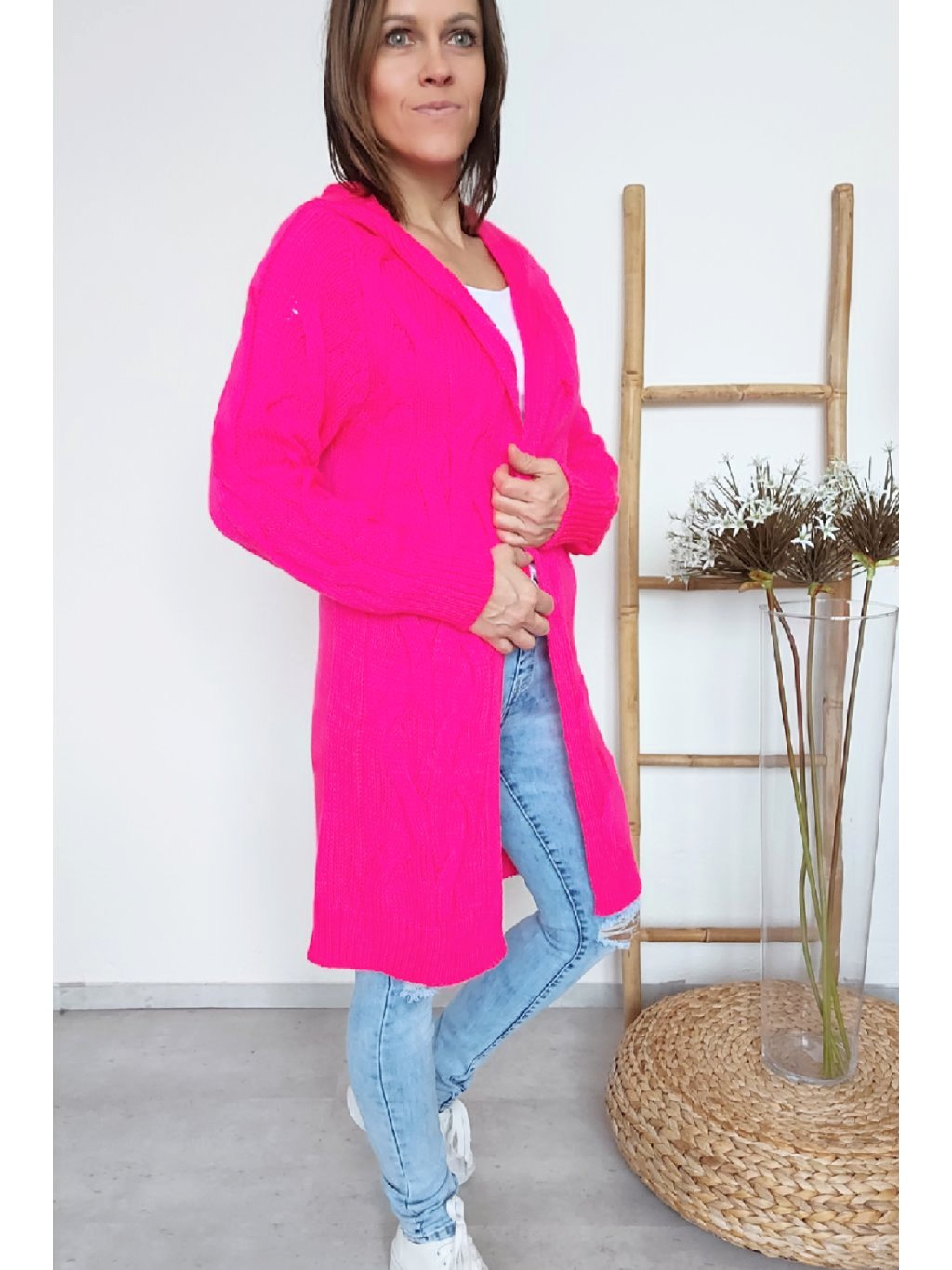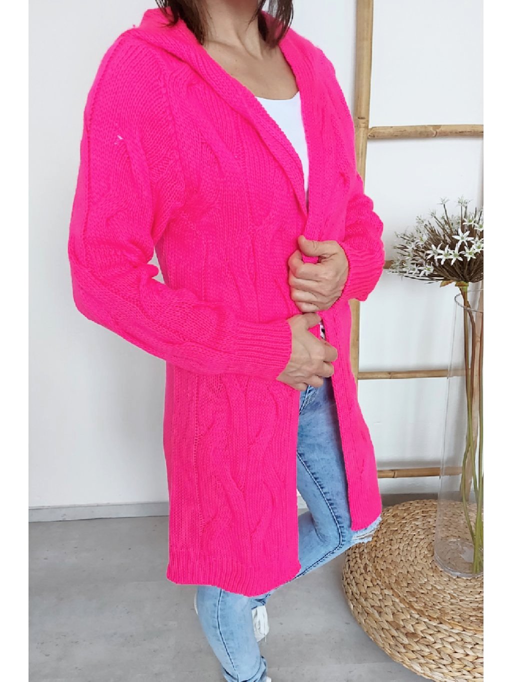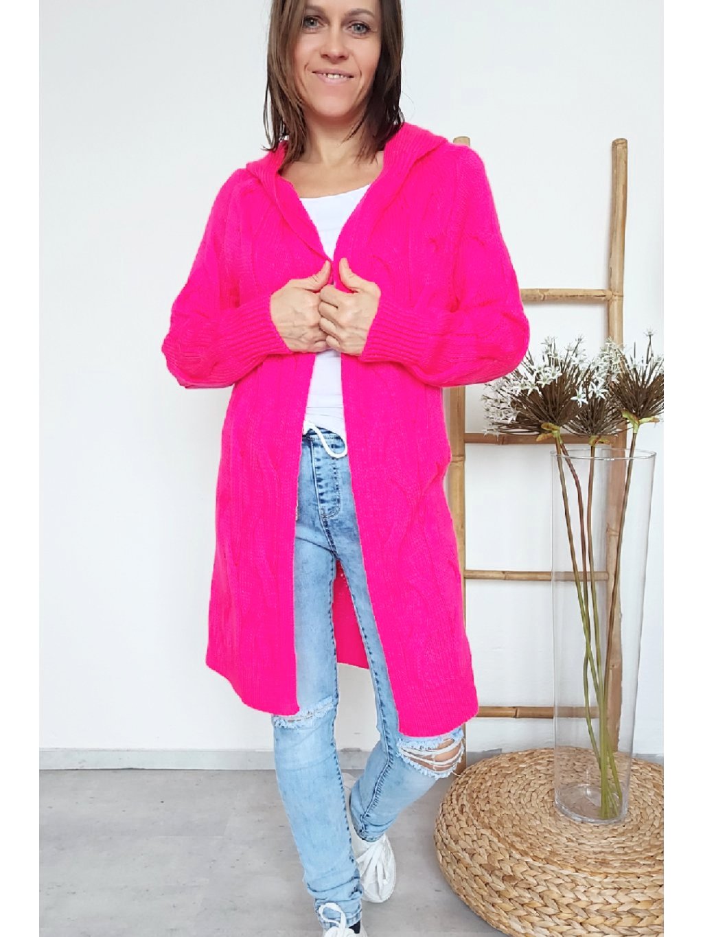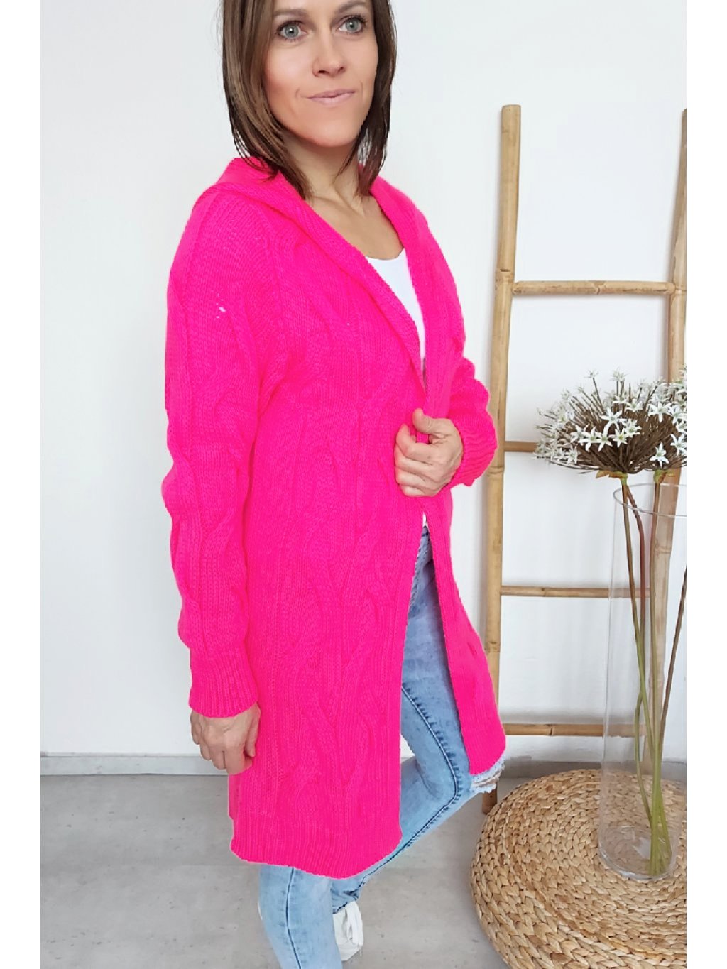 Svetrový kardigan s kapucí. Krásný copánkový pletený vzor. Bez kapes a zapínání. Velmi hřejivý, huňatý a pružný. Foceno na vel. XS, výška 156cm i na vel. 2XL (prsa 116cm, boky 120cm), výška 165cm.