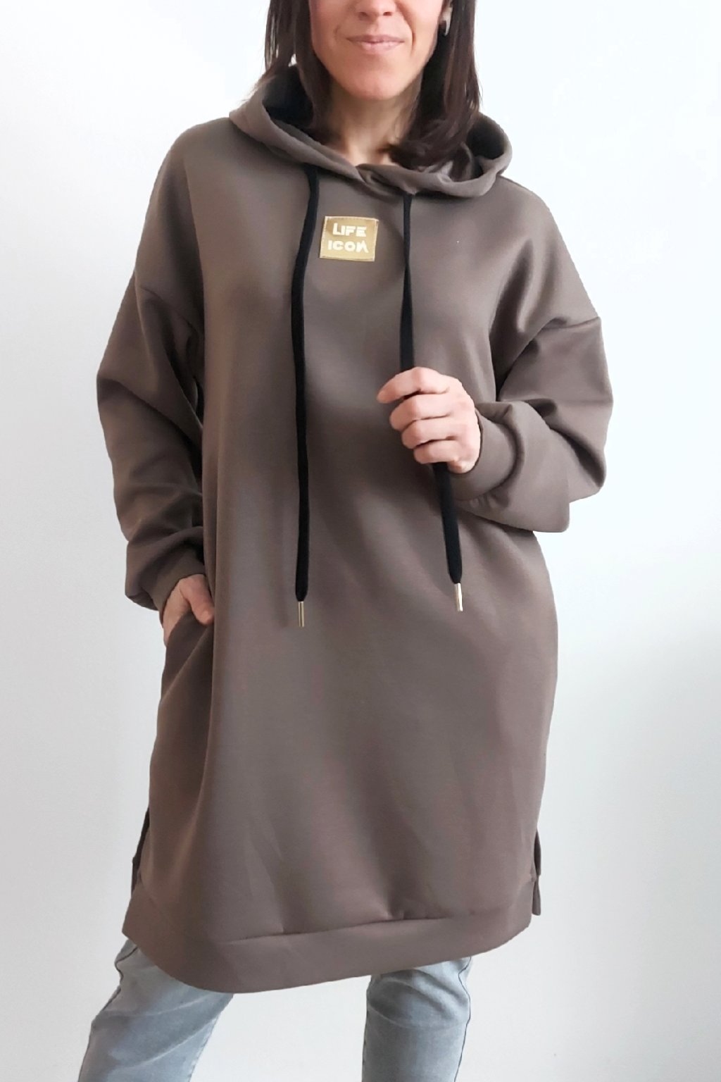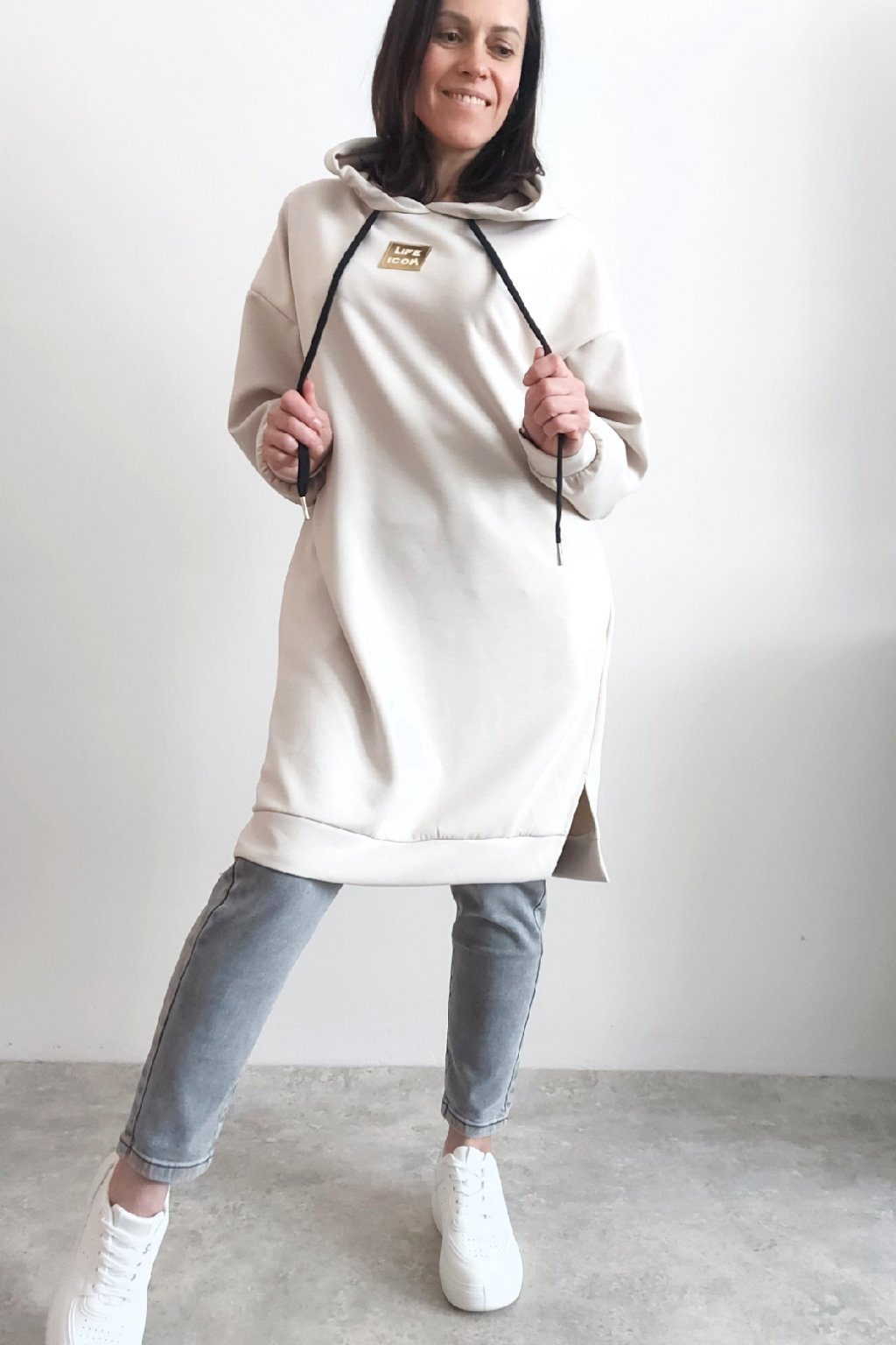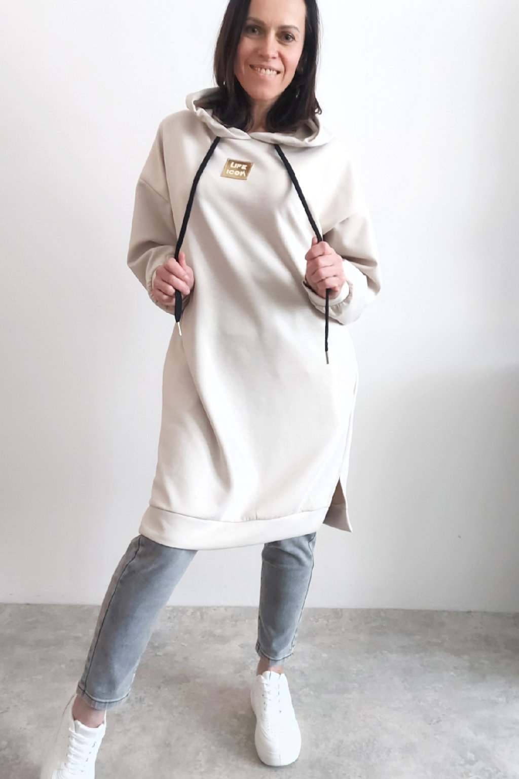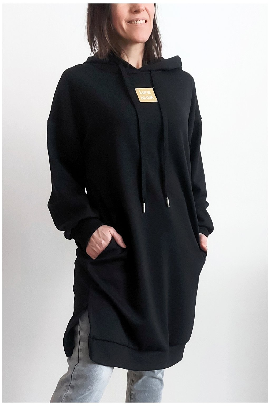 Delší mikina s kapucí. Vpředu je našitá ozdobná - rámeček zlaté barvy s nápisem Life icon. Boční kapsy. Ve spodní části z boku menší rozparky. Materiál máslový - jemný, hebký, klouzavý, nadýchaný a pružný. Skvělý kousek, který lze využít i jako mikinové šaty. Není zateplená, vhodná na jaro a podzim. Foceno na vel. XS, výška 156cm.