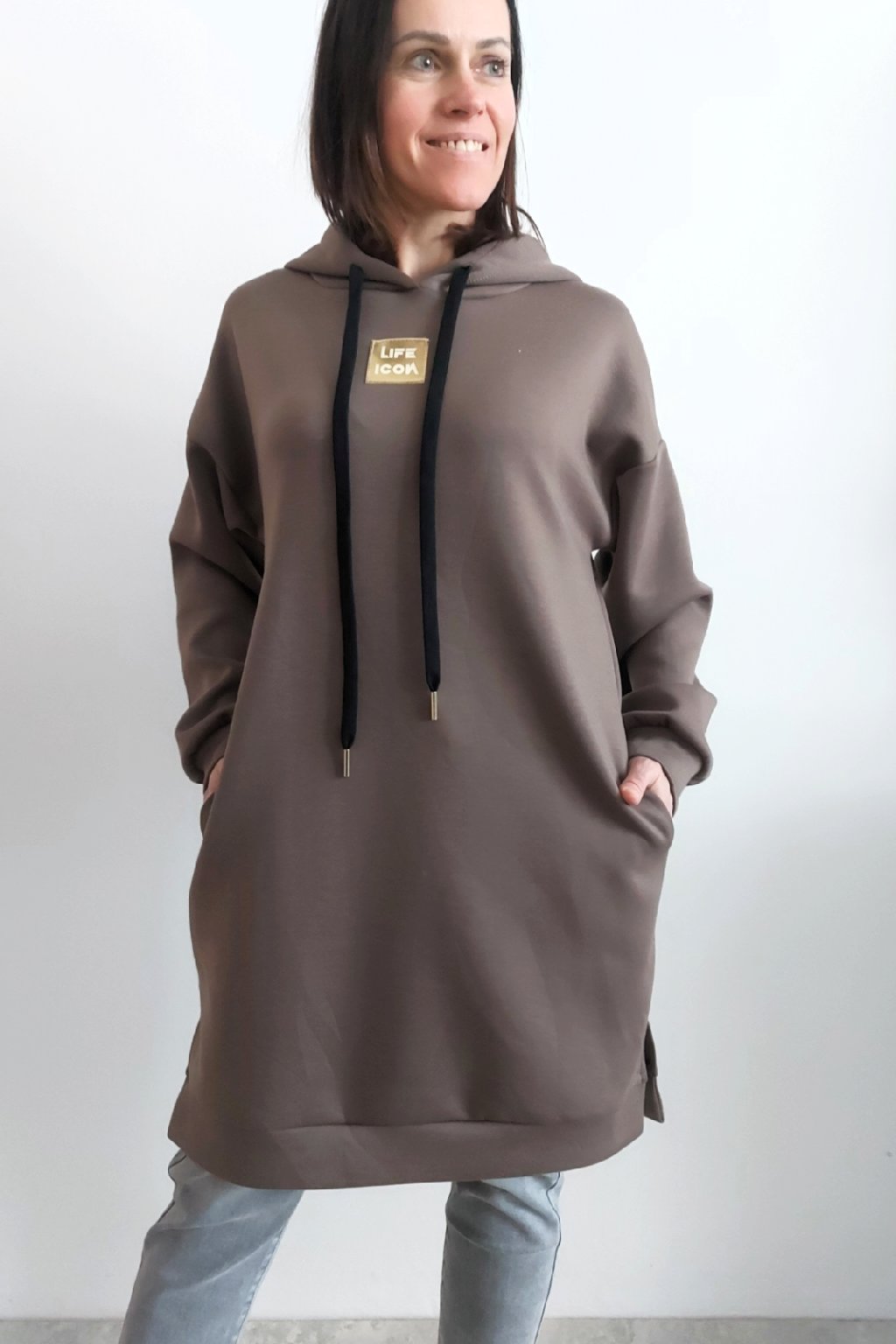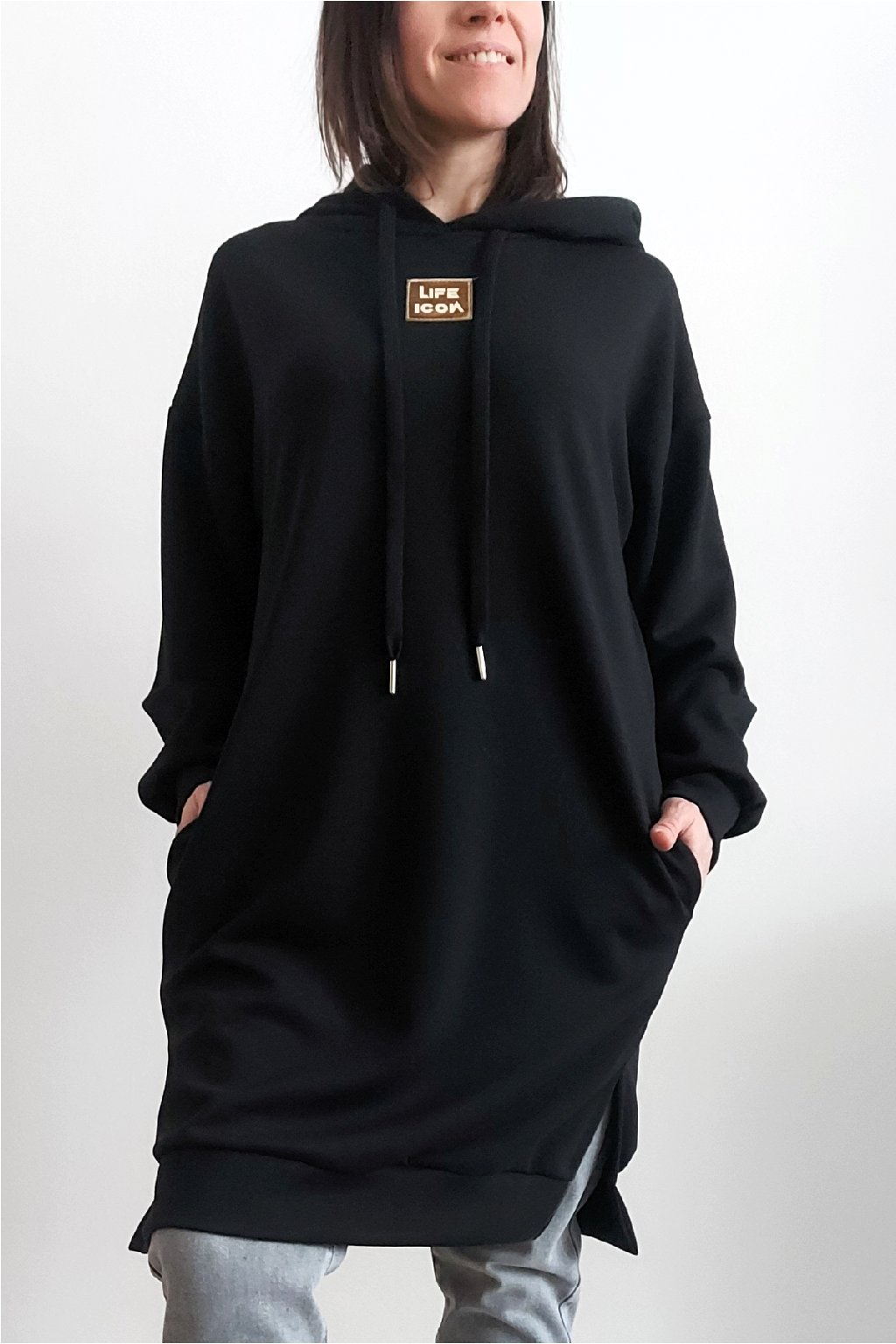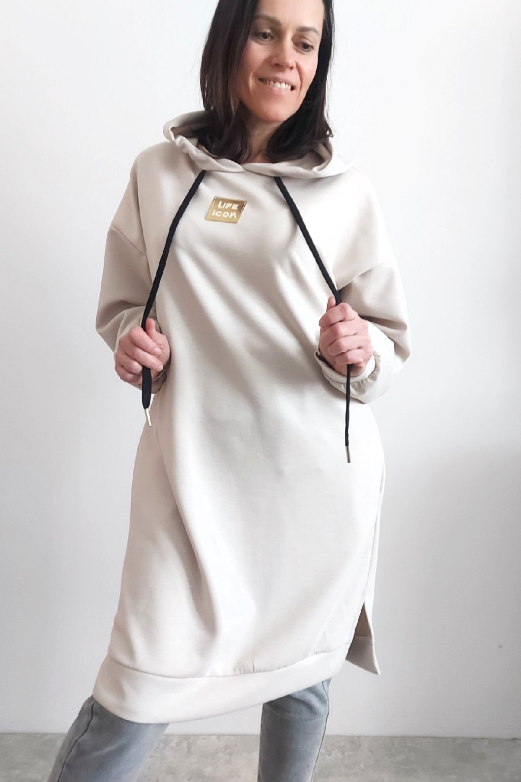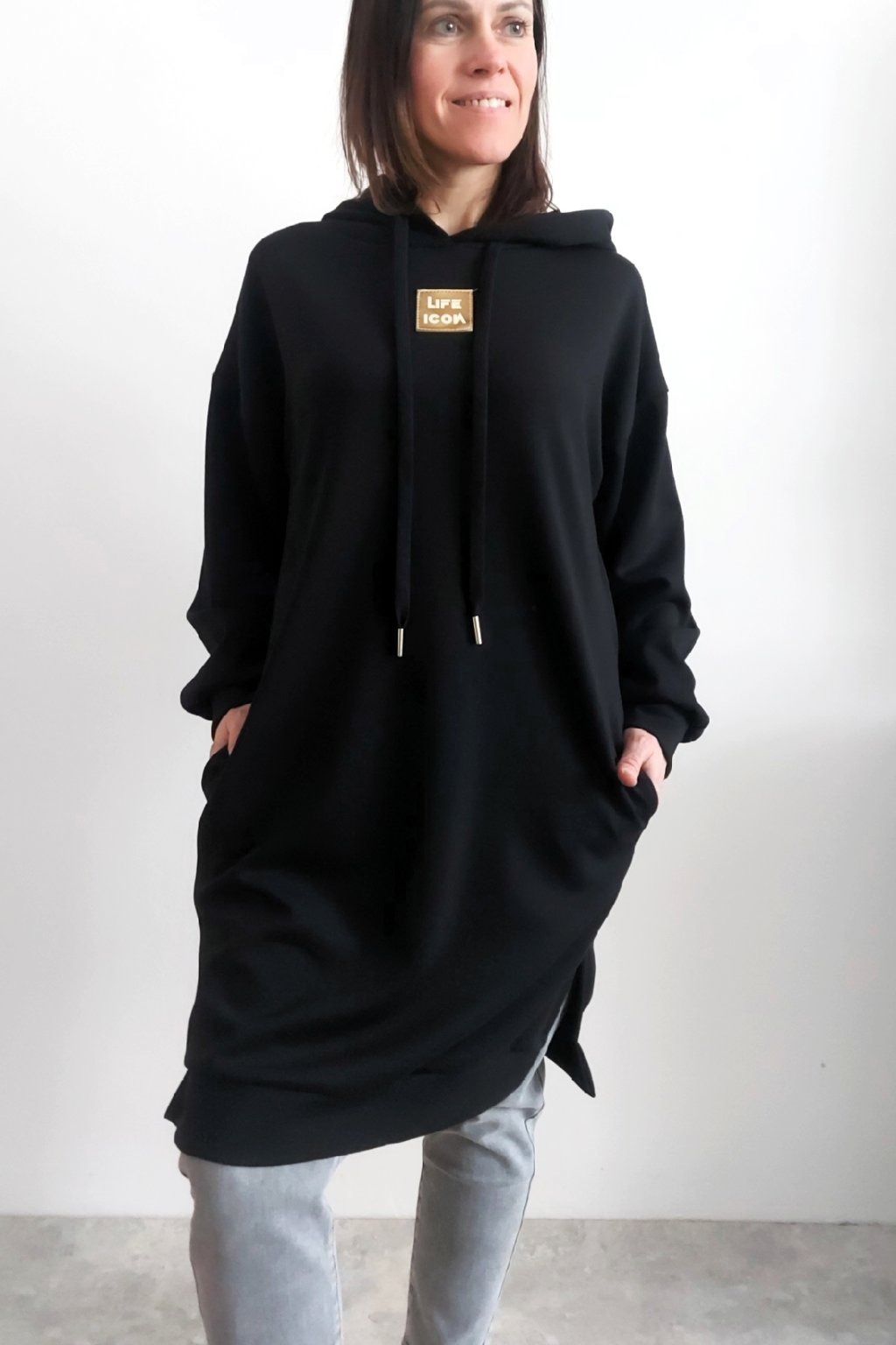 Delší mikina s kapucí. Vpředu je našitá ozdobná - rámeček zlaté barvy s nápisem Life icon. Boční kapsy. Ve spodní části z boku menší rozparky. Materiál máslový - jemný, hebký, klouzavý, nadýchaný a pružný. Skvělý kousek, který lze využít i jako mikinové šaty. Není zateplená, vhodná na jaro a podzim. Foceno na vel. XS, výška 156cm.