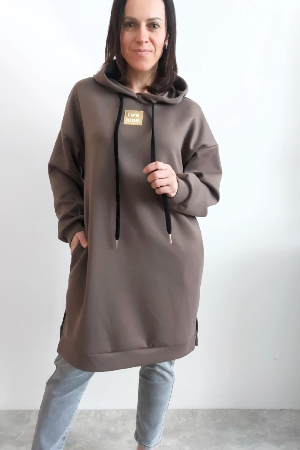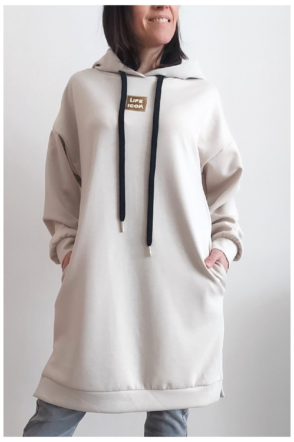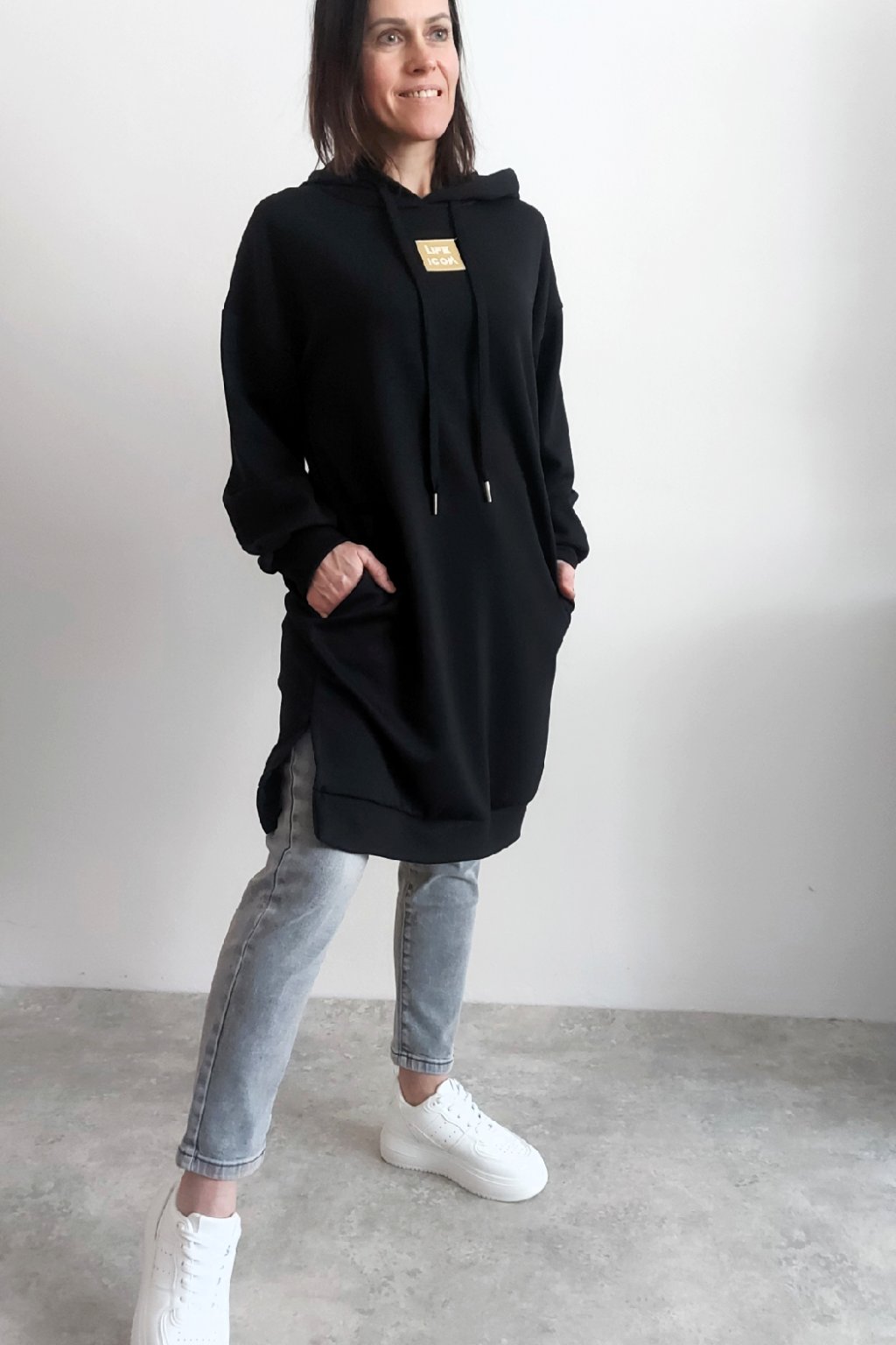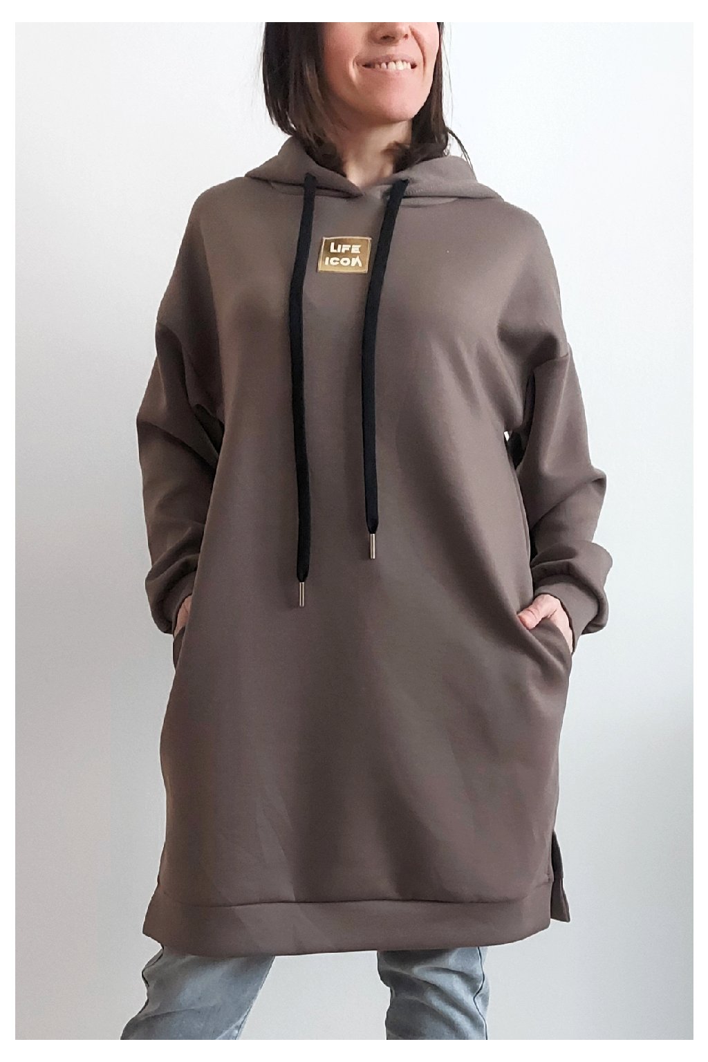 Delší mikina s kapucí. Vpředu je našitá ozdobná - rámeček zlaté barvy s nápisem Life icon. Boční kapsy. Ve spodní části z boku menší rozparky. Materiál máslový - jemný, hebký, klouzavý, nadýchaný a pružný. Skvělý kousek, který lze využít i jako mikinové šaty. Není zateplená, vhodná na jaro a podzim. Foceno na vel. XS, výška 156cm.