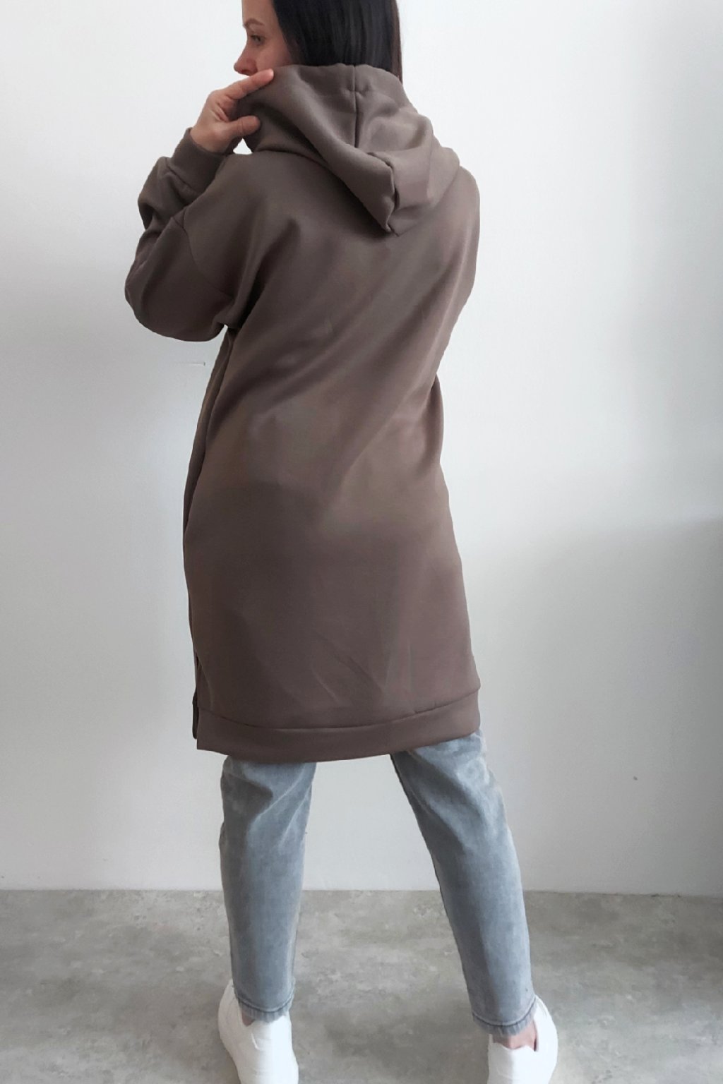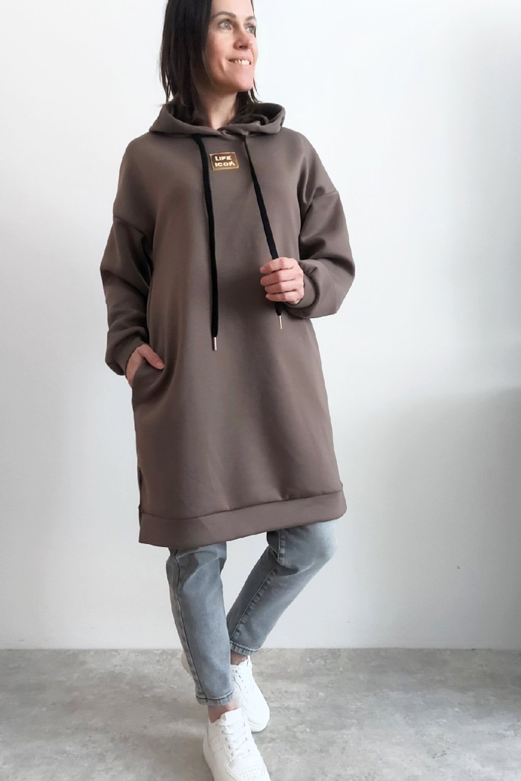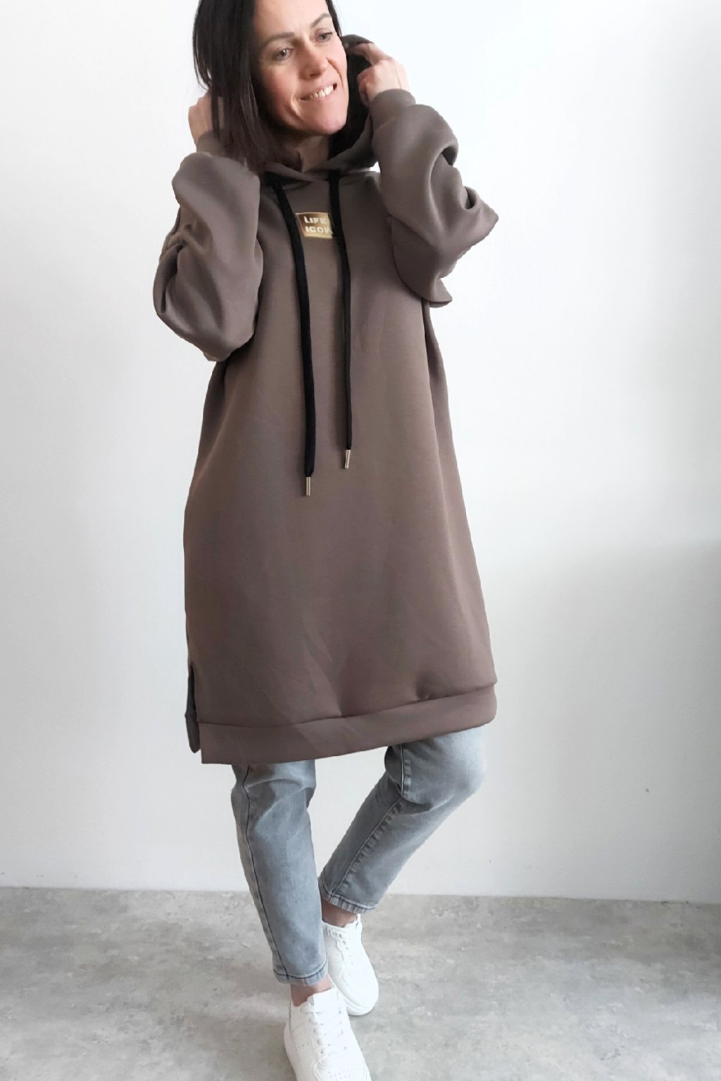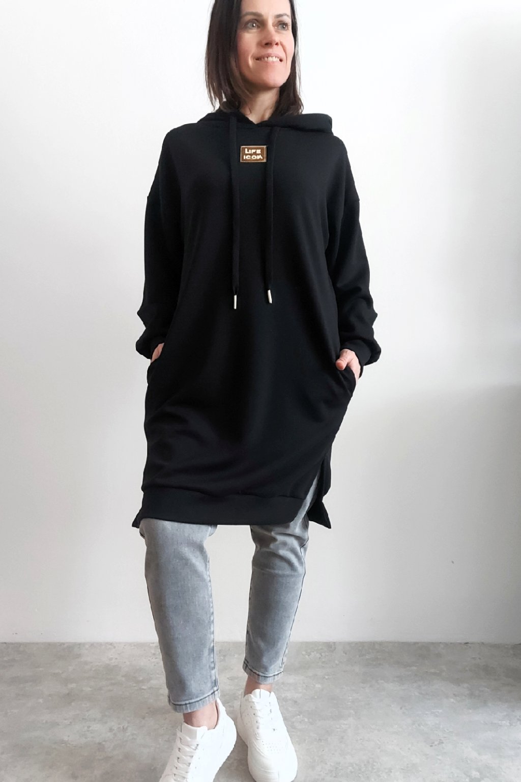 Delší mikina s kapucí. Vpředu je našitá ozdobná - rámeček zlaté barvy s nápisem Life icon. Boční kapsy. Ve spodní části z boku menší rozparky. Materiál máslový - jemný, hebký, klouzavý, nadýchaný a pružný. Skvělý kousek, který lze využít i jako mikinové šaty. Není zateplená, vhodná na jaro a podzim. Foceno na vel. XS, výška 156cm.