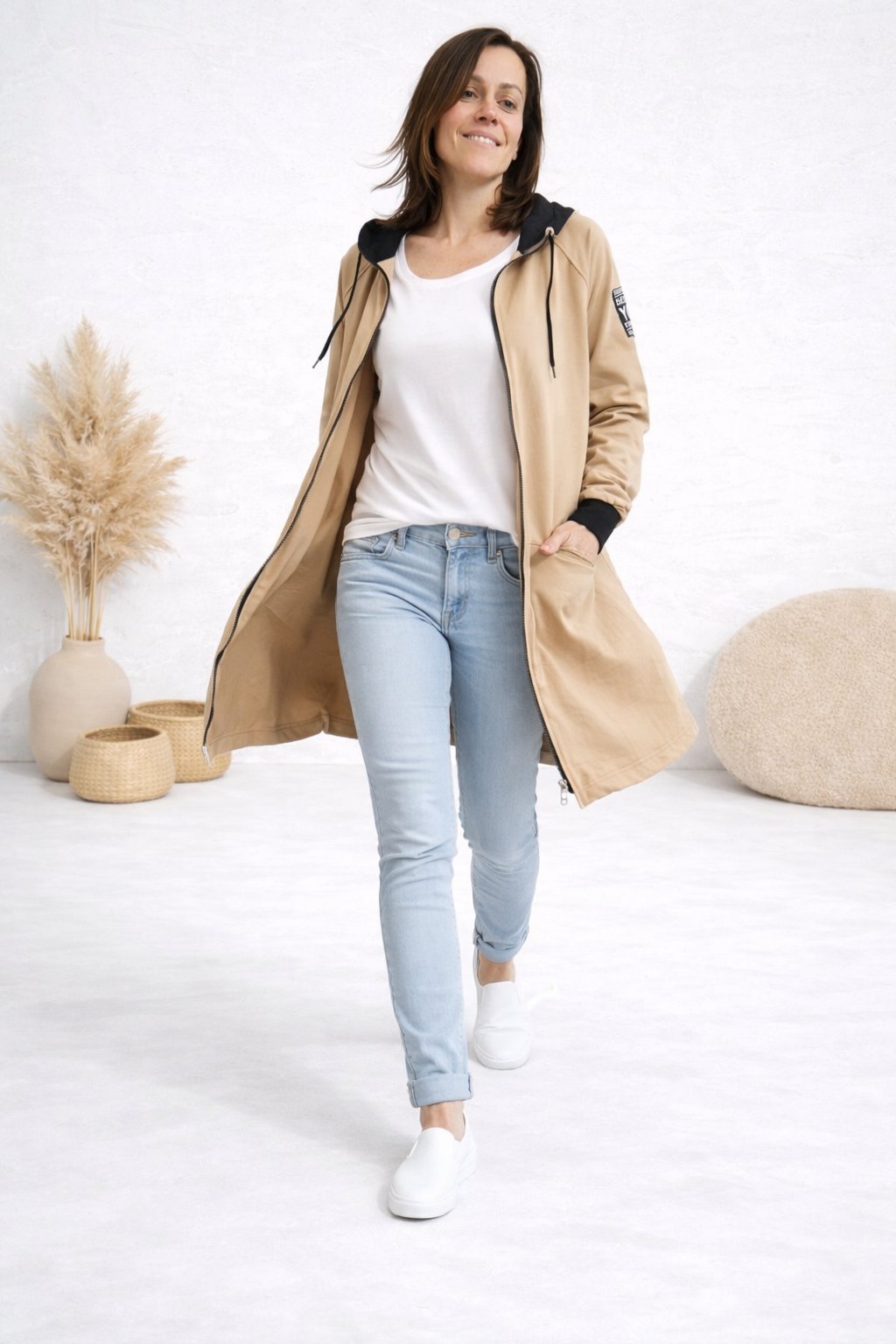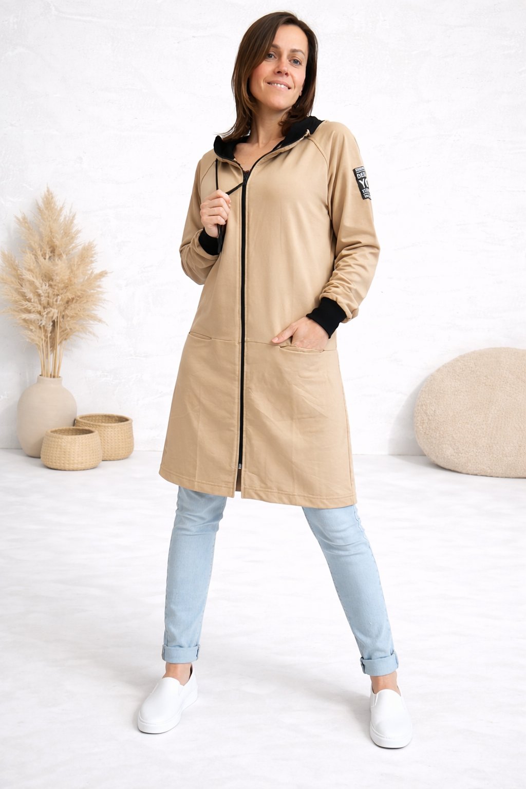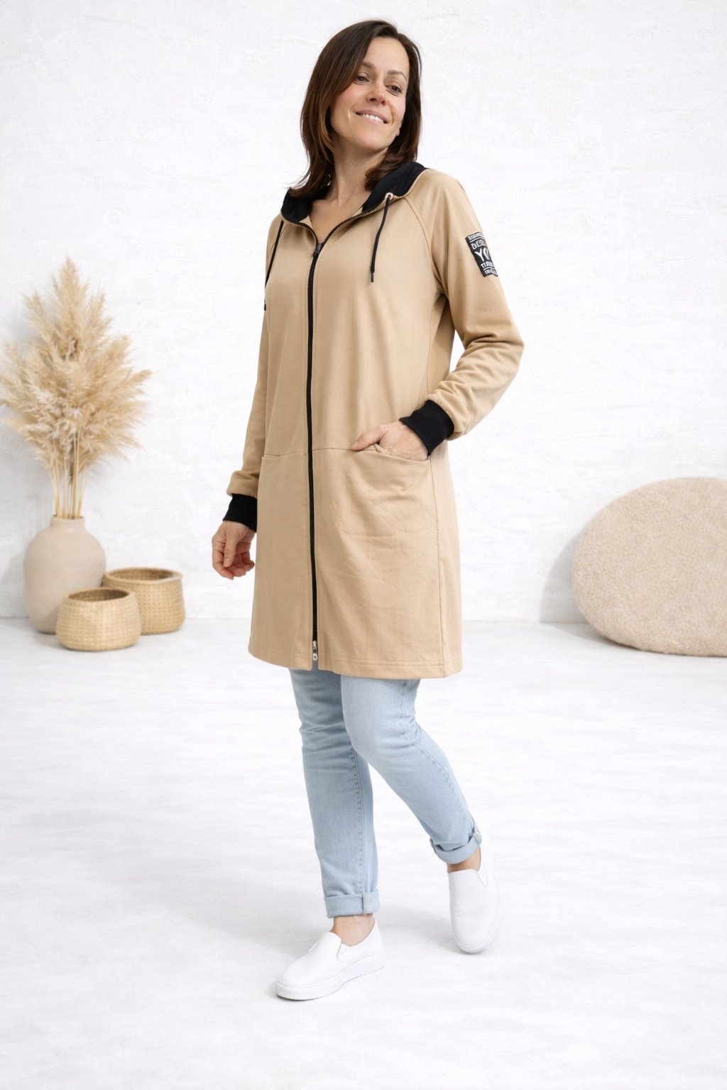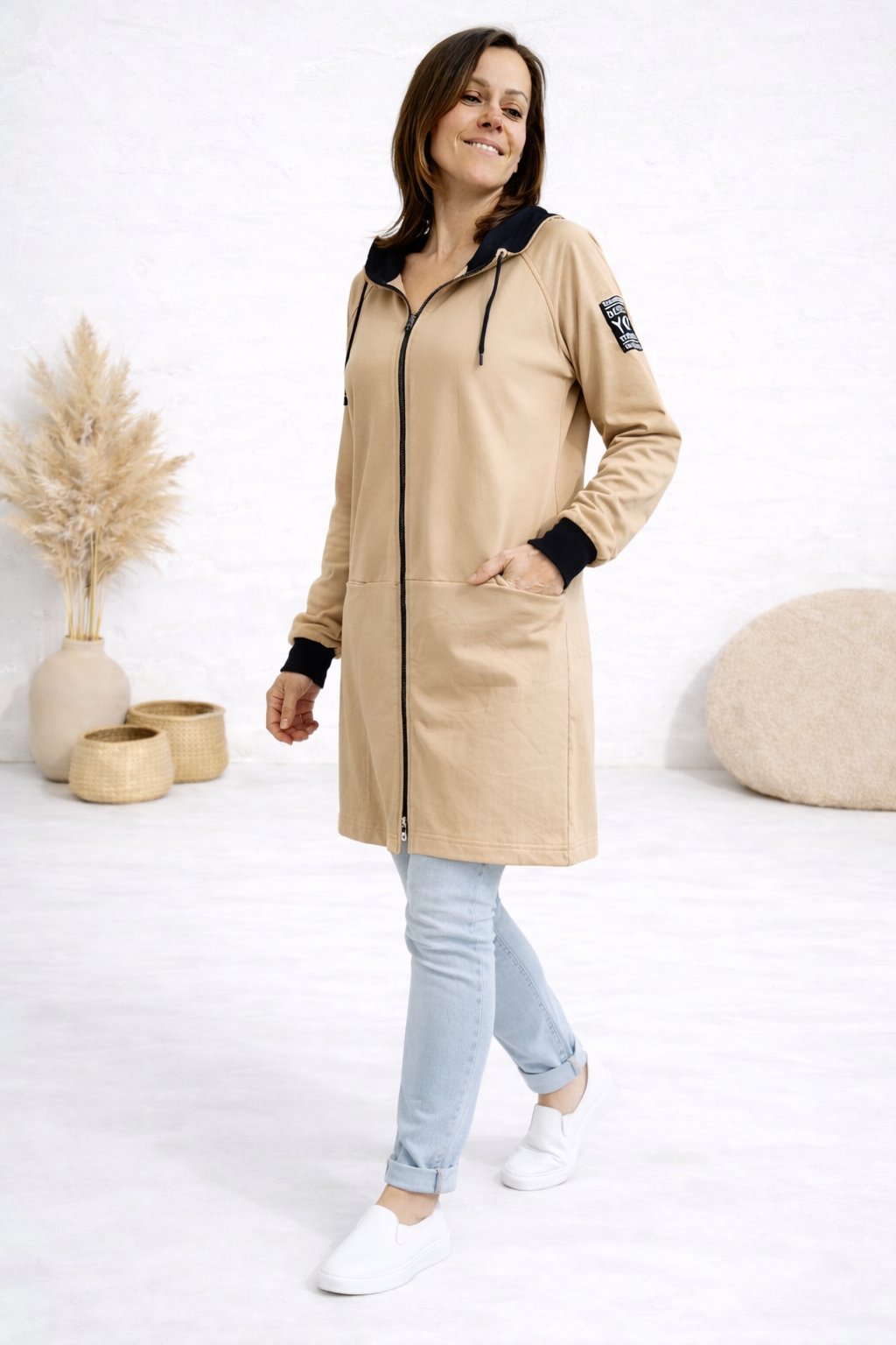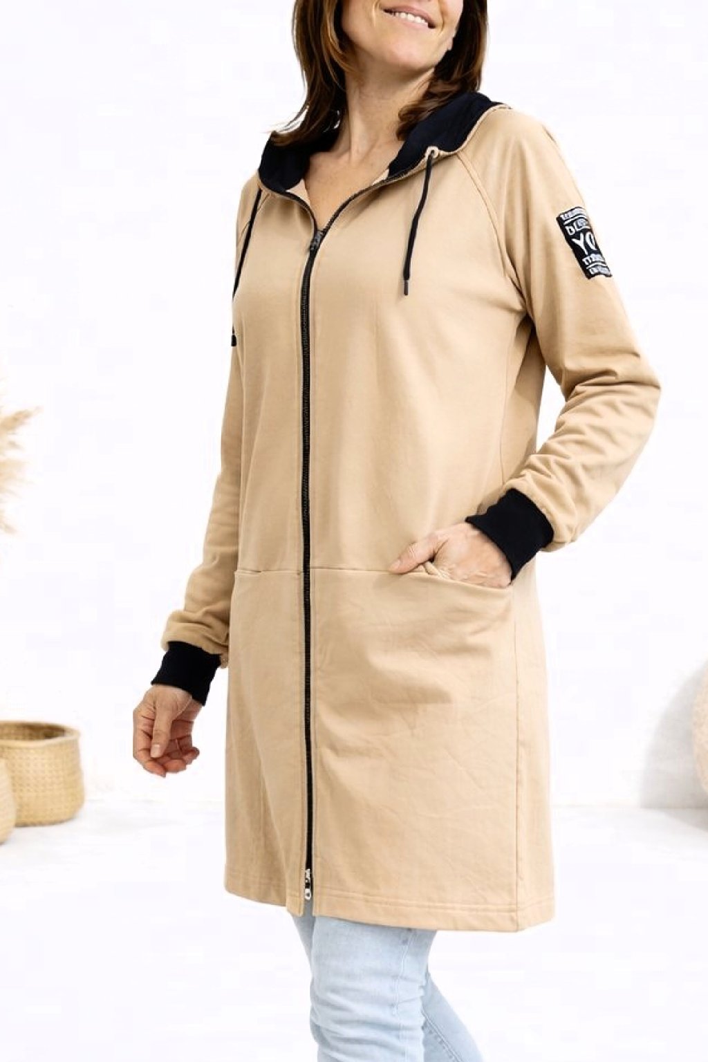 Delší mikinový kabát na zip s kapucí. Rukávy jsou ukončené černými úplety. Vpředu jsou kapsy. Skvělý střih lichotící postavě. Ozdobná nášivka na jednom z rukávů. Nezateplený. Super příjemný a kvalitní bavlněný materiál. Foceno na vel. XS, výška 156cm i na vel. 2XL/3XL (prsa 116cm, boky 120cm), výška 165cm - na těchto mírách již mírně obeplejší.