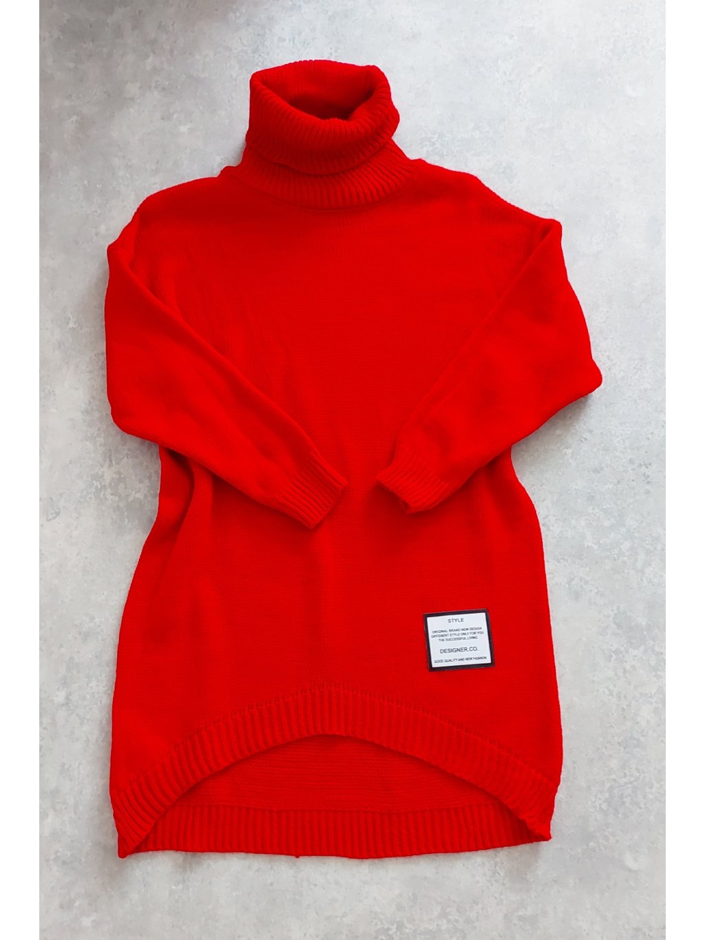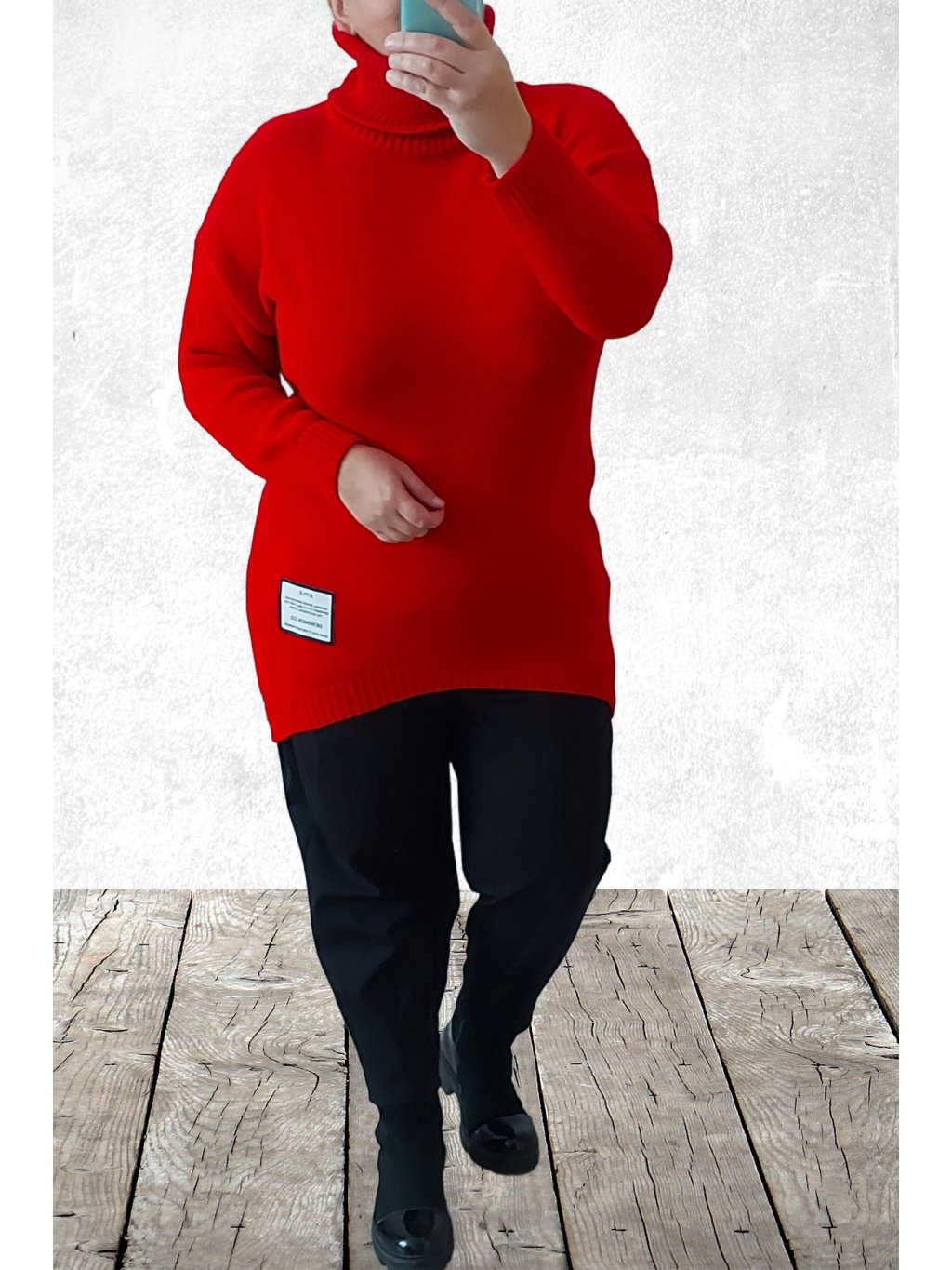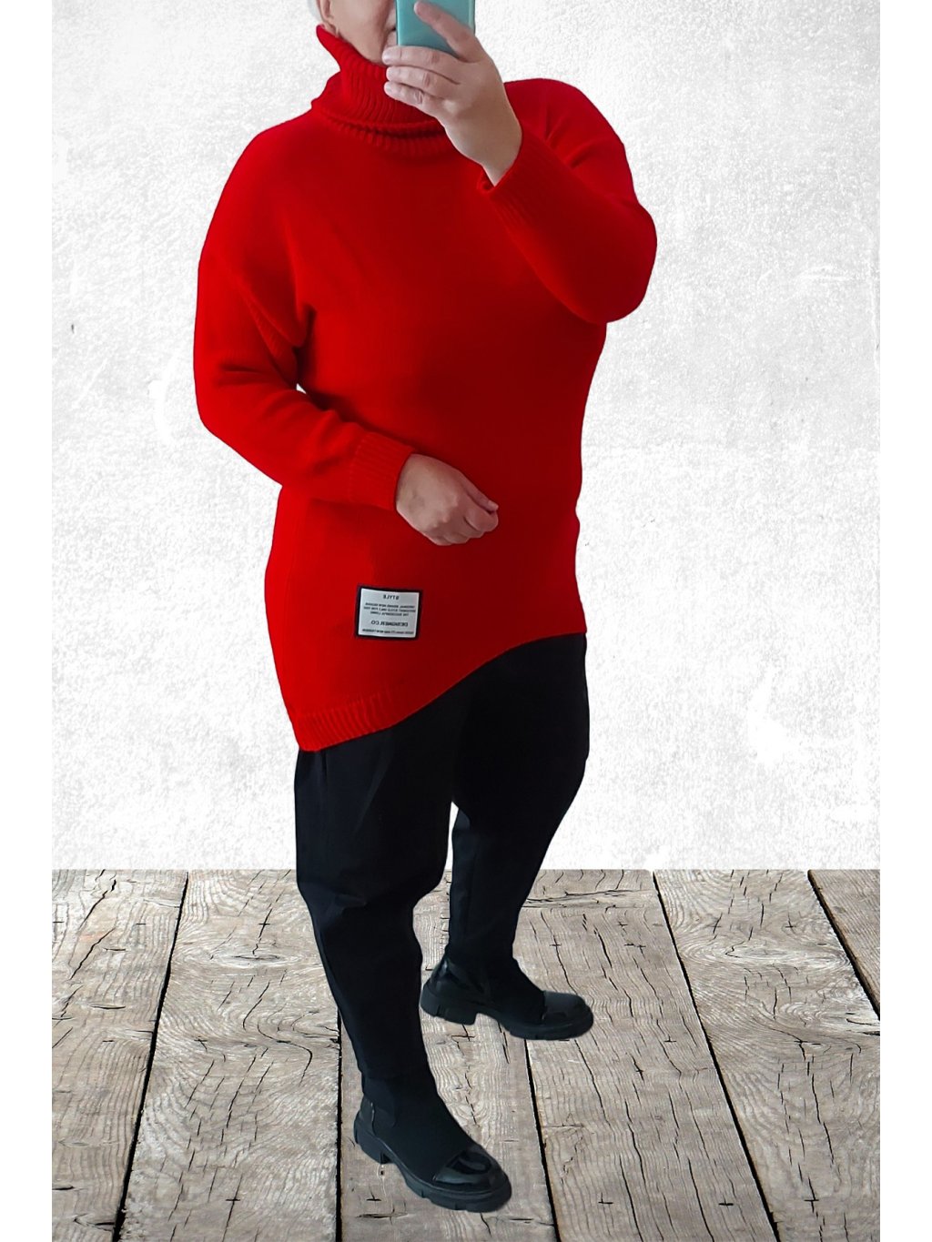 Delší svetr s rolákem. Vpředu kratší - vykrojený a na jedné straně je ozdobná nášivka, ta je jiná v závislosti na dodávce. Zadní strana je delší, rukávy jsou dlouhé. Materiál přizůsobivý-pružný. U menších velikostí je svetr volnější. Foceno na vel. XS/S, výška 156cm i na vel. 46/48, výška 168cm.