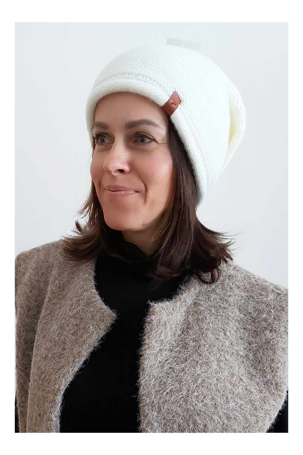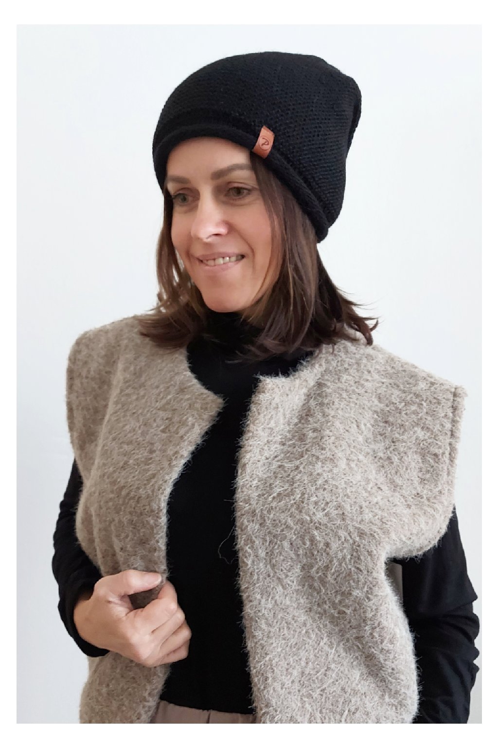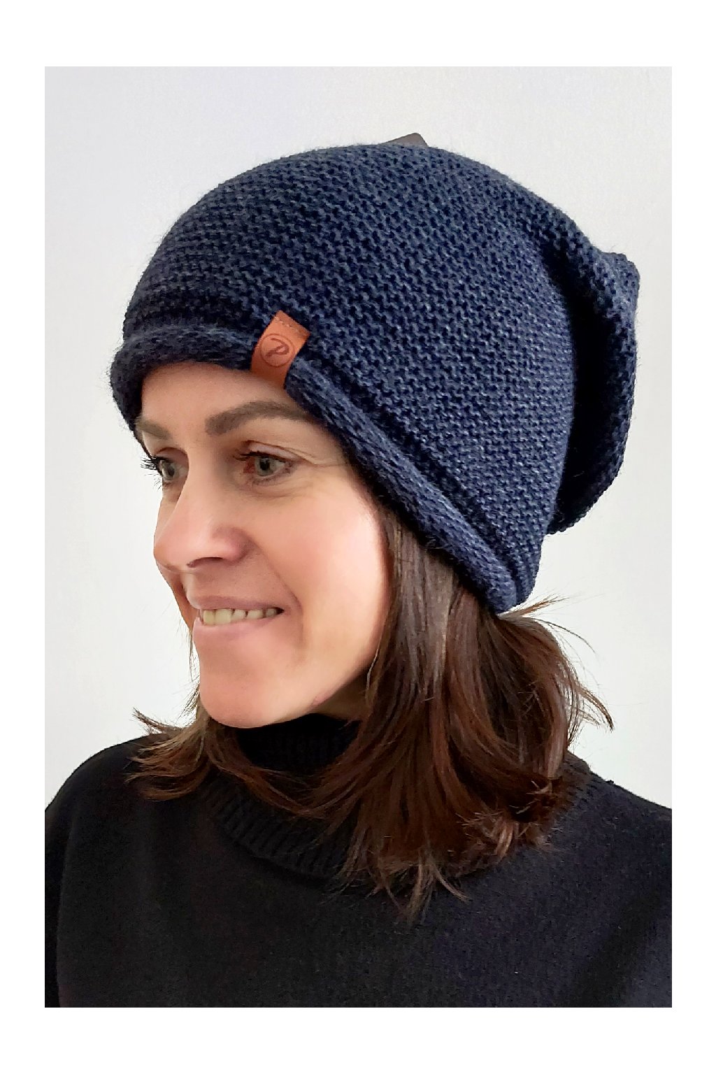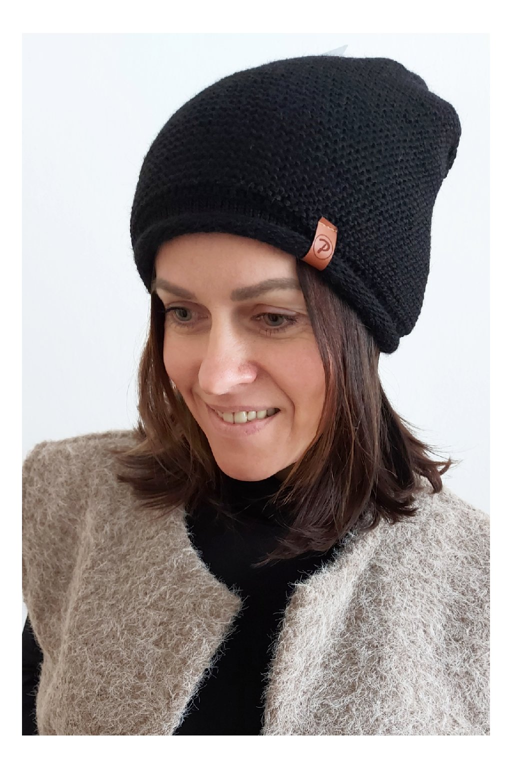 Zimní pletená čepice. Vzadu sešitá. Vpředu ozdobná nášivka. Není podšitá.