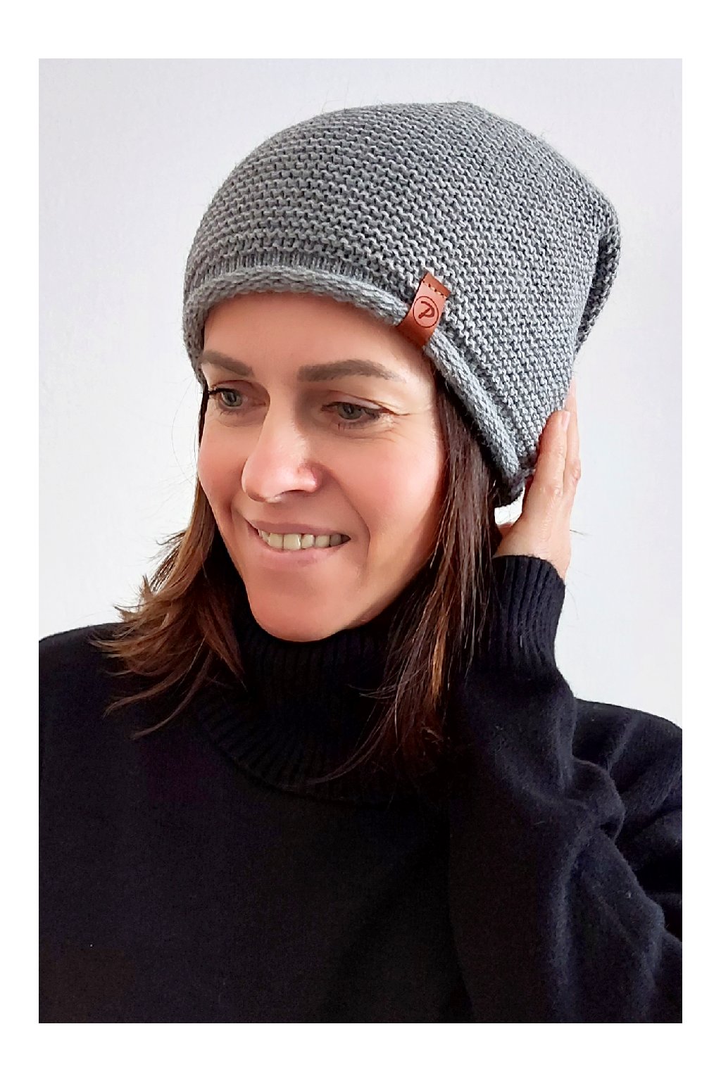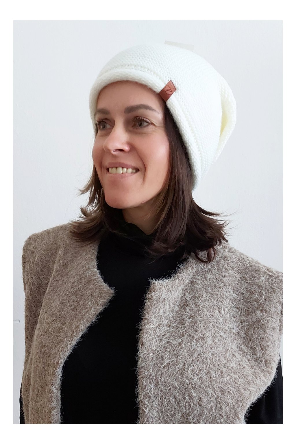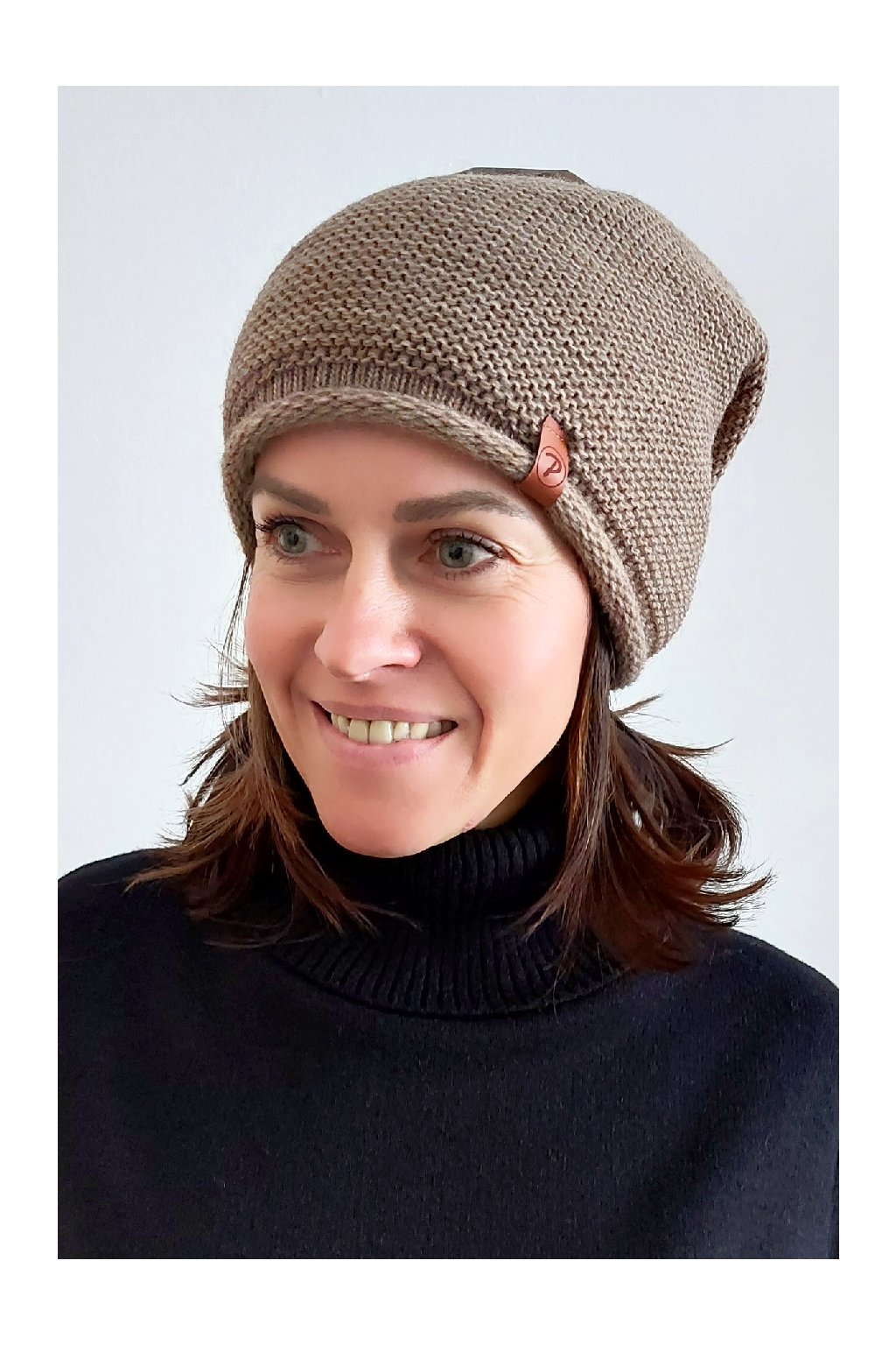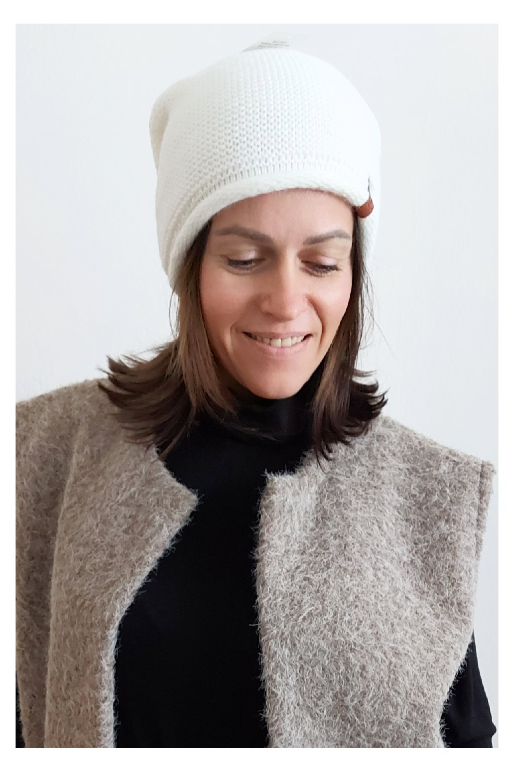 Zimní pletená čepice. Vzadu sešitá. Vpředu ozdobná nášivka. Není podšitá.