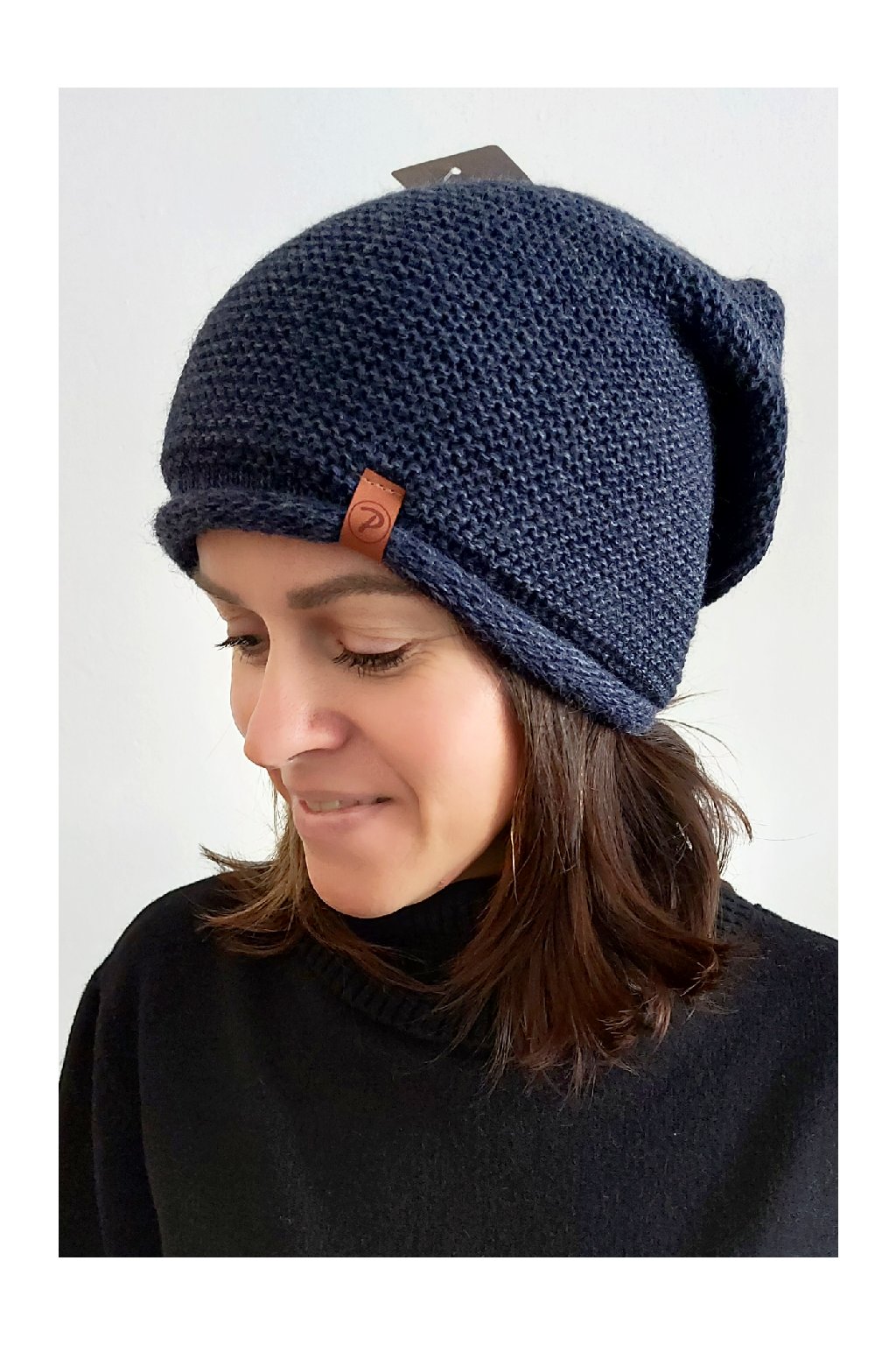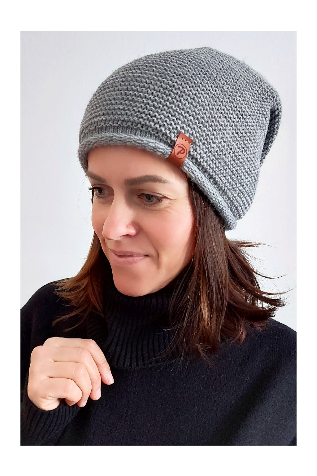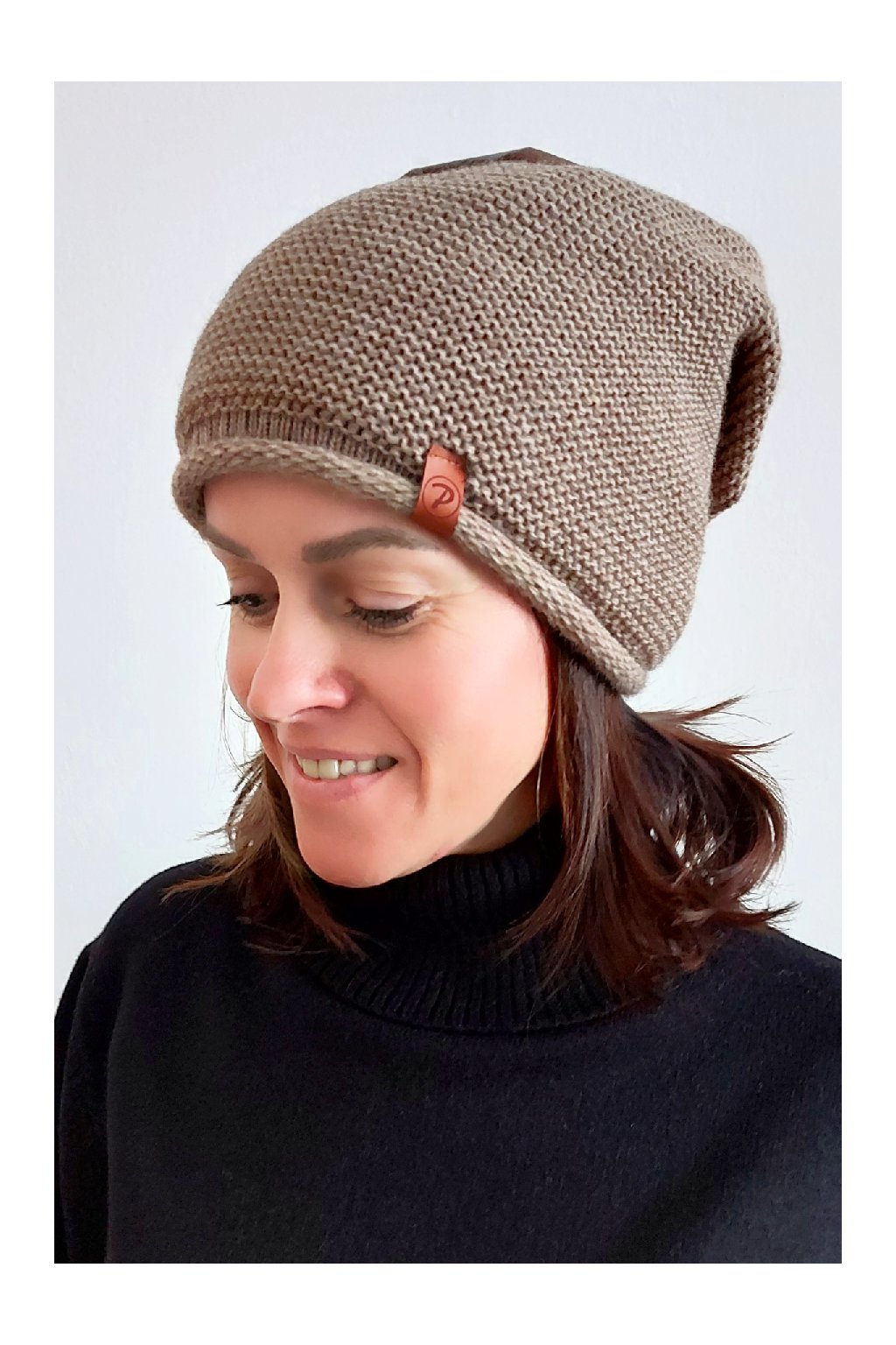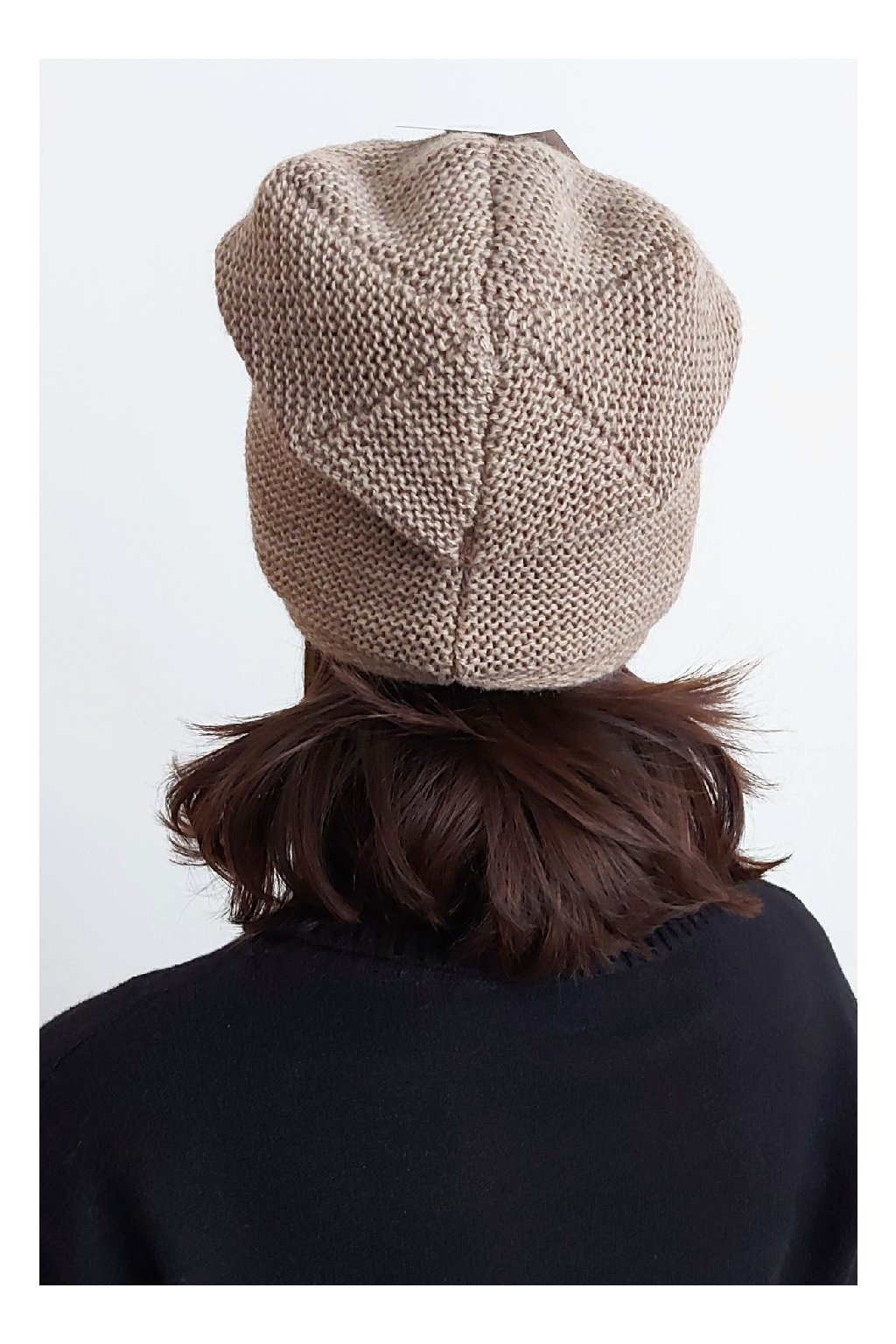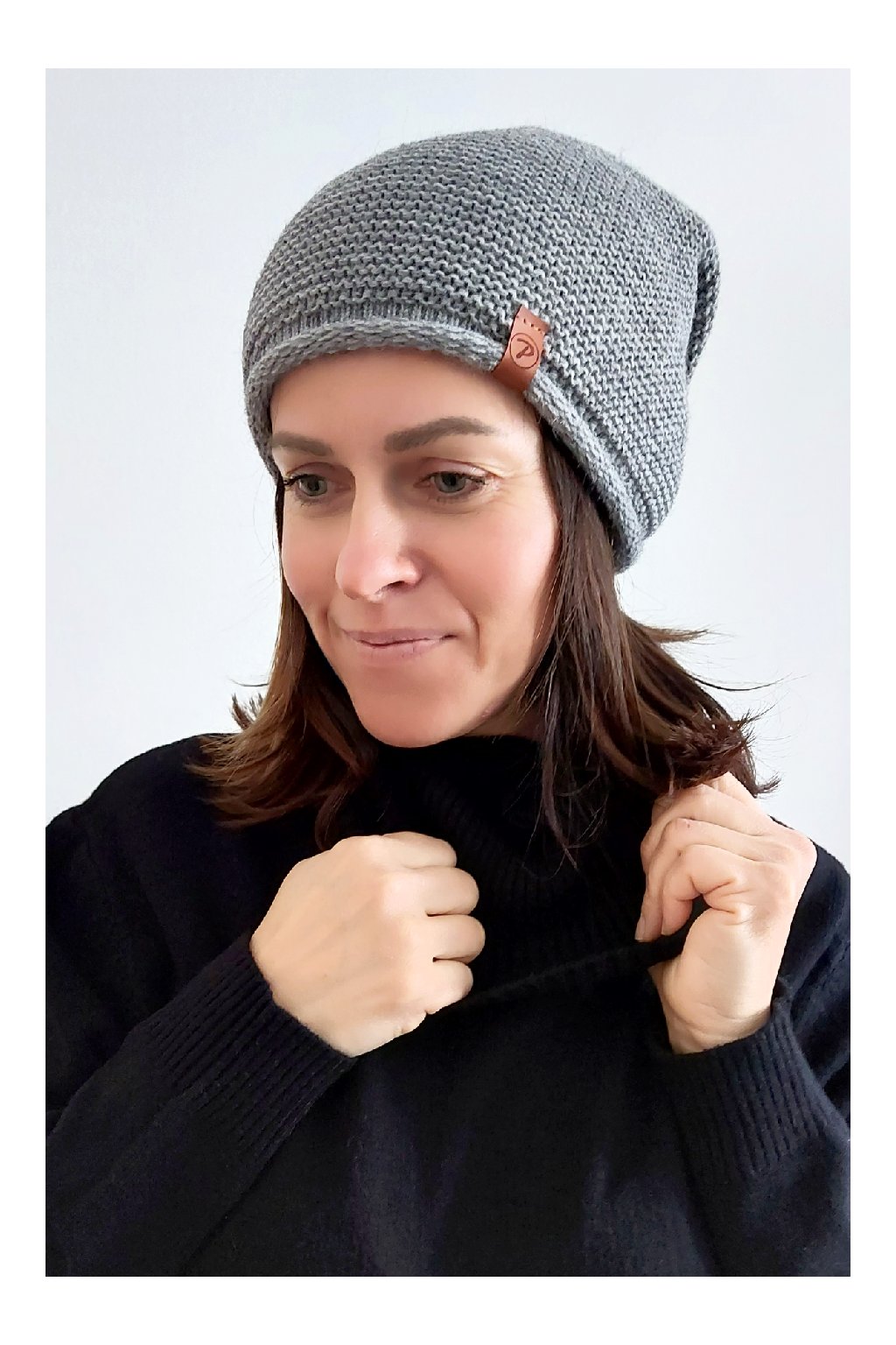 Zimní pletená čepice. Vzadu sešitá. Vpředu ozdobná nášivka. Není podšitá.