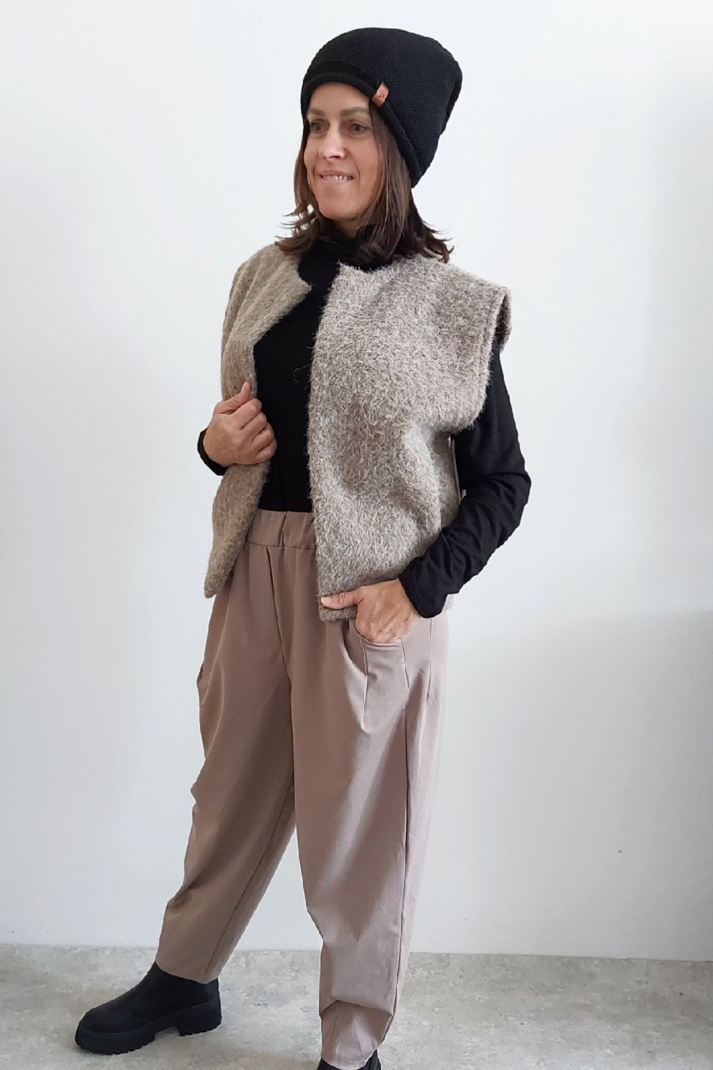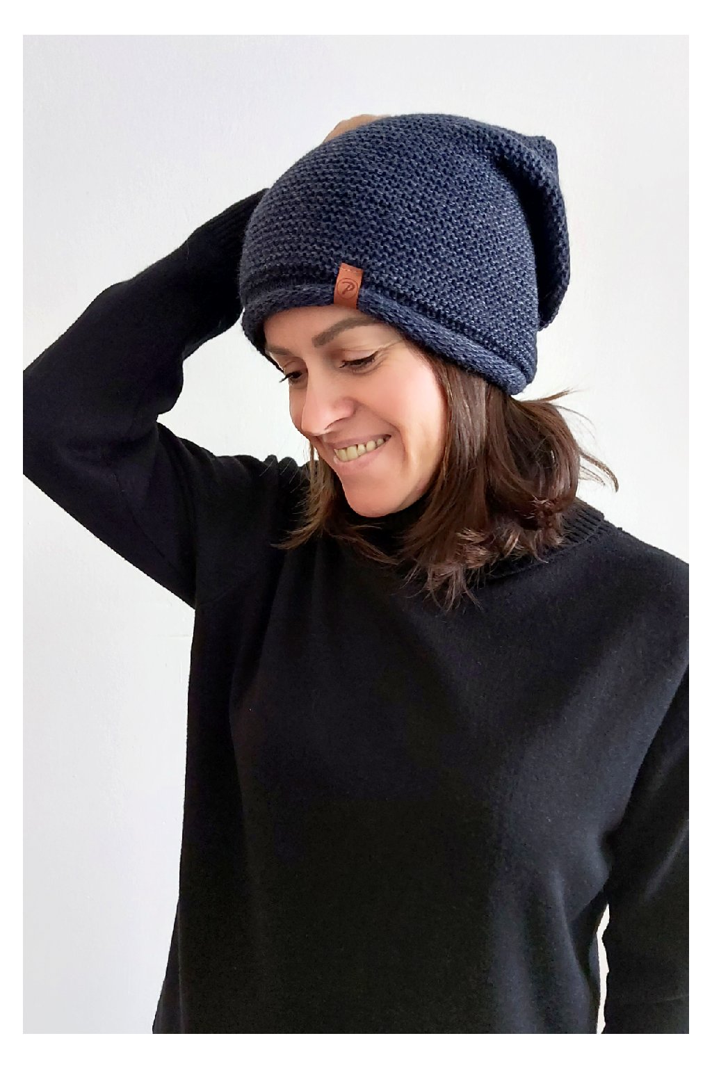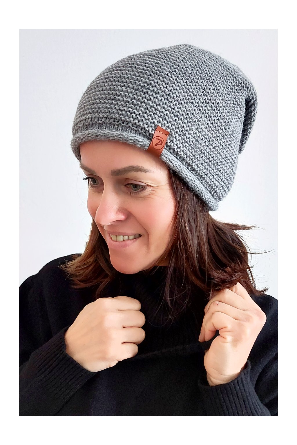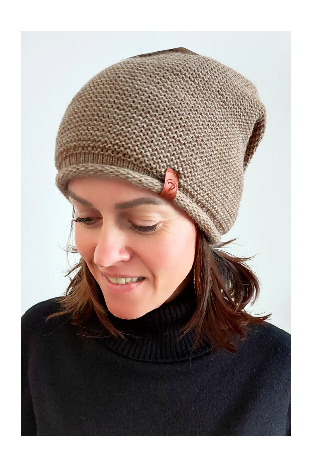 Zimní pletená čepice. Vzadu sešitá. Vpředu ozdobná nášivka. Není podšitá.
