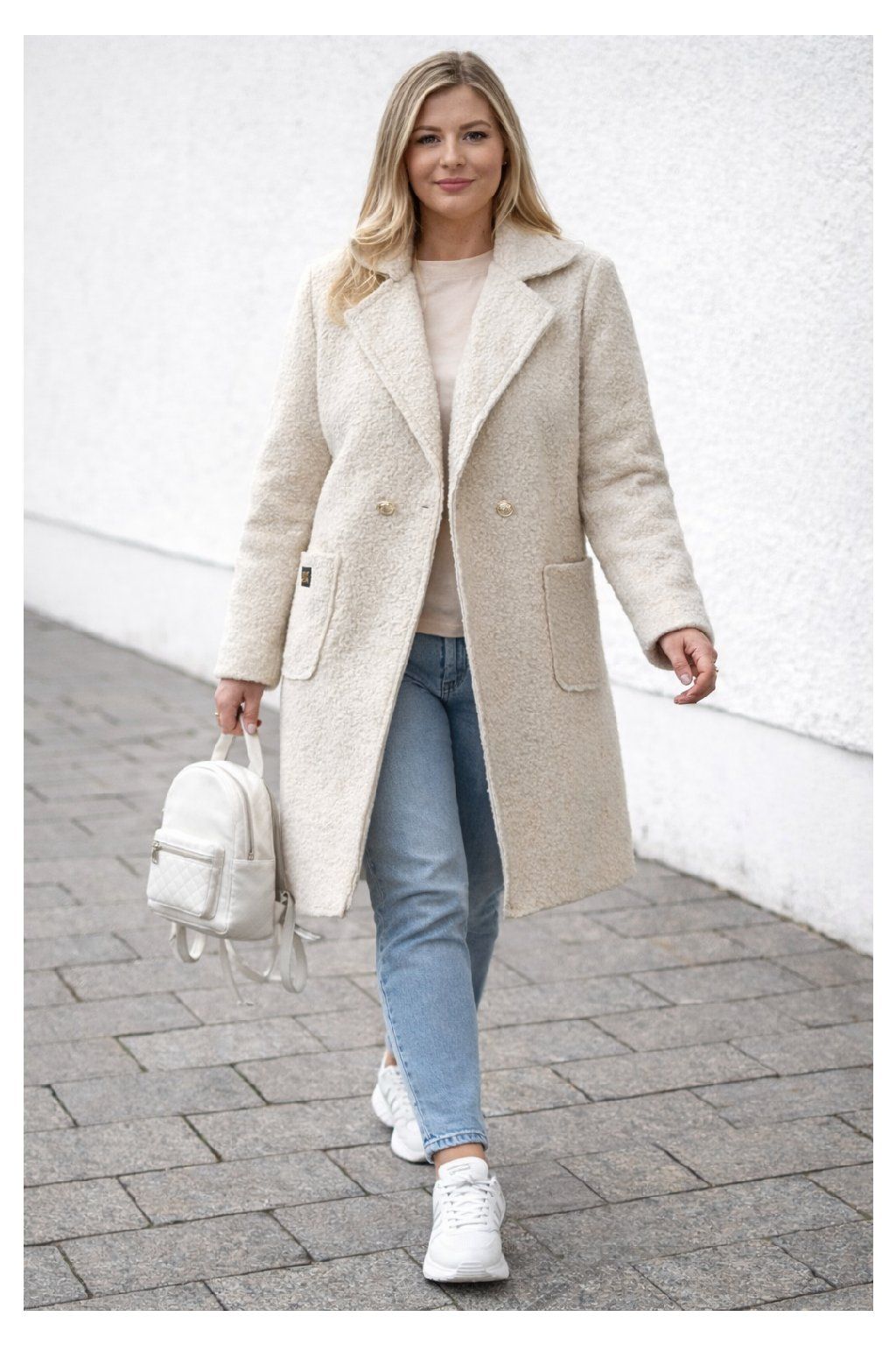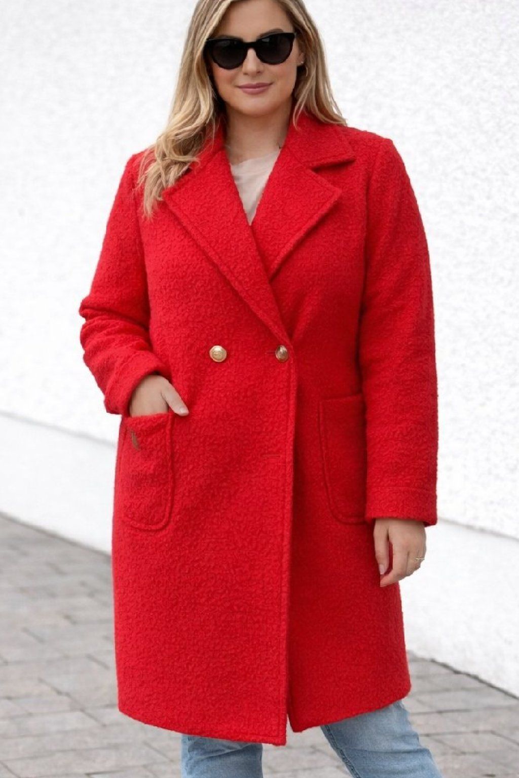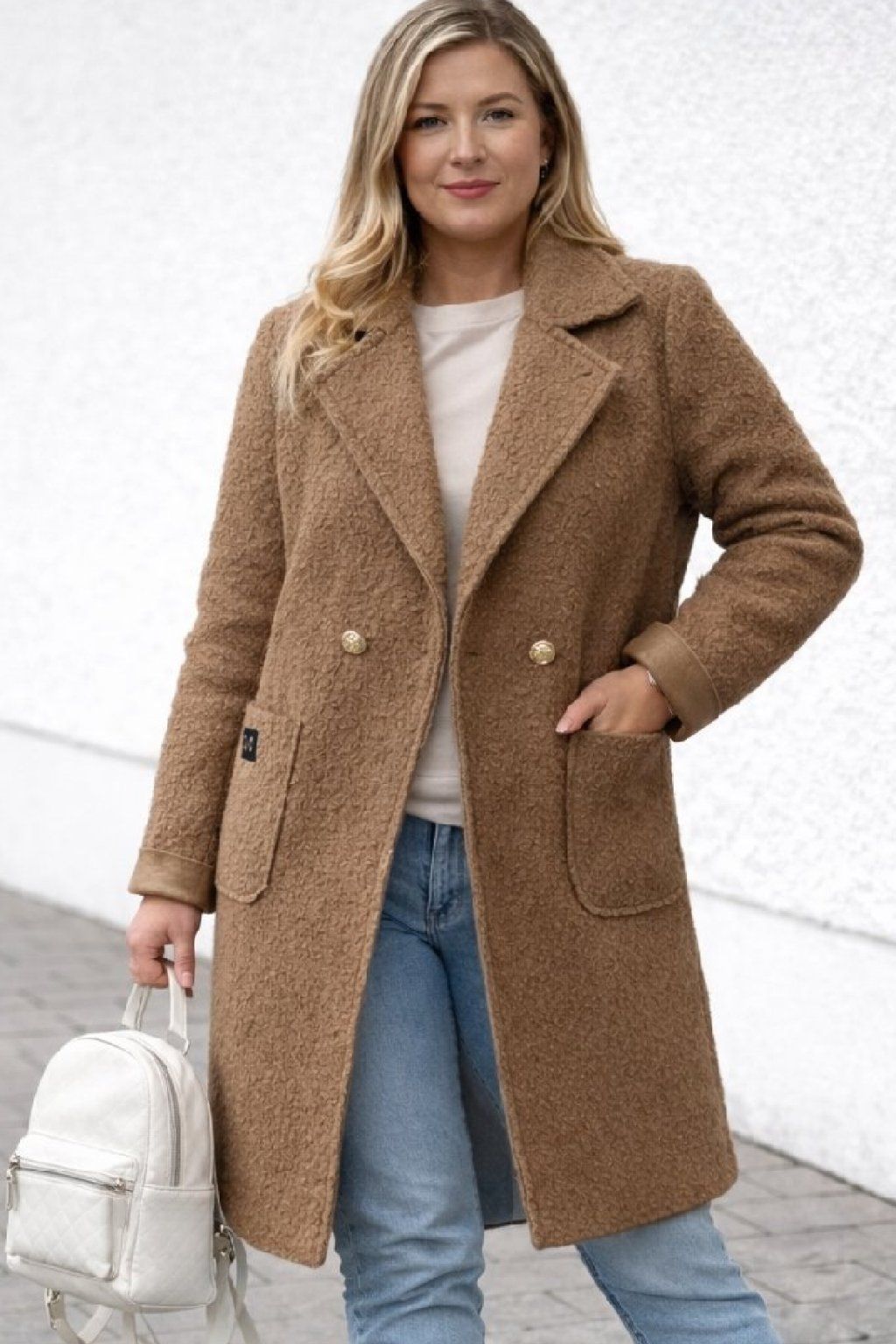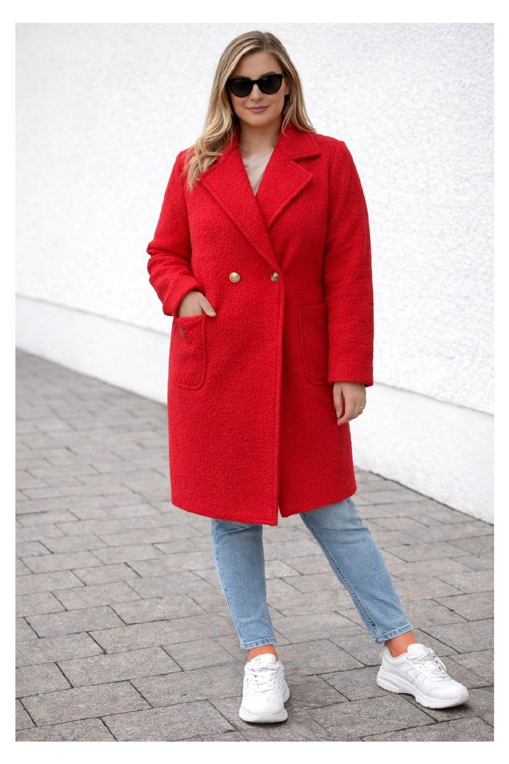 Módní kabát nopkového vzhledu. Zapínání v místě pasu na 2 knoflíky v jedné řadě ve zlaté barvě. Vpředu dvě kapsy, na jedné z nich ozdobná placka. Kabát nemá podšívku. Volný střih - sedí i větším velikostem. Vhodný na jaro a podzim. Foceno na vel. 2XL (prsa 116cm, boky 120cm), výška 165cm.